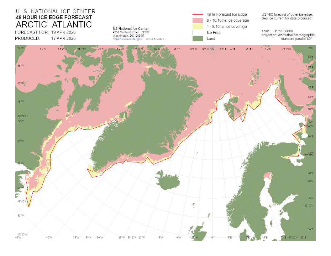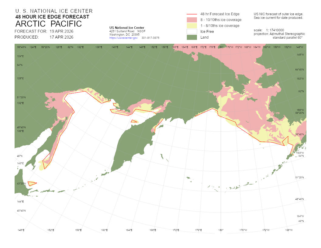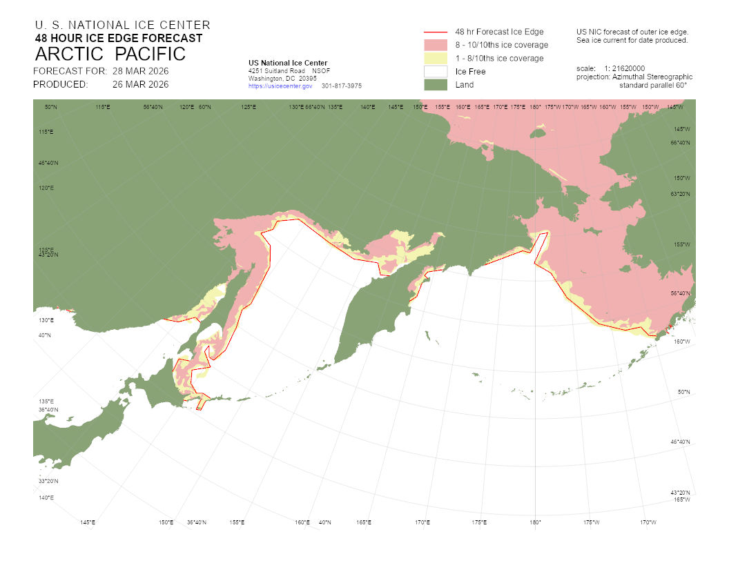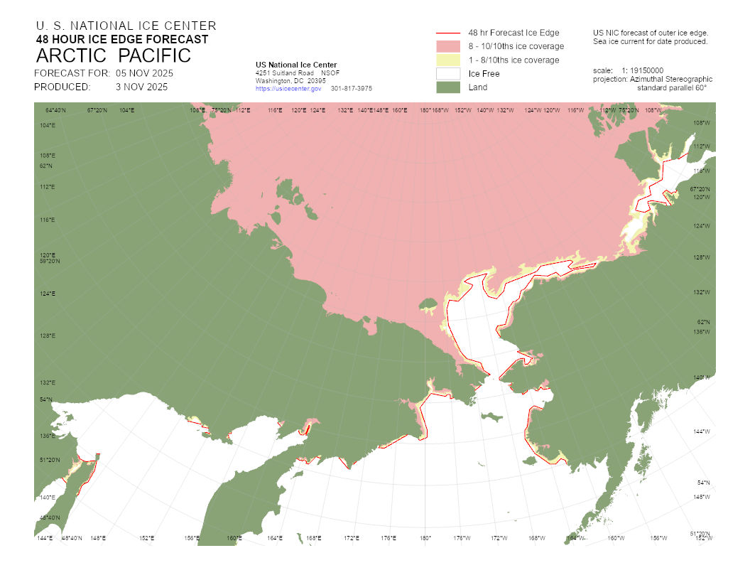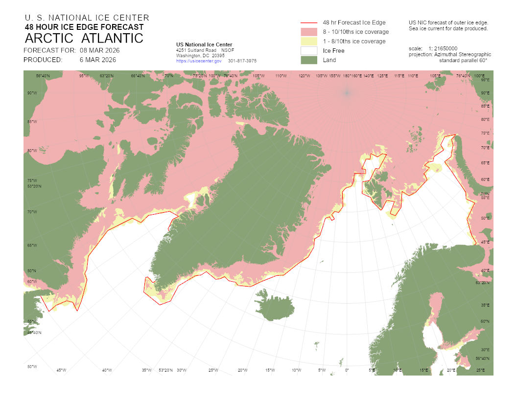 A graphical representation of the daily ice analysis that depicts ice free in white, marginal ice zone (ice concentration up to 80%) in yellow, and pack ice (ice concentration 80% and greater) in pink. The graphic also displays the 48-hour forecast ice edge line. Both products are created to cover the entire Arctic based on region, Atlantic and Pacific.
