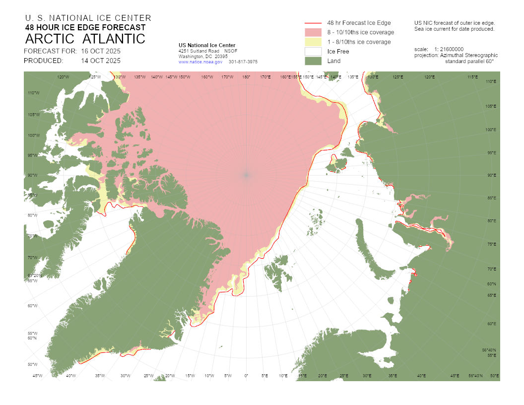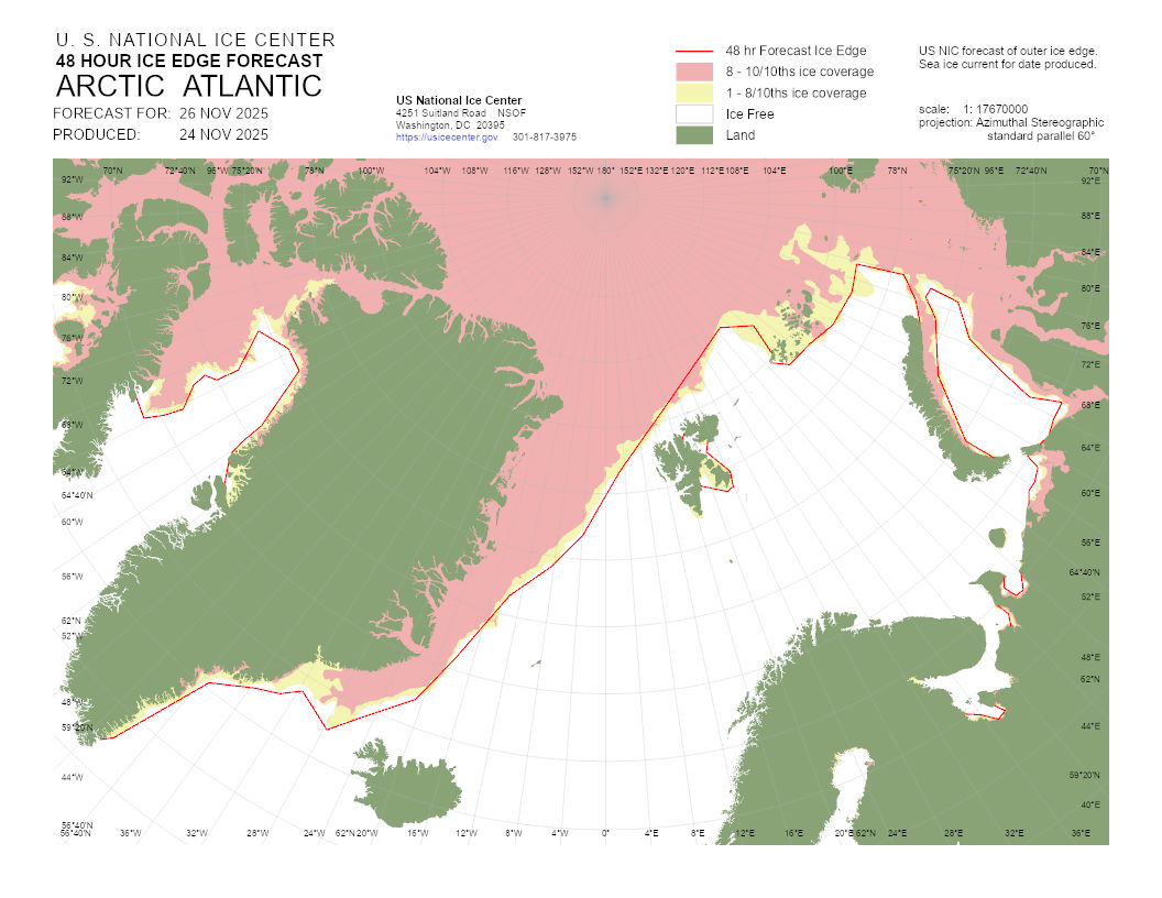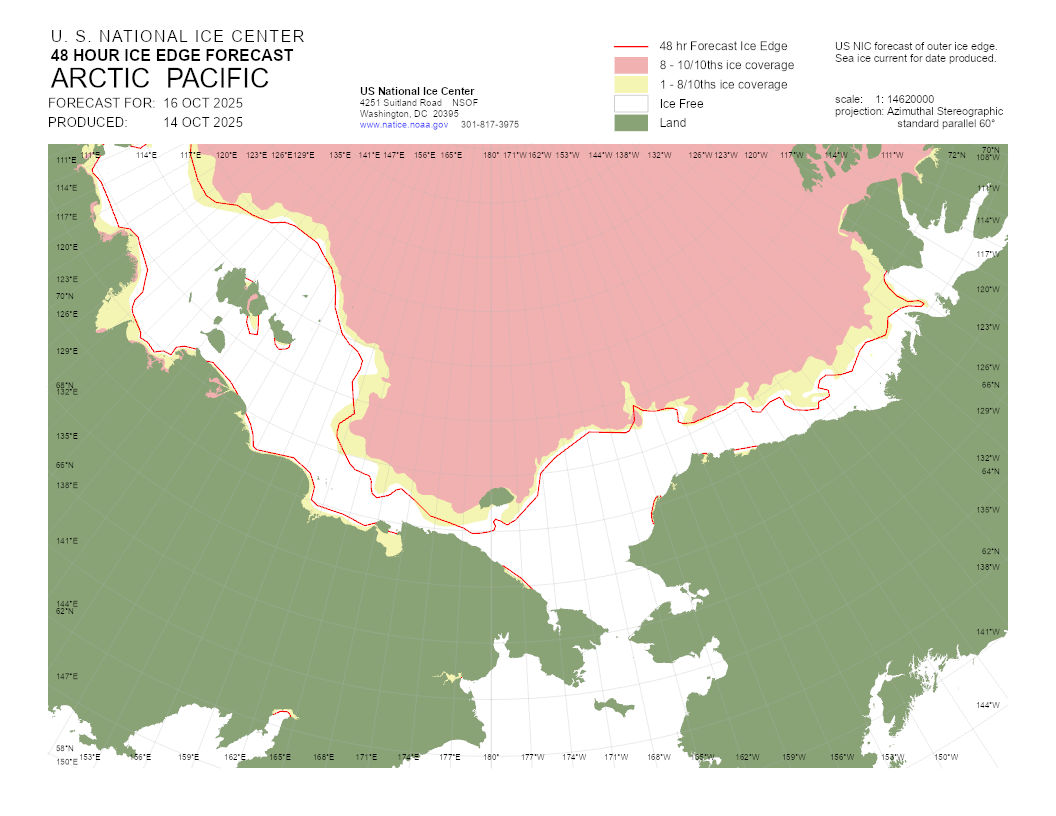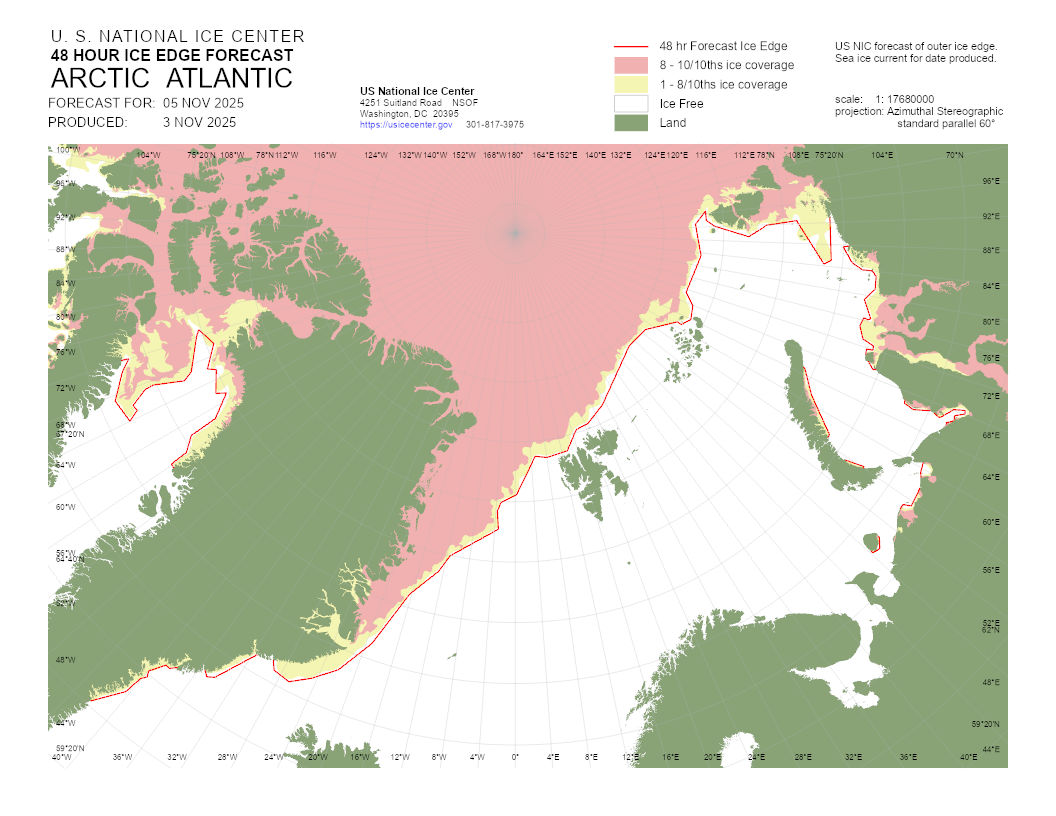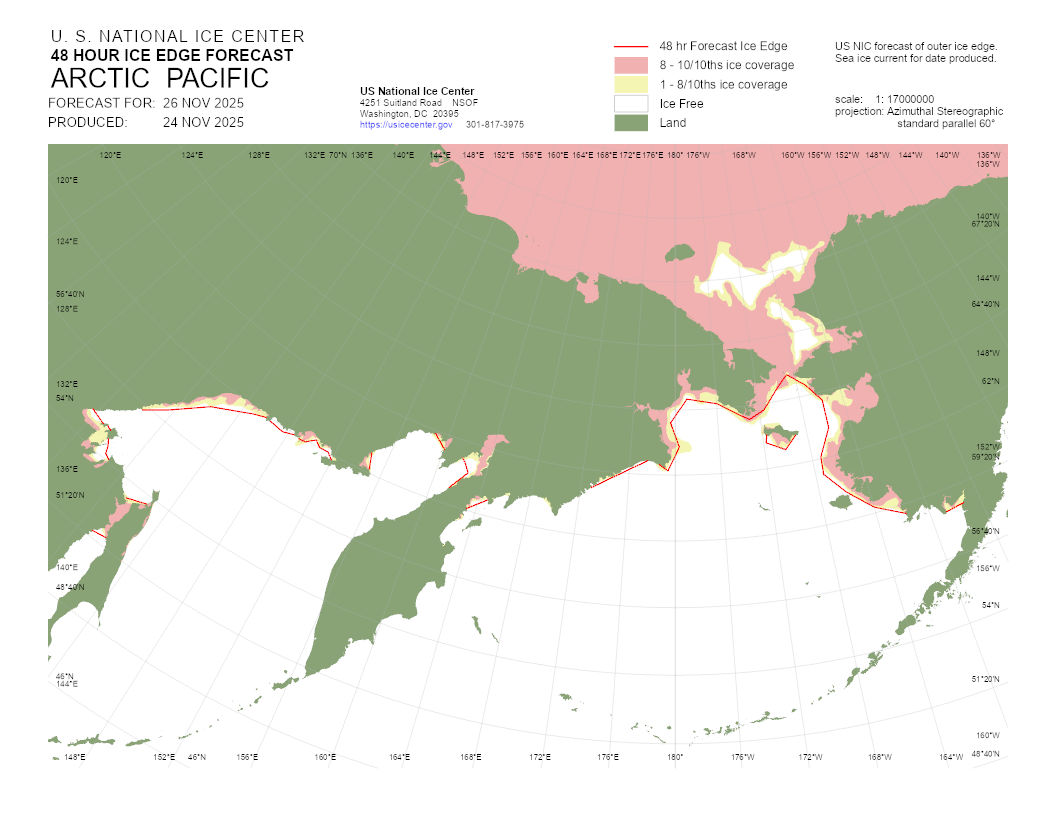 A graphical representation of the daily ice analysis that depicts ice free in white, marginal ice zone (ice concentration up to 80%) in yellow, and pack ice (ice concentration 80% and greater) in pink. The graphic also displays the 48-hour forecast ice edge line. Both products are created to cover the entire Arctic based on region, Atlantic and Pacific.