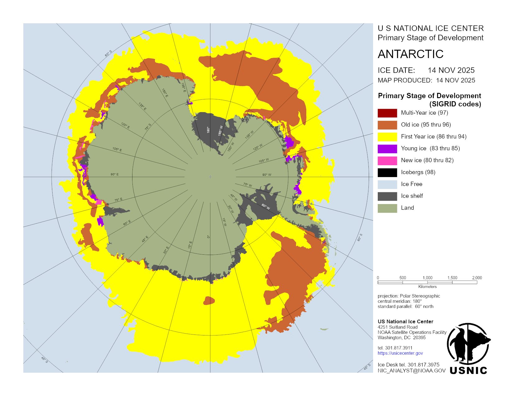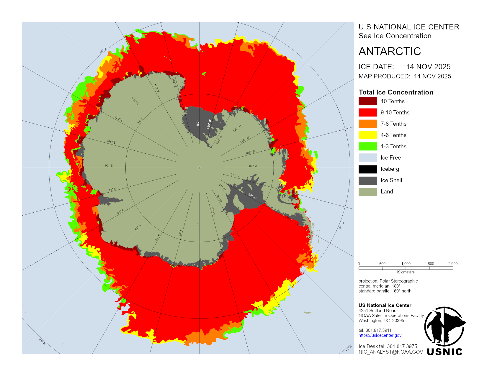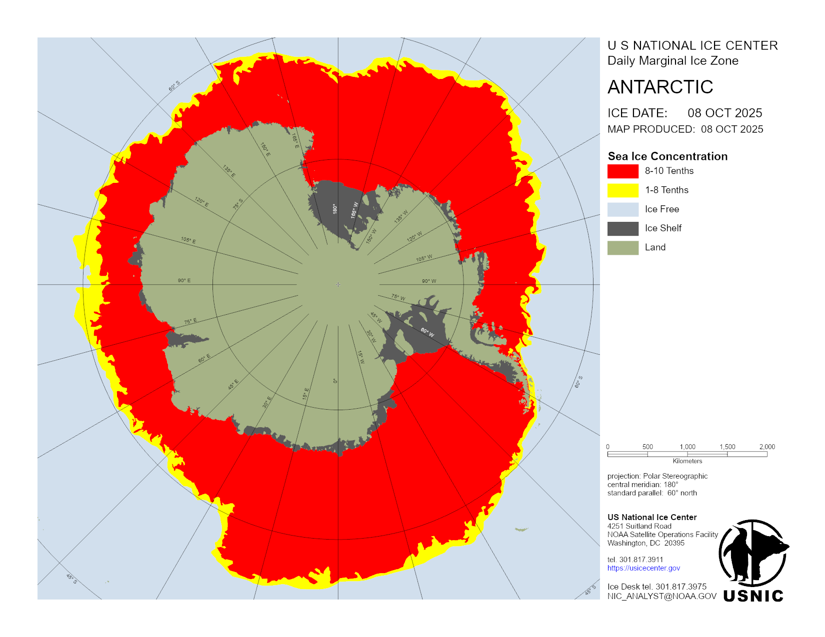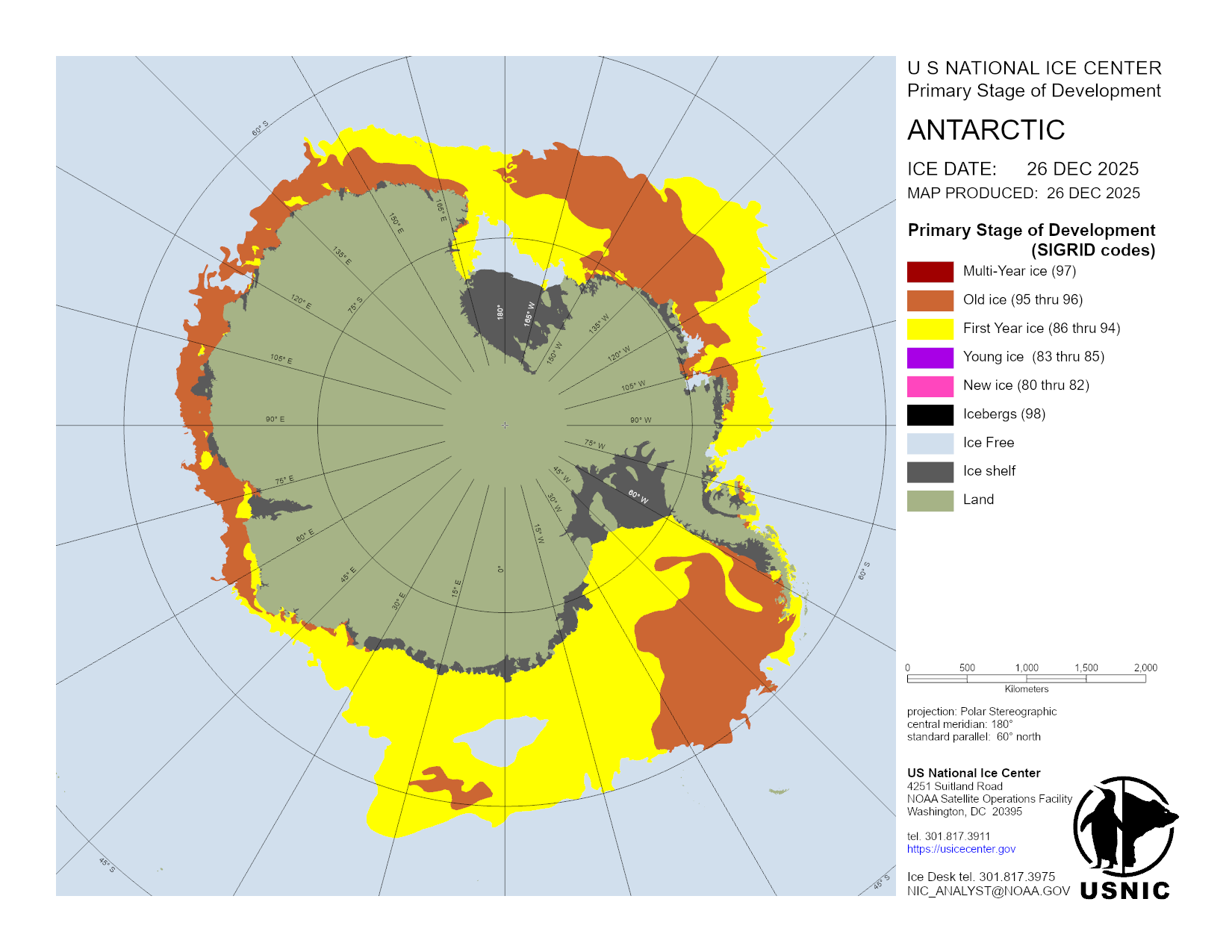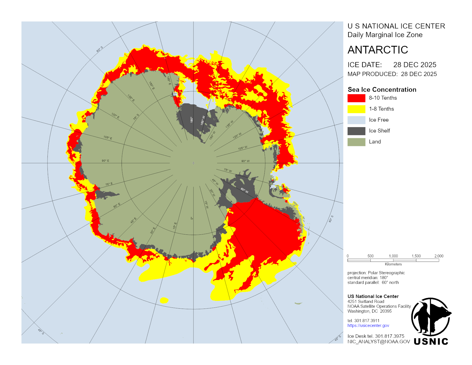 The Antarctic region is a main area for ice analysis by the U.S. National Ice Center. Antarctica is analyzed by concentration daily, with a more detailed analysis containing concentration and thickness completed weekly. Based off these analyses, numerous products are created and presented here. The USNIC is also charged with naming and monitoring large icebergs in Antarctica.
