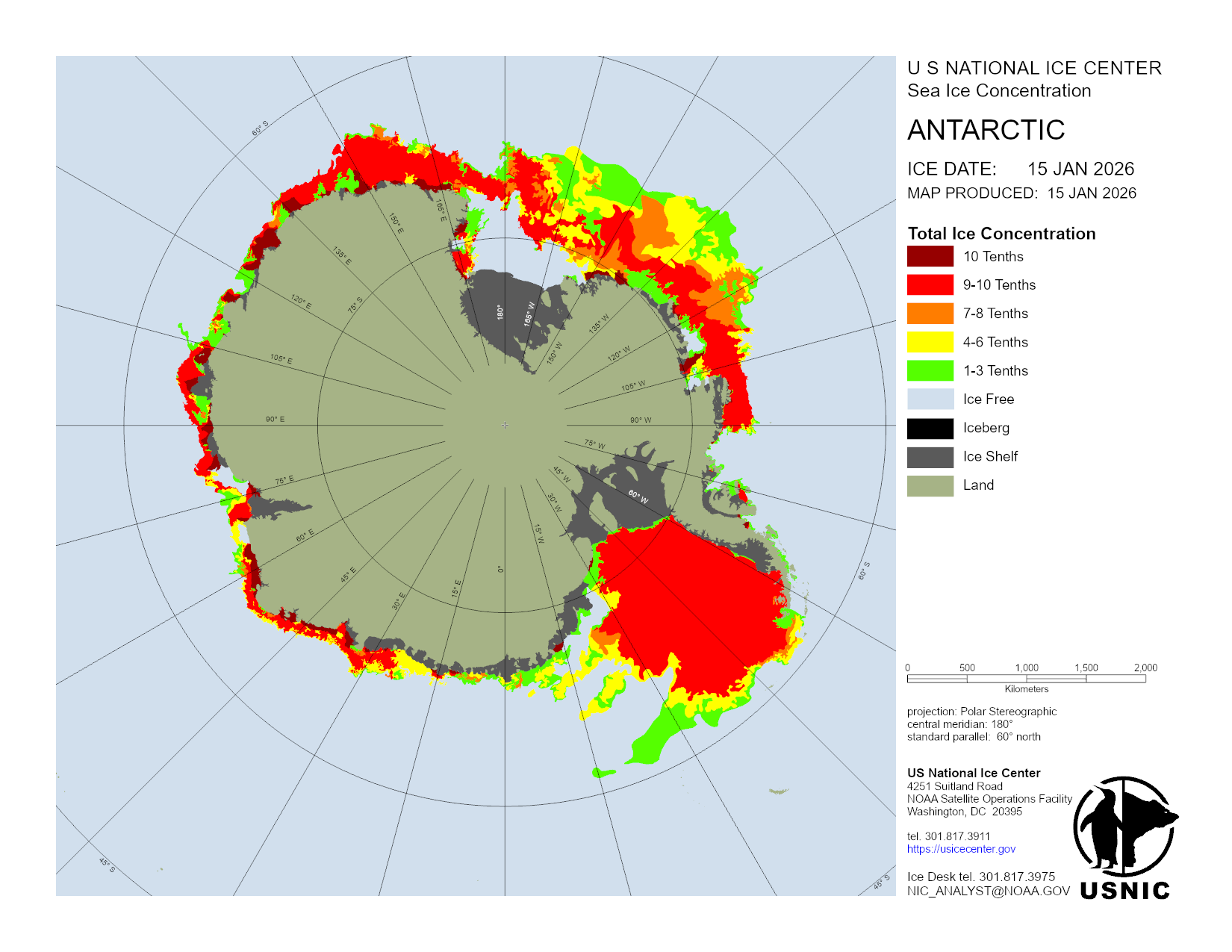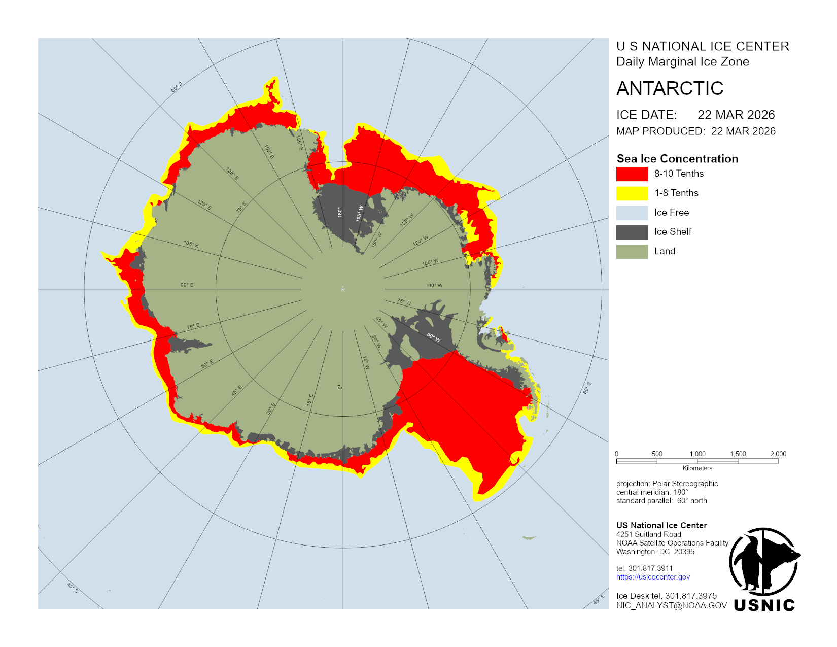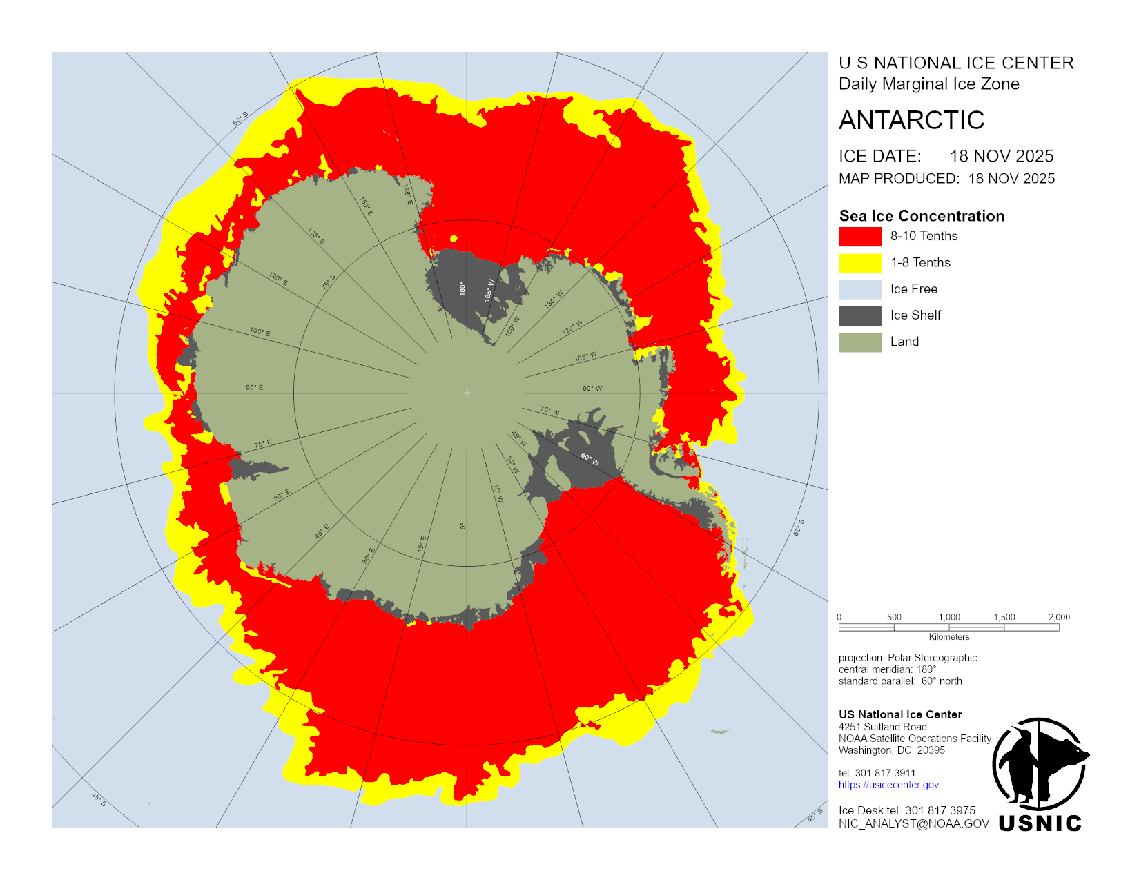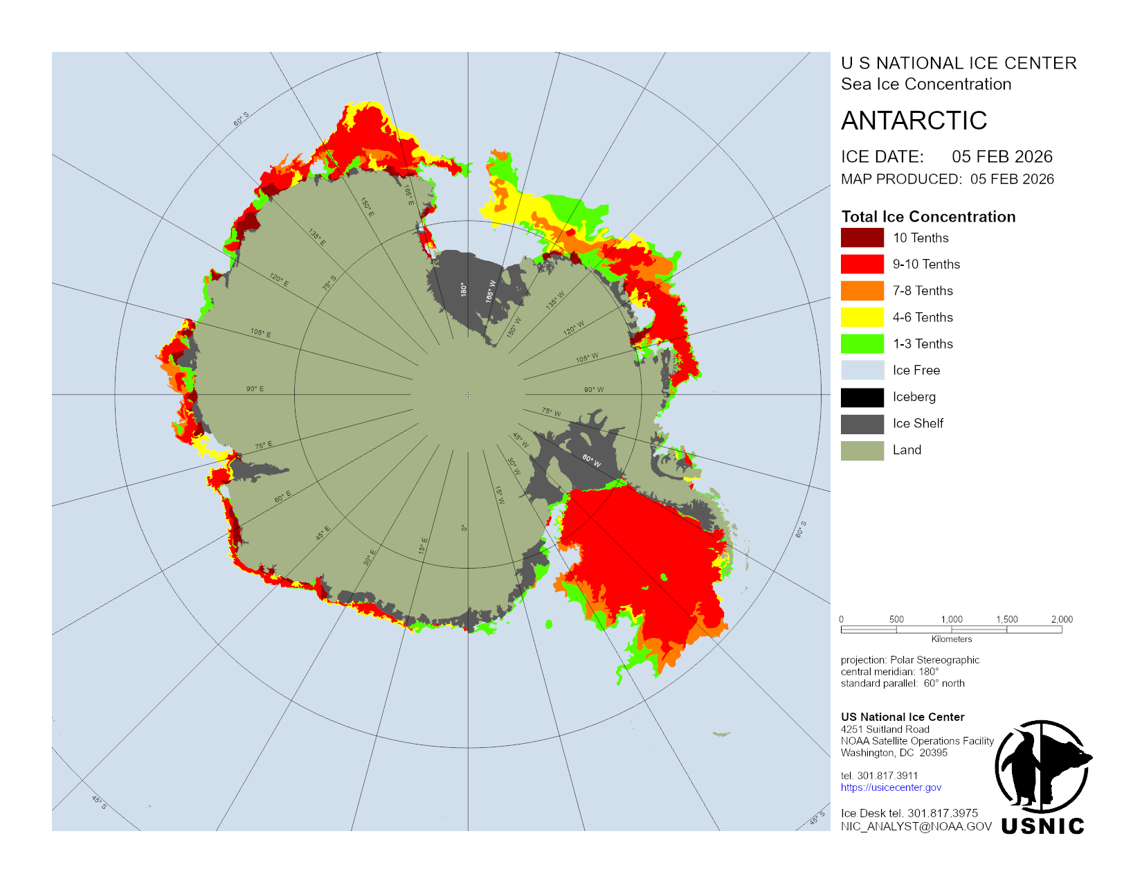 The Antarctic region is a main area for ice analysis by the U.S. National Ice Center. Antarctica is analyzed by concentration daily, with a more detailed analysis containing concentration and thickness completed weekly. Based off these analyses, numerous products are created and presented here. The USNIC is also charged with naming and monitoring large icebergs in Antarctica.