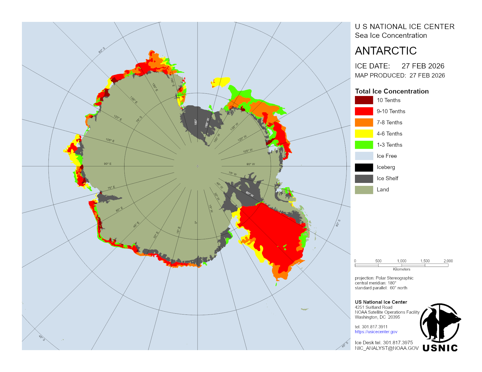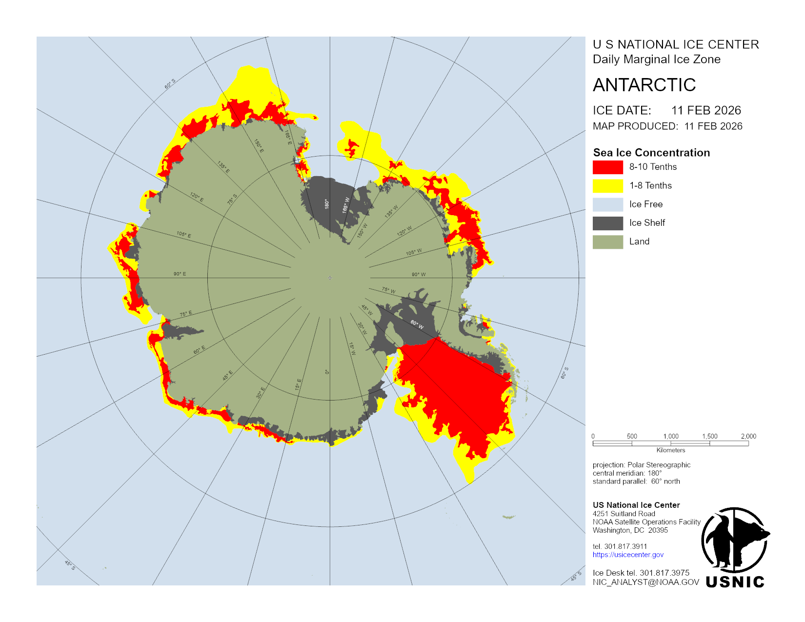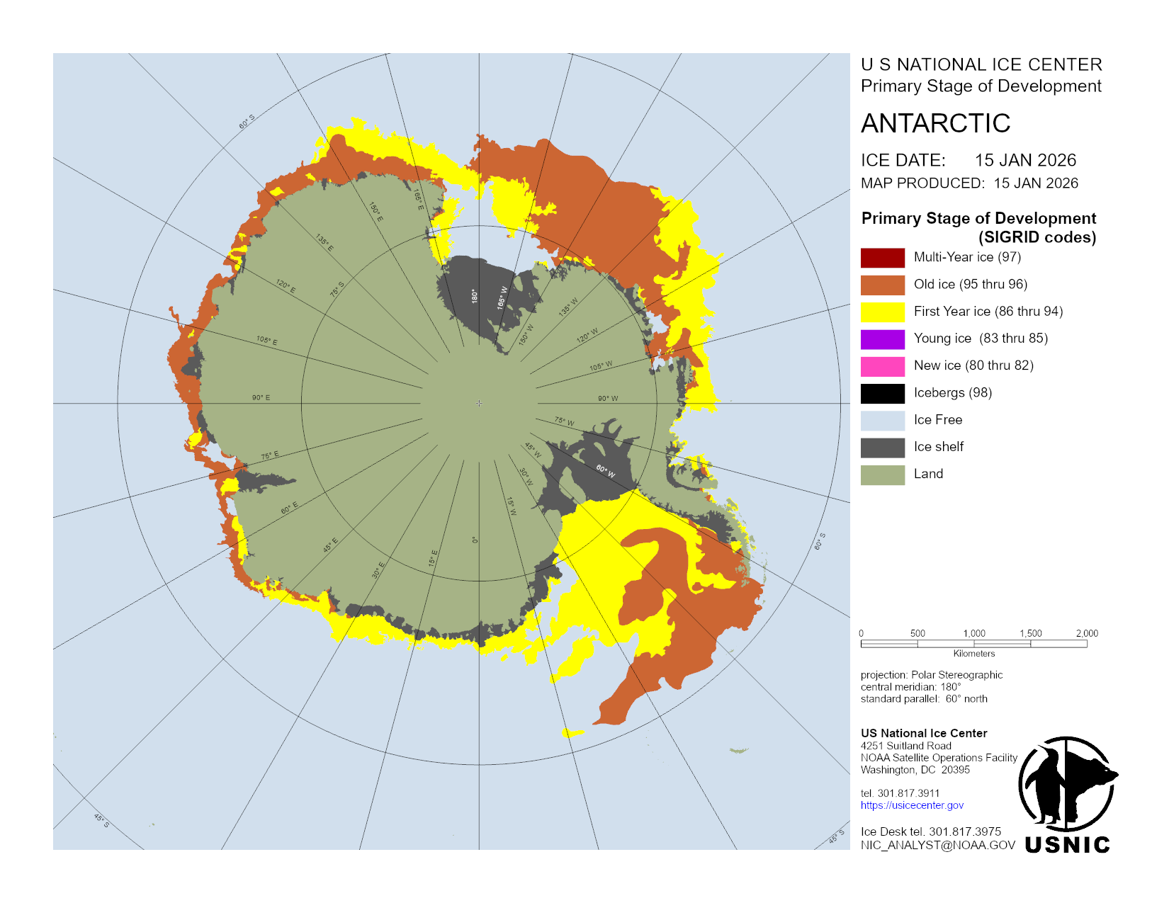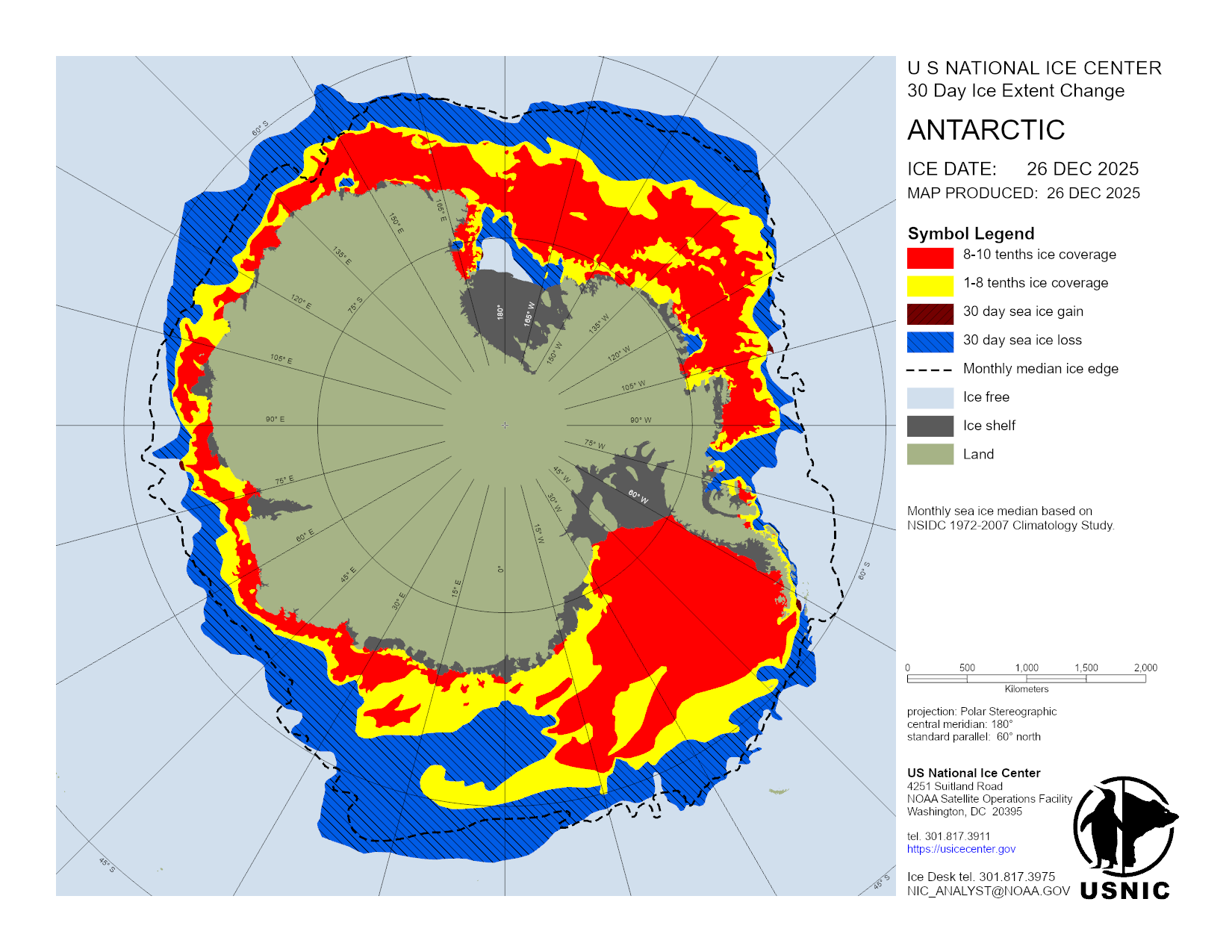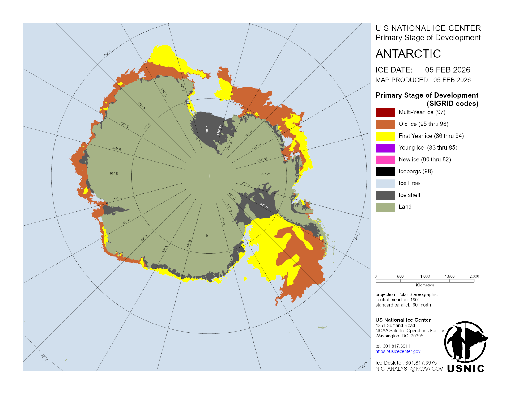 The Antarctic region is a main area for ice analysis by the U.S. National Ice Center. Antarctica is analyzed by concentration daily, with a more detailed analysis containing concentration and thickness completed weekly. Based off these analyses, numerous products are created and presented here. The USNIC is also charged with naming and monitoring large icebergs in Antarctica.