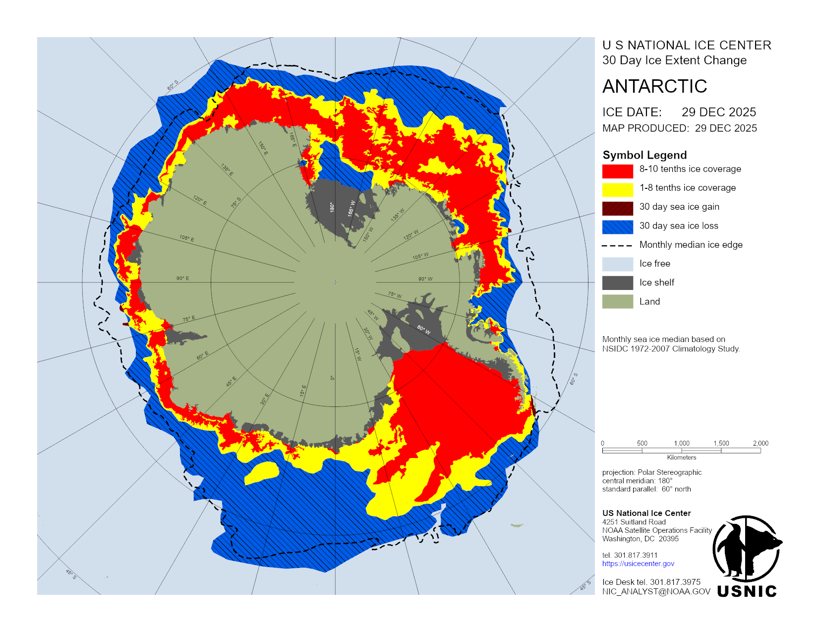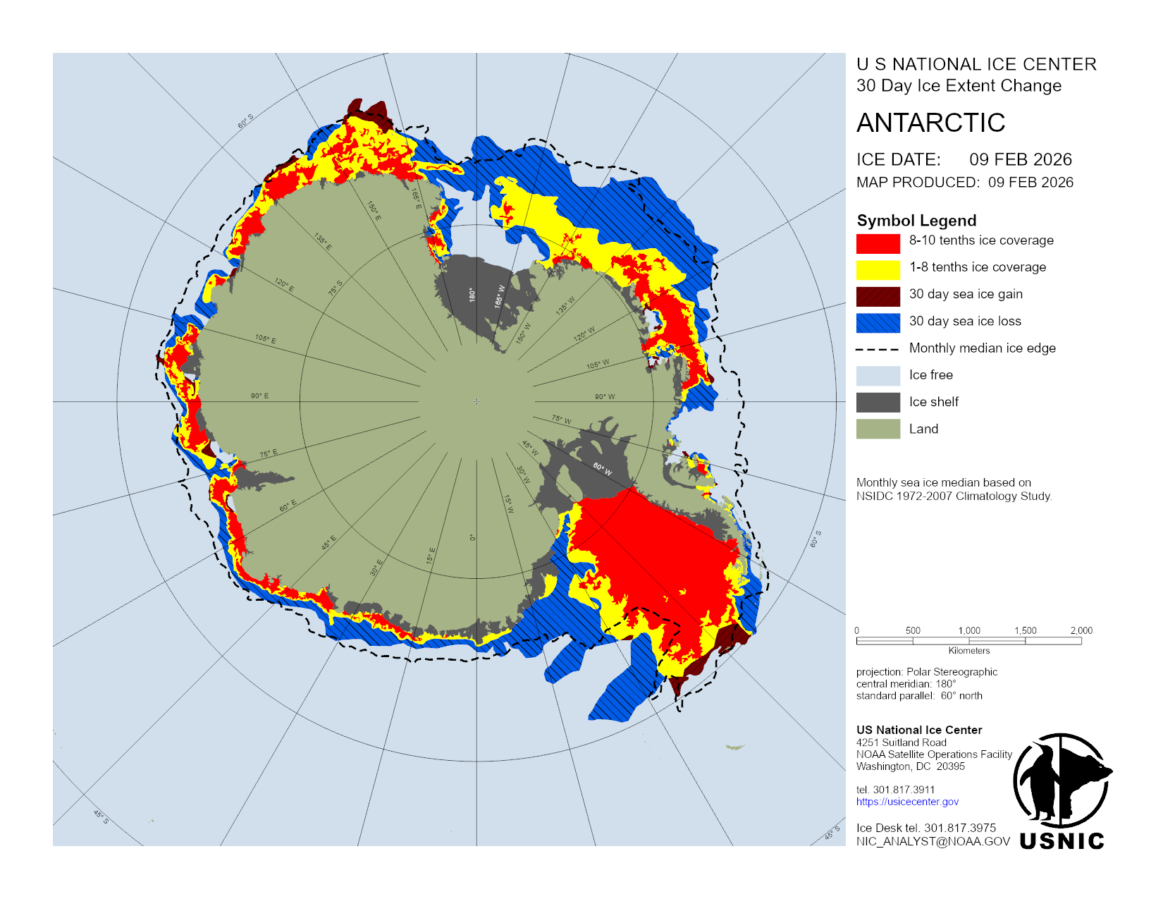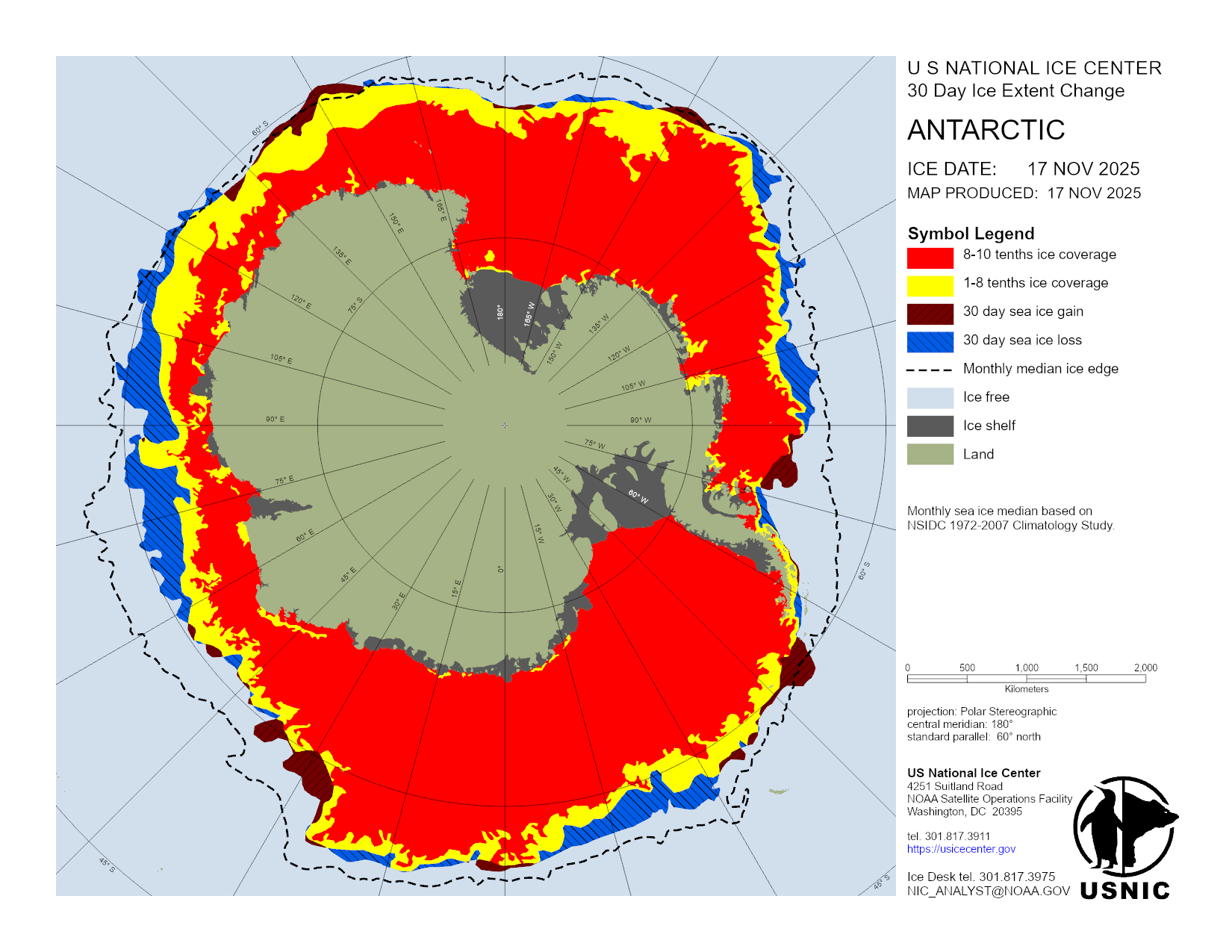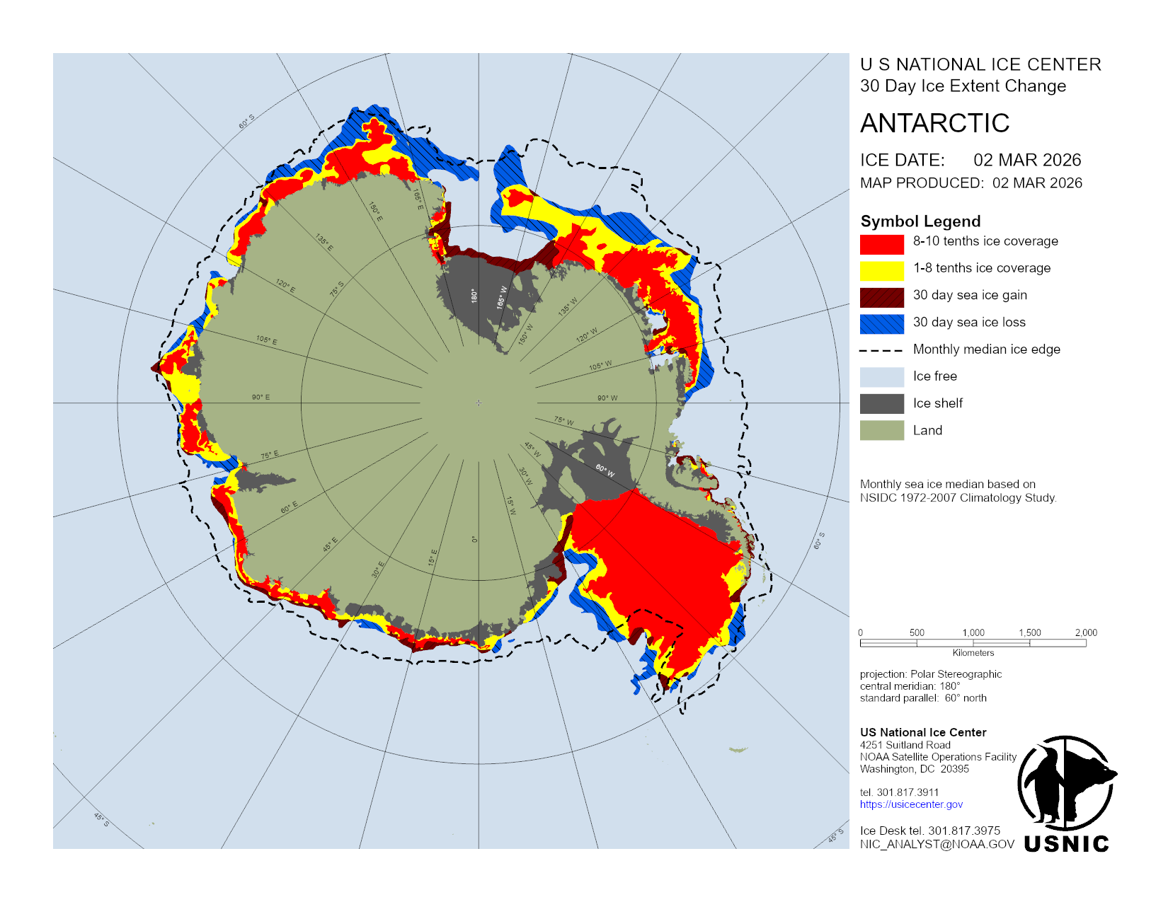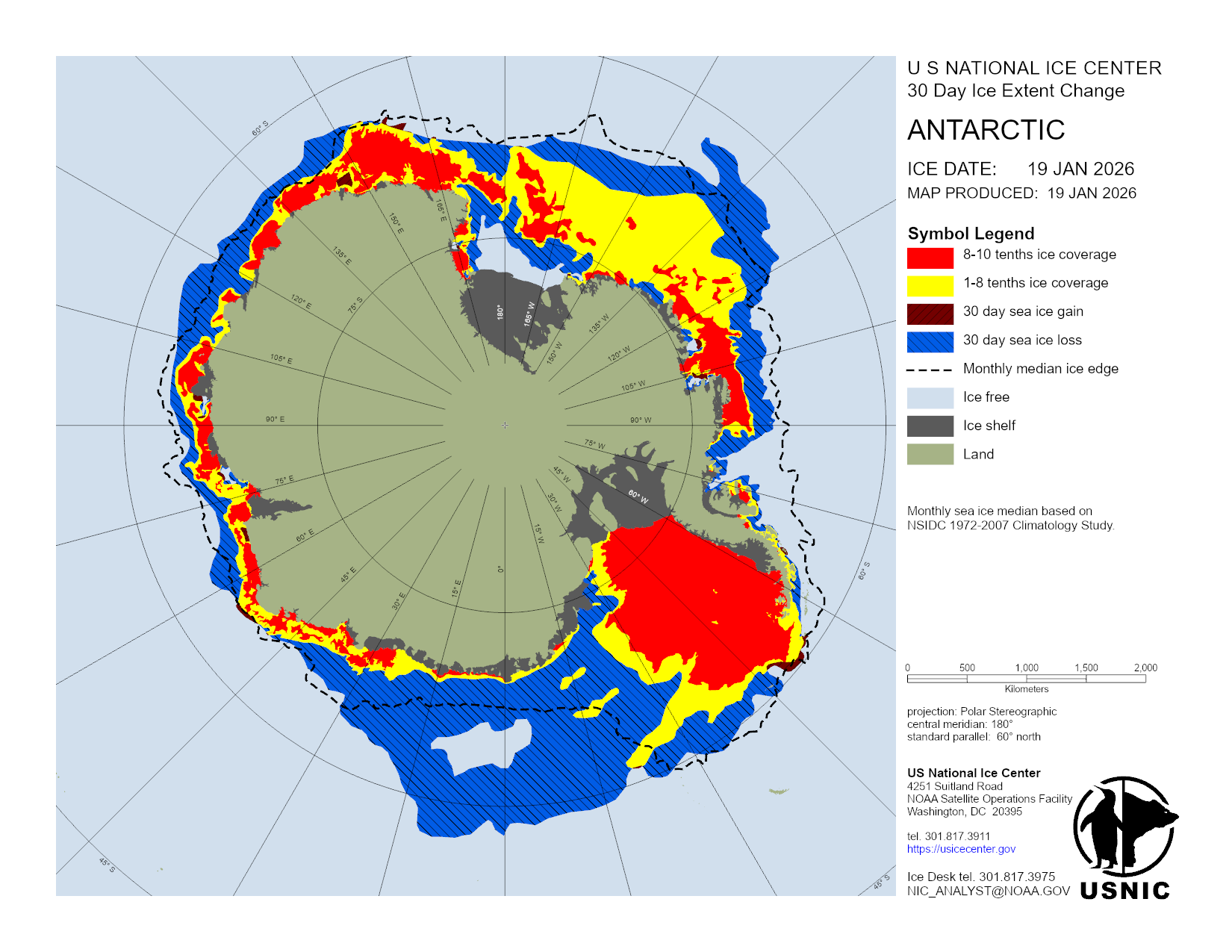 The Antarctic region is a main area for ice analysis by the U.S. National Ice Center. Antarctica is analyzed by concentration daily, with a more detailed analysis containing concentration and thickness completed weekly. Based off these analyses, numerous products are created and presented here. The USNIC is also charged with naming and monitoring large icebergs in Antarctica.