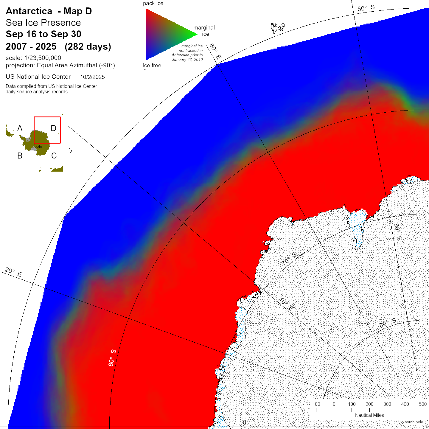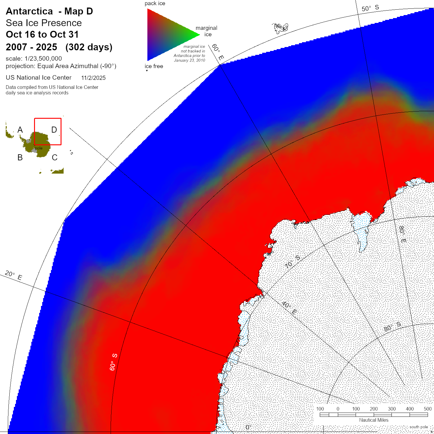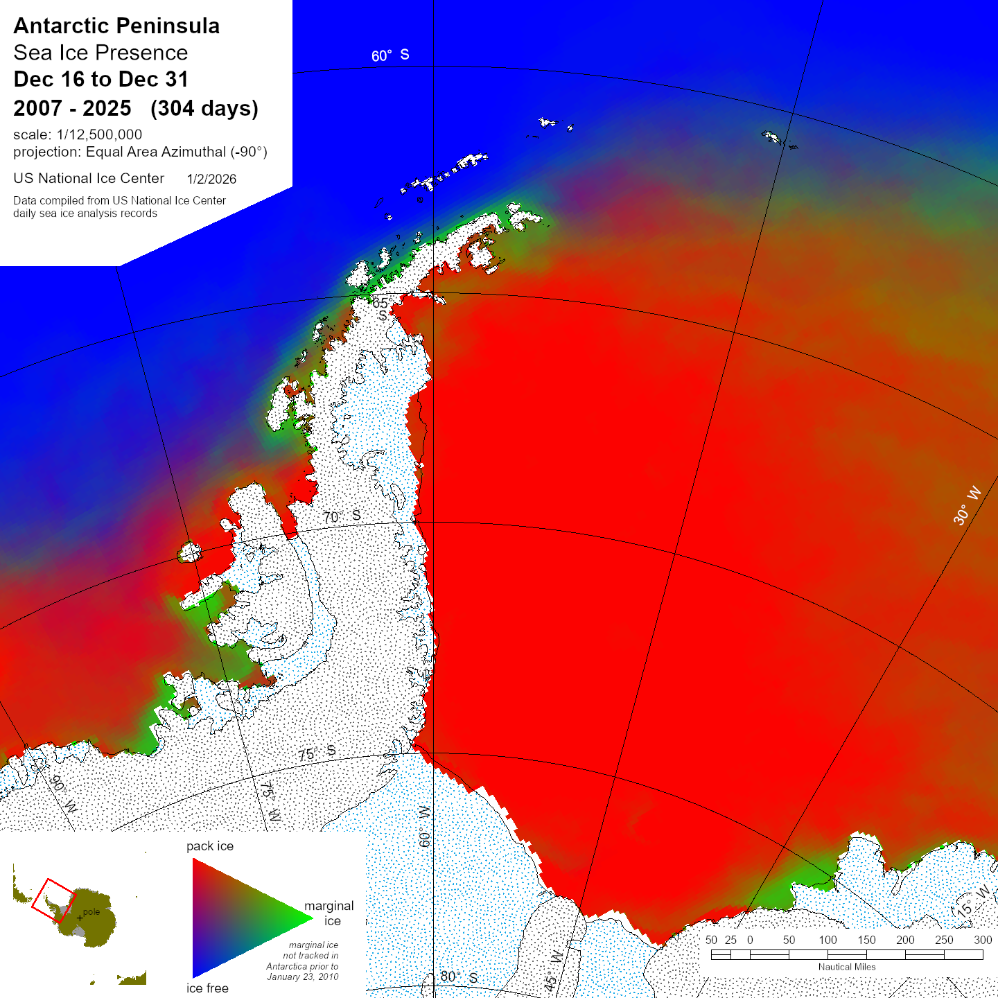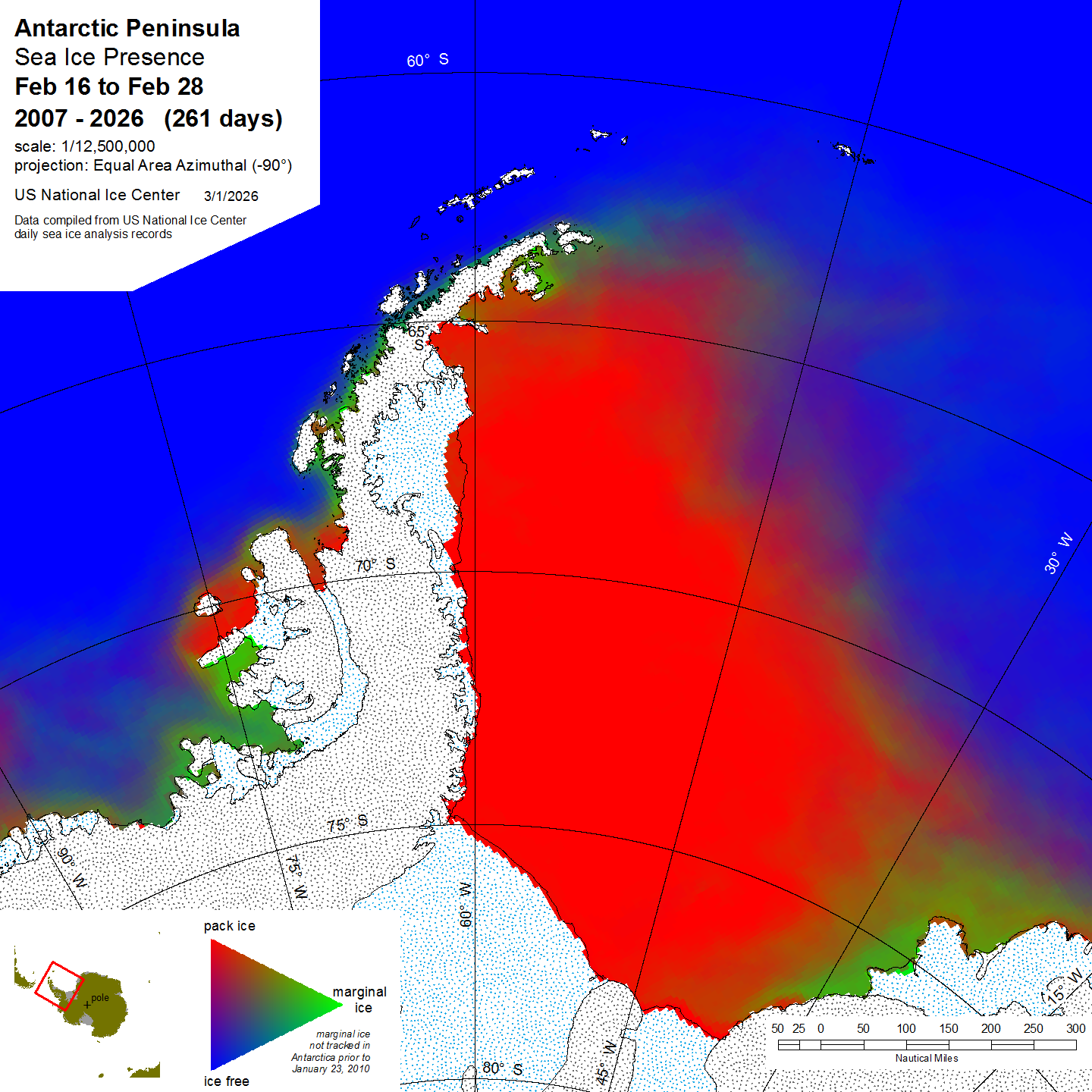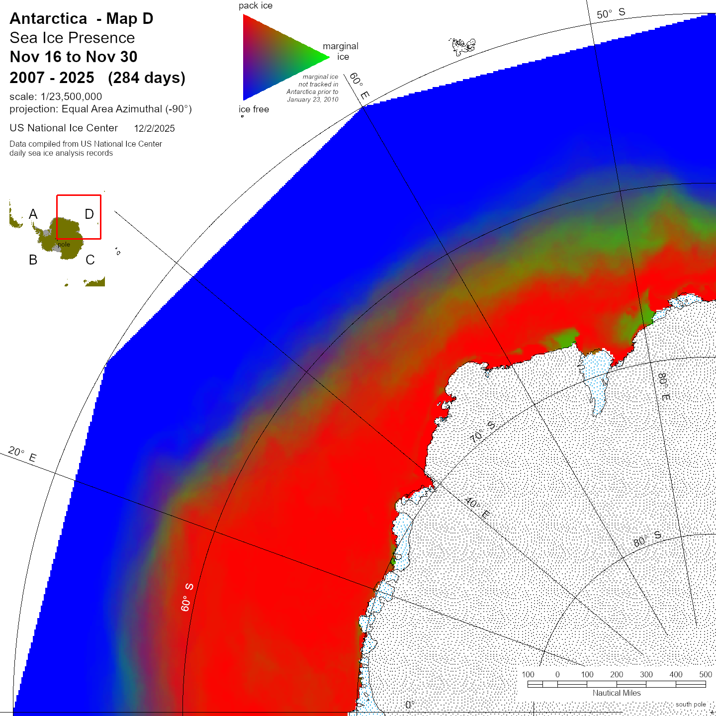 Antarctic Trivariate products and data sets are derived from the U.S. National Ice Center archive data to provide an accurate, comprehensive, and easily understood characterization of analyzed sea ice conditions in the polar regions. The trivariate product characterizes ice coverage over time; in this case in half-month time blocks. The Single Year data shows conditions during the stated period for the year indicated. Compendium Year maps show a diachronic view of the sea ice for the stated half-month period in all years from 2007 to the date noted. For more information, please visit our Trivariate information page.