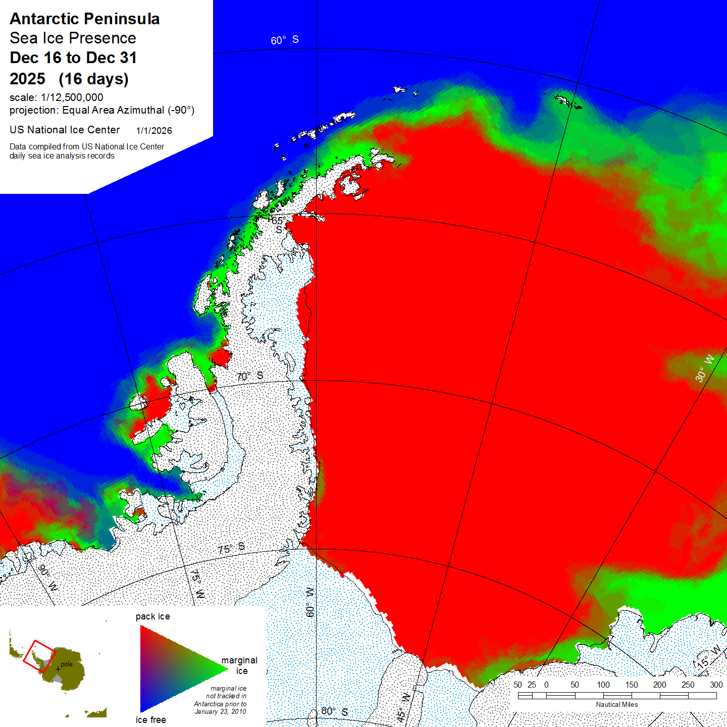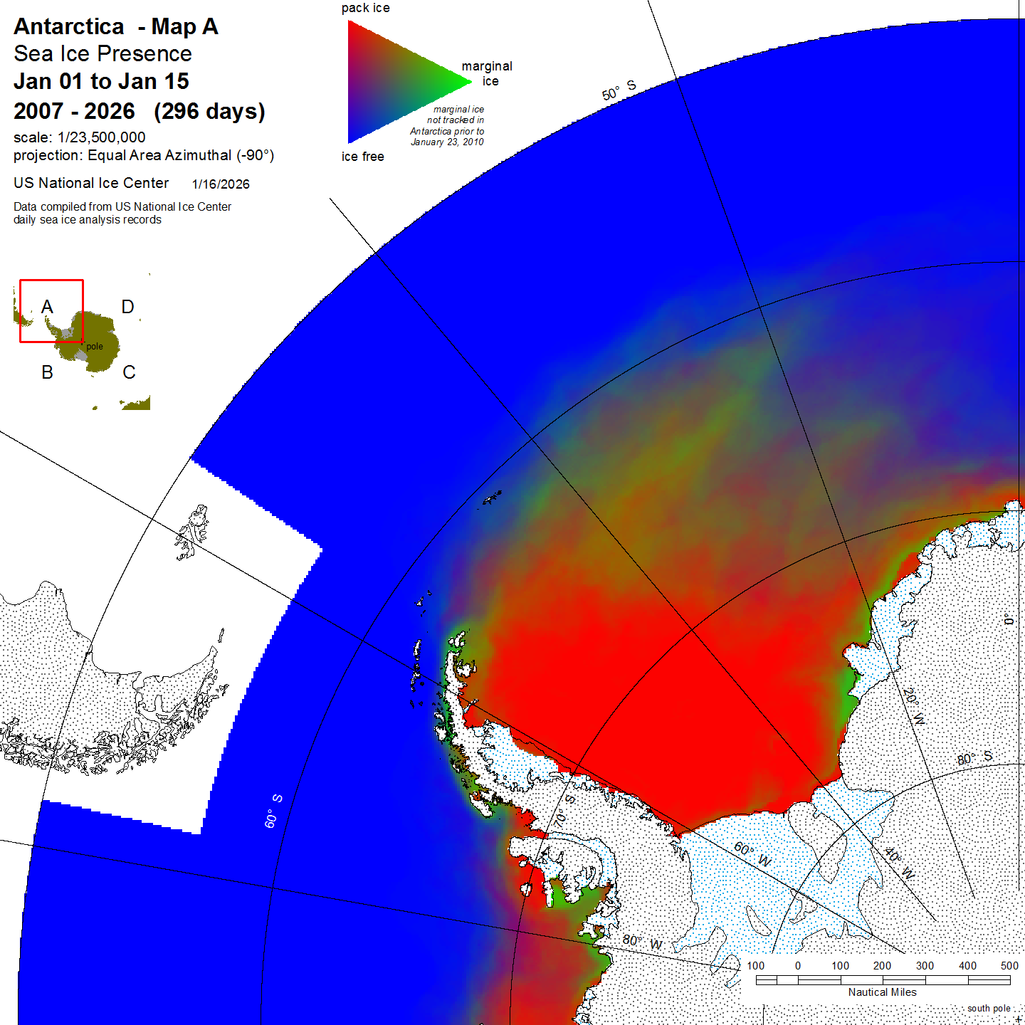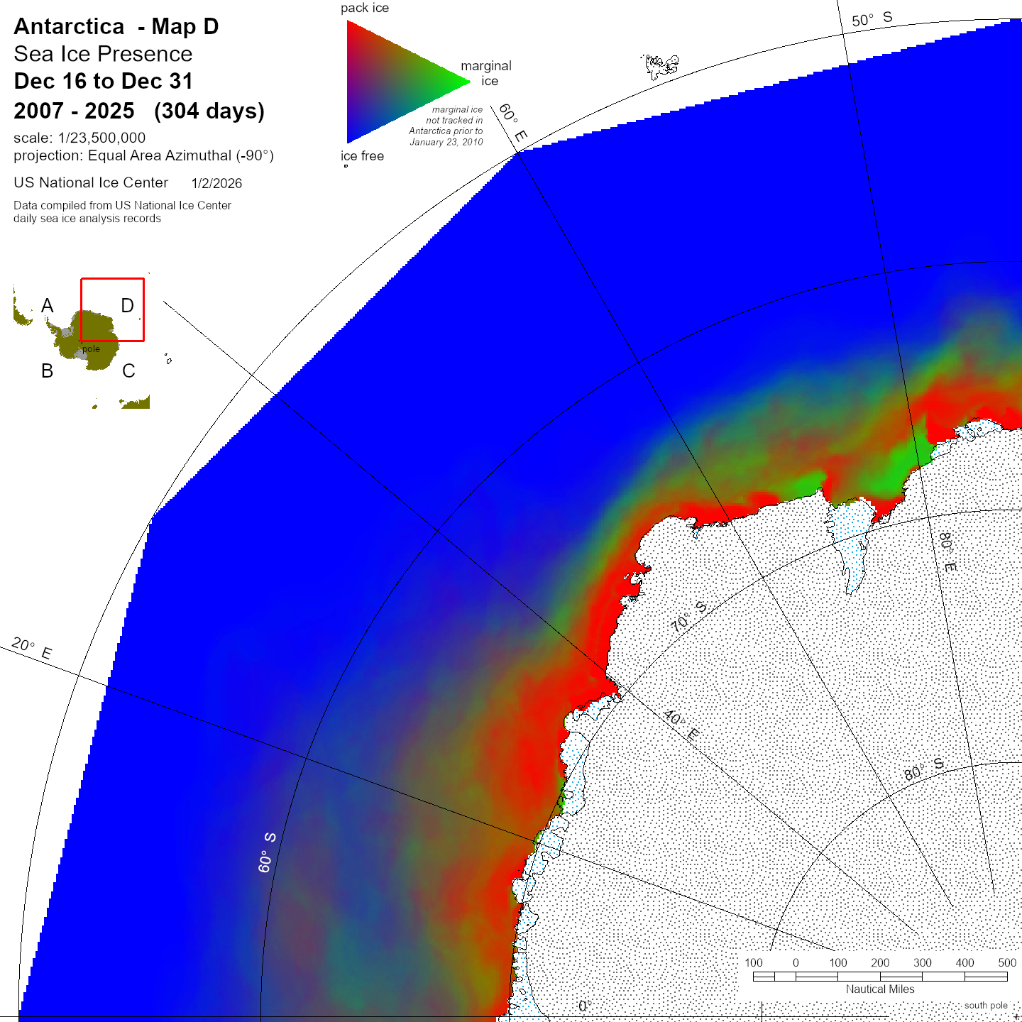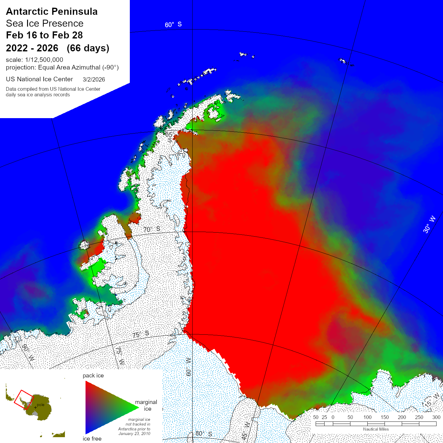 Antarctic Trivariate products and data sets are derived from the U.S. National Ice Center archive data to provide an accurate, comprehensive, and easily understood characterization of analyzed sea ice conditions in the polar regions. The trivariate product characterizes ice coverage over time; in this case in half-month time blocks. The Single Year data shows conditions during the stated period for the year indicated. Compendium Year maps show a diachronic view of the sea ice for the stated half-month period in all years from 2007 to the date noted. For more information, please visit our Trivariate information page.