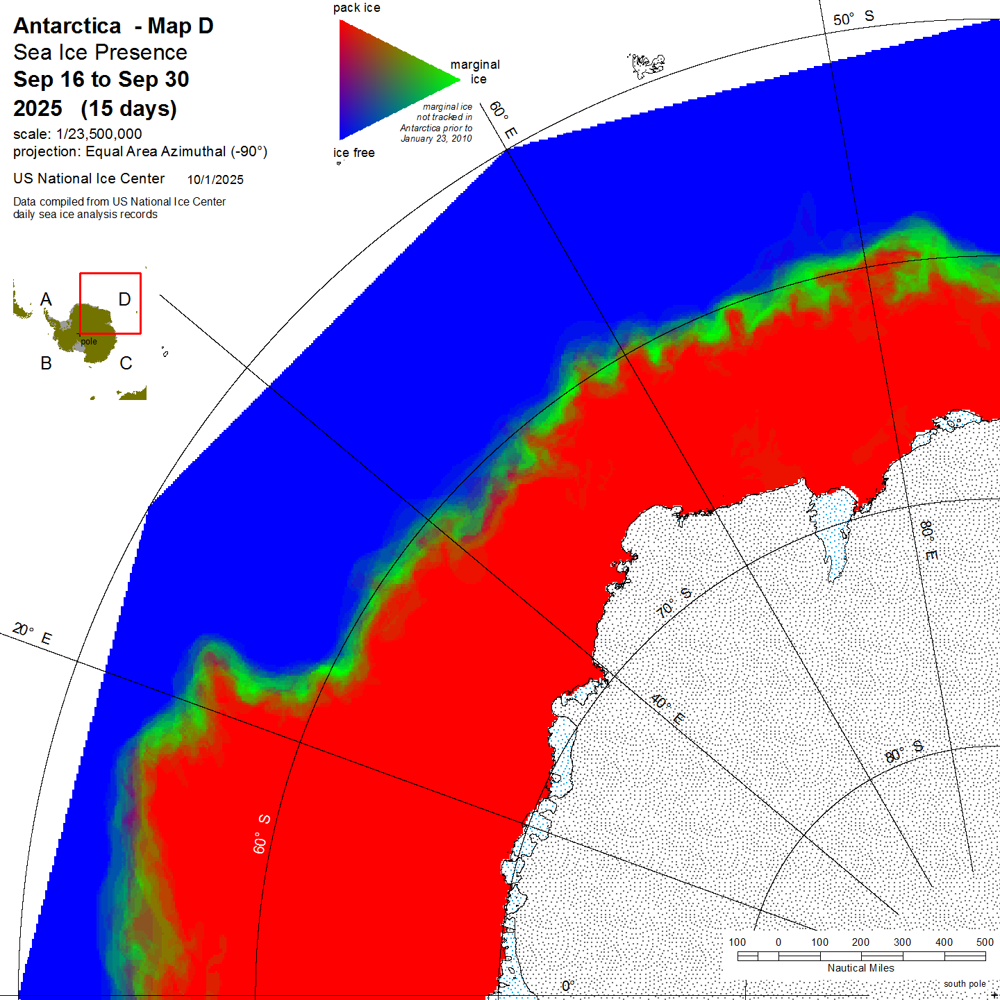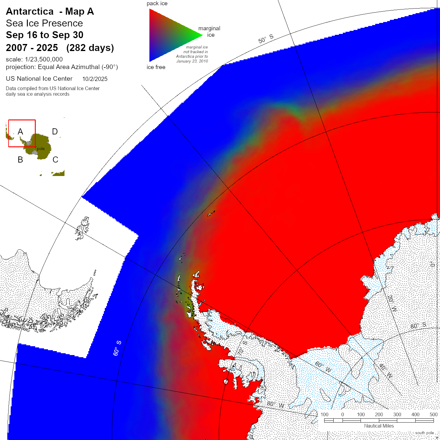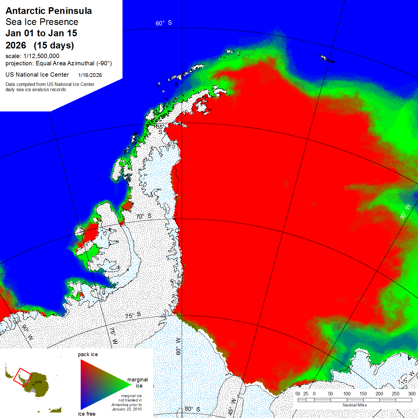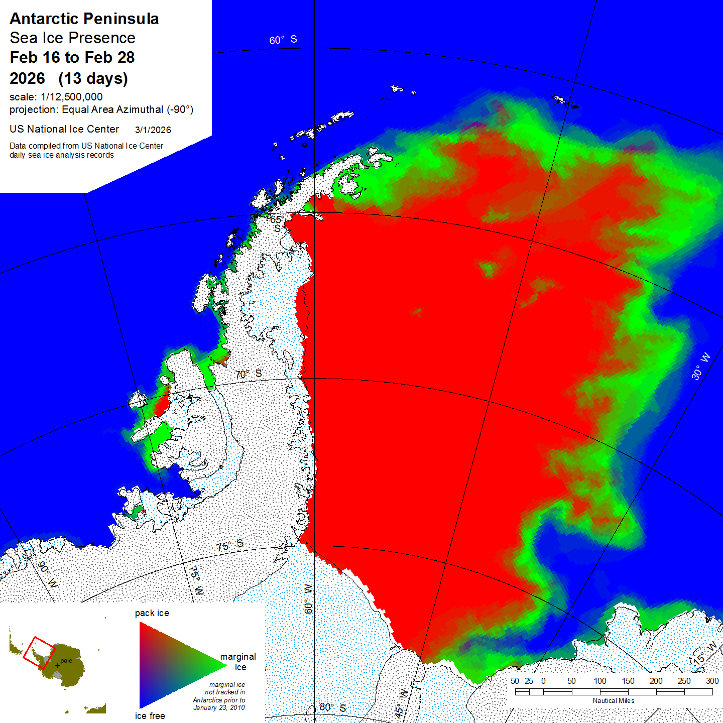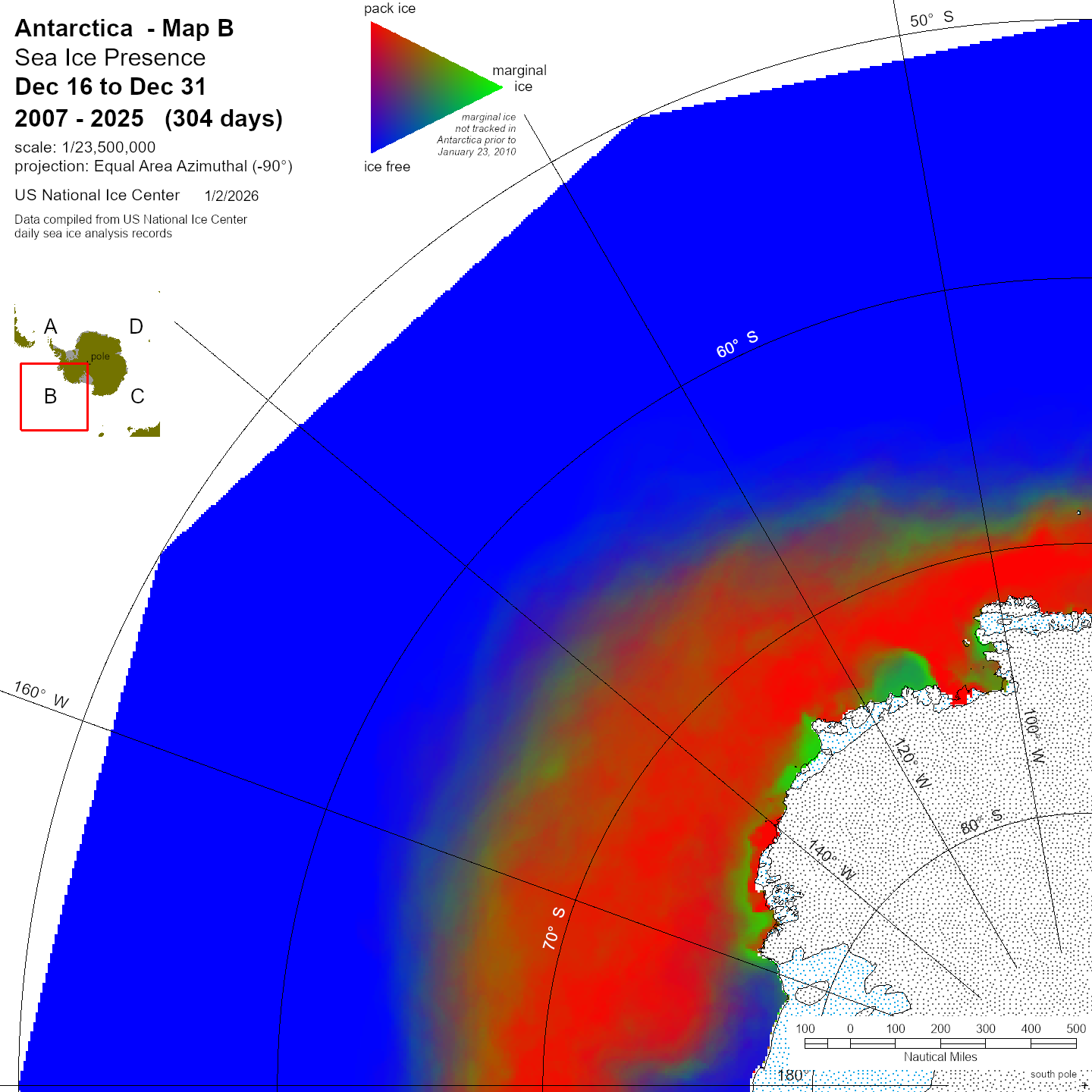Antarctic Trivariate products and data sets are derived from the U.S. National Ice Center archive data to provide an accurate, comprehensive, and easily understood characterization of analyzed sea ice conditions in the polar regions. The trivariate product characterizes ice coverage over time; in this case in half-month time blocks. The Single Year data shows conditions during the stated period for the year indicated. Compendium Year maps show a diachronic view of the sea ice for the stated half-month period in all years from 2007 to the date noted. For more information, please visit our Trivariate information page.