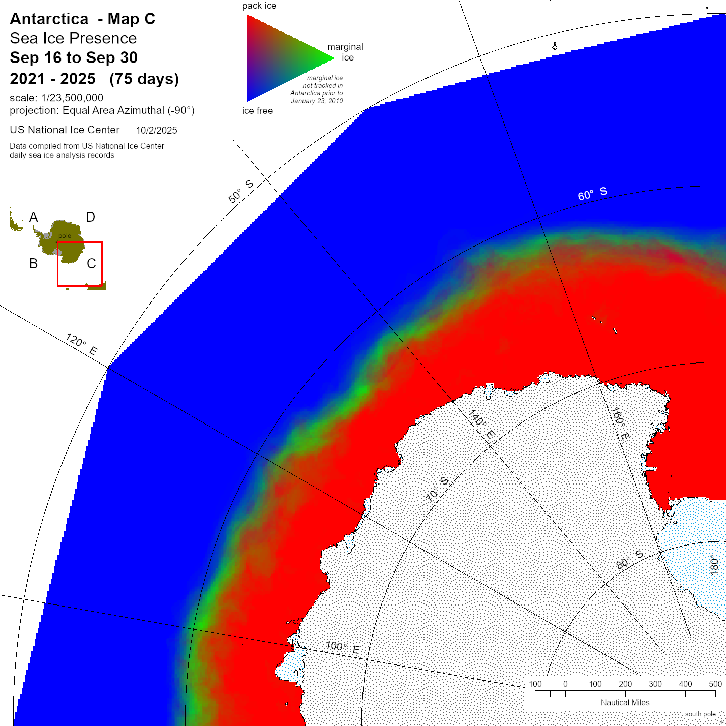 Graphic representation of ice information gathered over a specified time that is contained within the Wilkesland / Ross Sea region.