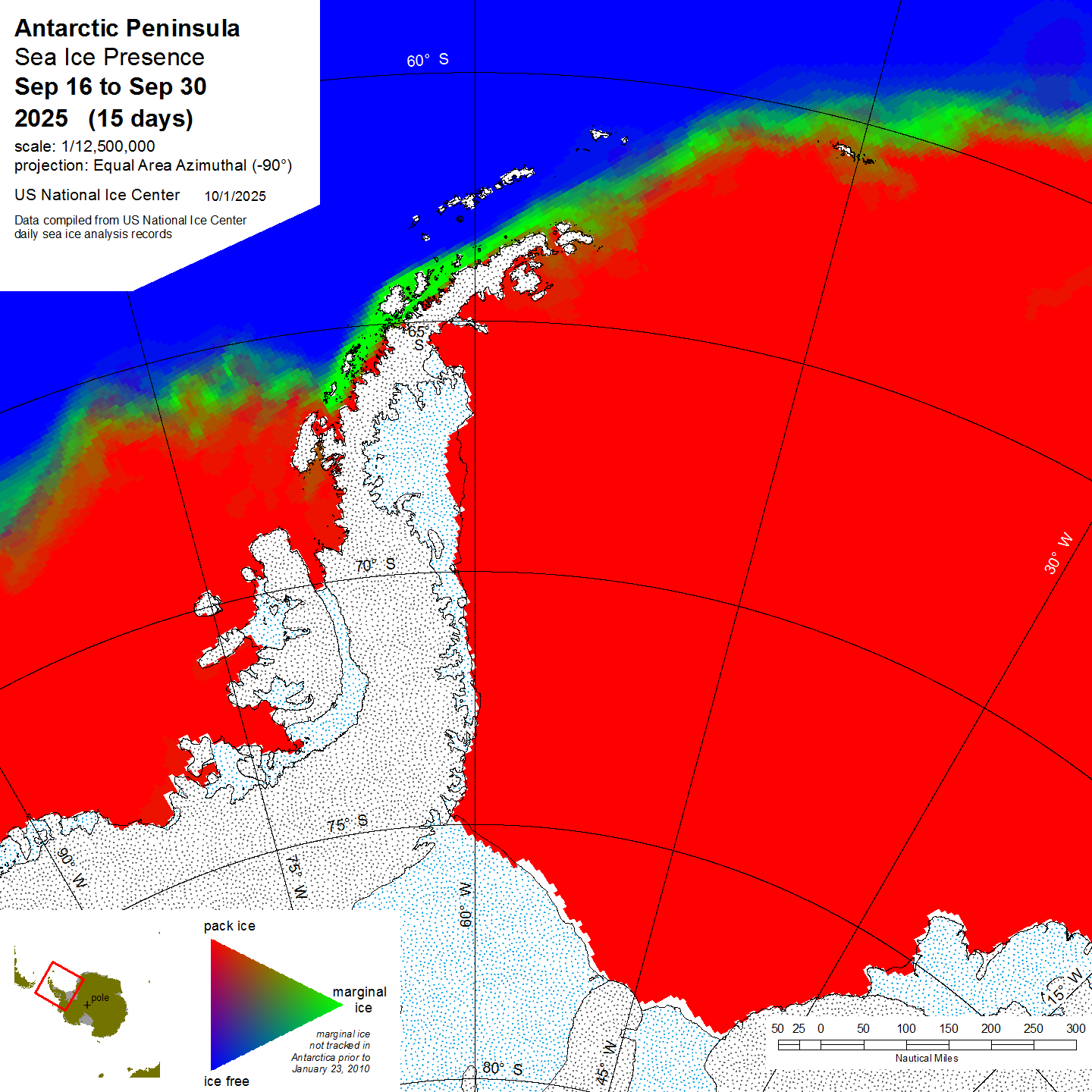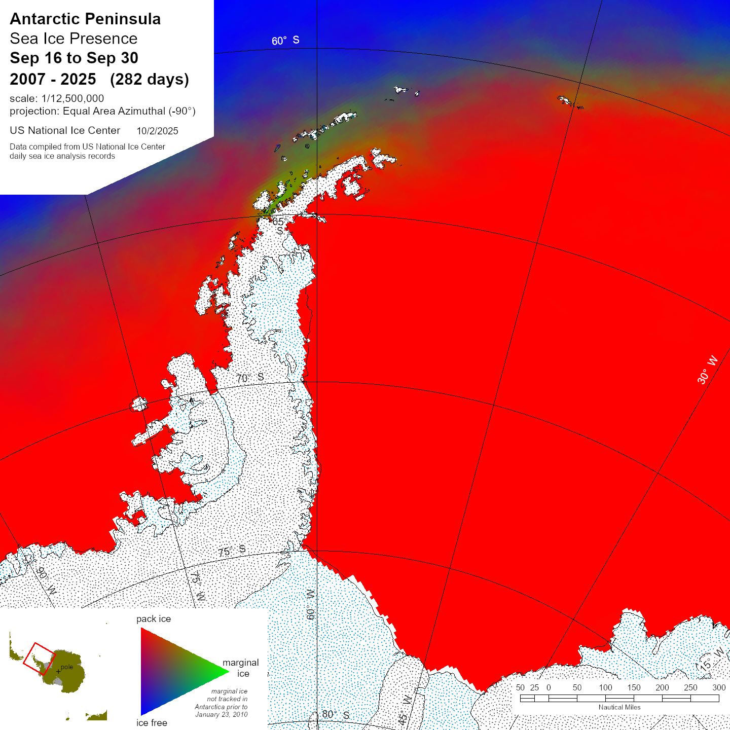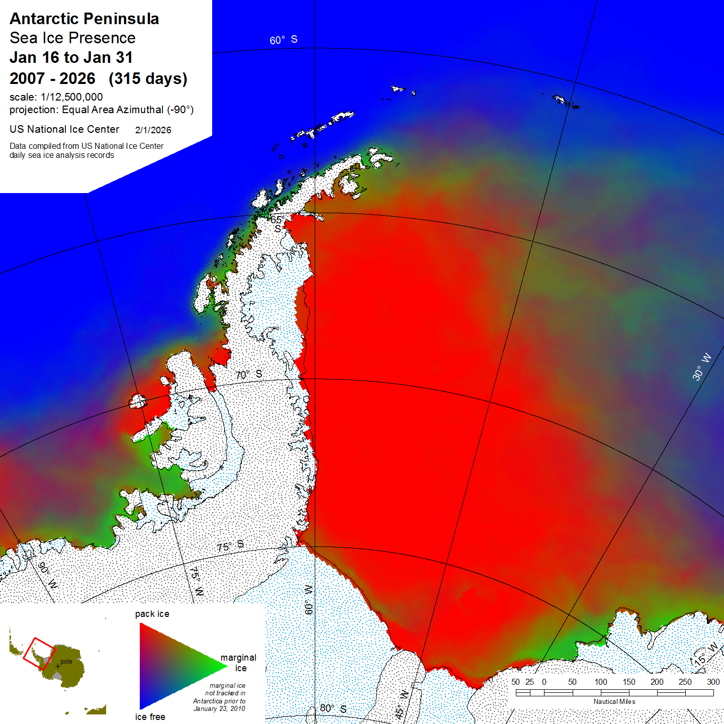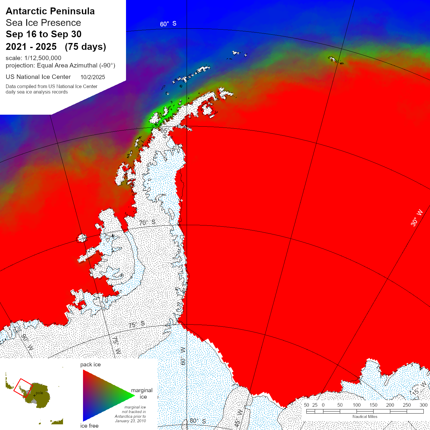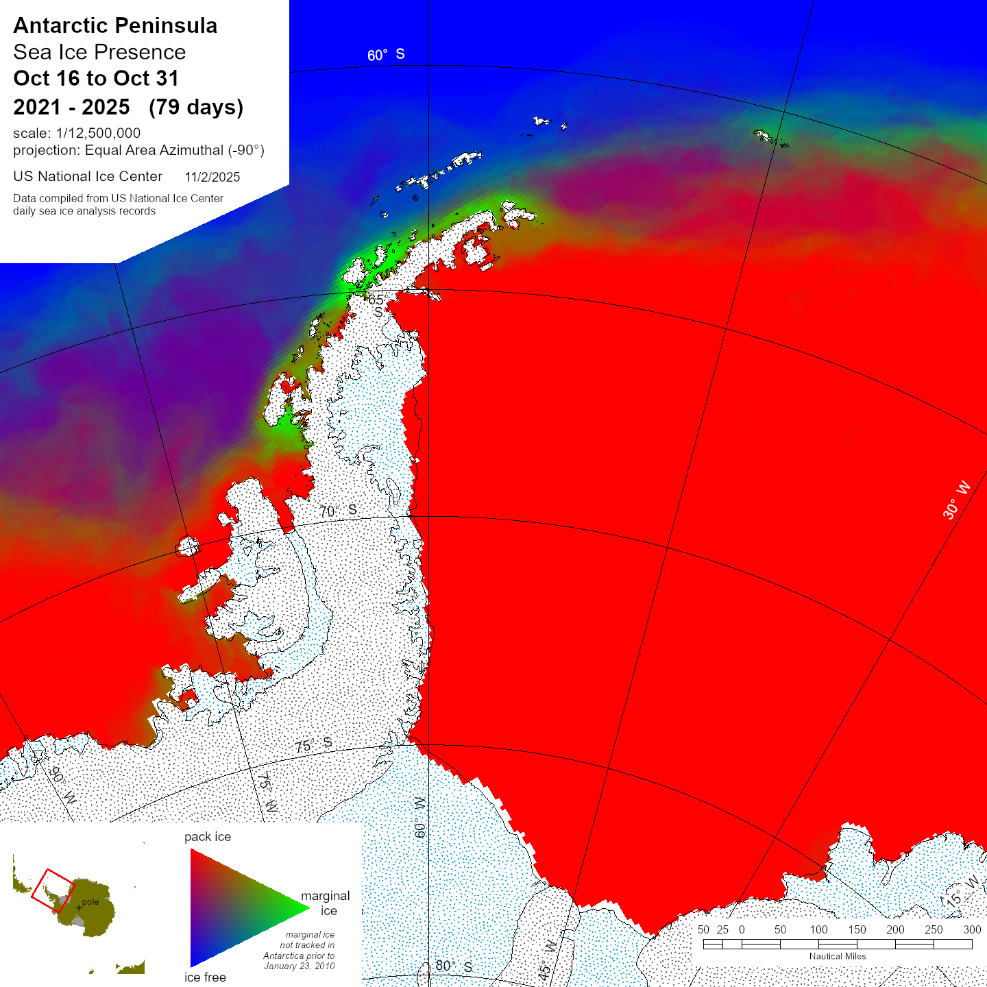 Graphic representation of ice information gathered over a specified time that is contained within the Antarctic Peninsula region.