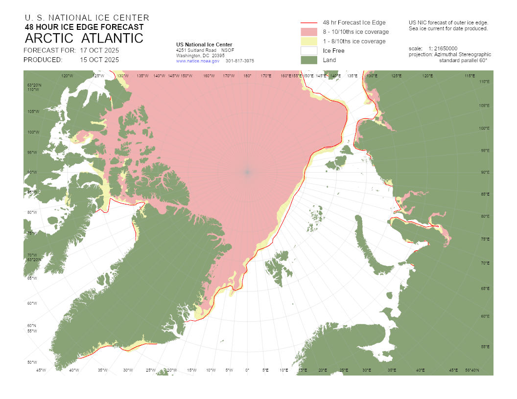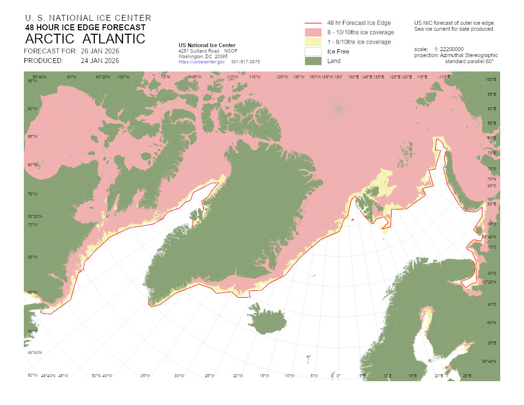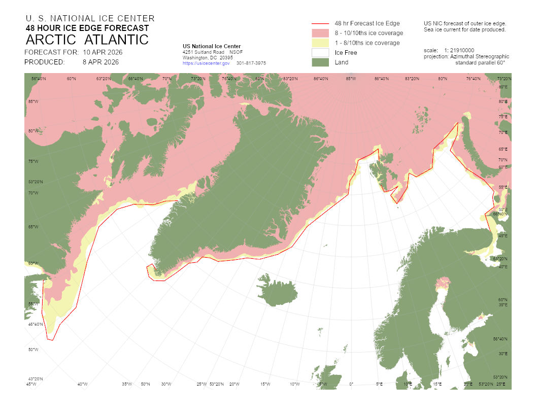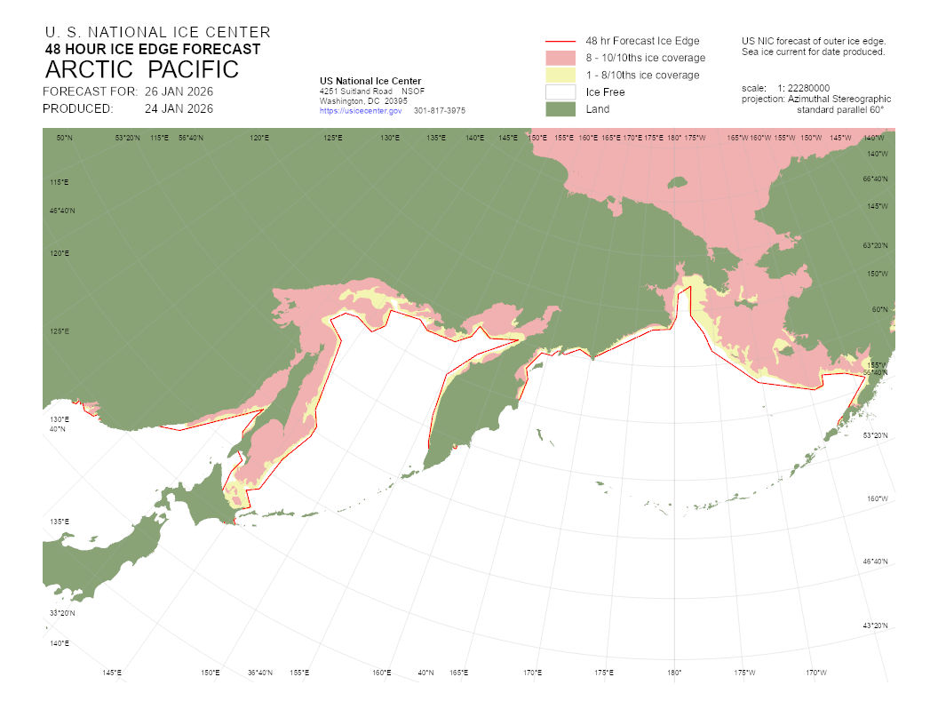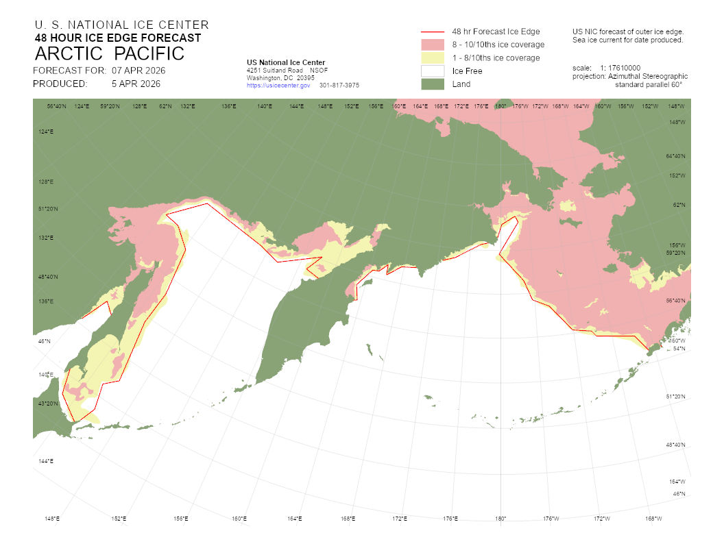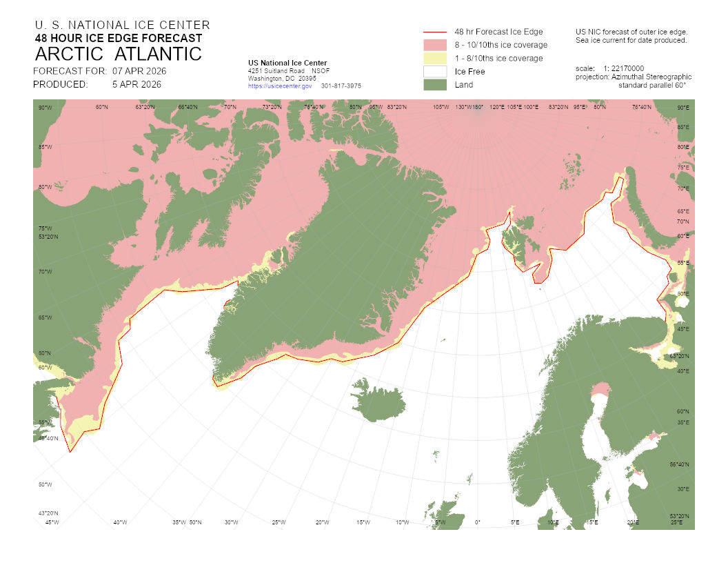 A graphical representation of the daily ice analysis that depicts ice free in white, marginal ice zone (ice concentration up to 80%) in yellow, and pack ice (ice concentration 80% and greater) in pink. The graphic also displays the 48-hour forecast ice edge line. Both products are created to cover the entire Arctic based on region, Atlantic and Pacific.