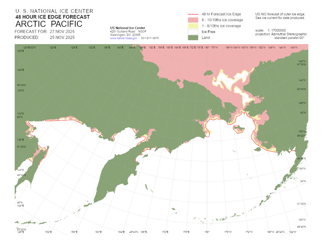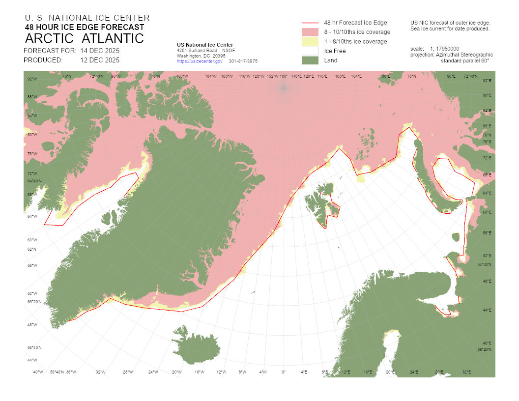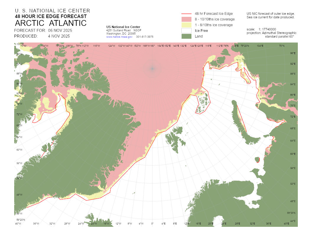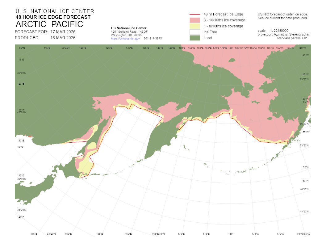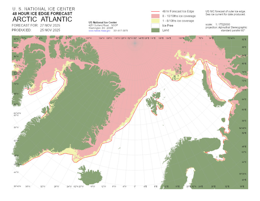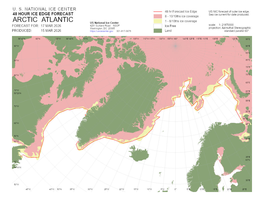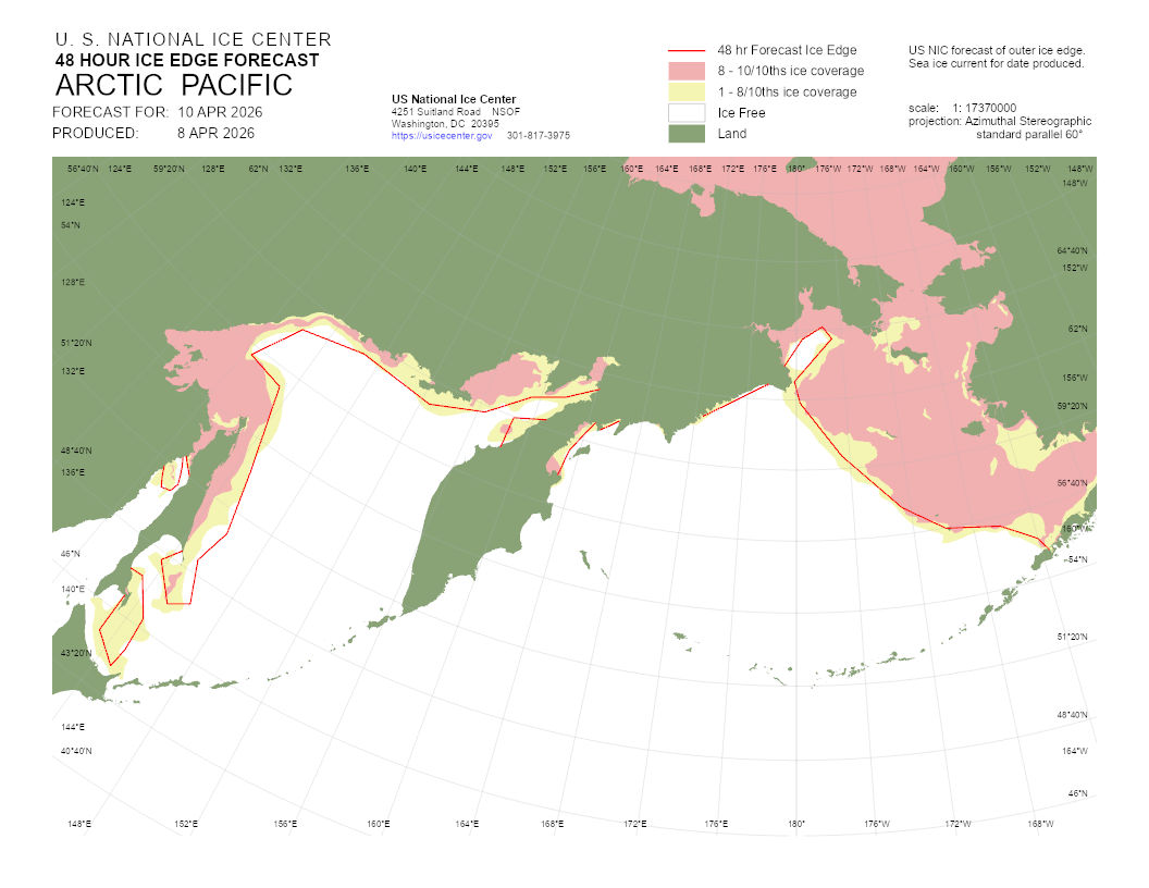A graphical representation of the daily ice analysis that depicts ice free in white, marginal ice zone (ice concentration up to 80%) in yellow, and pack ice (ice concentration 80% and greater) in pink. The graphic also displays the 48-hour forecast ice edge line. Both products are created to cover the entire Arctic based on region, Atlantic and Pacific.