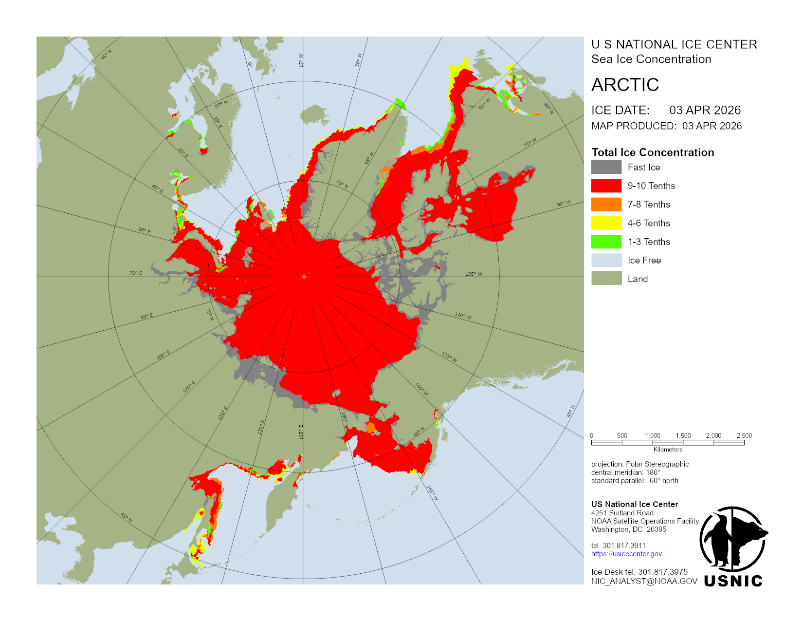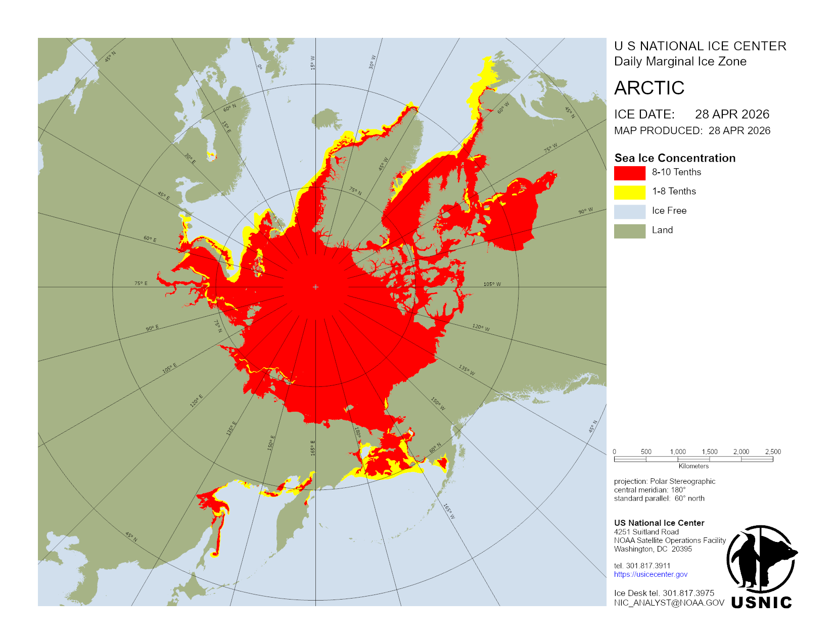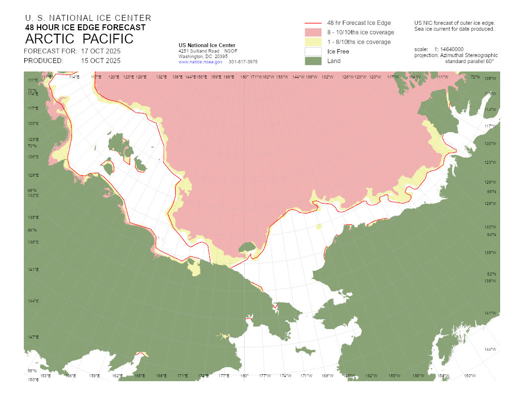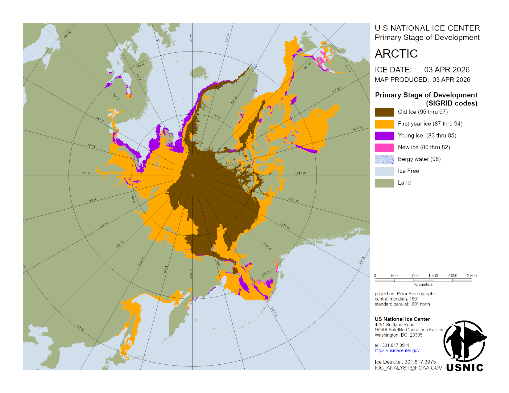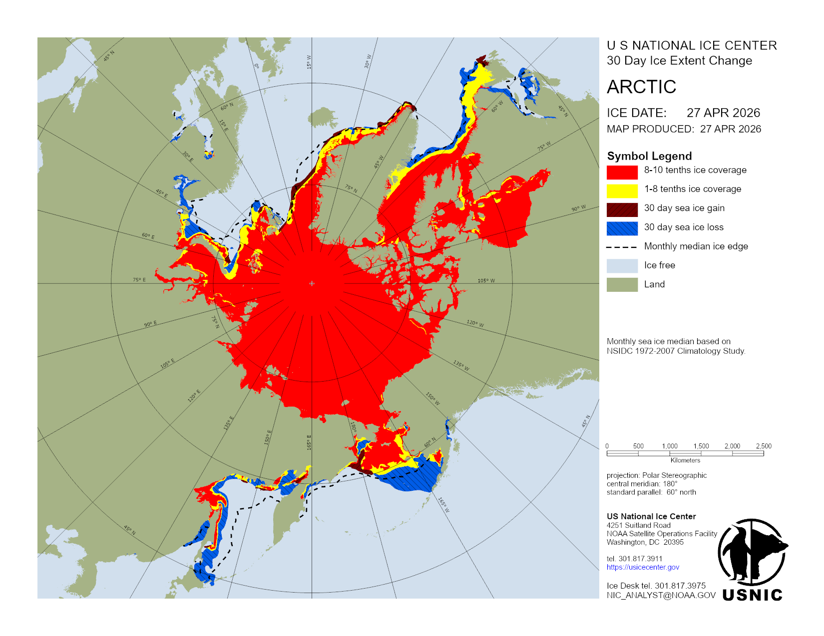 Based on U.S. National Ice Center's Arctic daily and weekly analyses, various ice charts are produced to represent ice conditions in a graphical format. Ice conditions are based on ice concentrations, stage of development (ice type / thickness), and 30 day ice concentration changes.