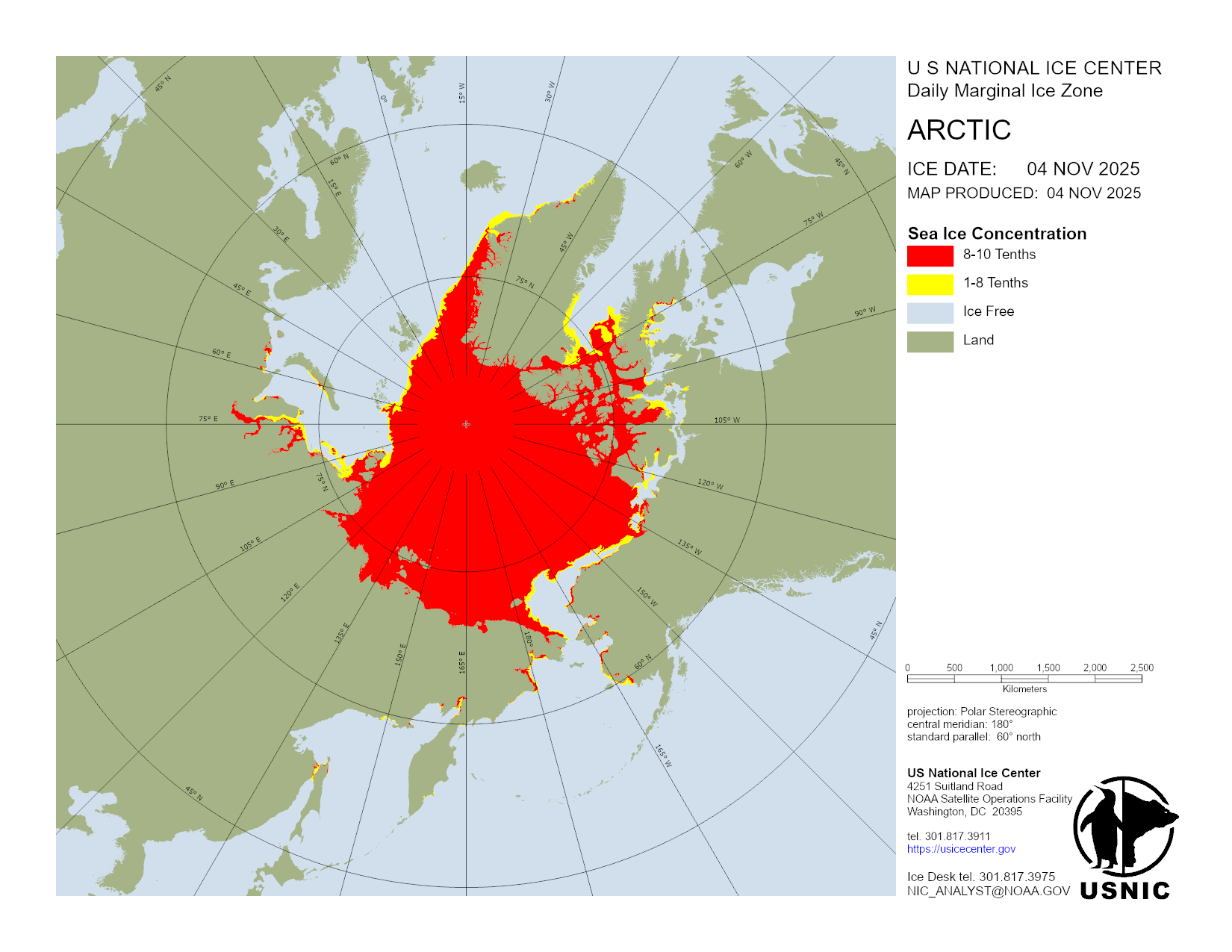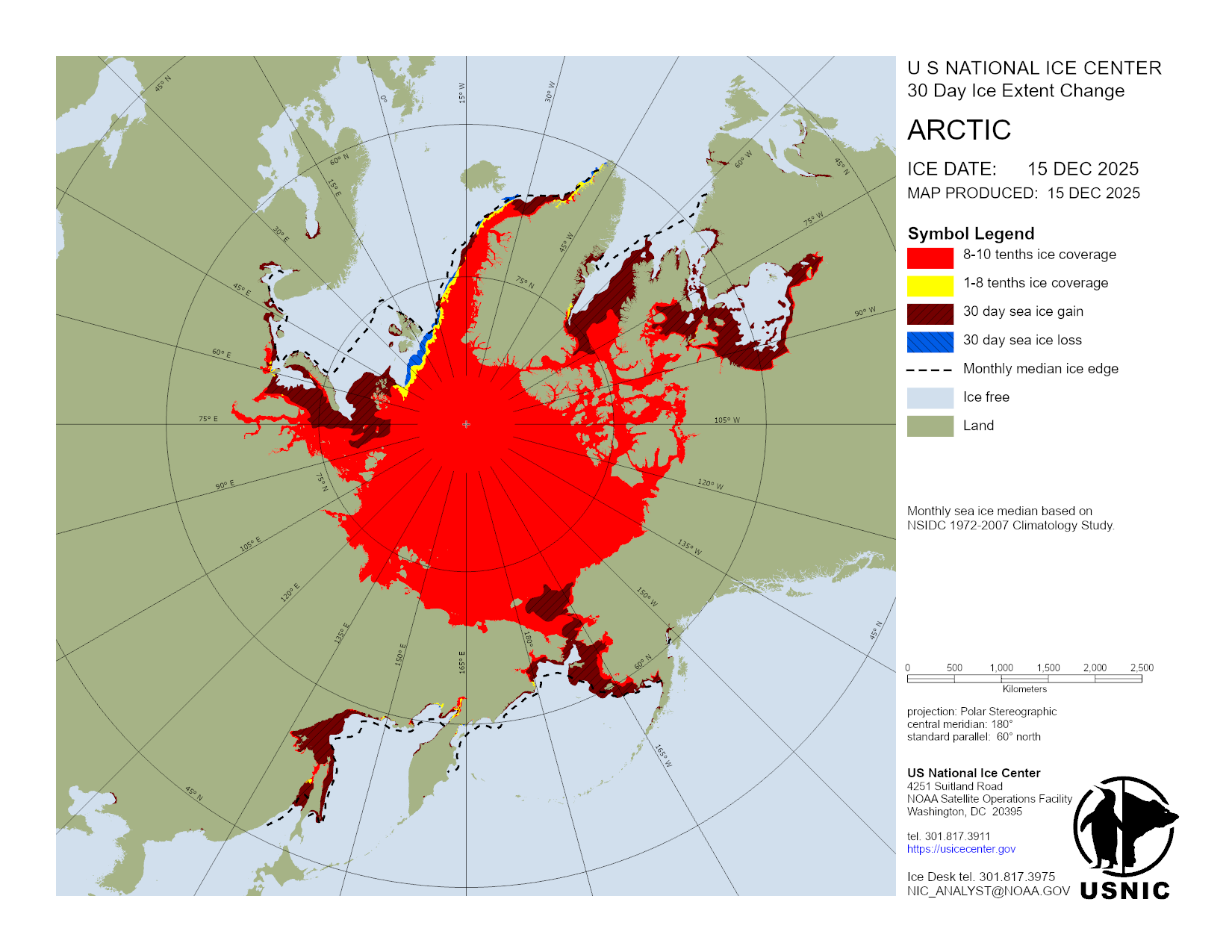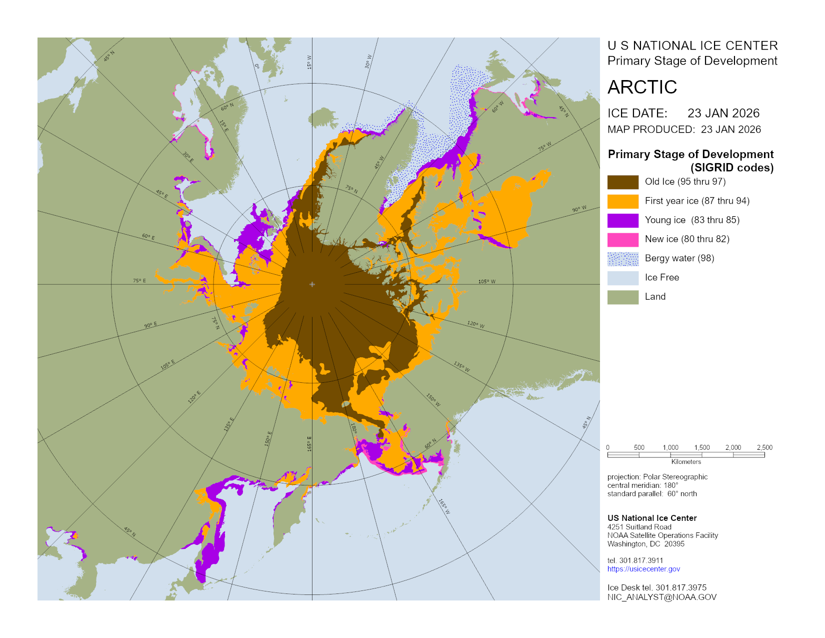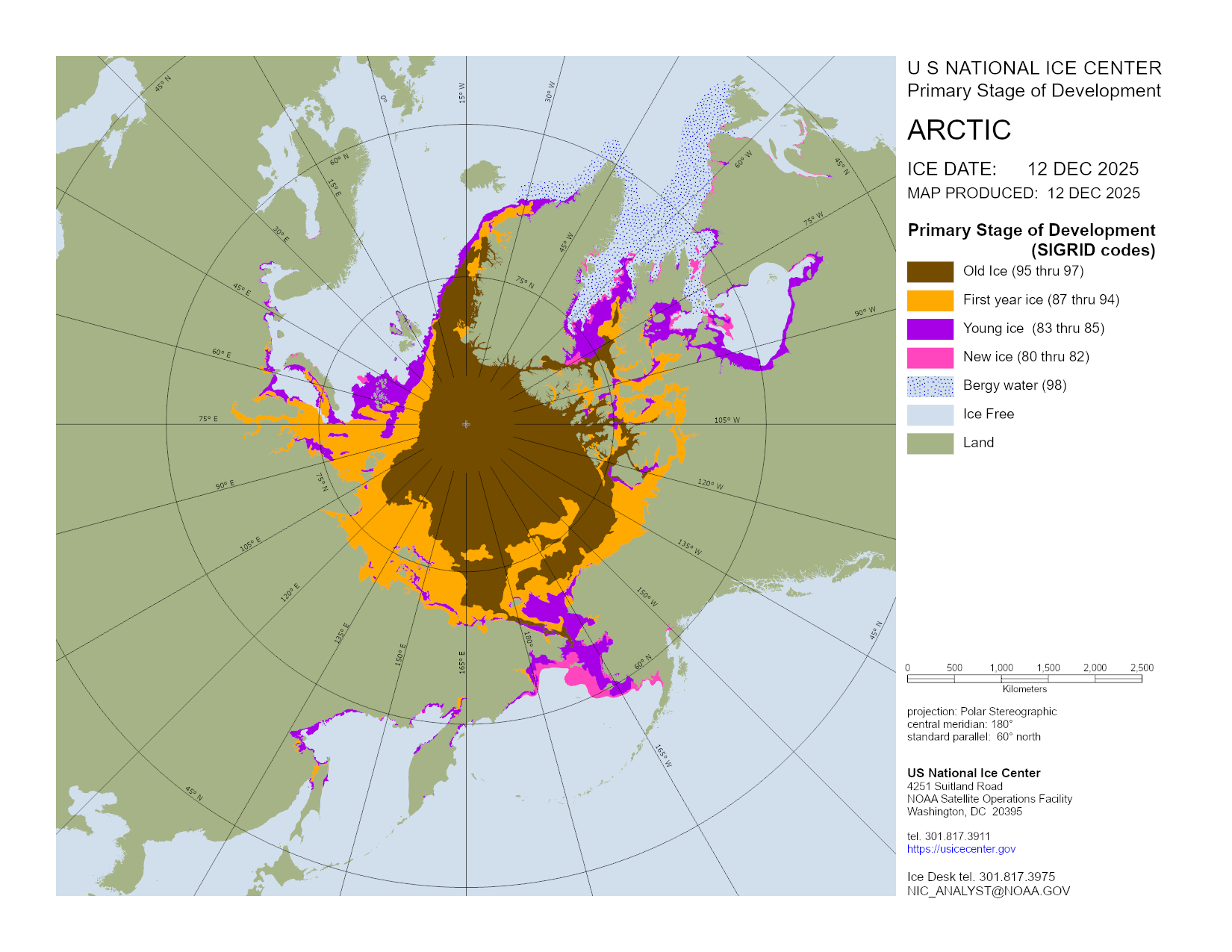 Based on U.S. National Ice Center's Arctic daily and weekly analyses, various ice charts are produced to represent ice conditions in a graphical format. Ice conditions are based on ice concentrations, stage of development (ice type / thickness), and 30 day ice concentration changes.