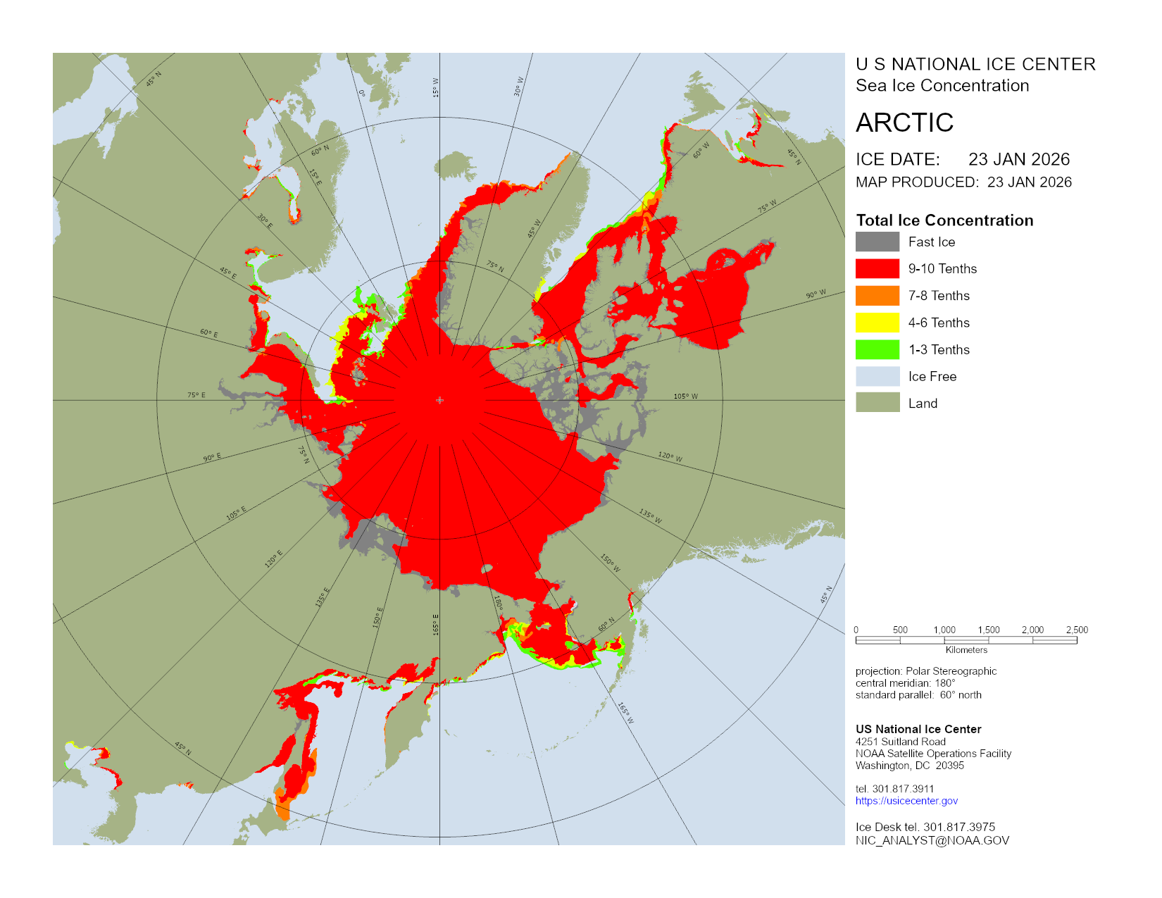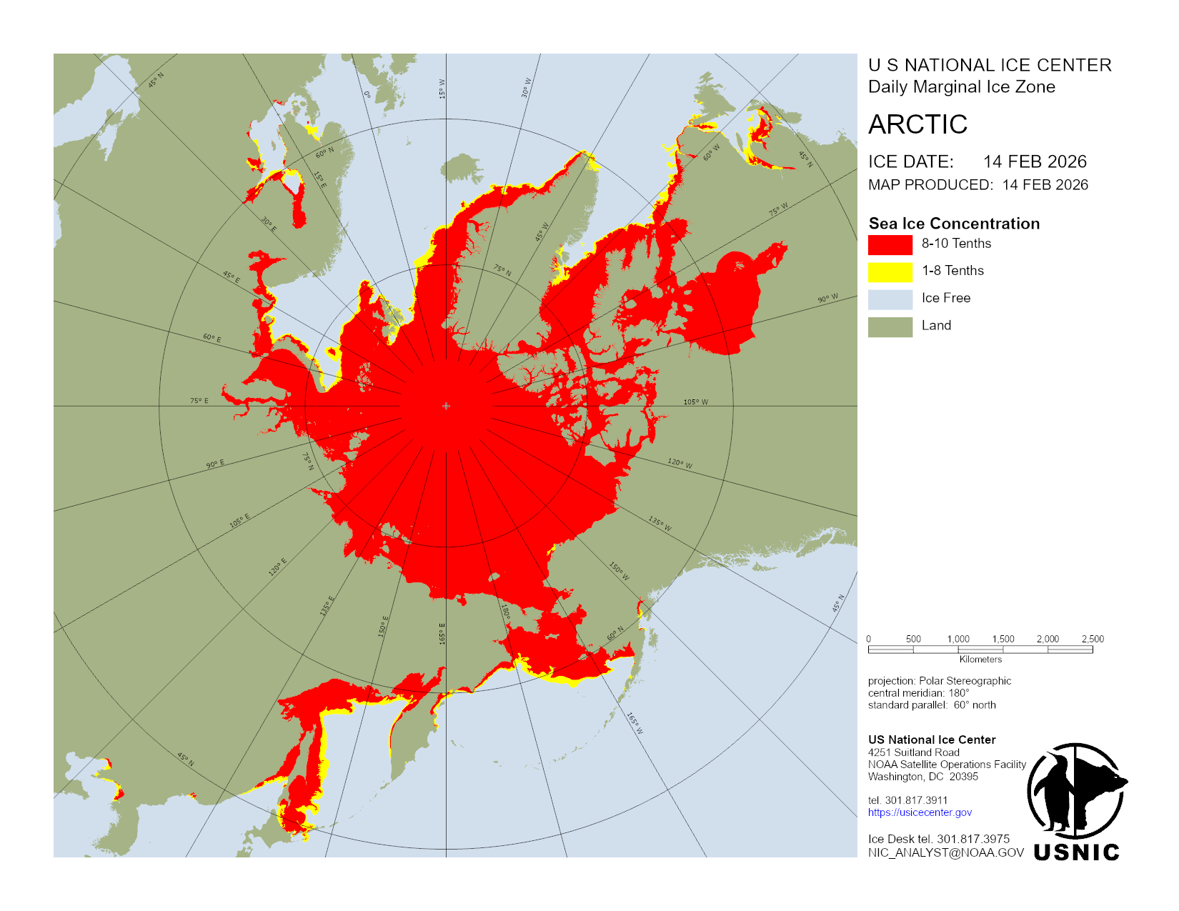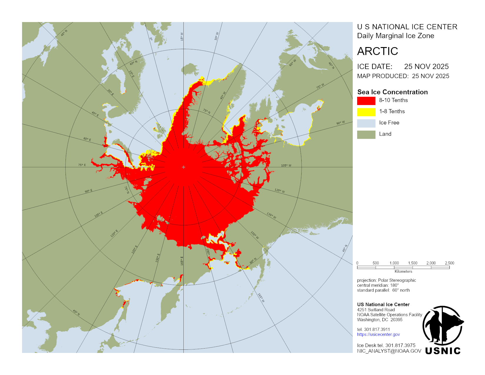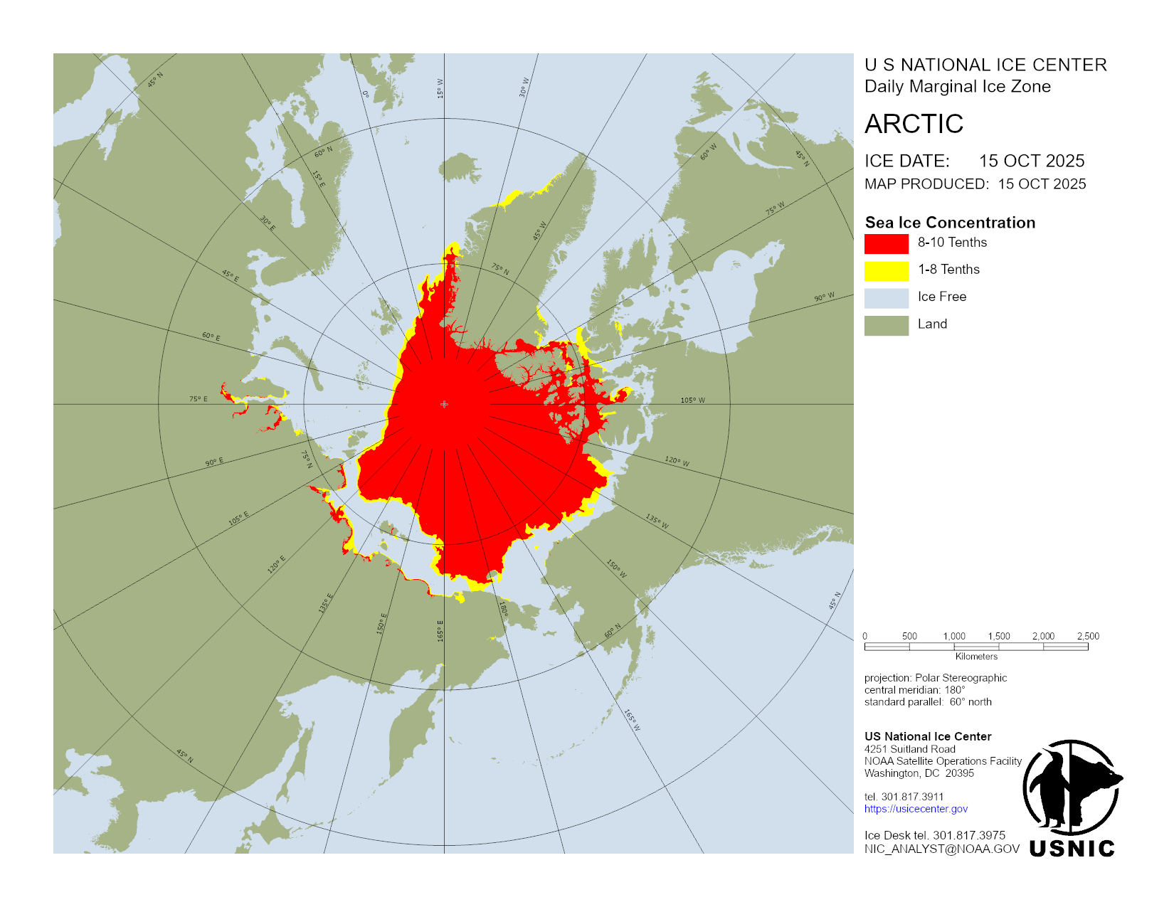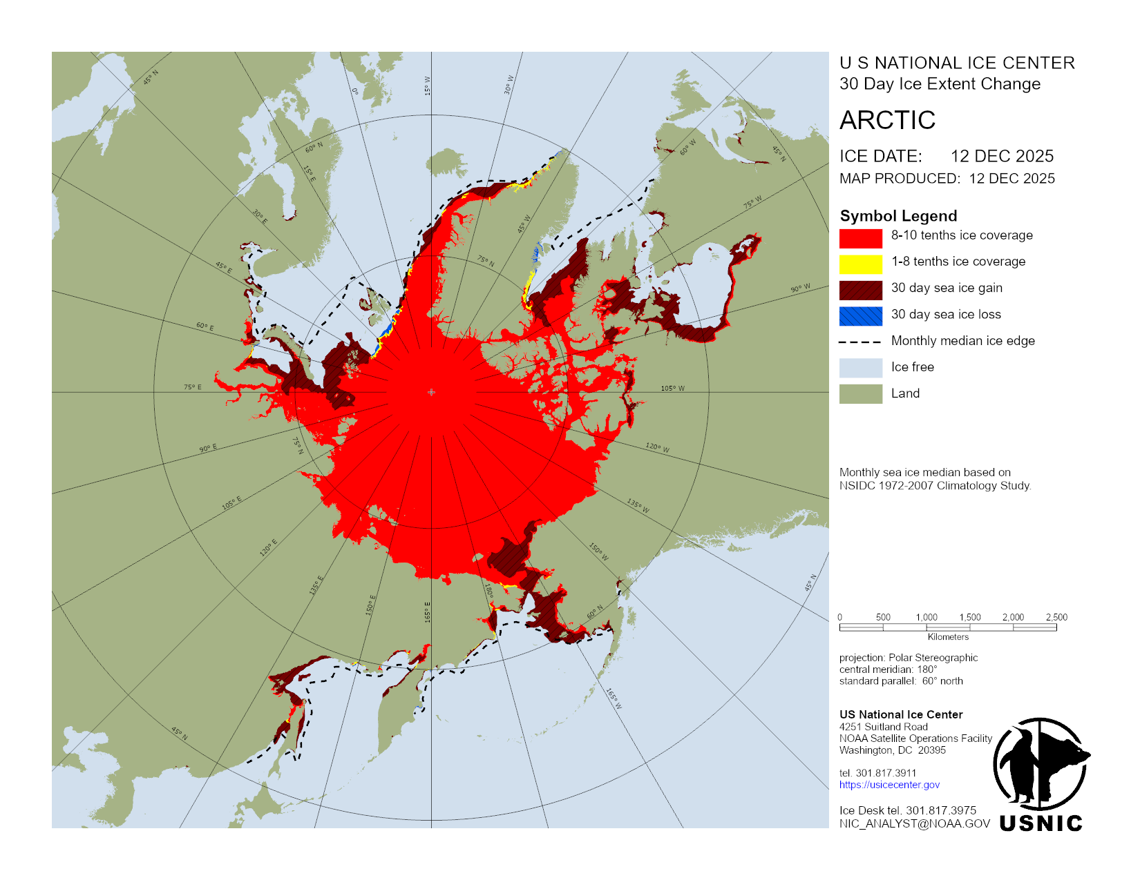 Based on U.S. National Ice Center's Arctic daily and weekly analyses, various ice charts are produced to represent ice conditions in a graphical format. Ice conditions are based on ice concentrations, stage of development (ice type / thickness), and 30 day ice concentration changes.