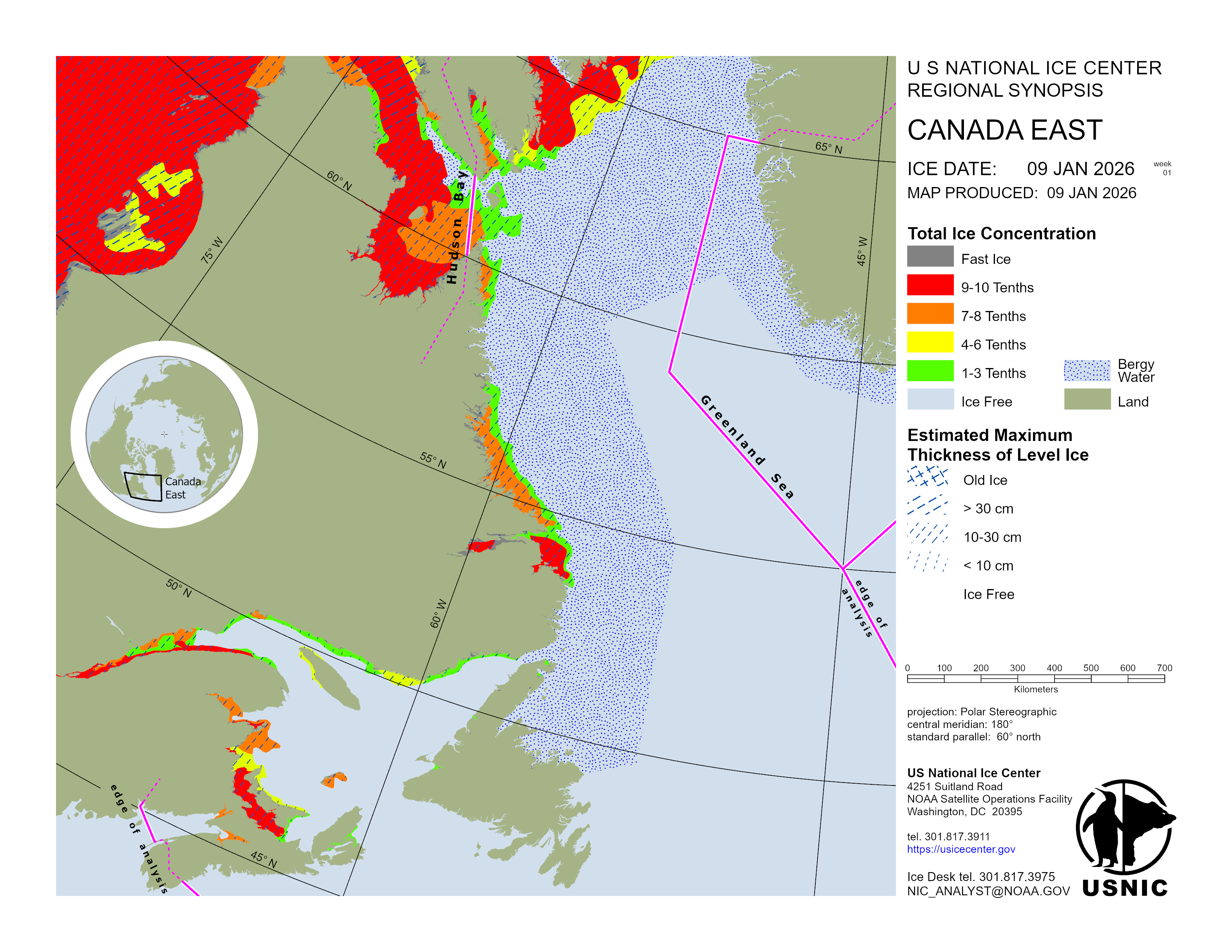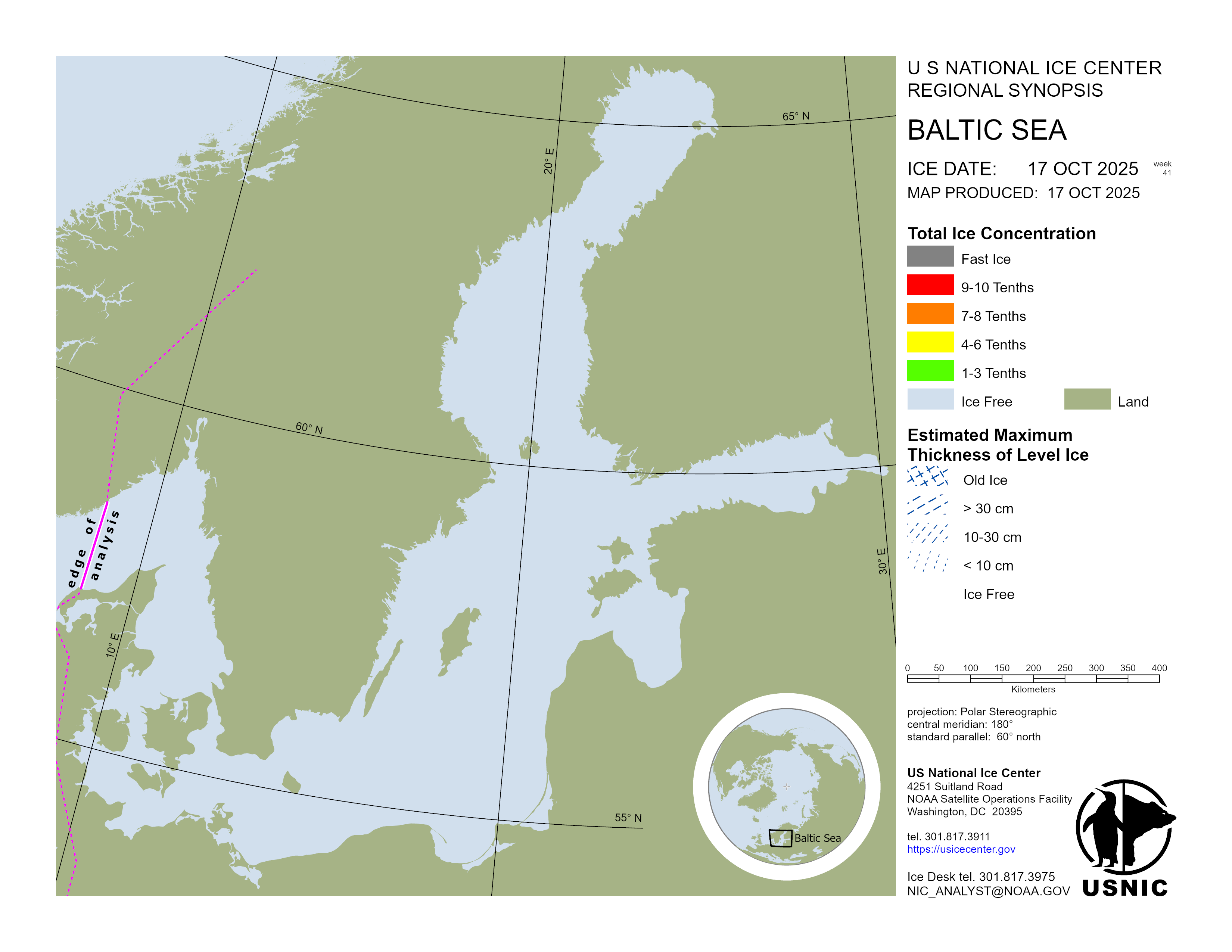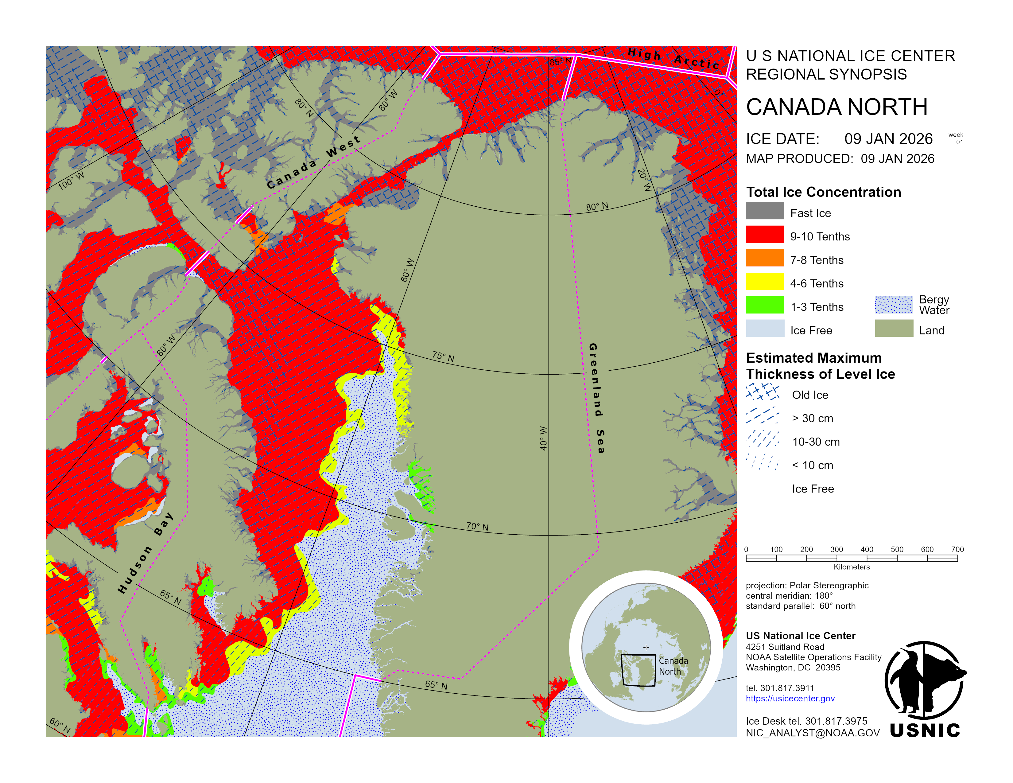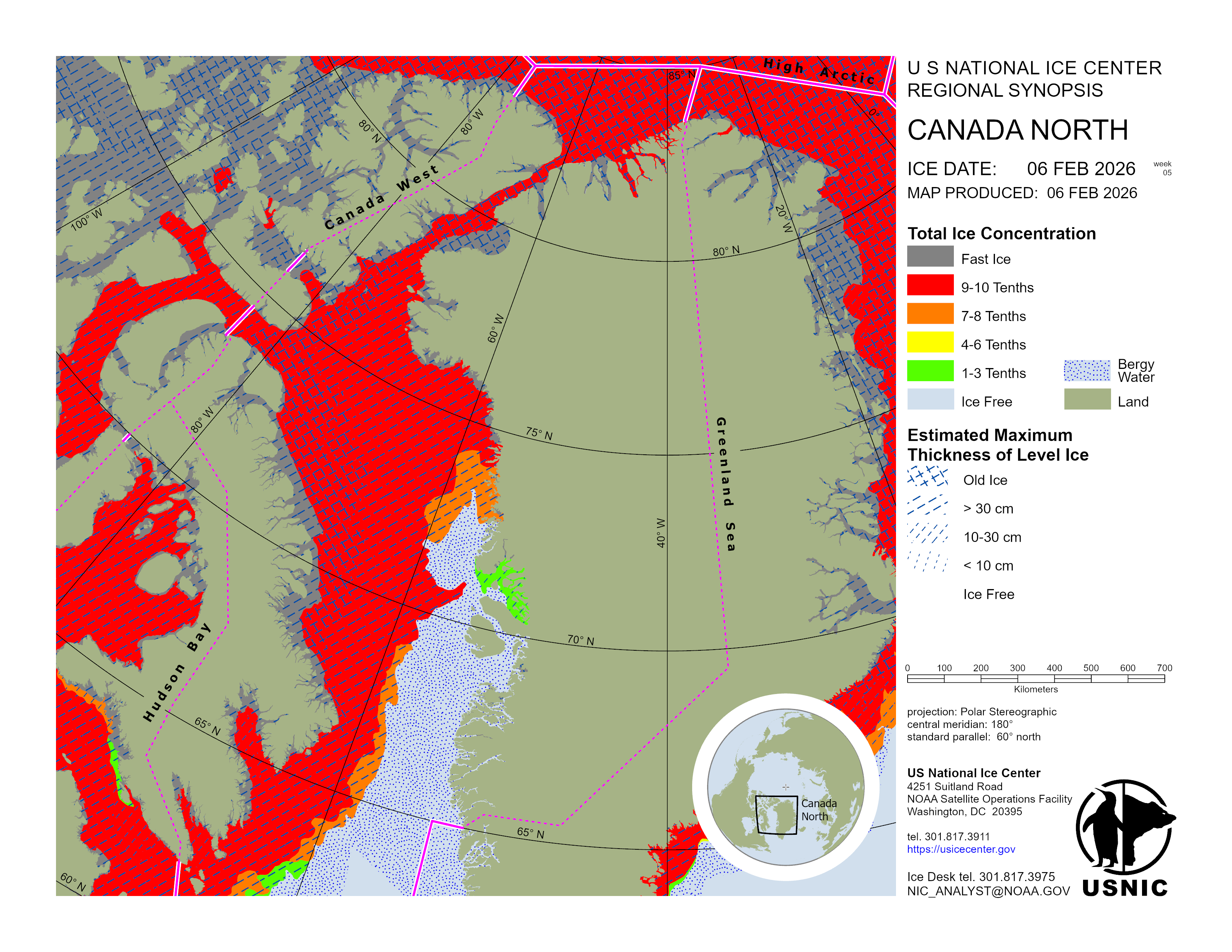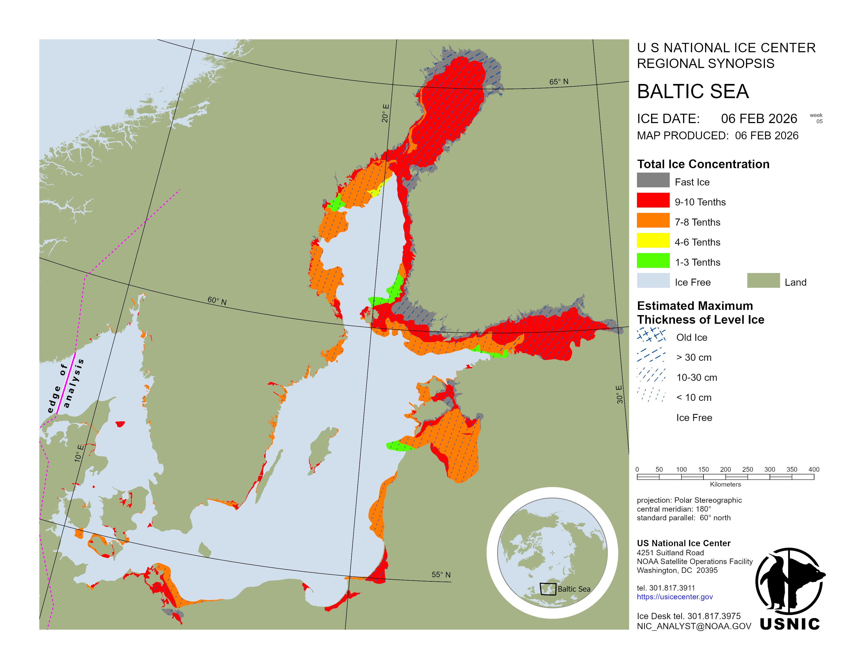 Regional charts and associated synopsis write-up capture ice and environmental conditions throughout the Arctic which are based on the U.S. National Ice Center’s weekly analysis. Charts and synopses are updated weekly on Fridays. Note: Baltic Sea analysis is provided by the Finnish Meteorological Institute. The Canadian Archipelago (Canada East, Canada North, Canada West, and Hudson Bay) analysis is provided by the Canadian Ice Service.