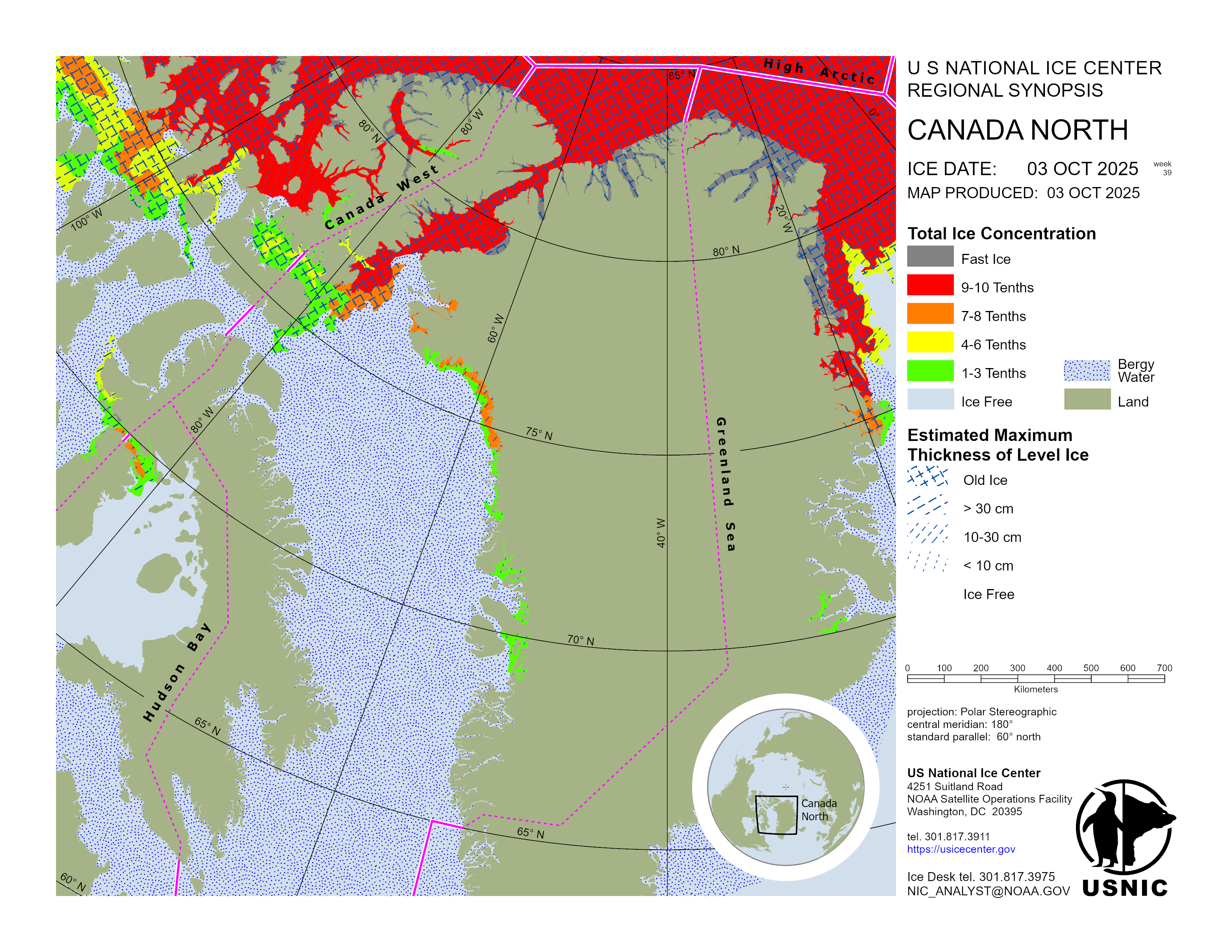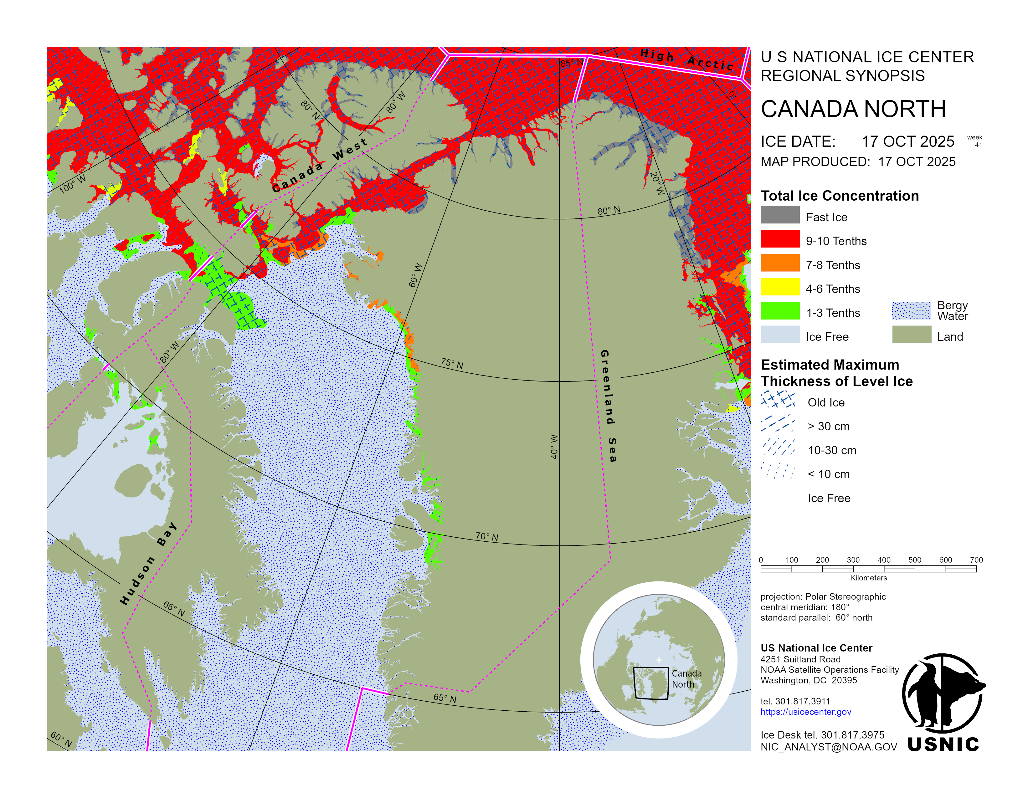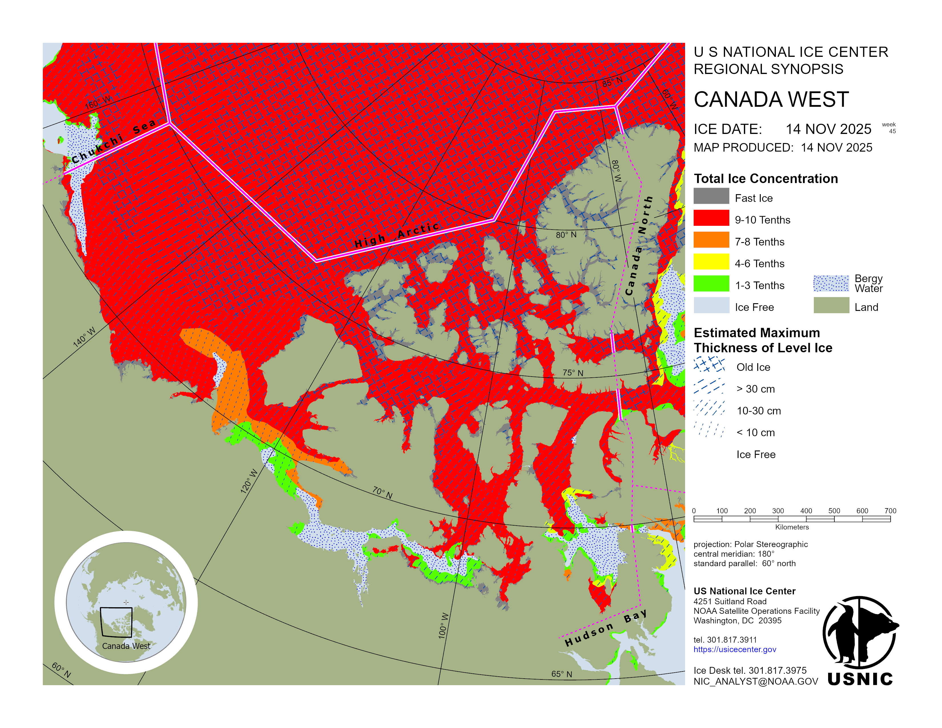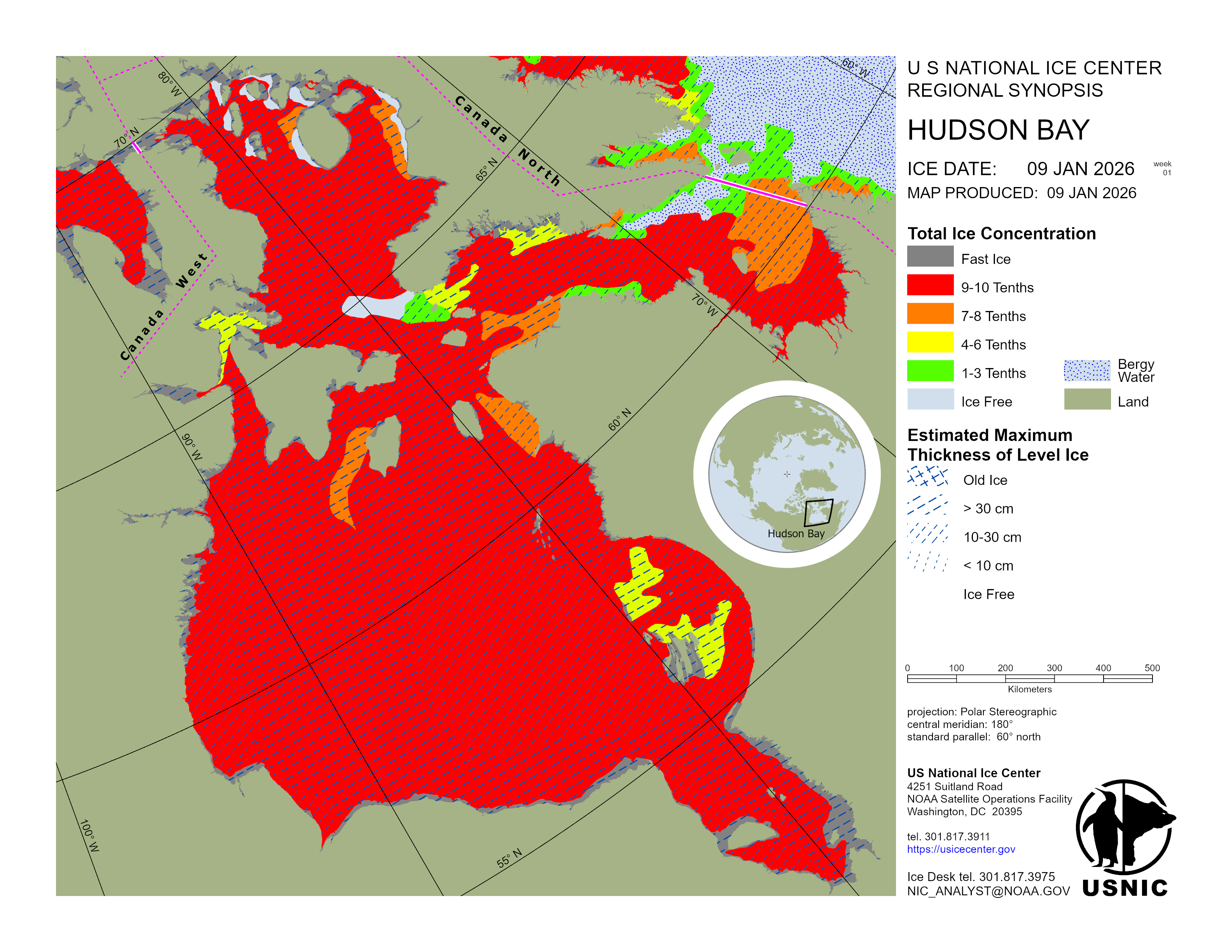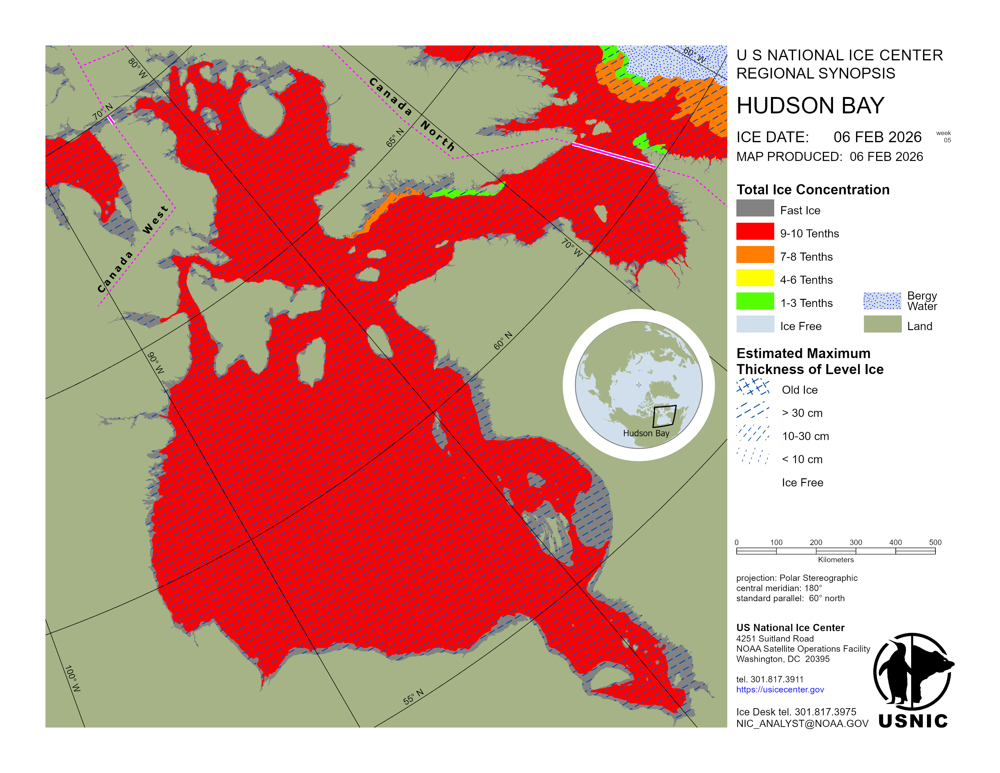 Regional charts and associated synopsis write-up capture ice and environmental conditions throughout the Arctic which are based on the U.S. National Ice Center’s weekly analysis. Charts and synopses are updated weekly on Fridays. Note: Baltic Sea analysis is provided by the Finnish Meteorological Institute. The Canadian Archipelago (Canada East, Canada North, Canada West, and Hudson Bay) analysis is provided by the Canadian Ice Service.