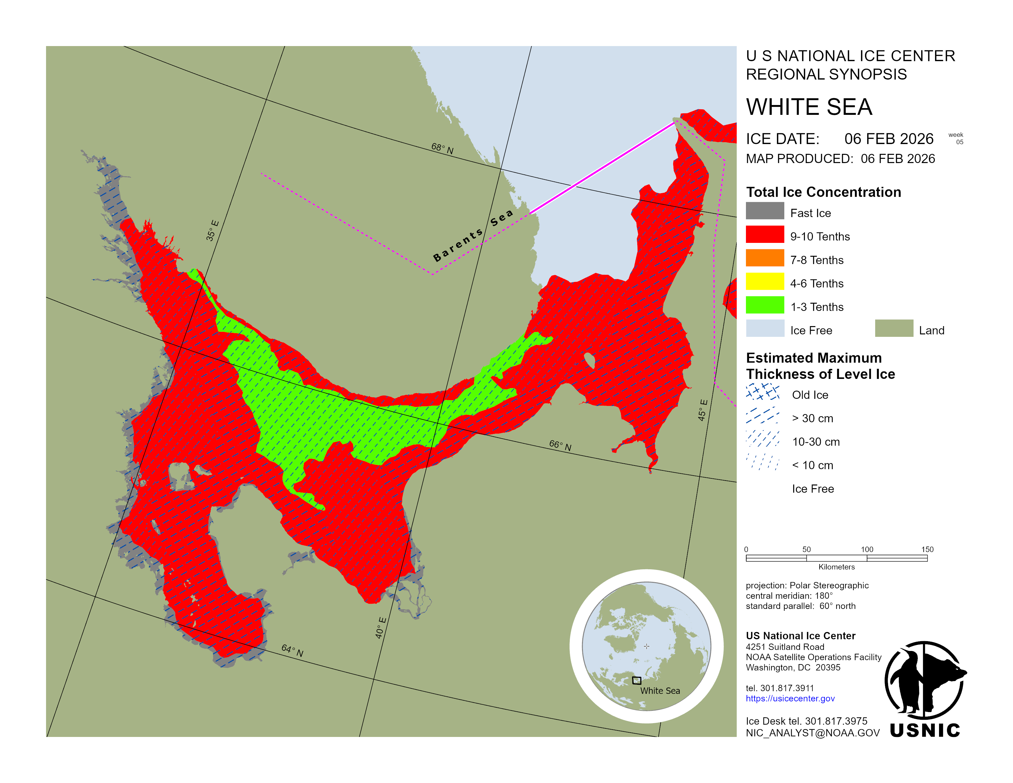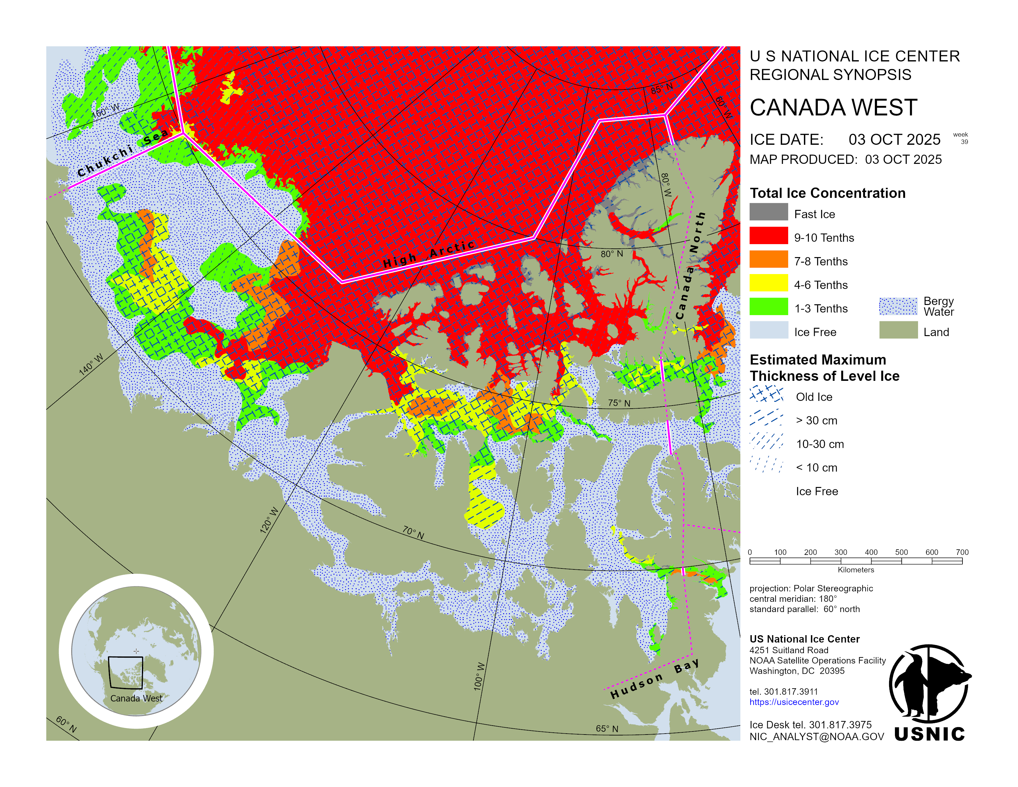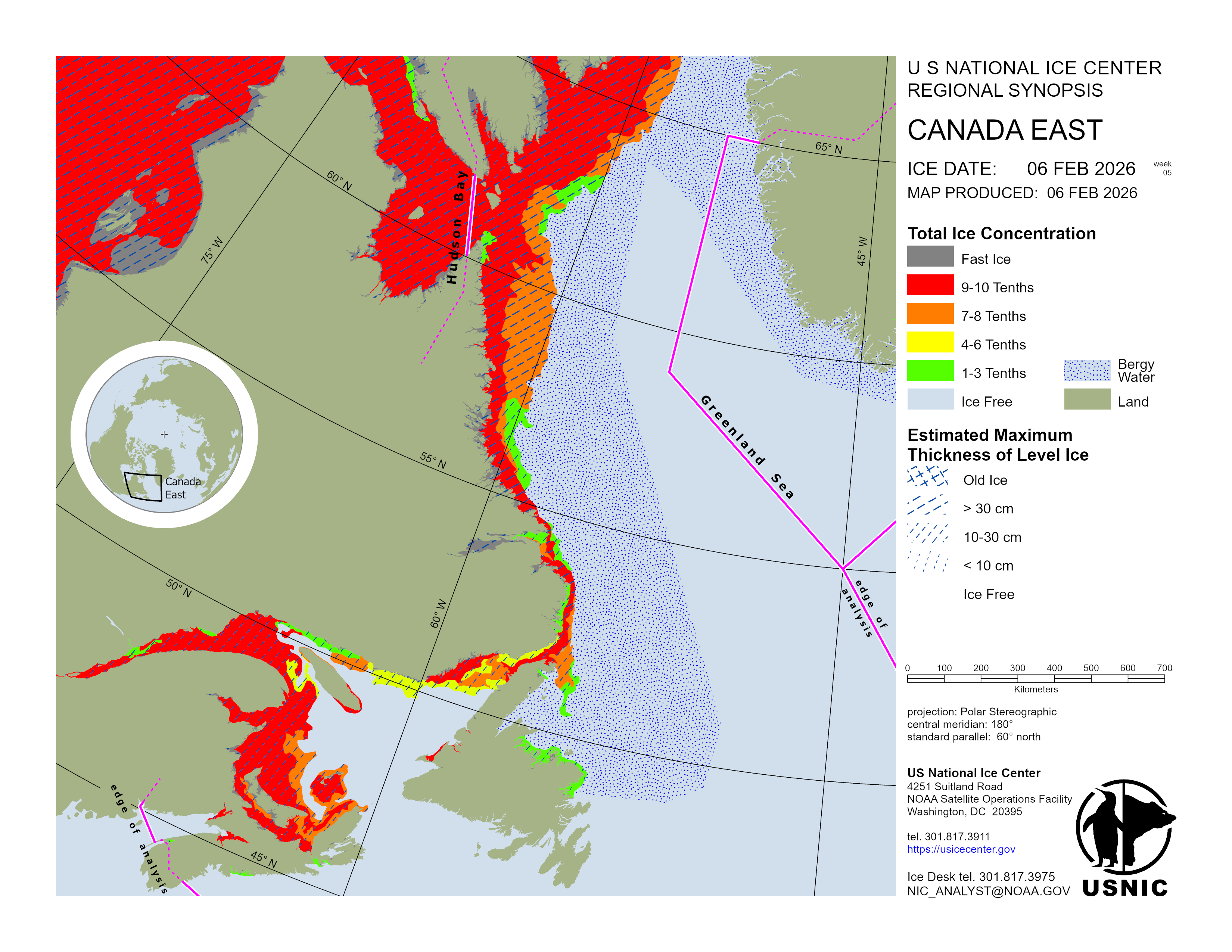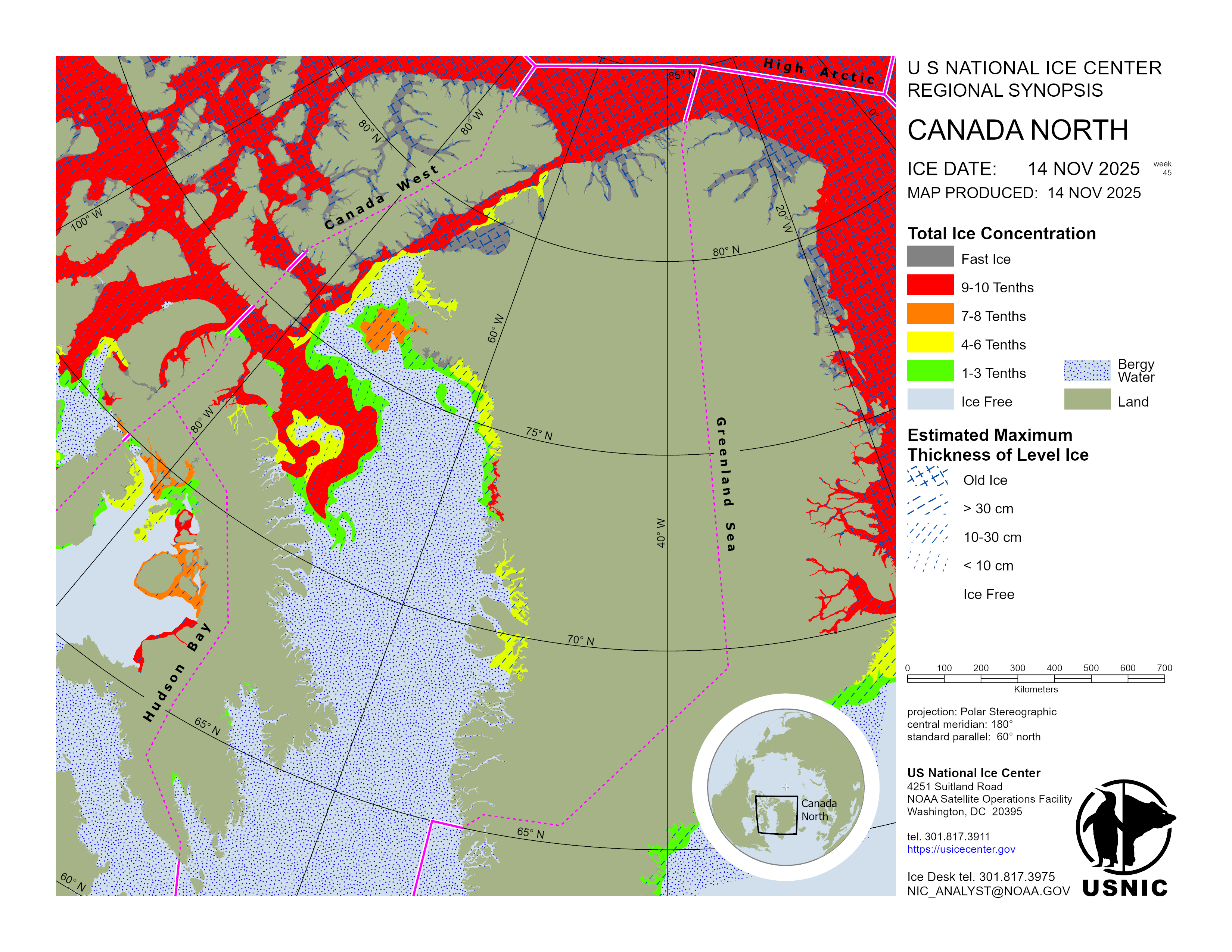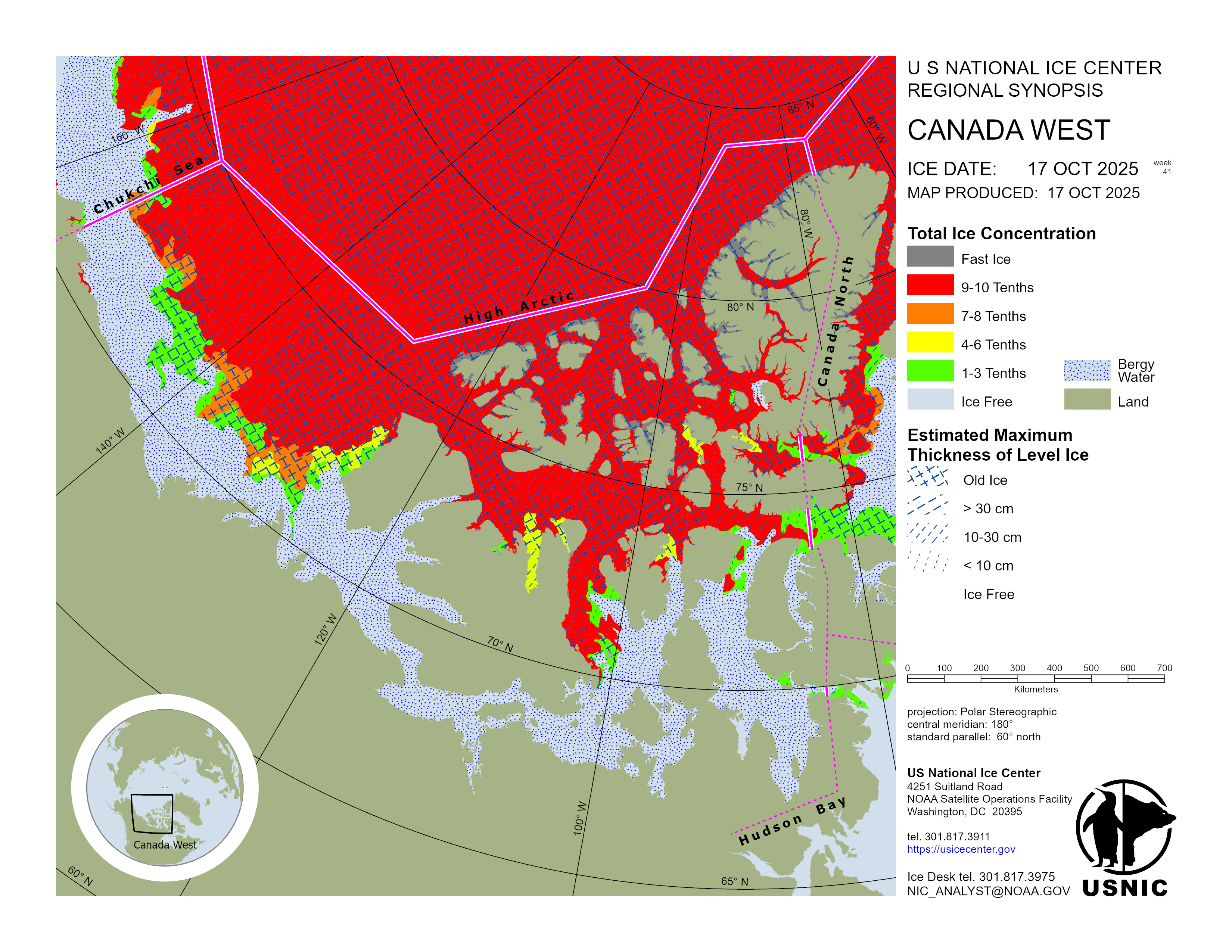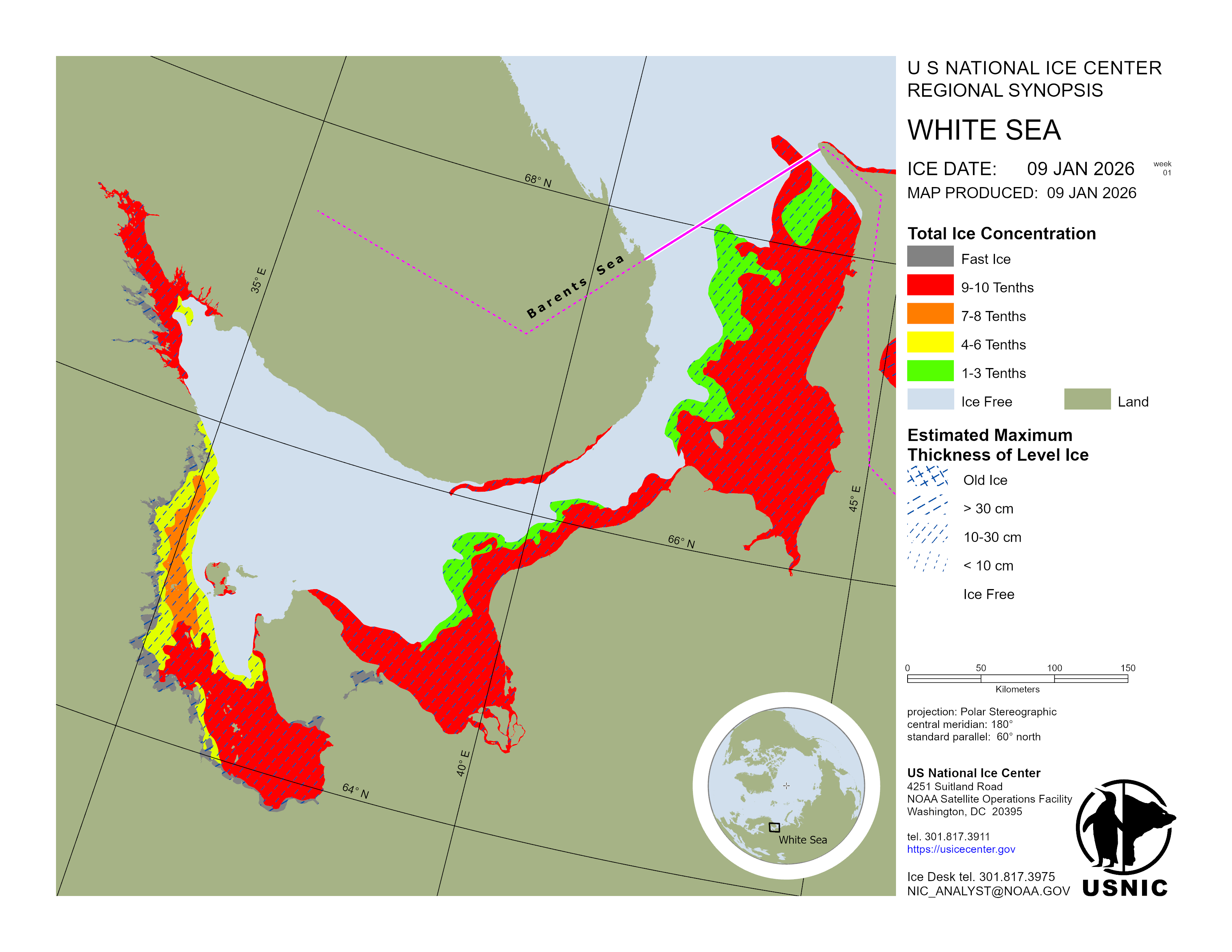 Regional charts and associated synopsis write-up capture ice and environmental conditions throughout the Arctic which are based on the U.S. National Ice Center’s weekly analysis. Charts and synopses are updated weekly on Fridays. Note: Baltic Sea analysis is provided by the Finnish Meteorological Institute. The Canadian Archipelago (Canada East, Canada North, Canada West, and Hudson Bay) analysis is provided by the Canadian Ice Service.