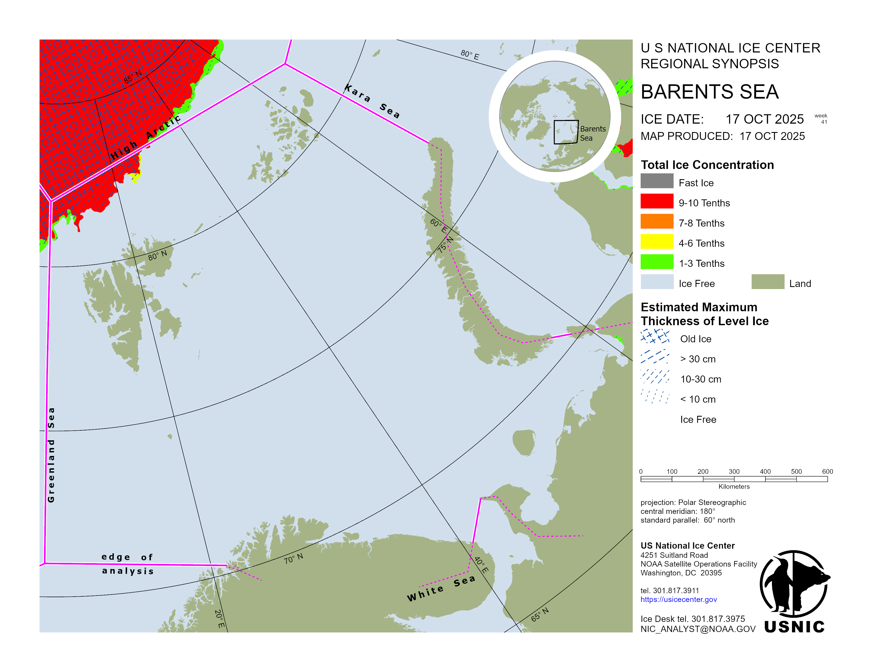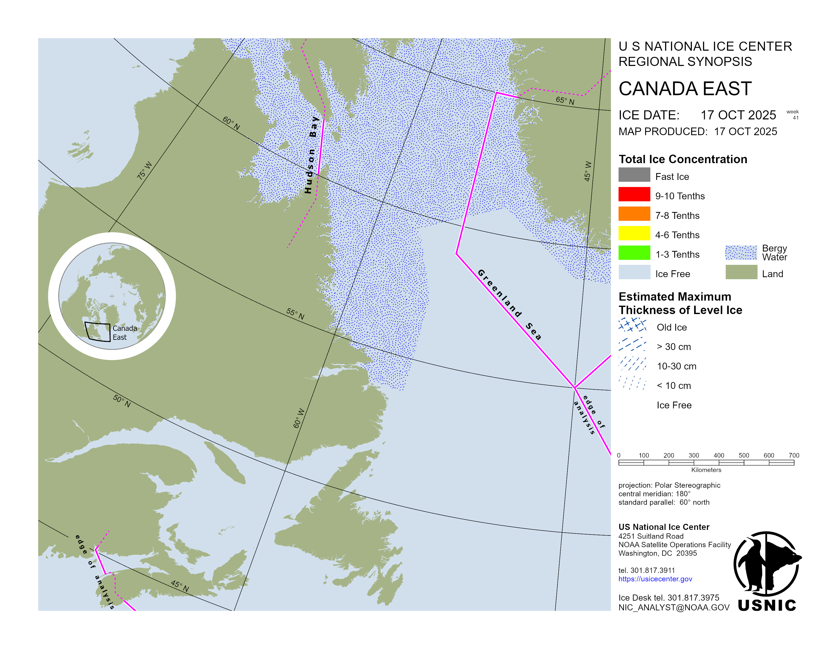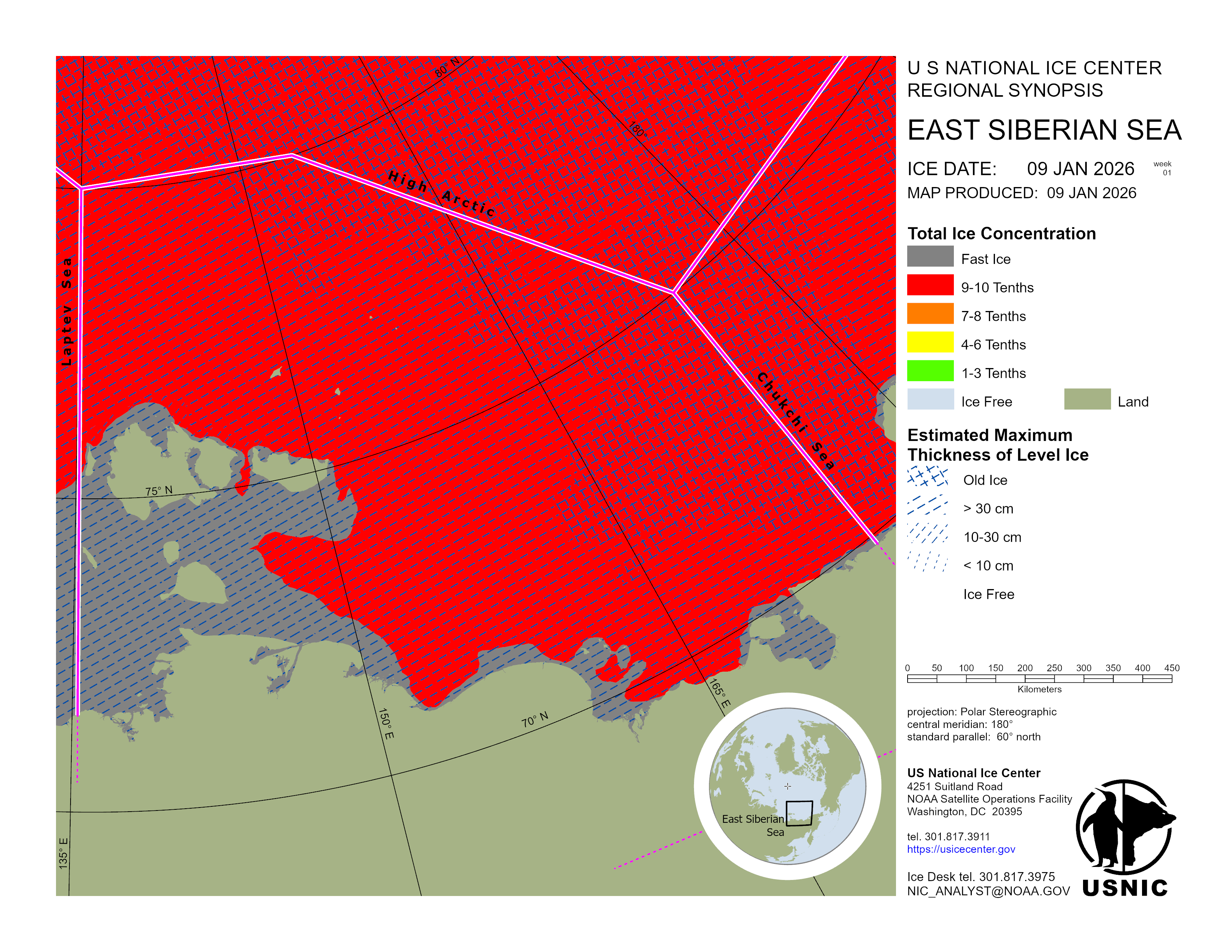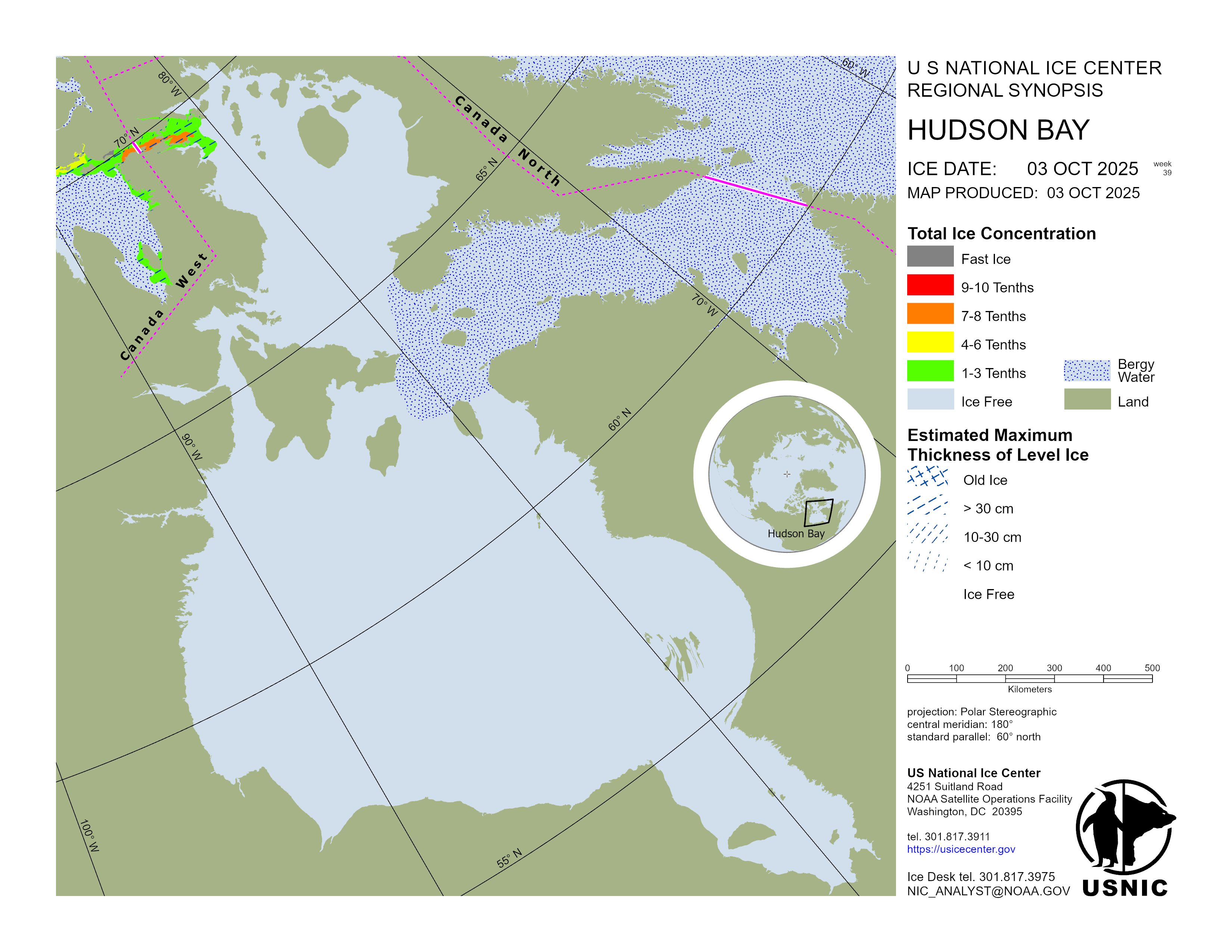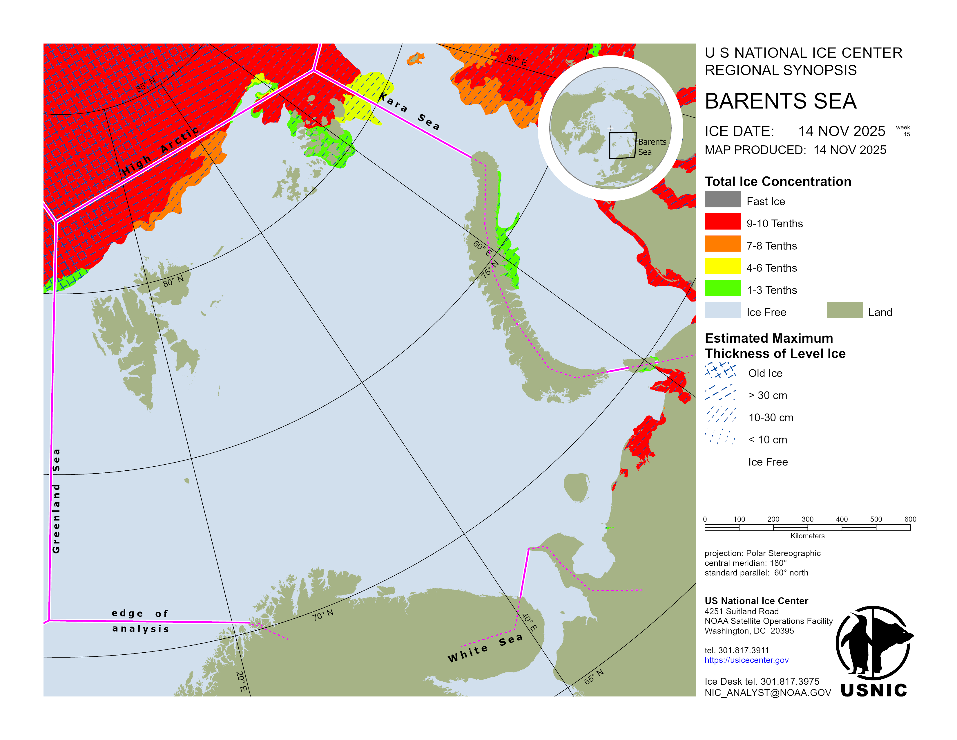Regional charts and associated synopsis write-up capture ice and environmental conditions throughout the Arctic which are based on the U.S. National Ice Center’s weekly analysis. Charts and synopses are updated weekly on Fridays. Note: Baltic Sea analysis is provided by the Finnish Meteorological Institute. The Canadian Archipelago (Canada East, Canada North, Canada West, and Hudson Bay) analysis is provided by the Canadian Ice Service.