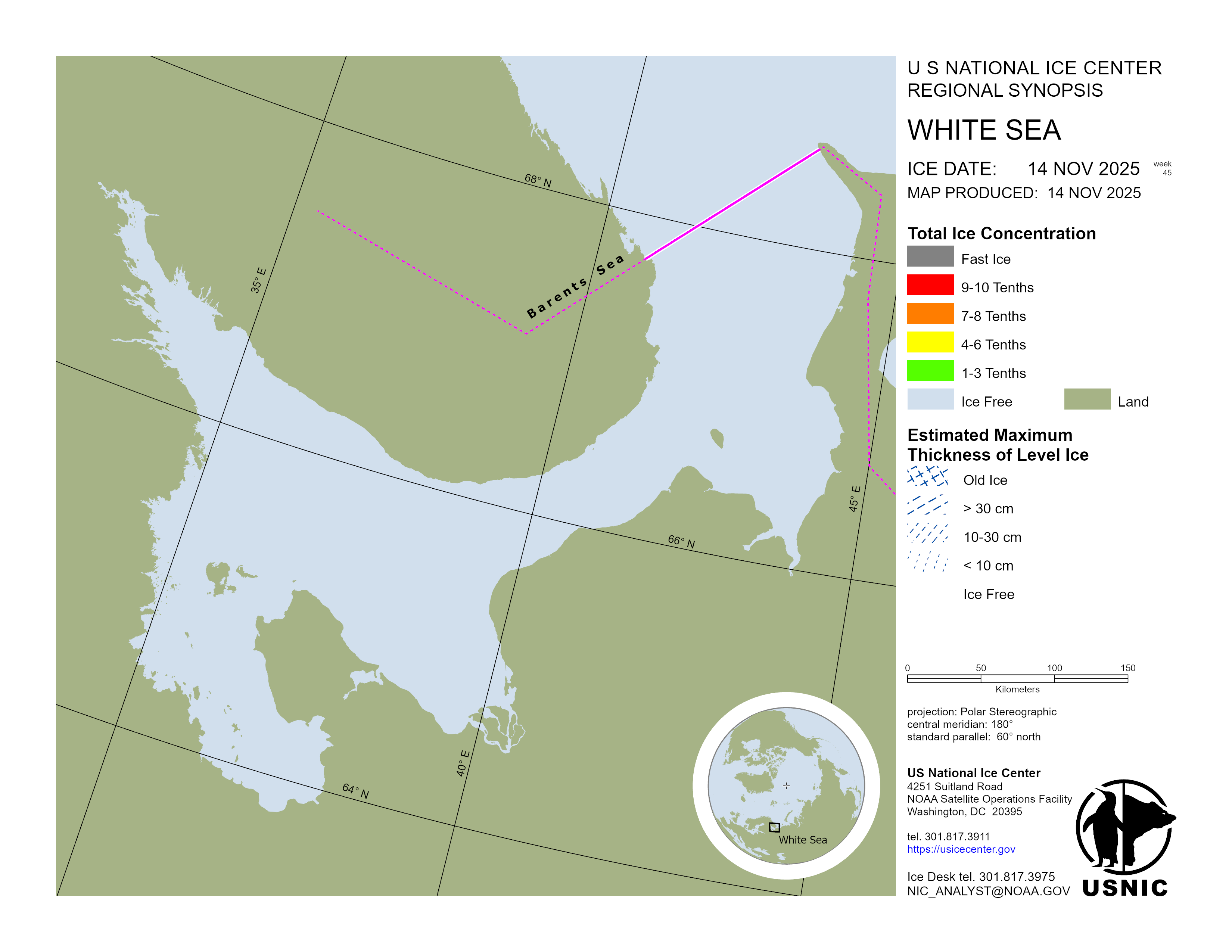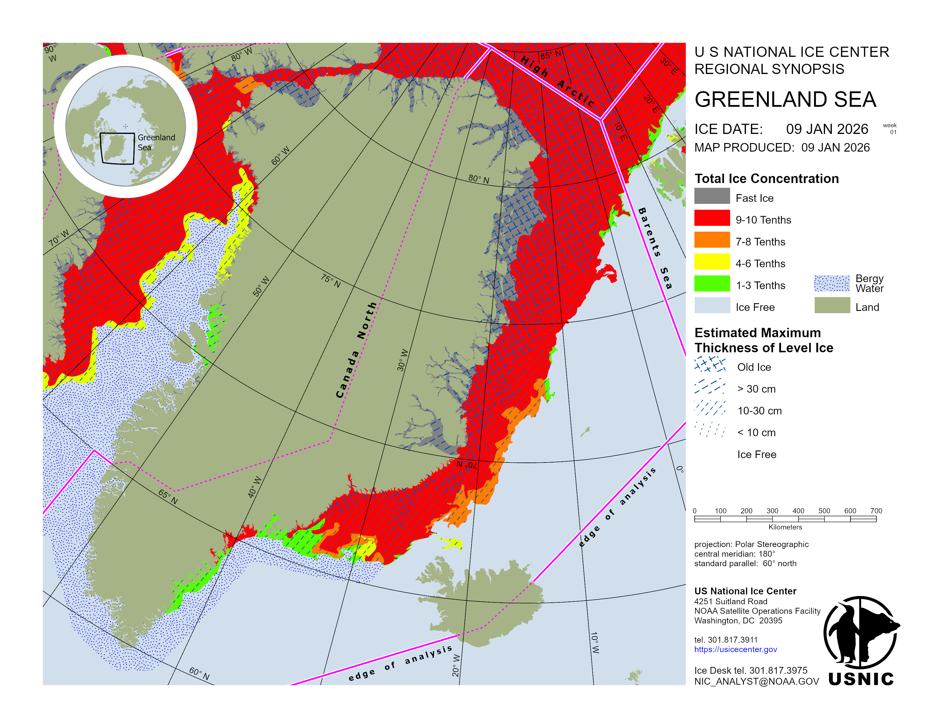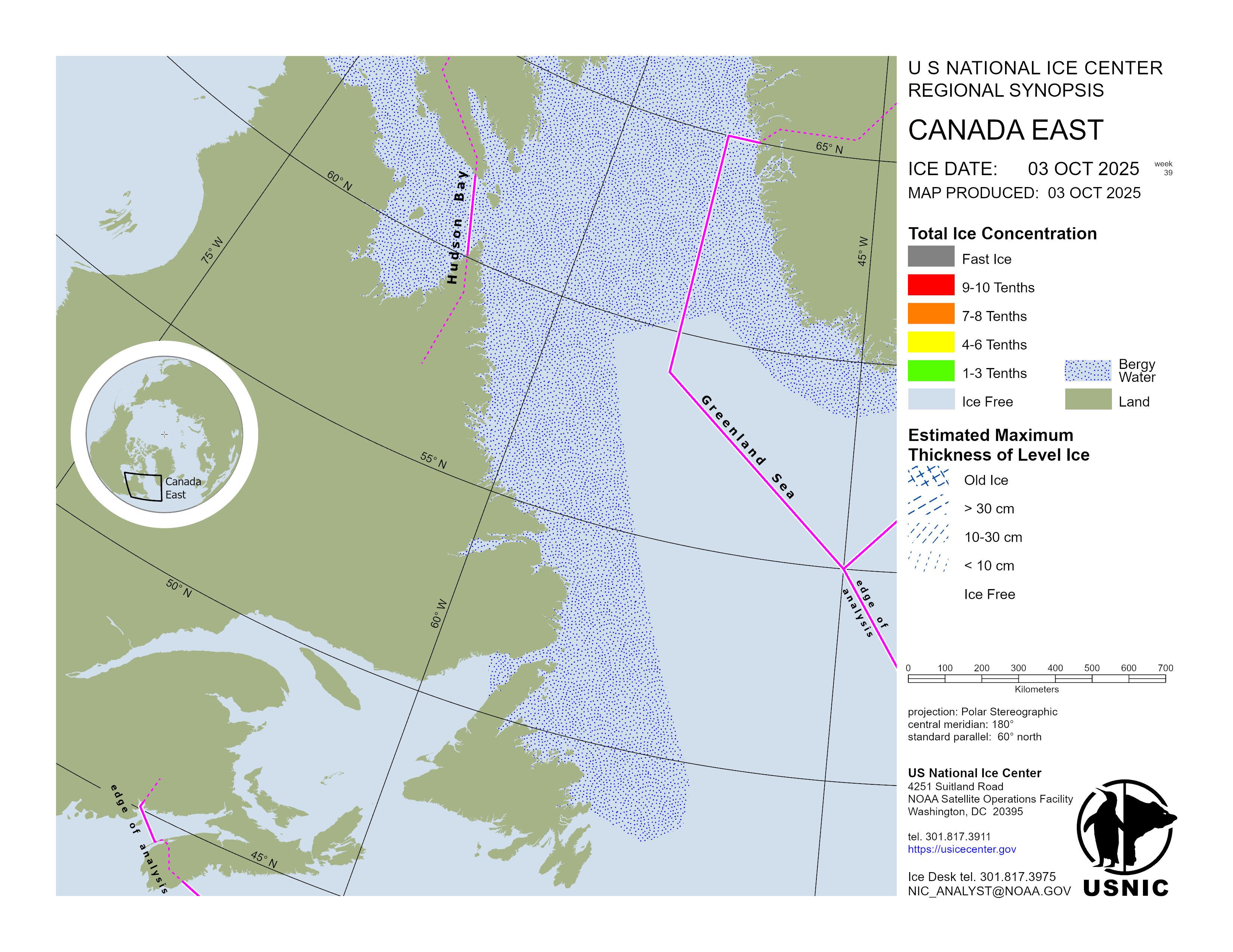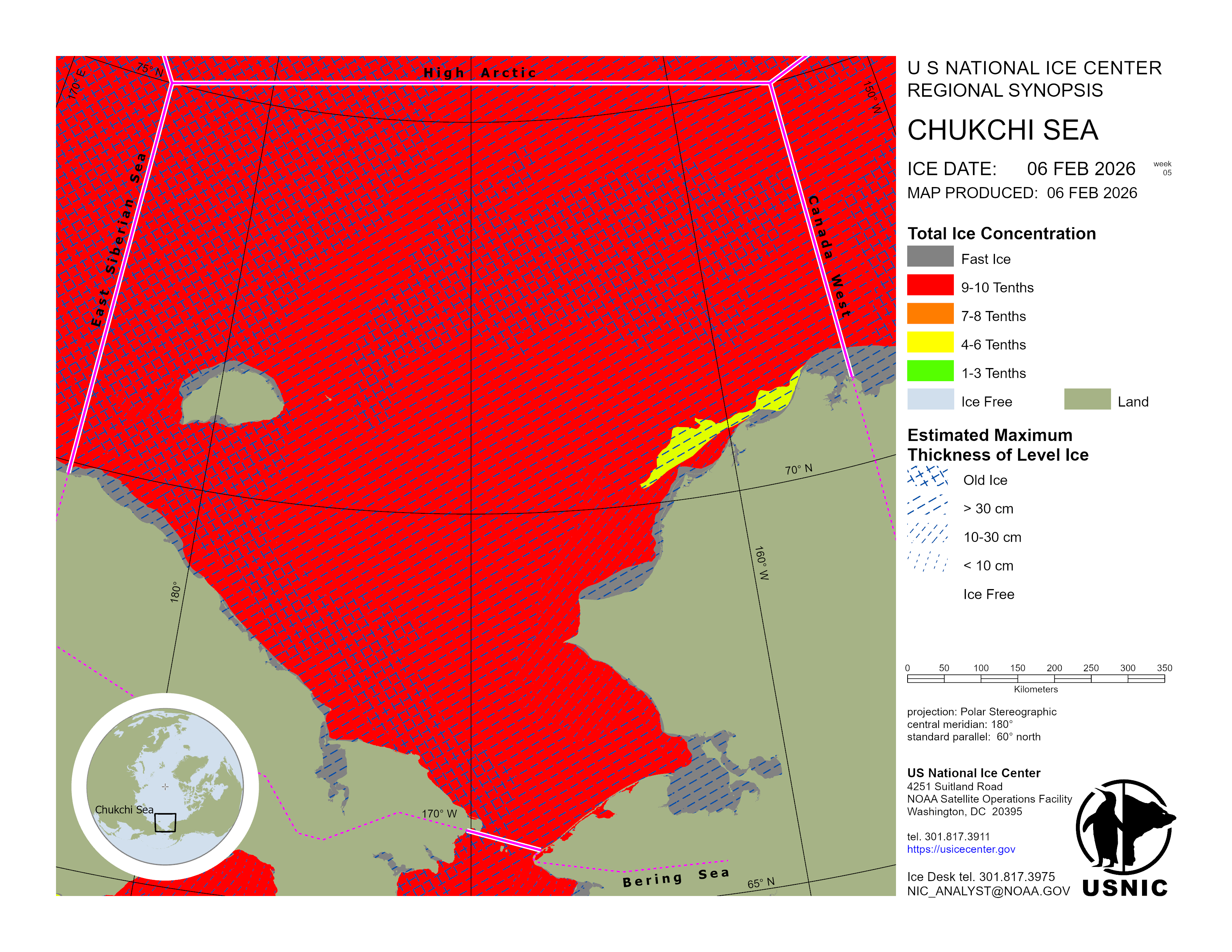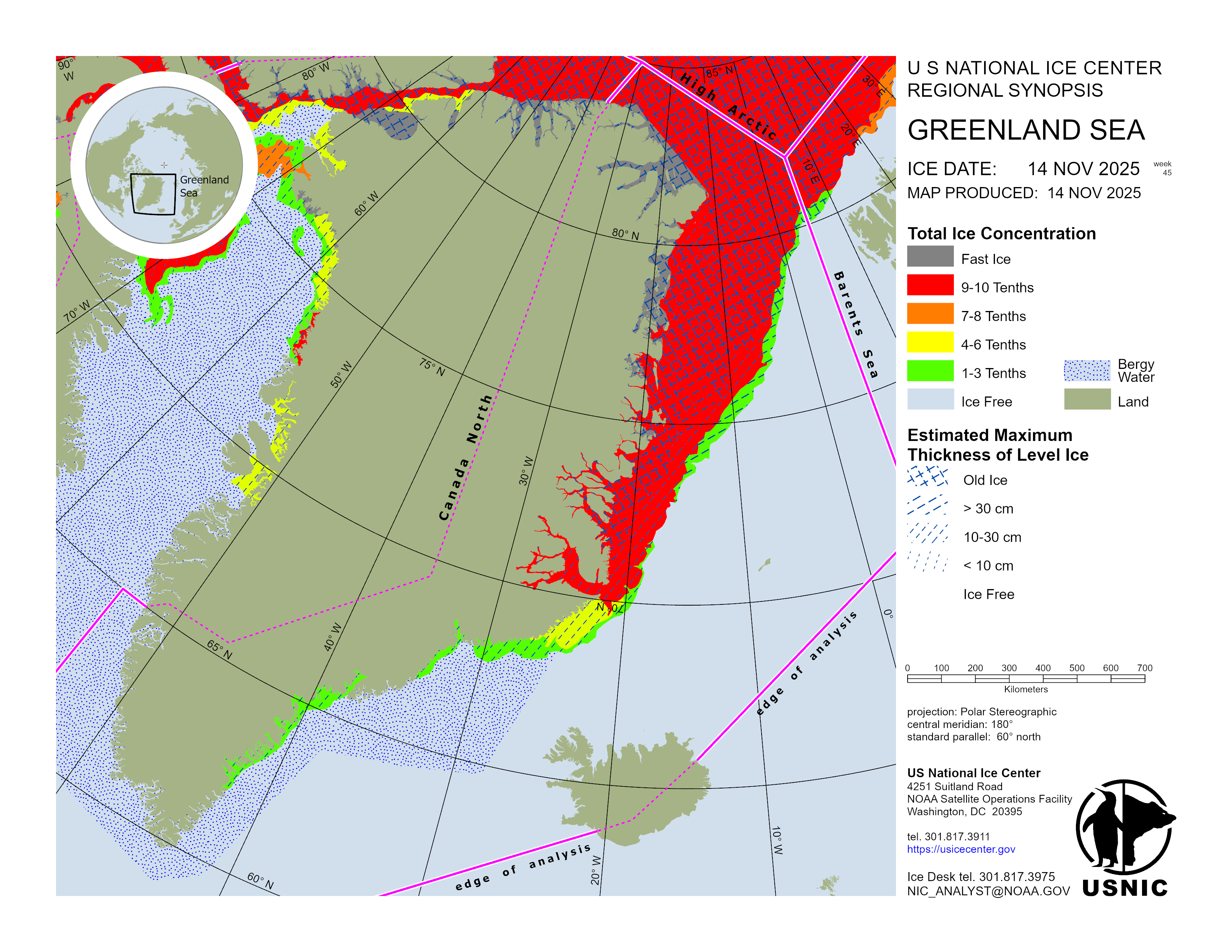 Regional charts and associated synopsis write-up capture ice and environmental conditions throughout the Arctic which are based on the U.S. National Ice Center’s weekly analysis. Charts and synopses are updated weekly on Fridays. Note: Baltic Sea analysis is provided by the Finnish Meteorological Institute. The Canadian Archipelago (Canada East, Canada North, Canada West, and Hudson Bay) analysis is provided by the Canadian Ice Service.