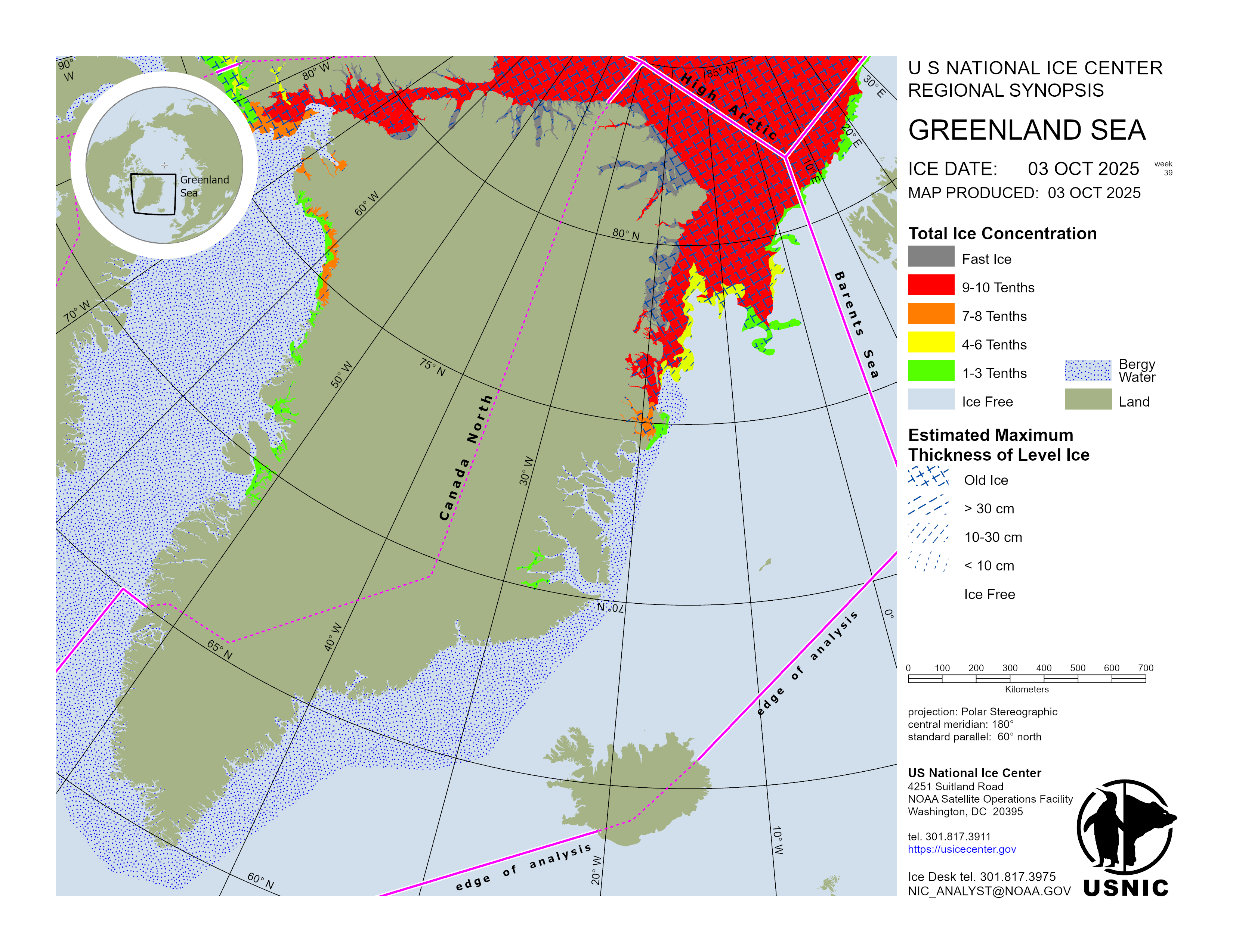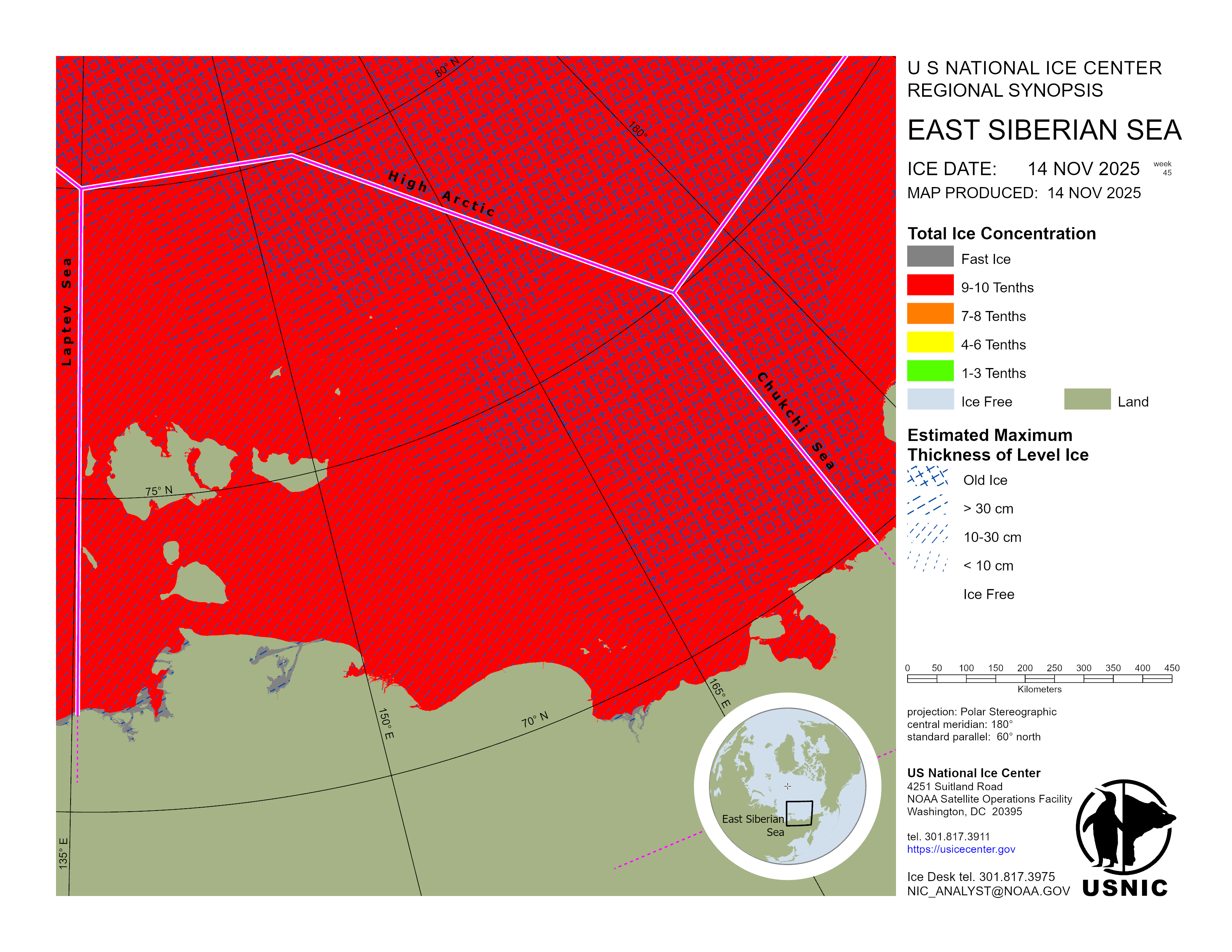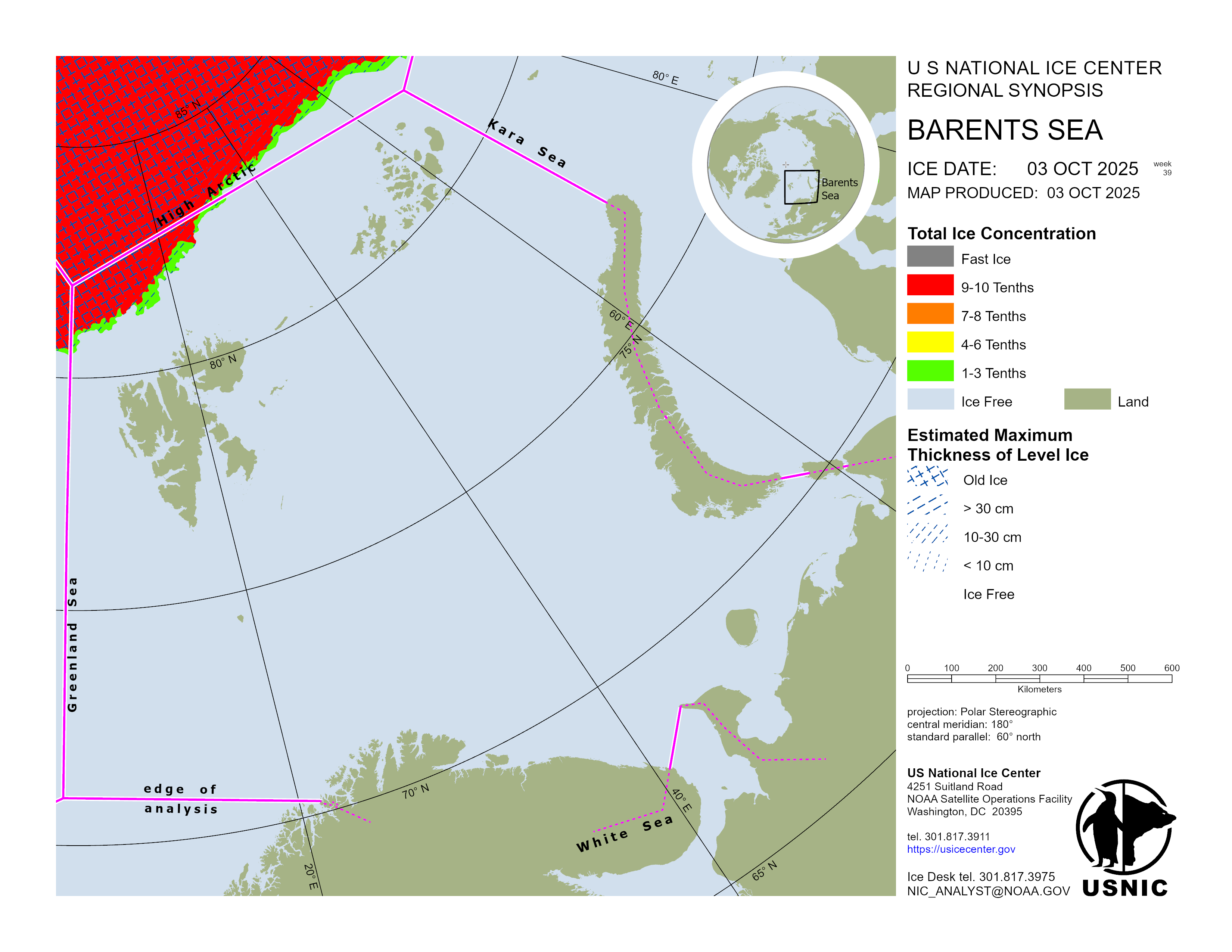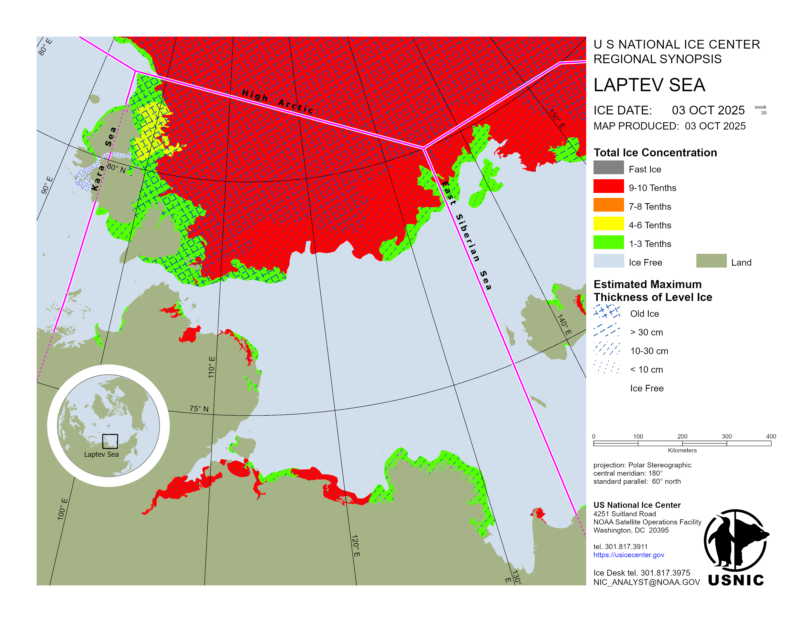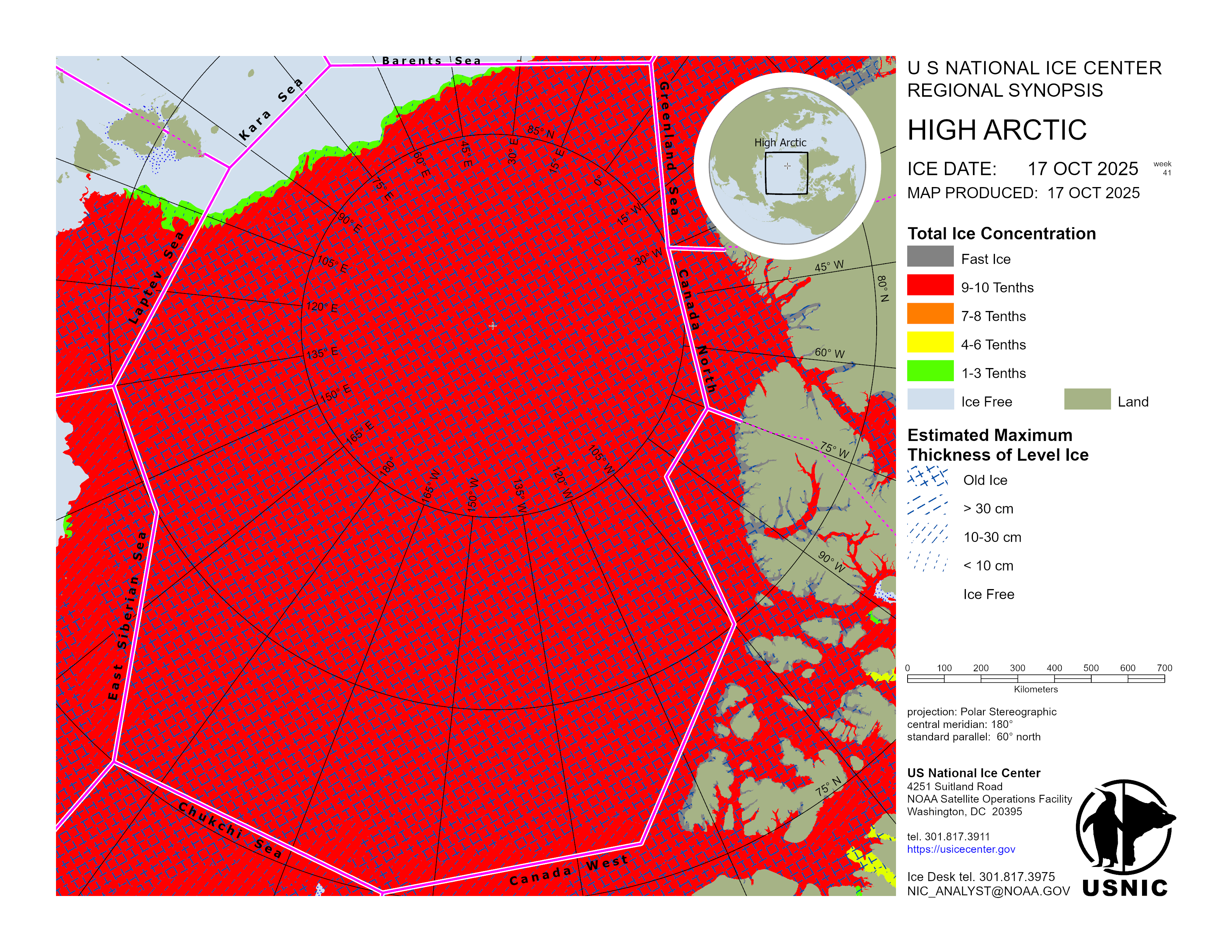 Regional charts and associated synopsis write-up capture ice and environmental conditions throughout the Arctic which are based on the U.S. National Ice Center’s weekly analysis. Charts and synopses are updated weekly on Fridays. Note: Baltic Sea analysis is provided by the Finnish Meteorological Institute. The Canadian Archipelago (Canada East, Canada North, Canada West, and Hudson Bay) analysis is provided by the Canadian Ice Service.