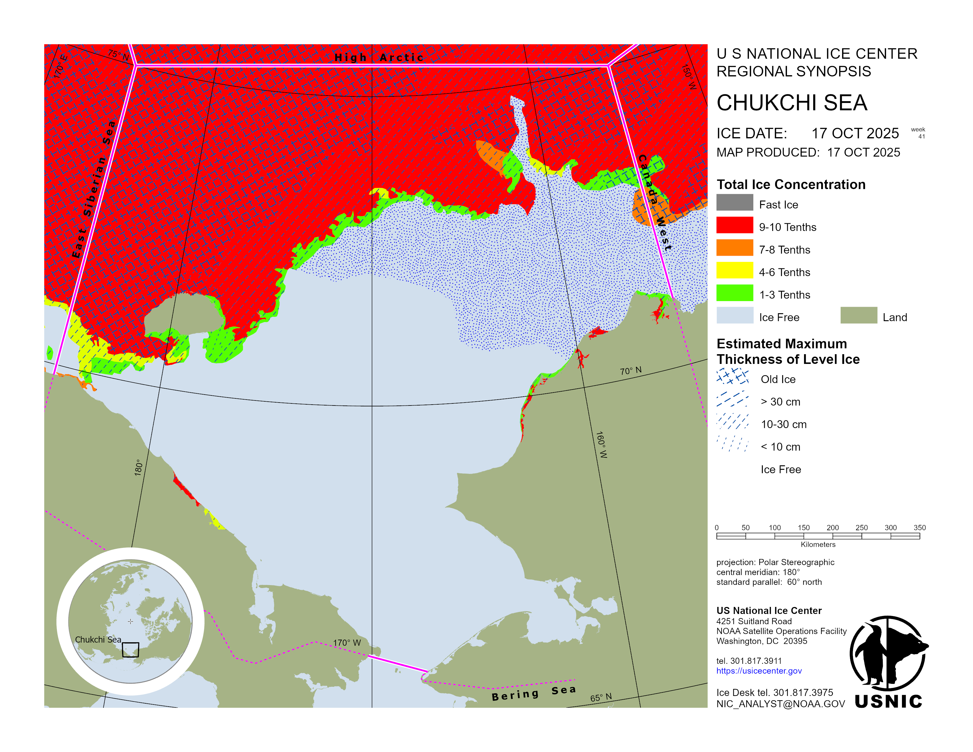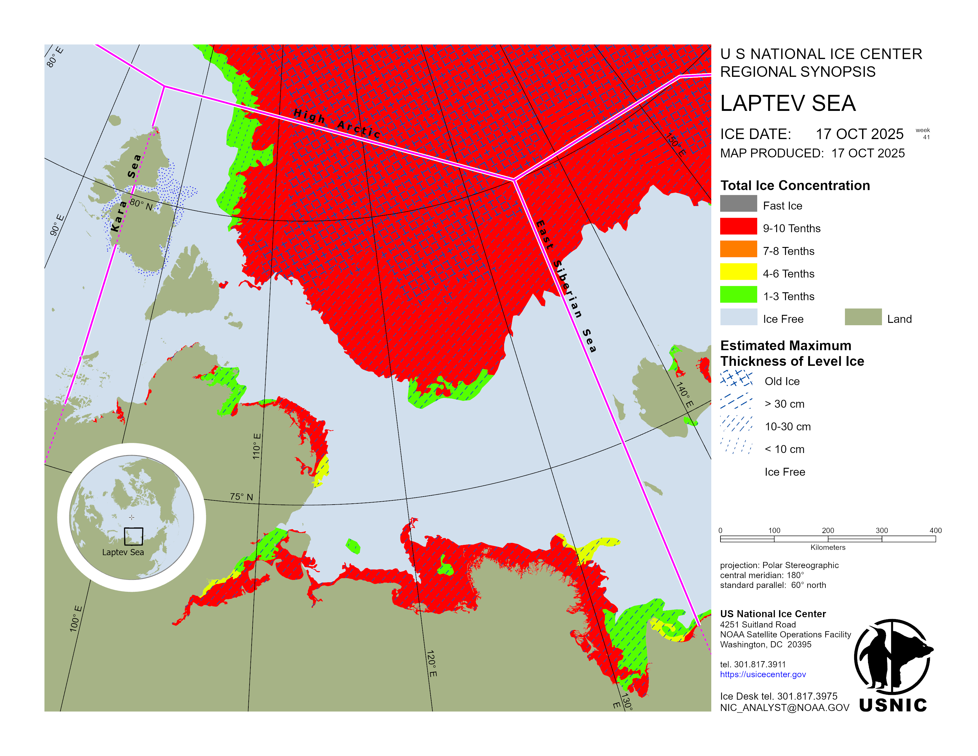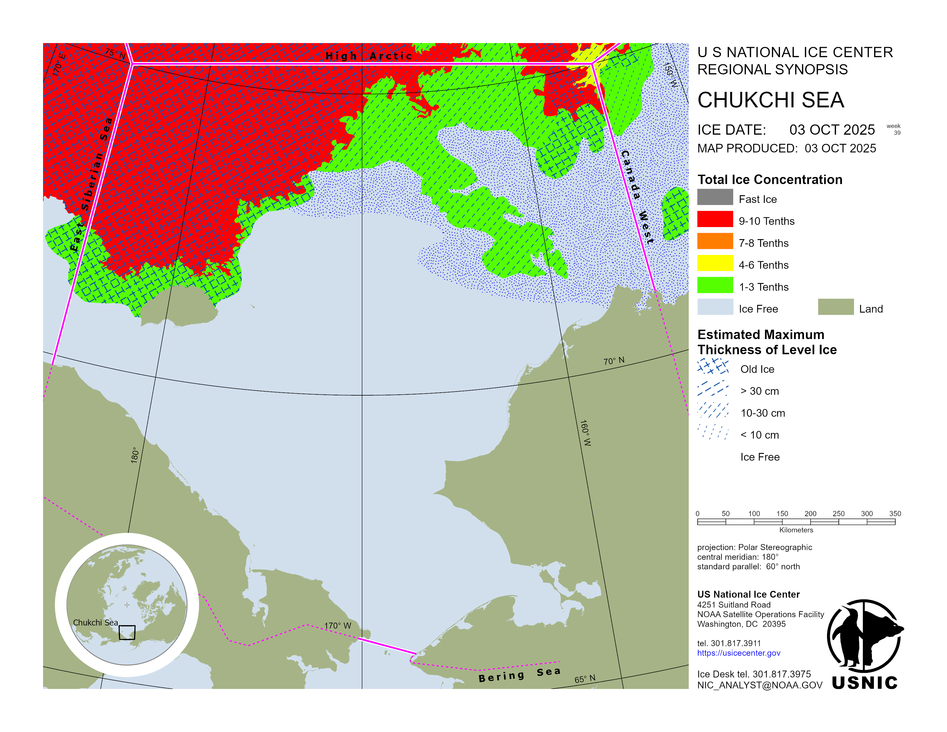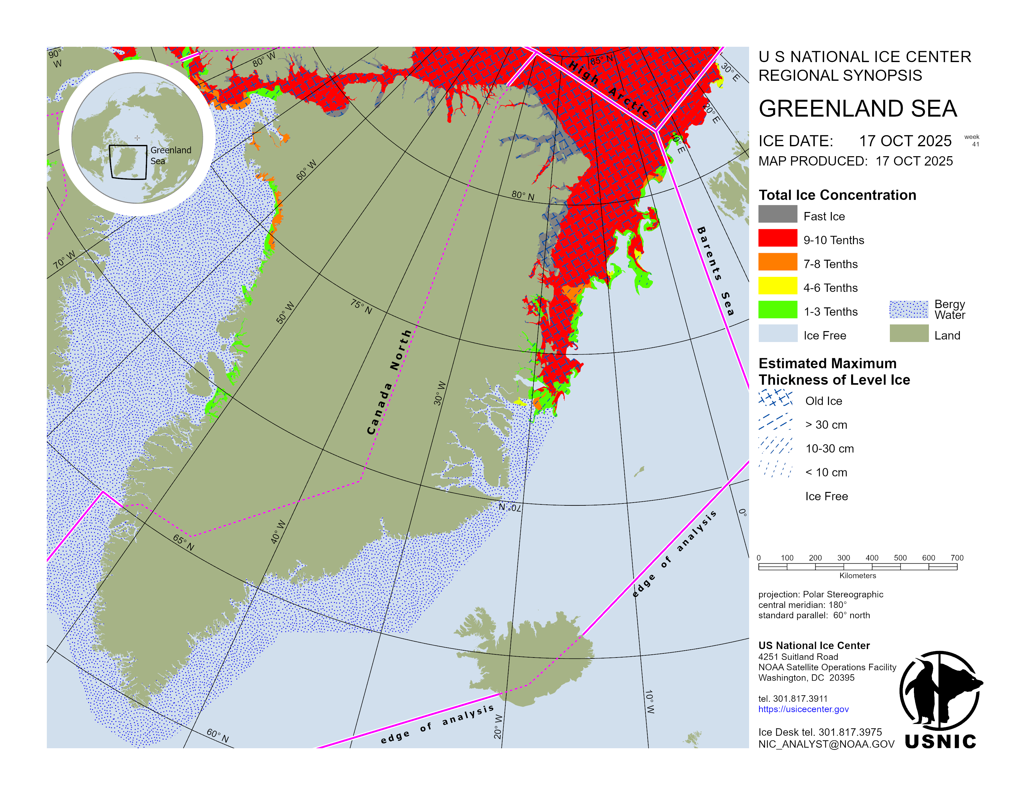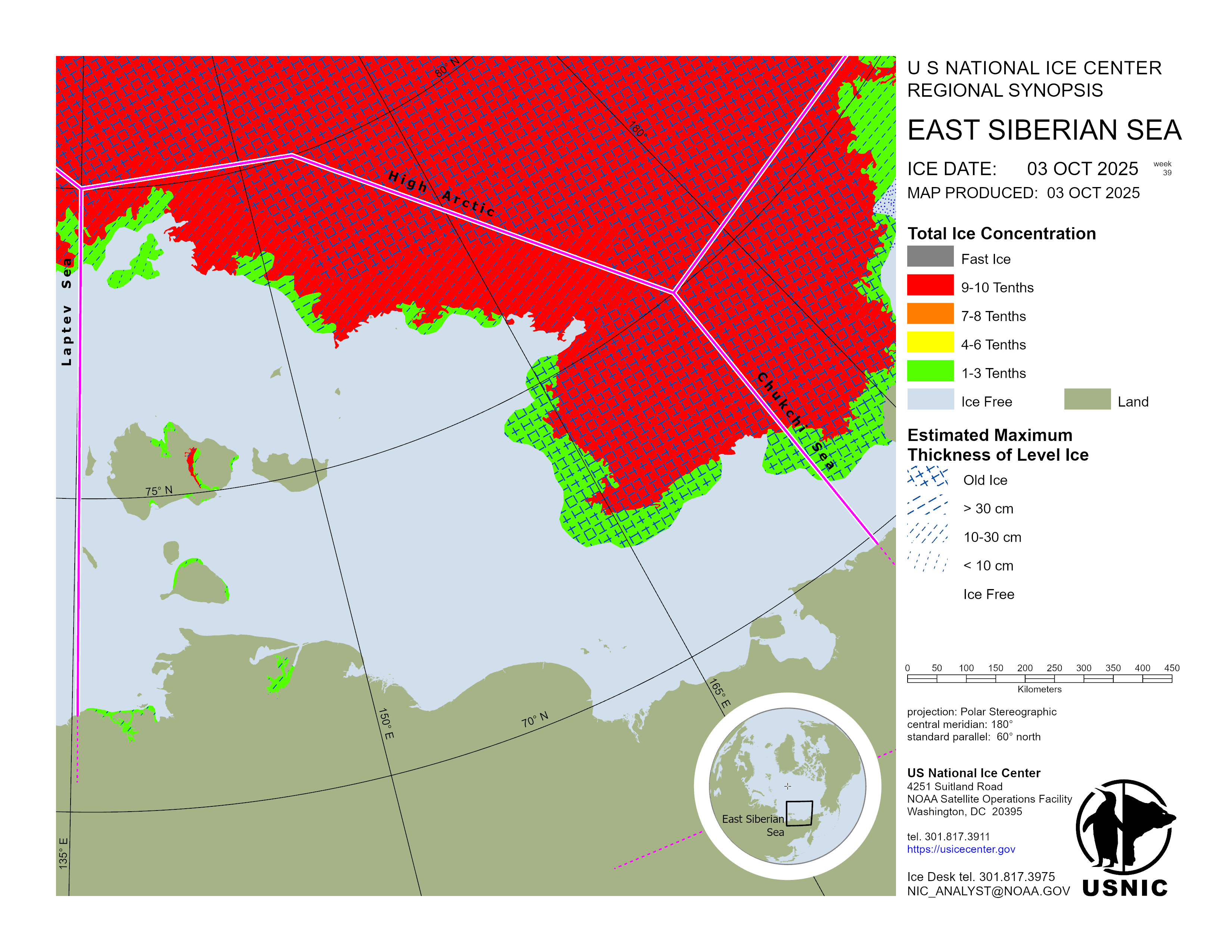 Regional charts and associated synopsis write-up capture ice and environmental conditions throughout the Arctic which are based on the U.S. National Ice Center’s weekly analysis. Charts and synopses are updated weekly on Fridays. Note: Baltic Sea analysis is provided by the Finnish Meteorological Institute. The Canadian Archipelago (Canada East, Canada North, Canada West, and Hudson Bay) analysis is provided by the Canadian Ice Service.