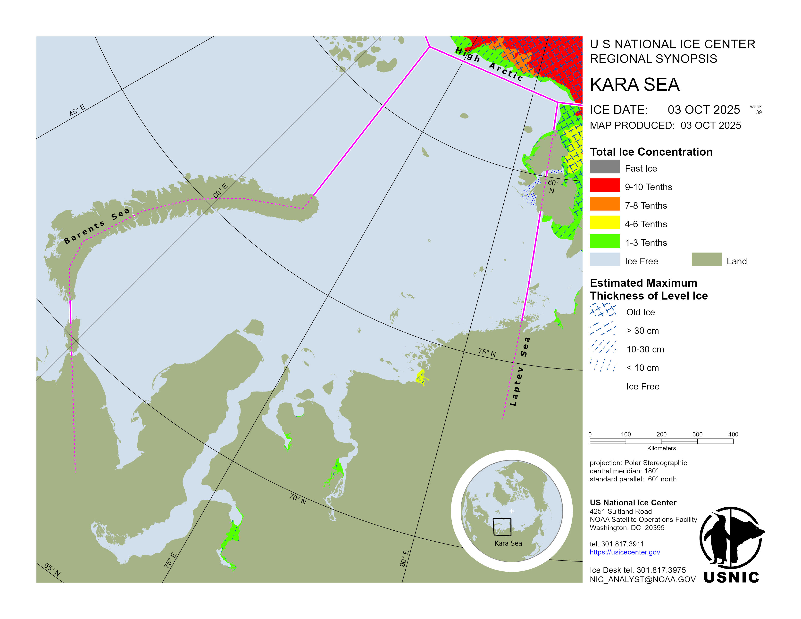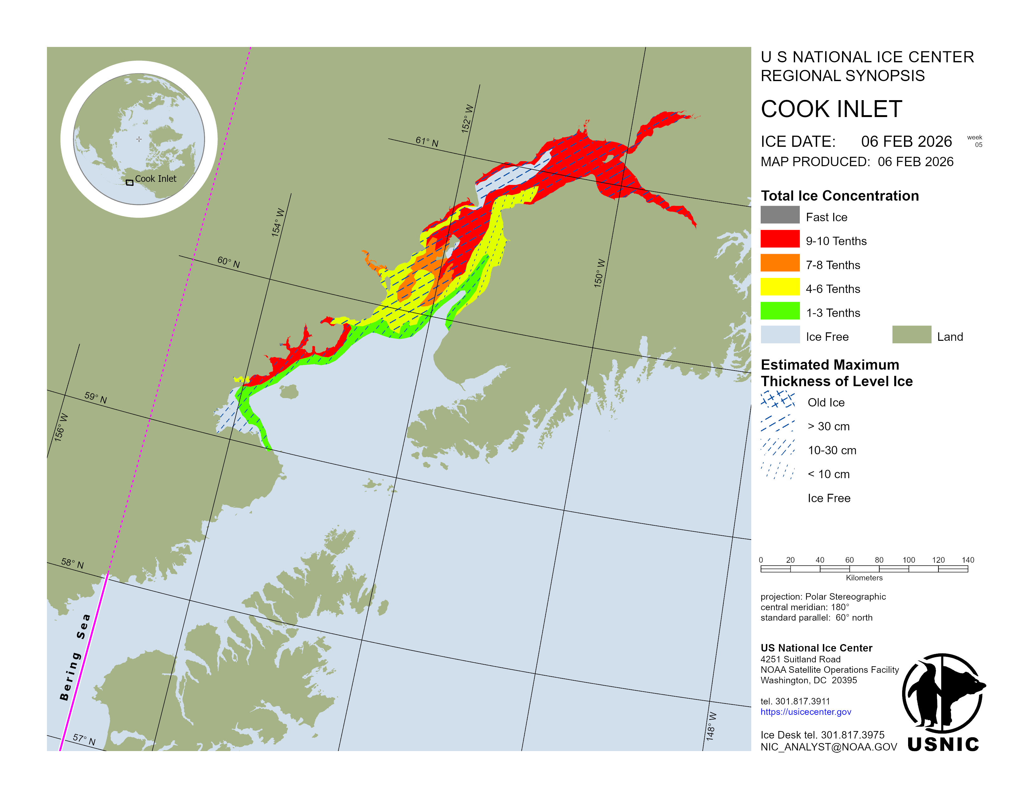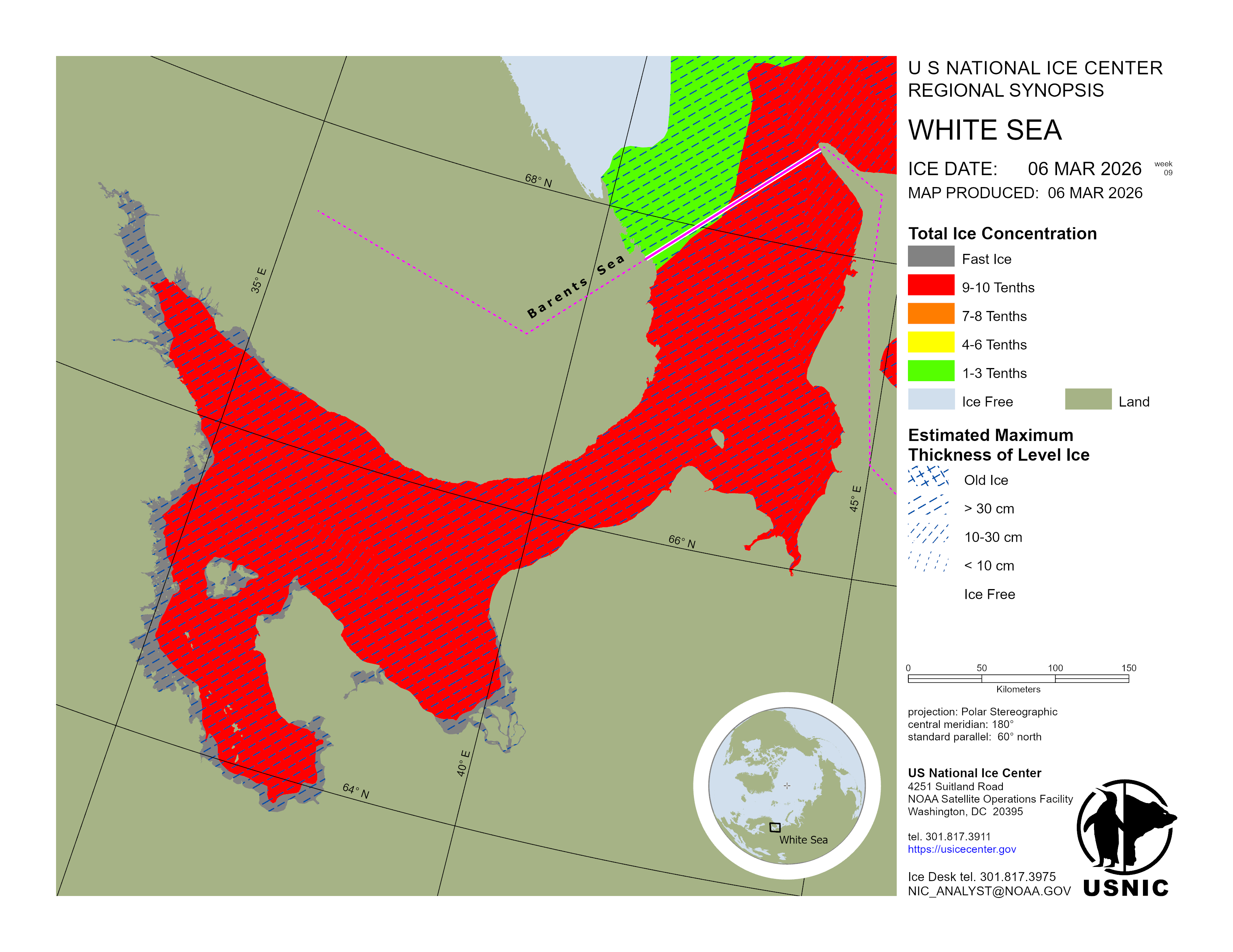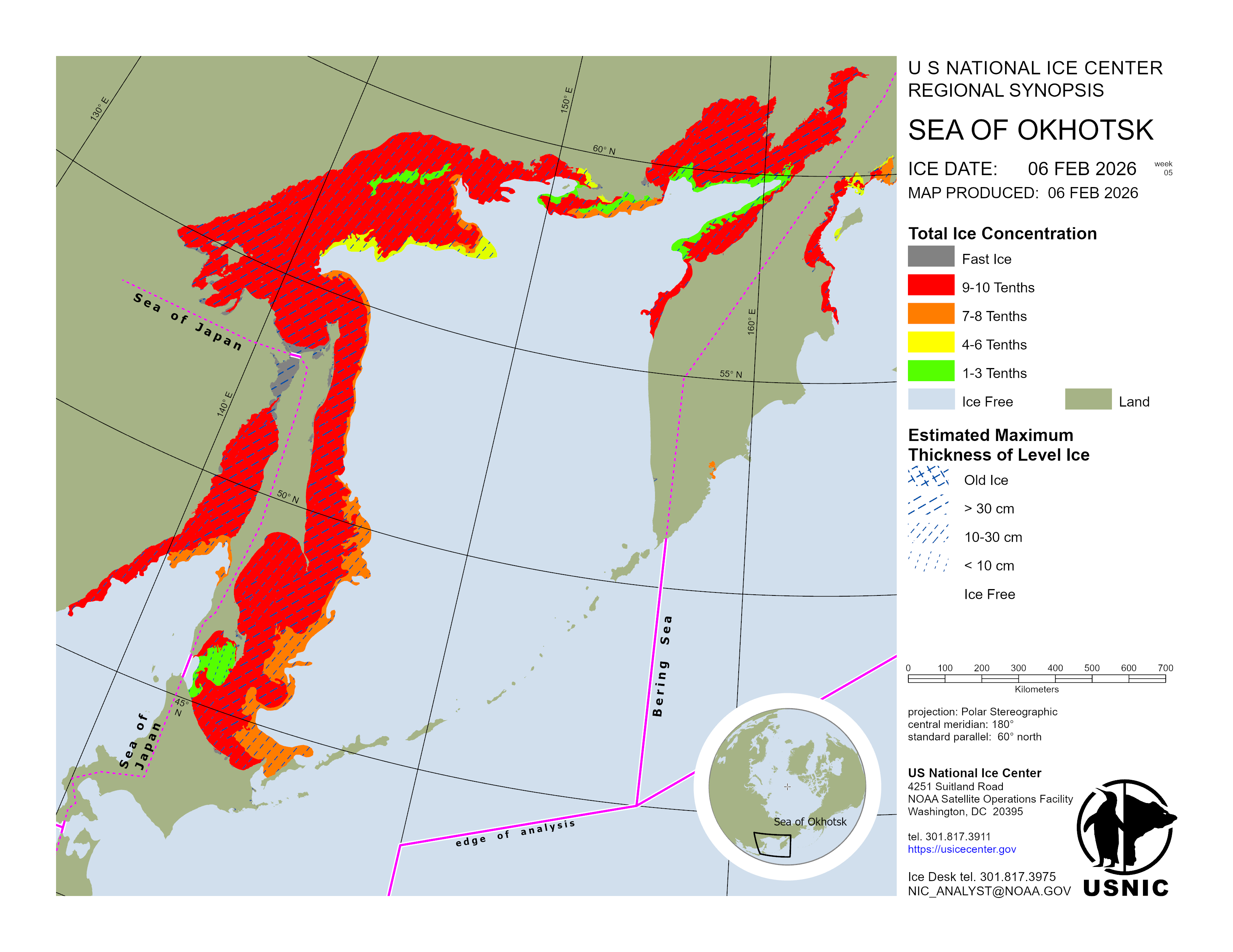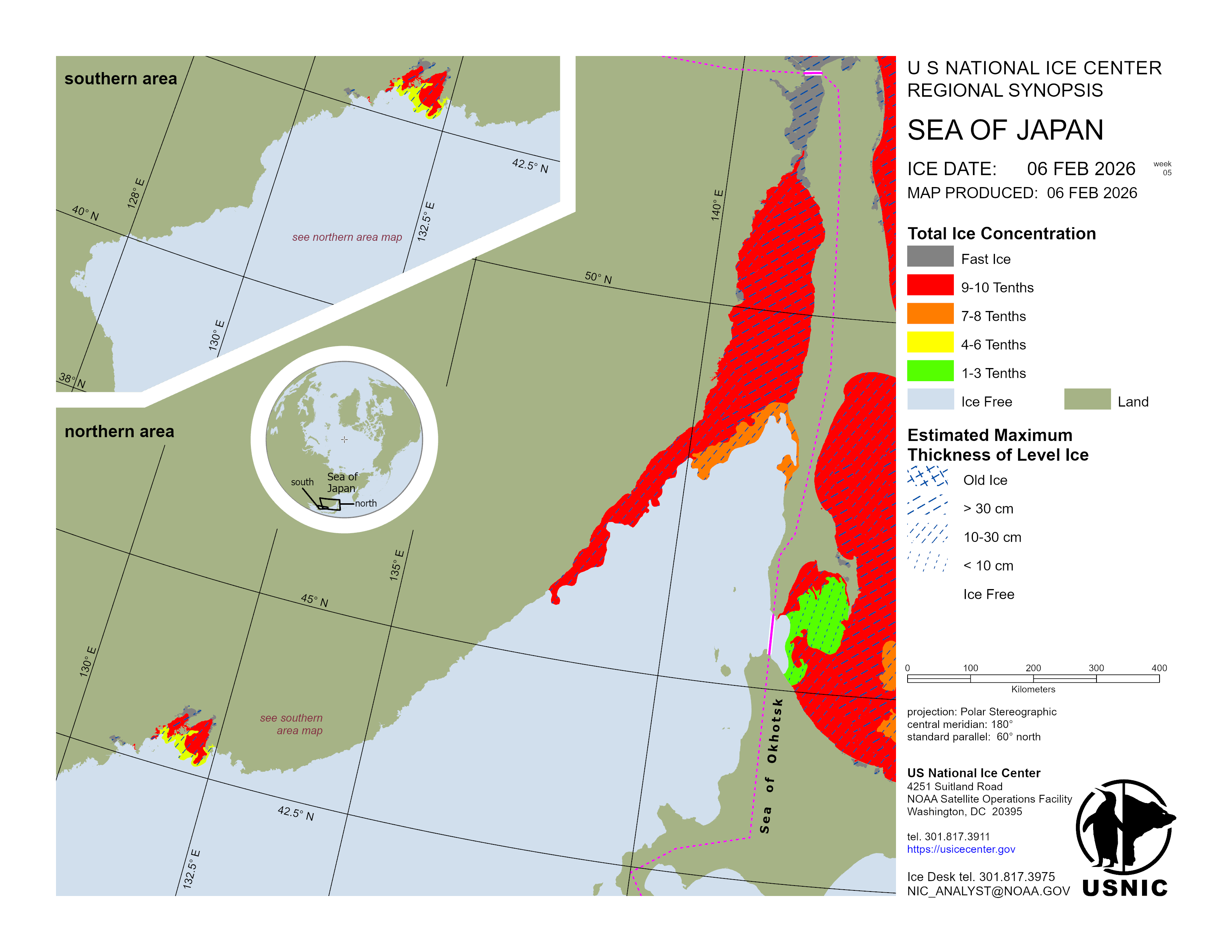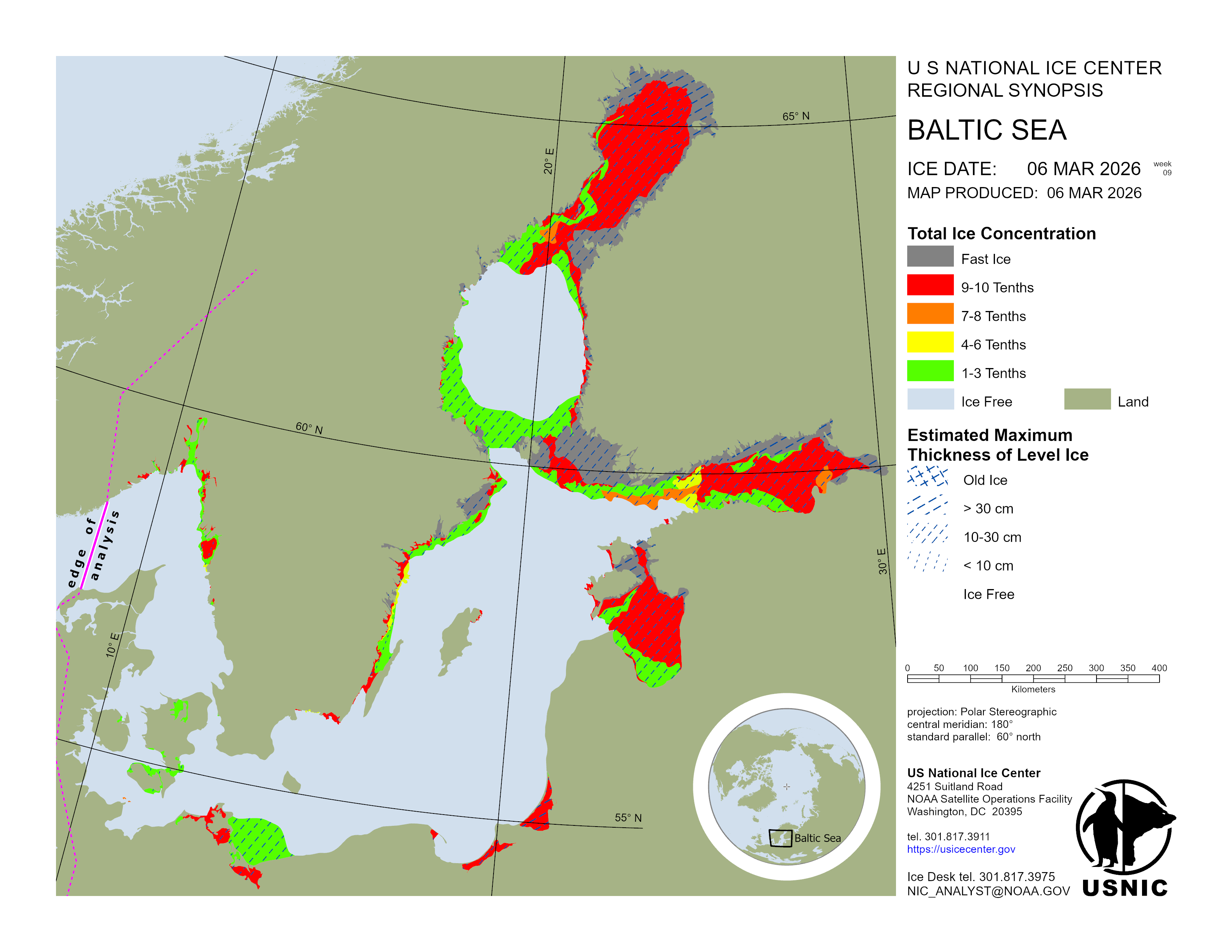 Regional charts and associated synopsis write-up capture ice and environmental conditions throughout the Arctic which are based on the U.S. National Ice Center’s weekly analysis. Charts and synopses are updated weekly on Fridays. Note: Baltic Sea analysis is provided by the Finnish Meteorological Institute. The Canadian Archipelago (Canada East, Canada North, Canada West, and Hudson Bay) analysis is provided by the Canadian Ice Service.
