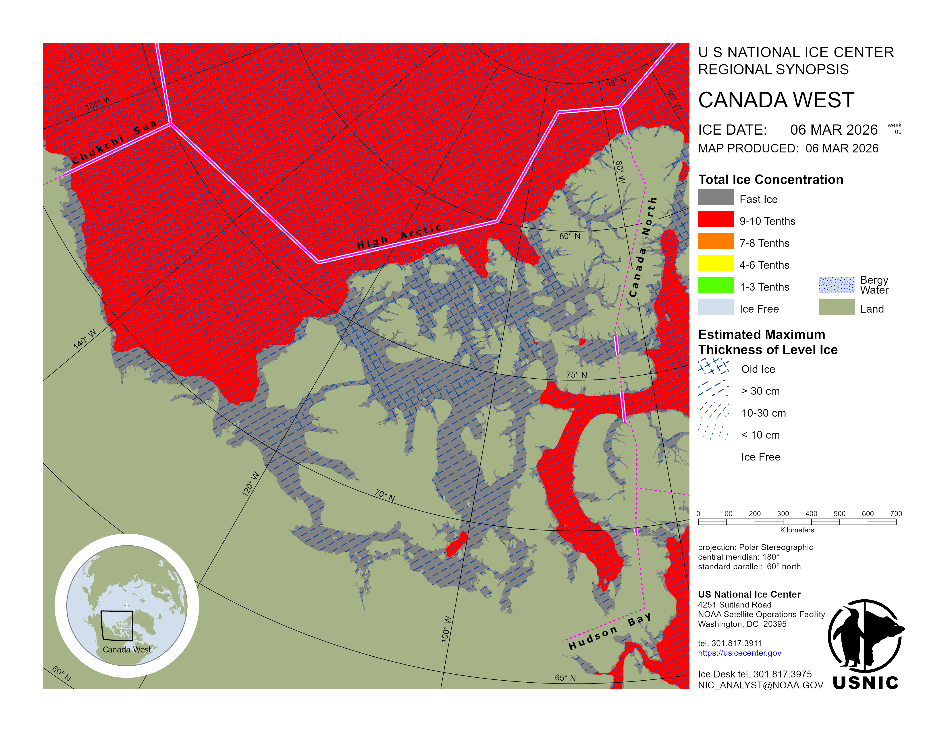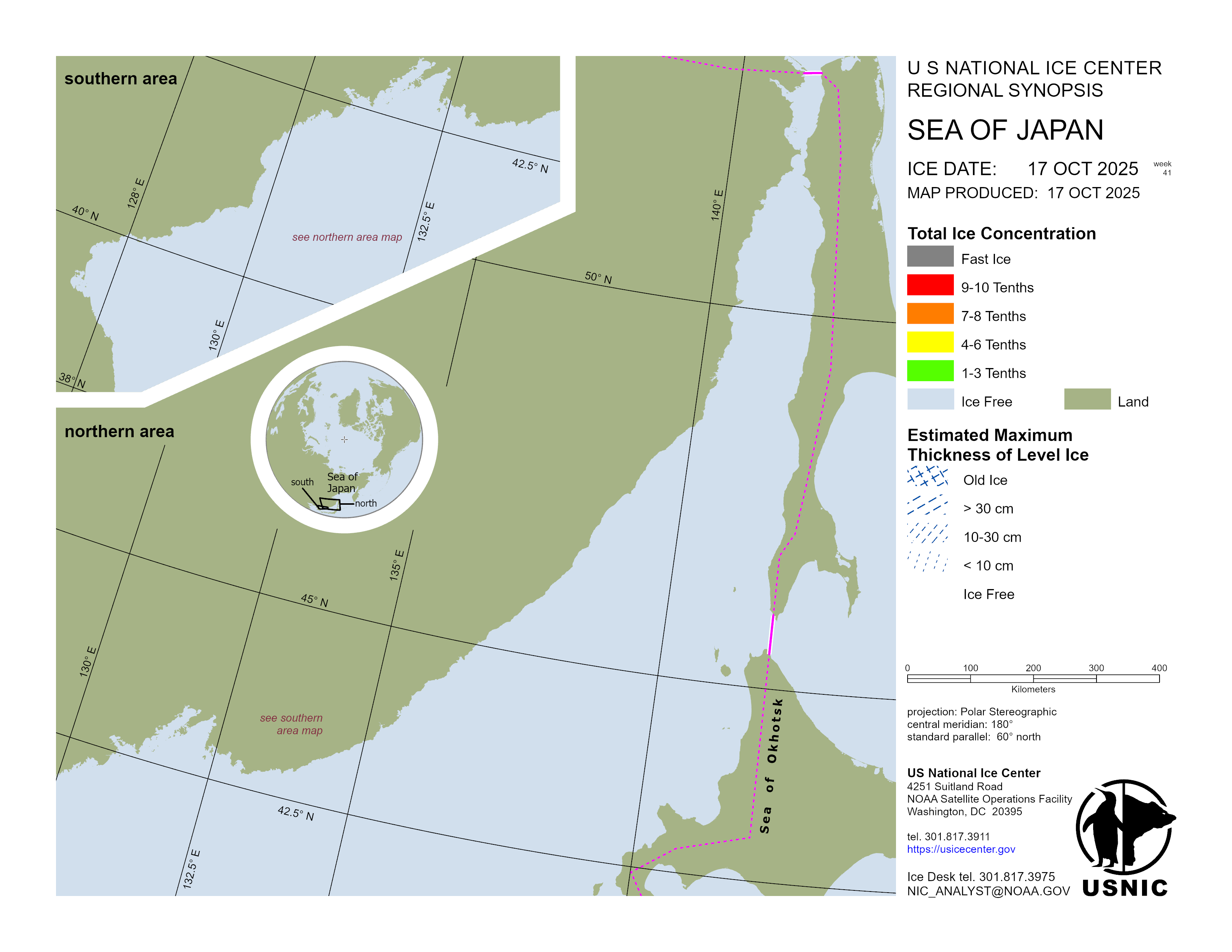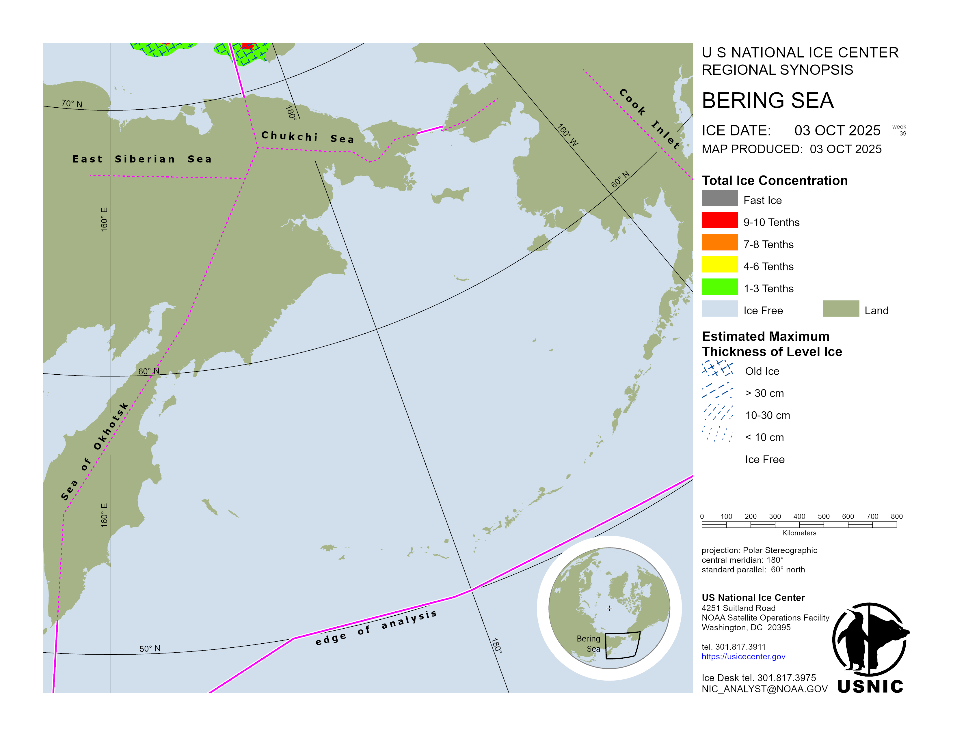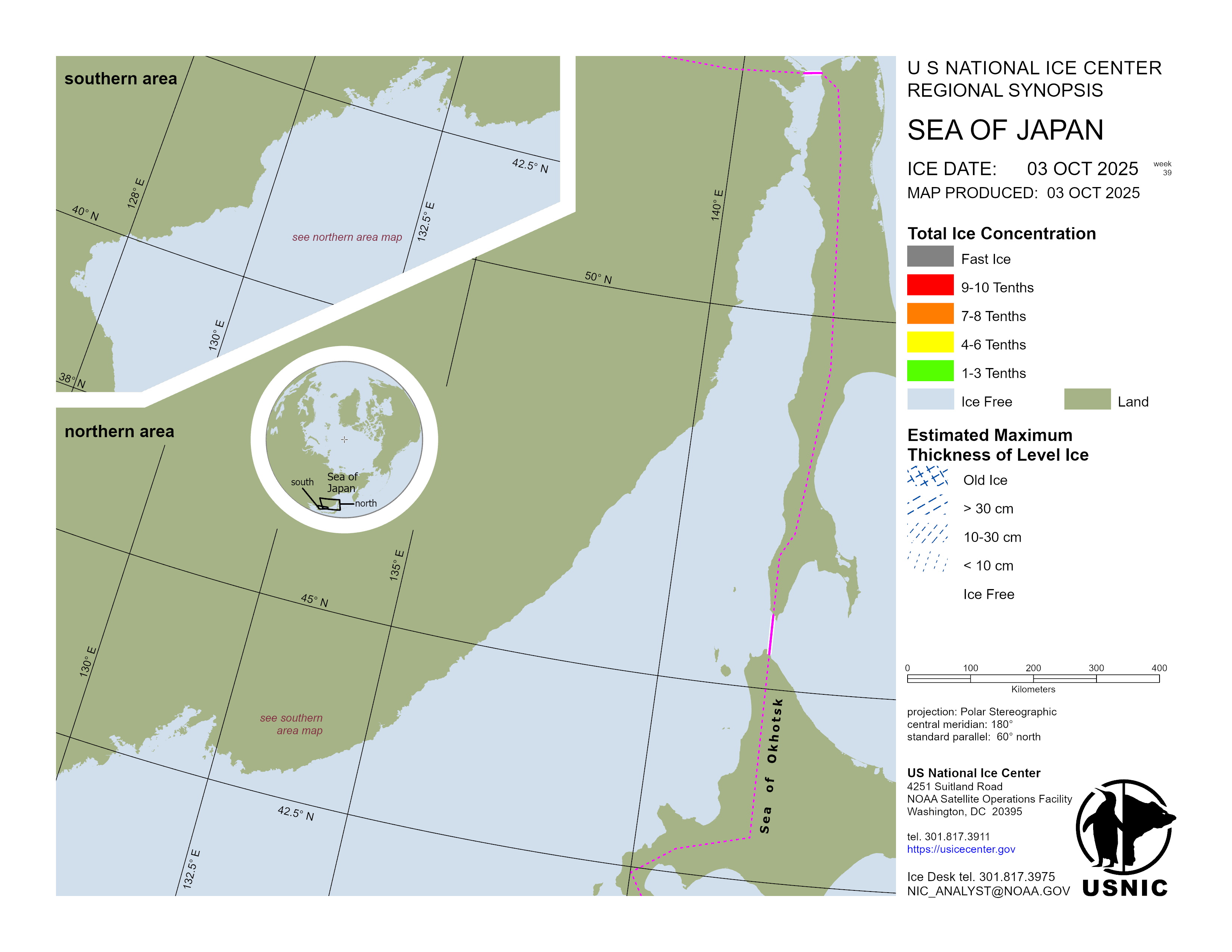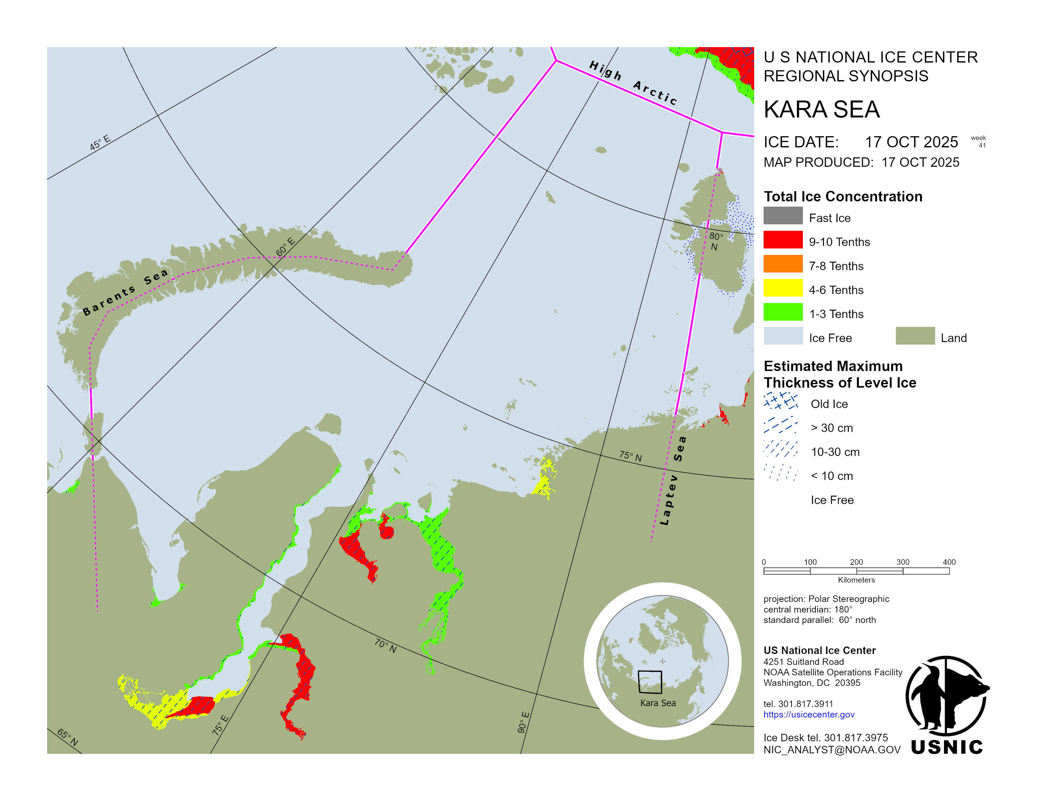 Regional charts and associated synopsis write-up capture ice and environmental conditions throughout the Arctic which are based on the U.S. National Ice Center’s weekly analysis. Charts and synopses are updated weekly on Fridays. Note: Baltic Sea analysis is provided by the Finnish Meteorological Institute. The Canadian Archipelago (Canada East, Canada North, Canada West, and Hudson Bay) analysis is provided by the Canadian Ice Service.