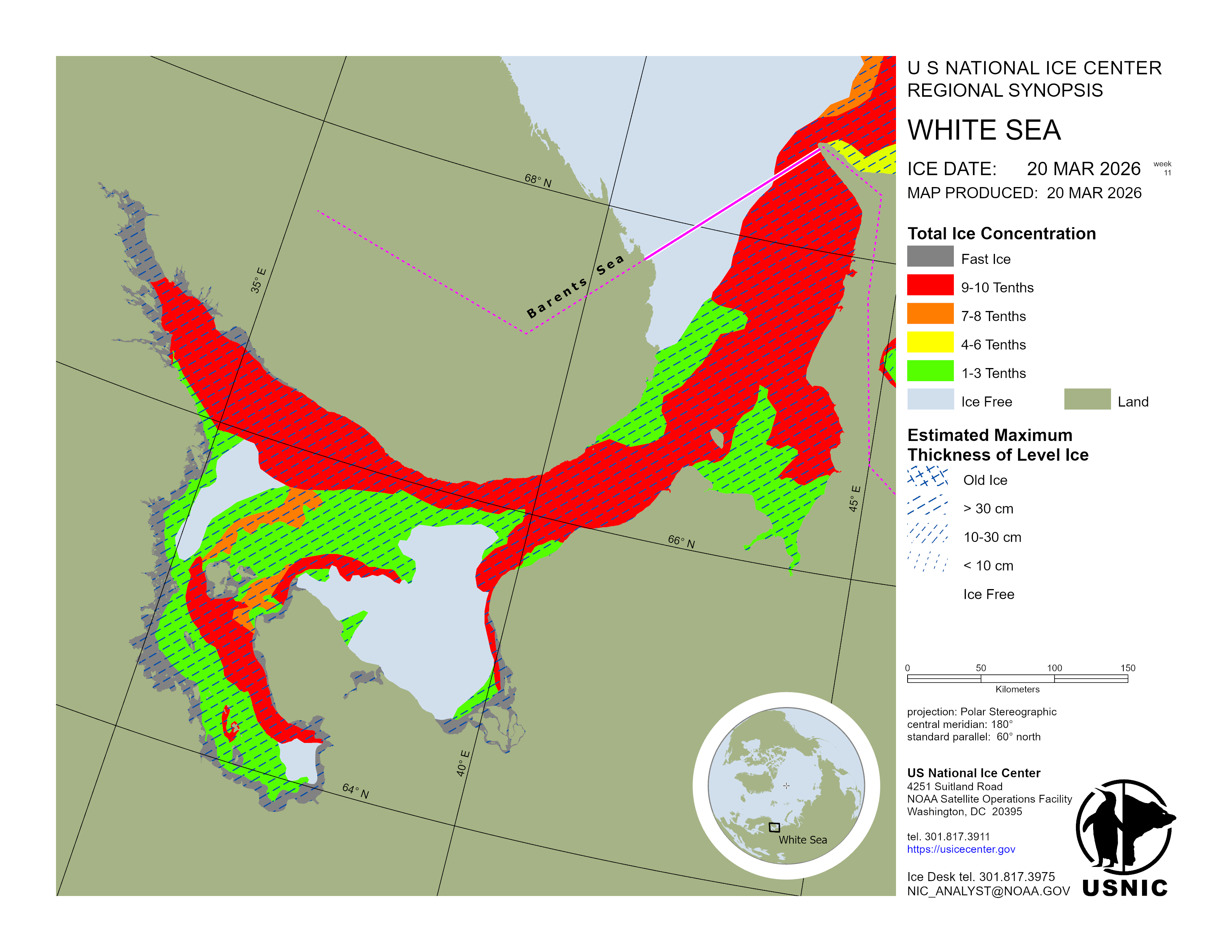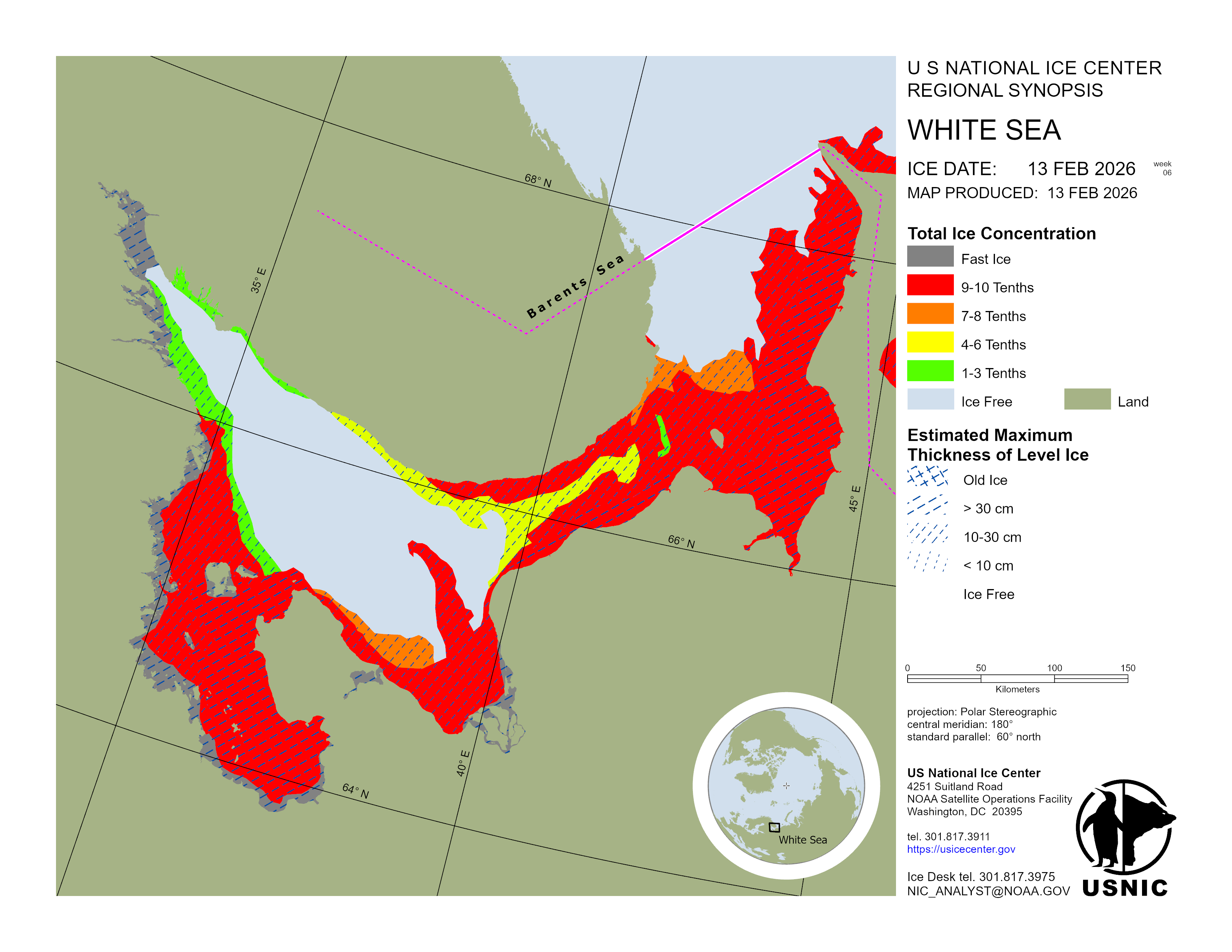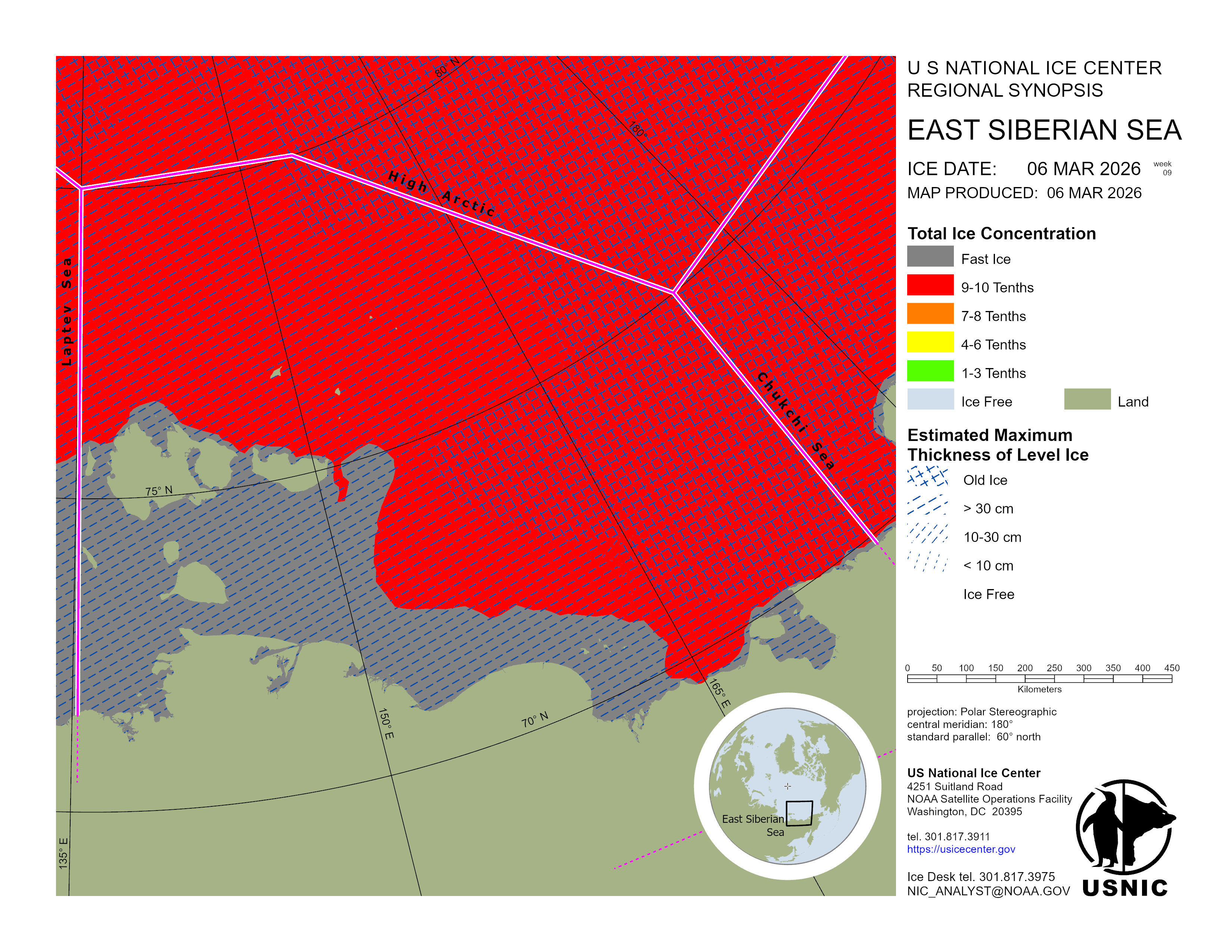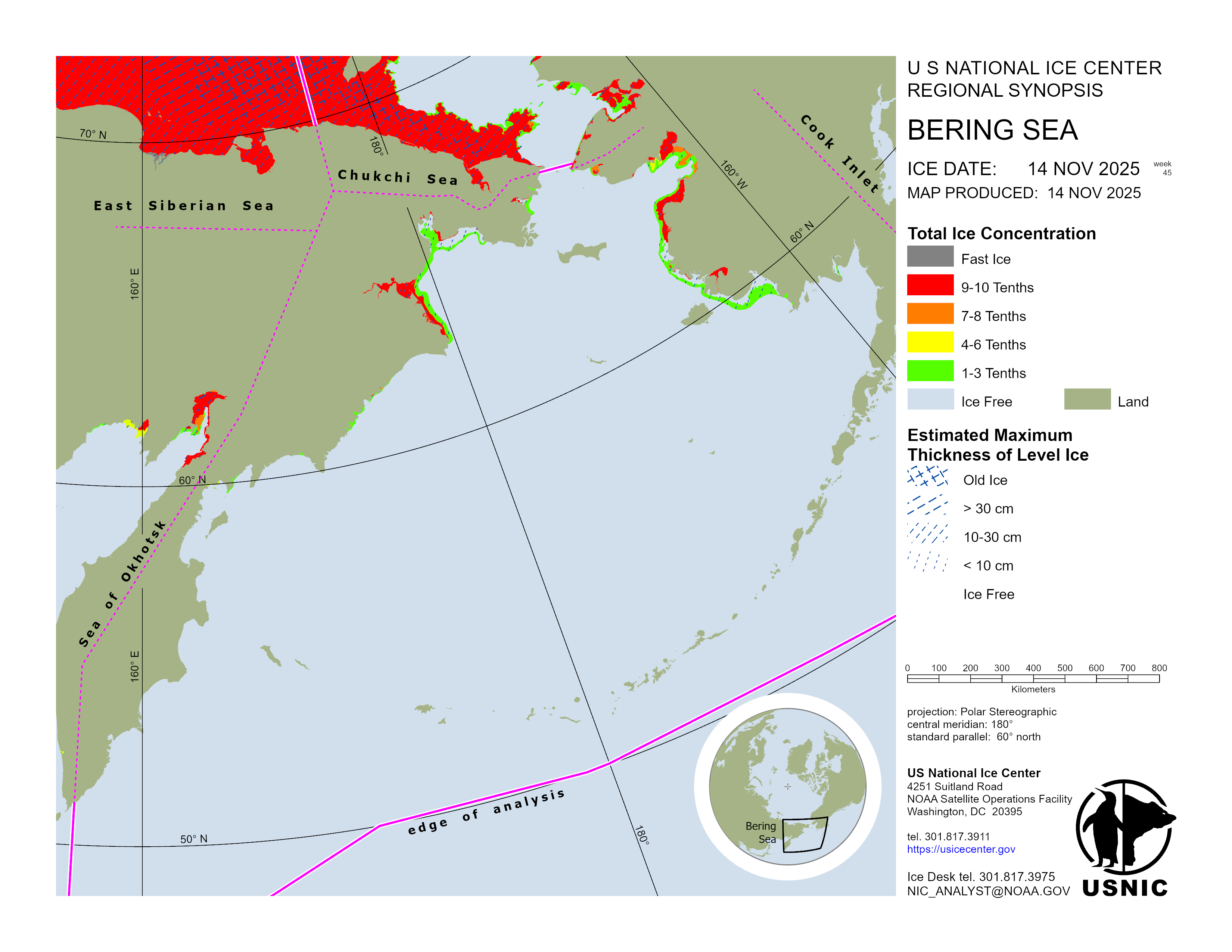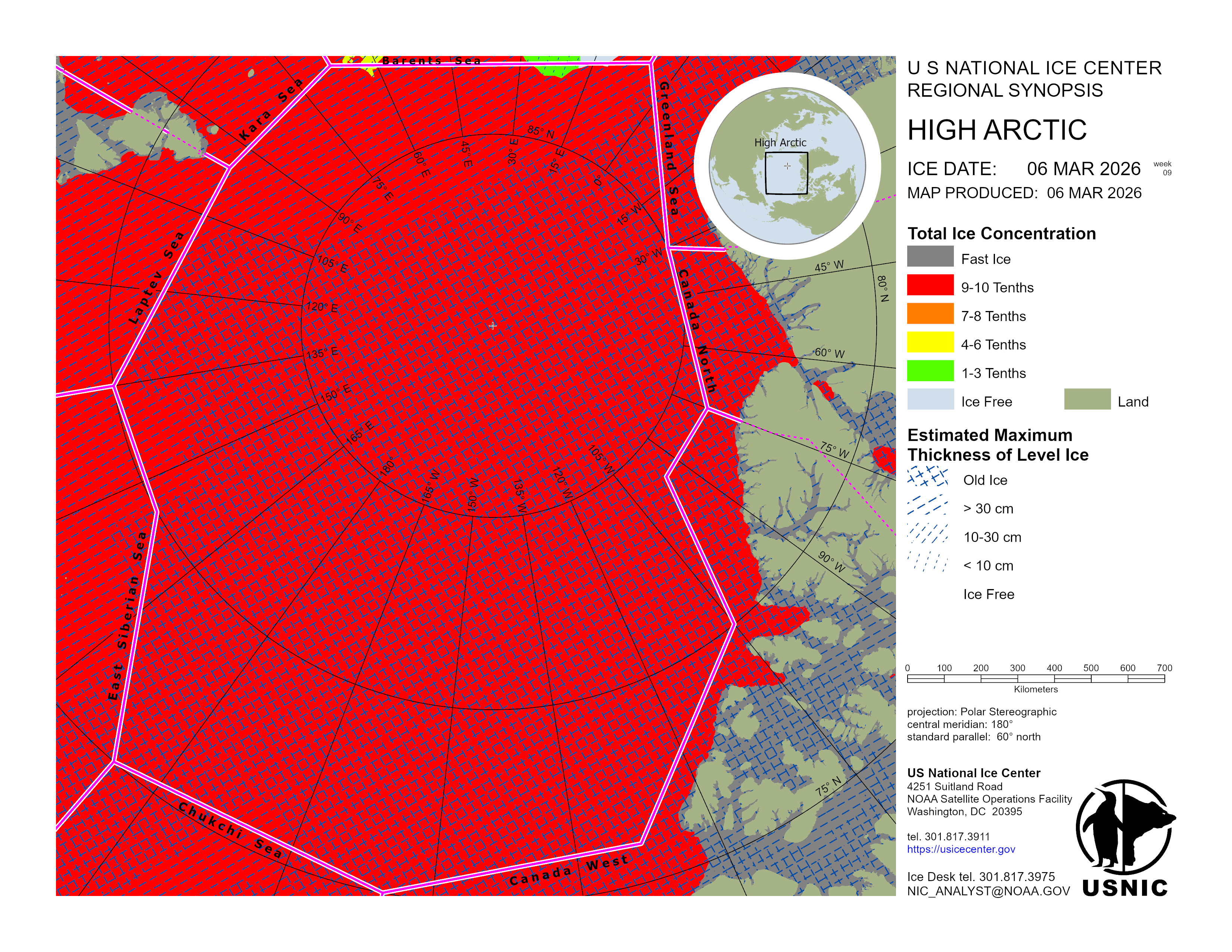 Regional charts and associated synopsis write-up capture ice and environmental conditions throughout the Arctic which are based on the U.S. National Ice Center’s weekly analysis. Charts and synopses are updated weekly on Fridays. Note: Baltic Sea analysis is provided by the Finnish Meteorological Institute. The Canadian Archipelago (Canada East, Canada North, Canada West, and Hudson Bay) analysis is provided by the Canadian Ice Service.