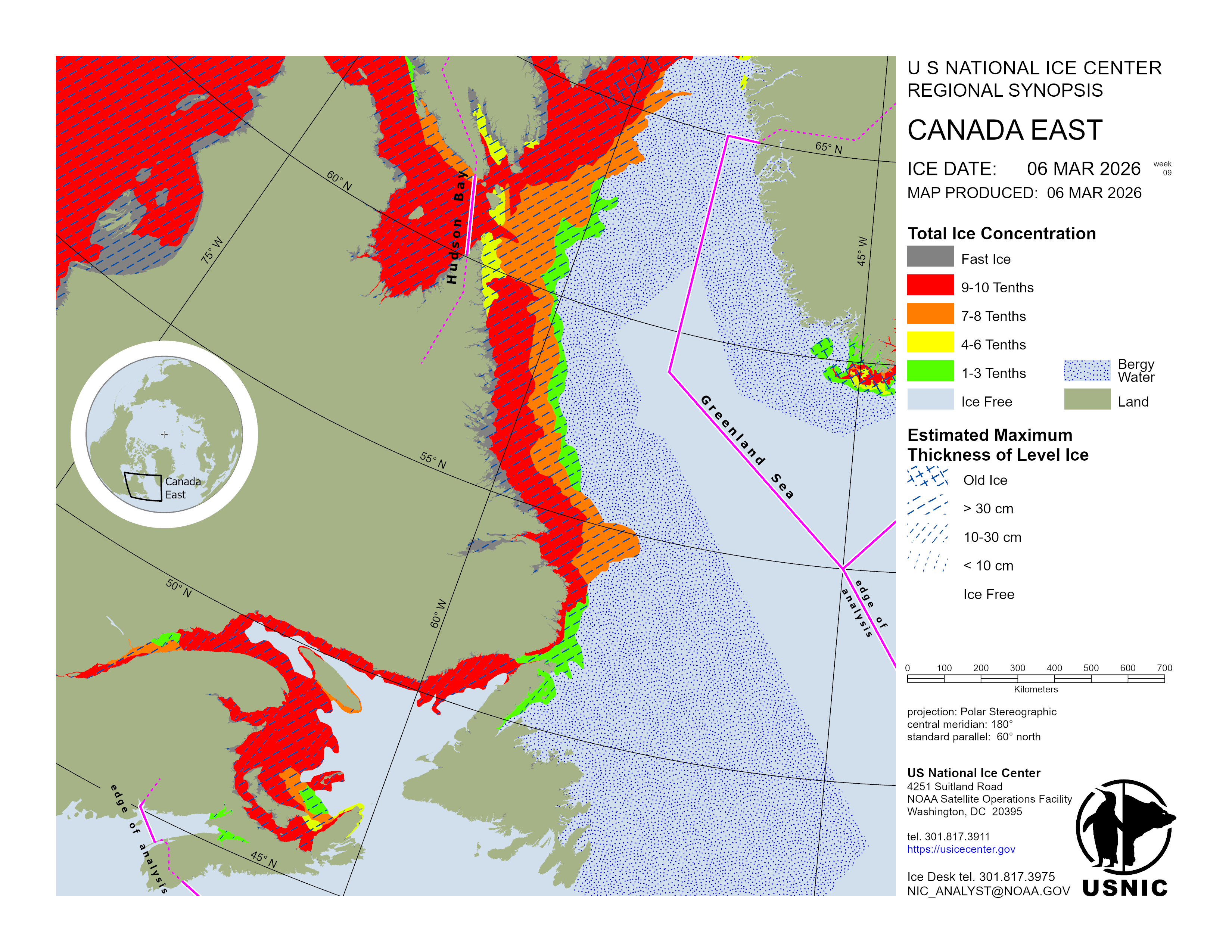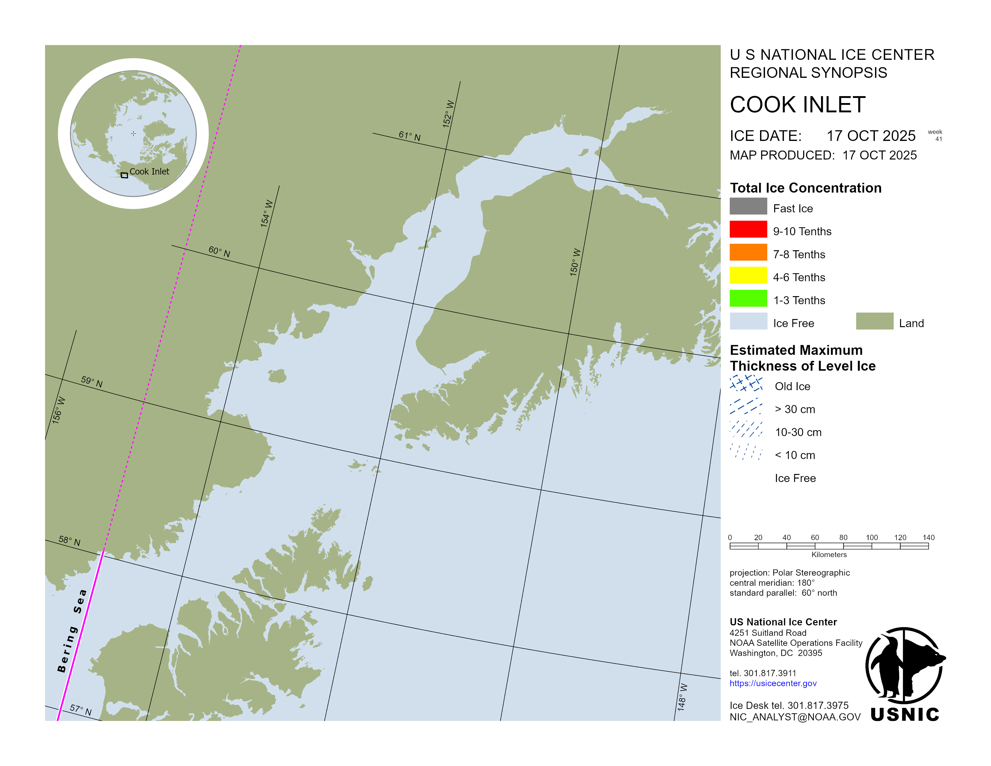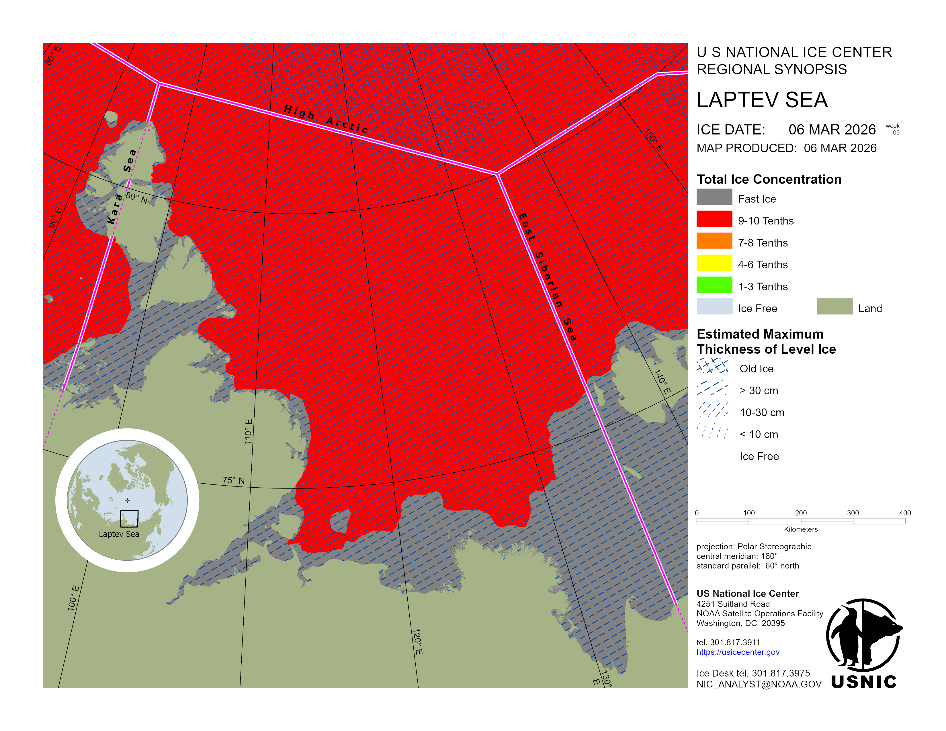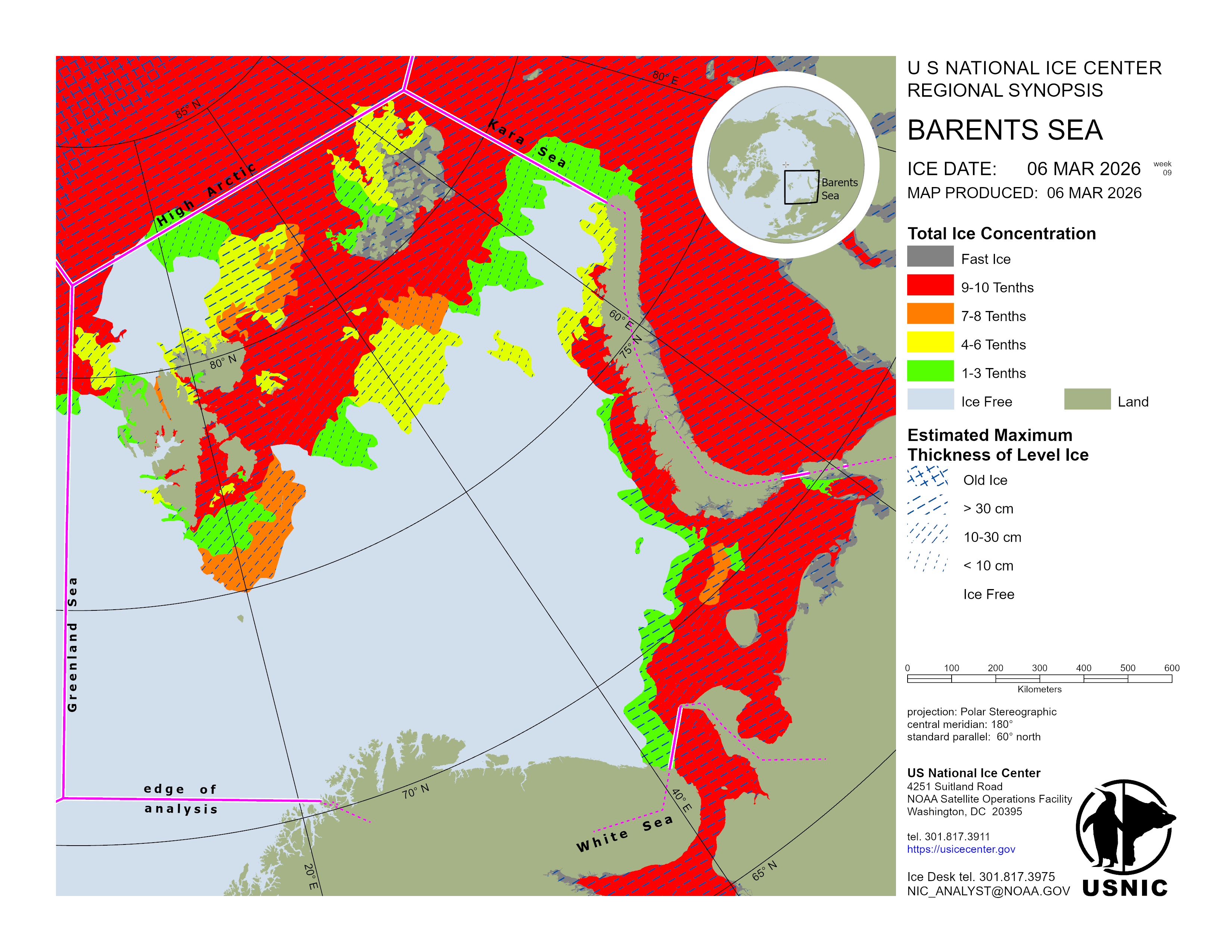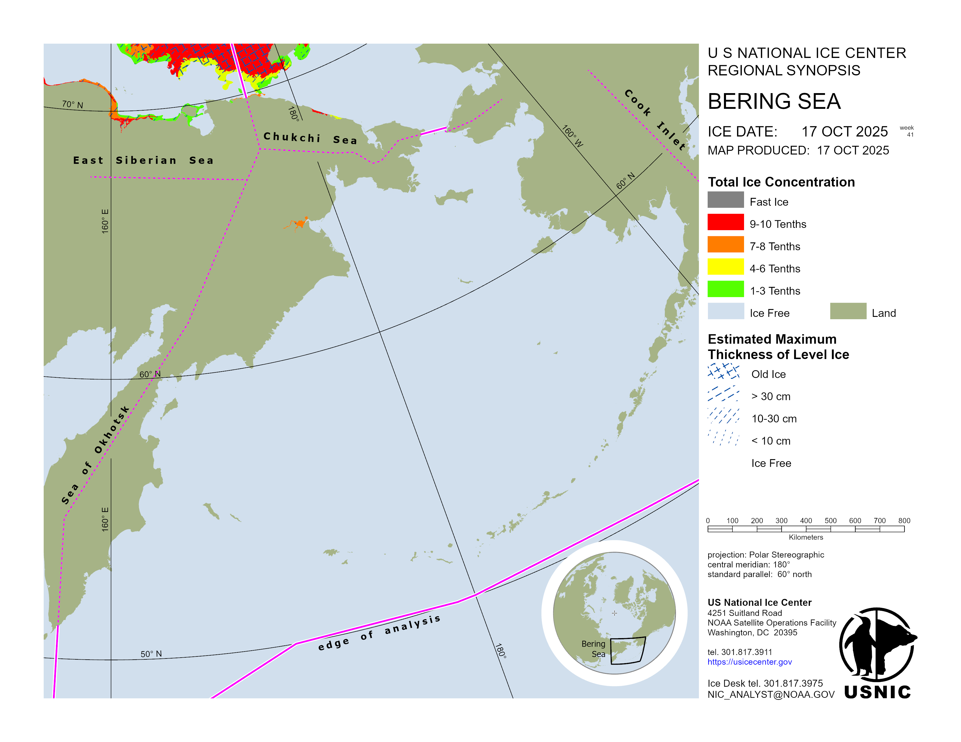 Regional charts and associated synopsis write-up capture ice and environmental conditions throughout the Arctic which are based on the U.S. National Ice Center’s weekly analysis. Charts and synopses are updated weekly on Fridays. Note: Baltic Sea analysis is provided by the Finnish Meteorological Institute. The Canadian Archipelago (Canada East, Canada North, Canada West, and Hudson Bay) analysis is provided by the Canadian Ice Service.