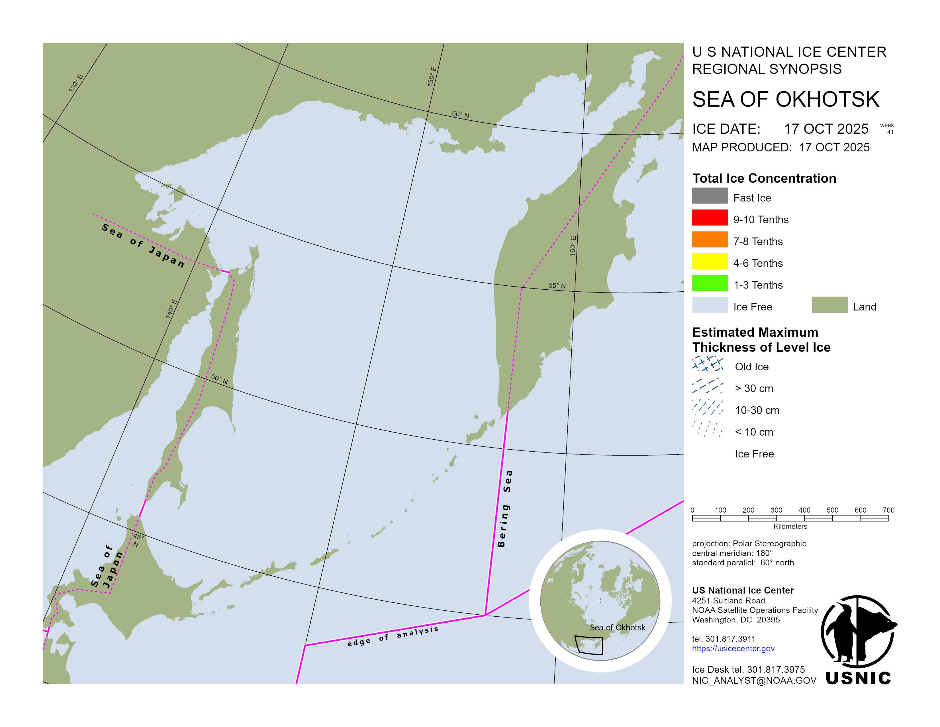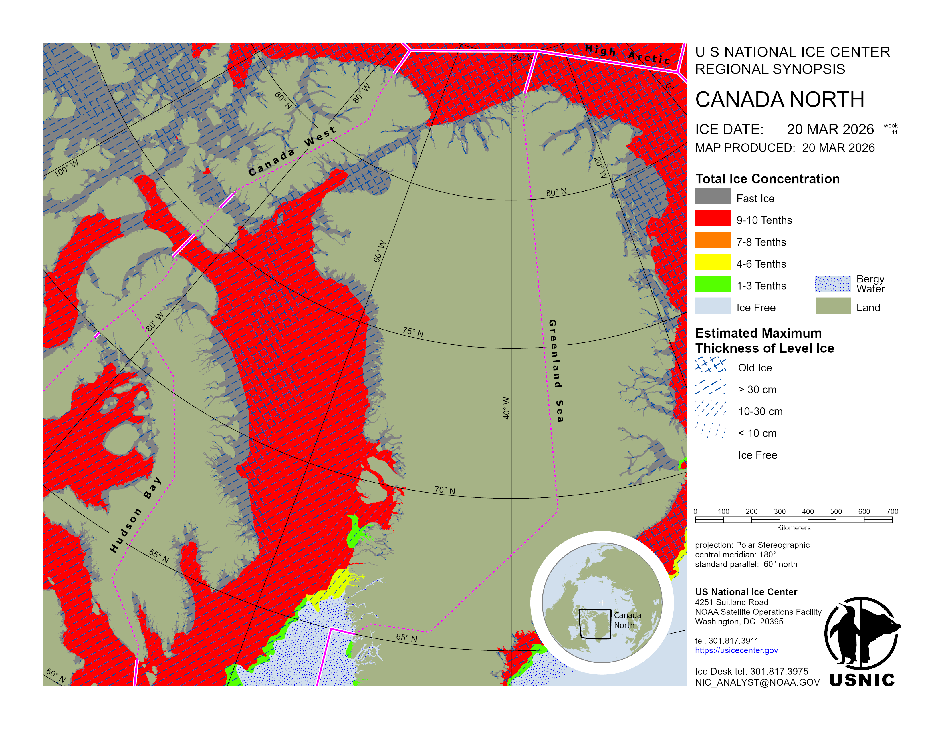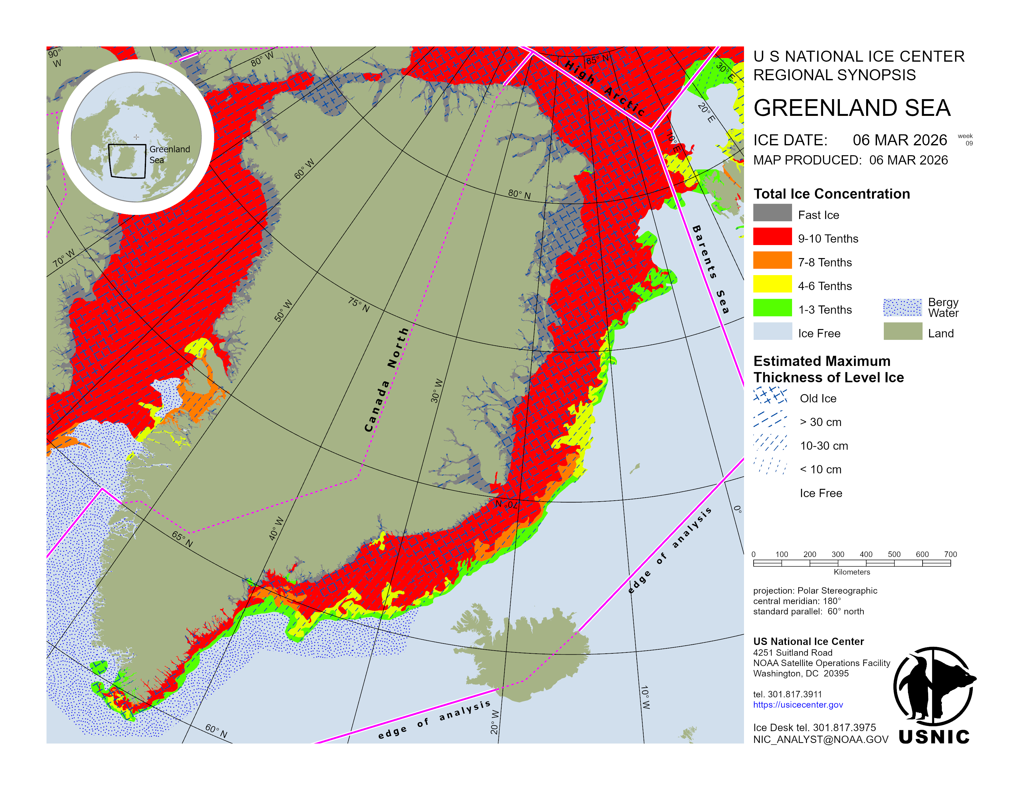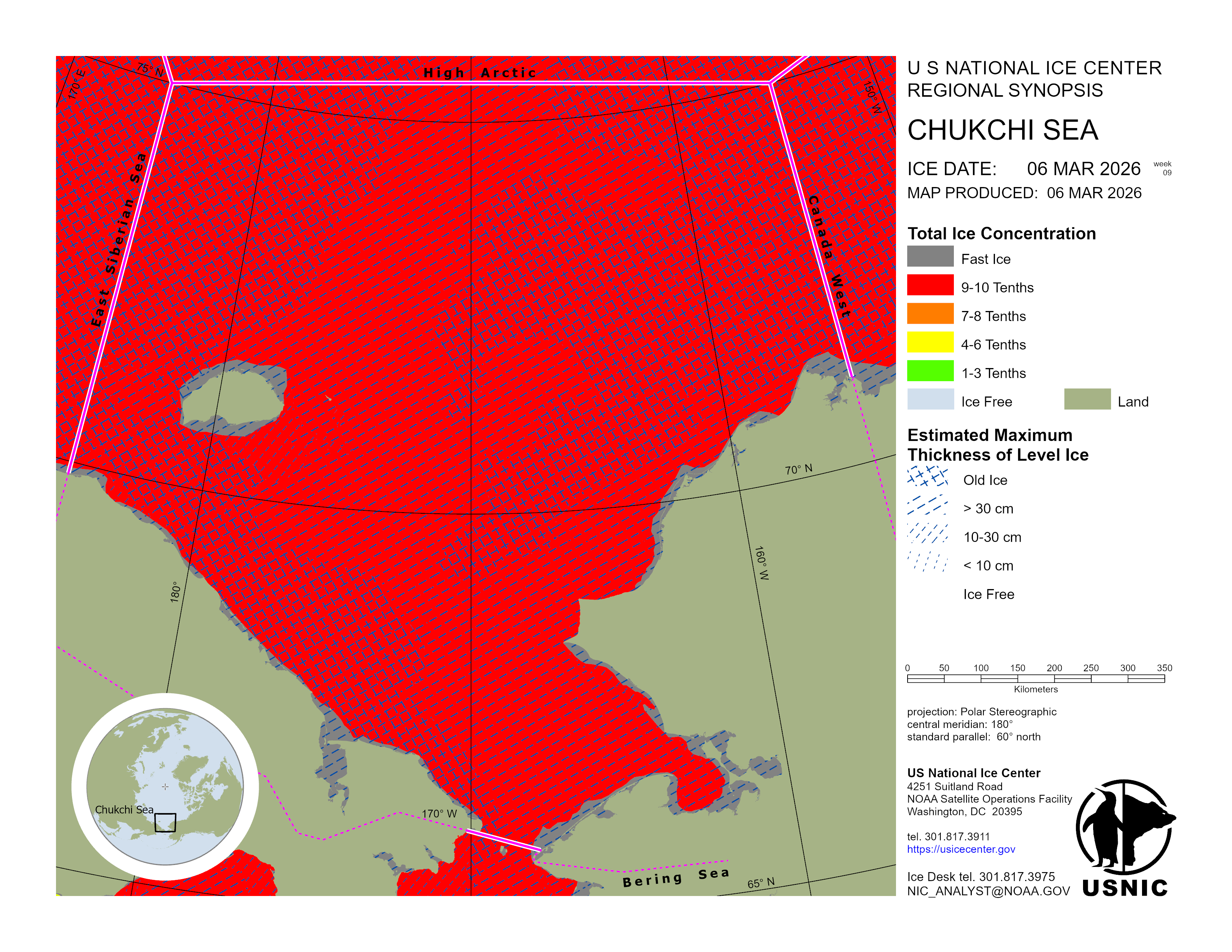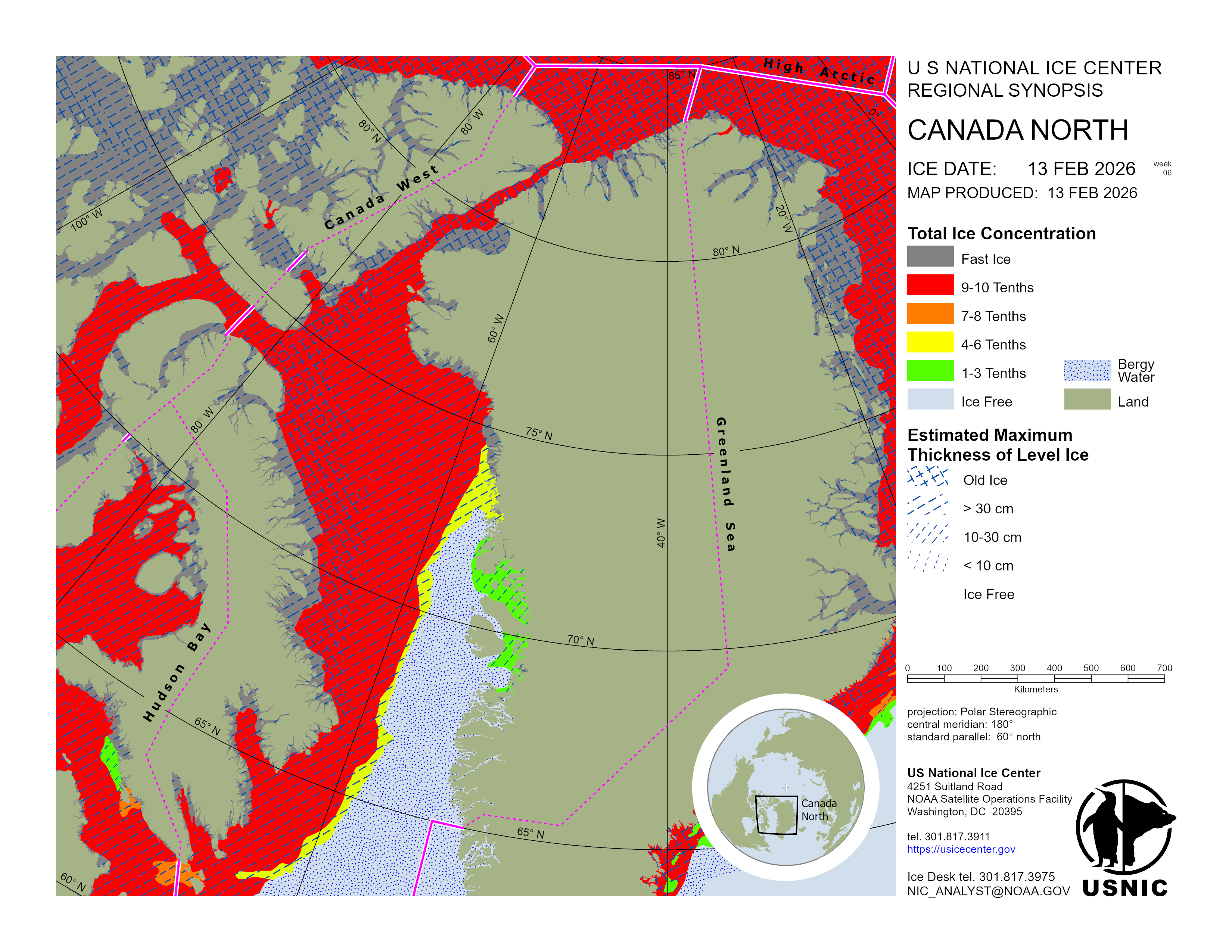 Regional charts and associated synopsis write-up capture ice and environmental conditions throughout the Arctic which are based on the U.S. National Ice Center’s weekly analysis. Charts and synopses are updated weekly on Fridays. Note: Baltic Sea analysis is provided by the Finnish Meteorological Institute. The Canadian Archipelago (Canada East, Canada North, Canada West, and Hudson Bay) analysis is provided by the Canadian Ice Service.