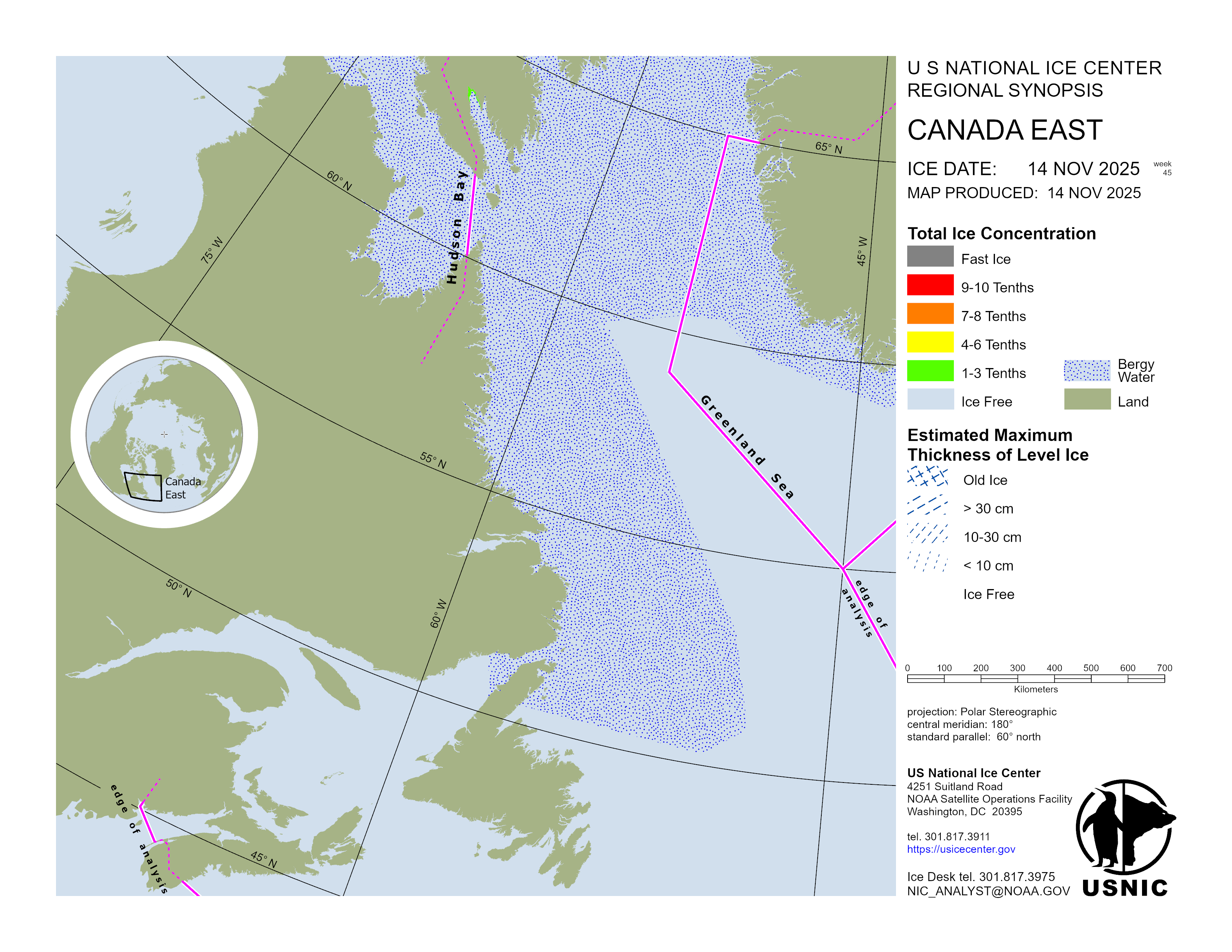 Northern Hudson Bay is mostly ice-free except for the western coast and the shores of Southampton Island: new ice is developing along their entirety. Southern Hudson Bay is mostly ice-free with new ice developing along the southern coast. James Bay contains open water with new ice development along the western coast. Hudson Strait and Ungava Bay contain bergy water. Frobisher Bay contains bergy water with a low amount of new ice developing near Iqaluit. The Labrador Sea is bergy water. Lake Melville is ice-free.