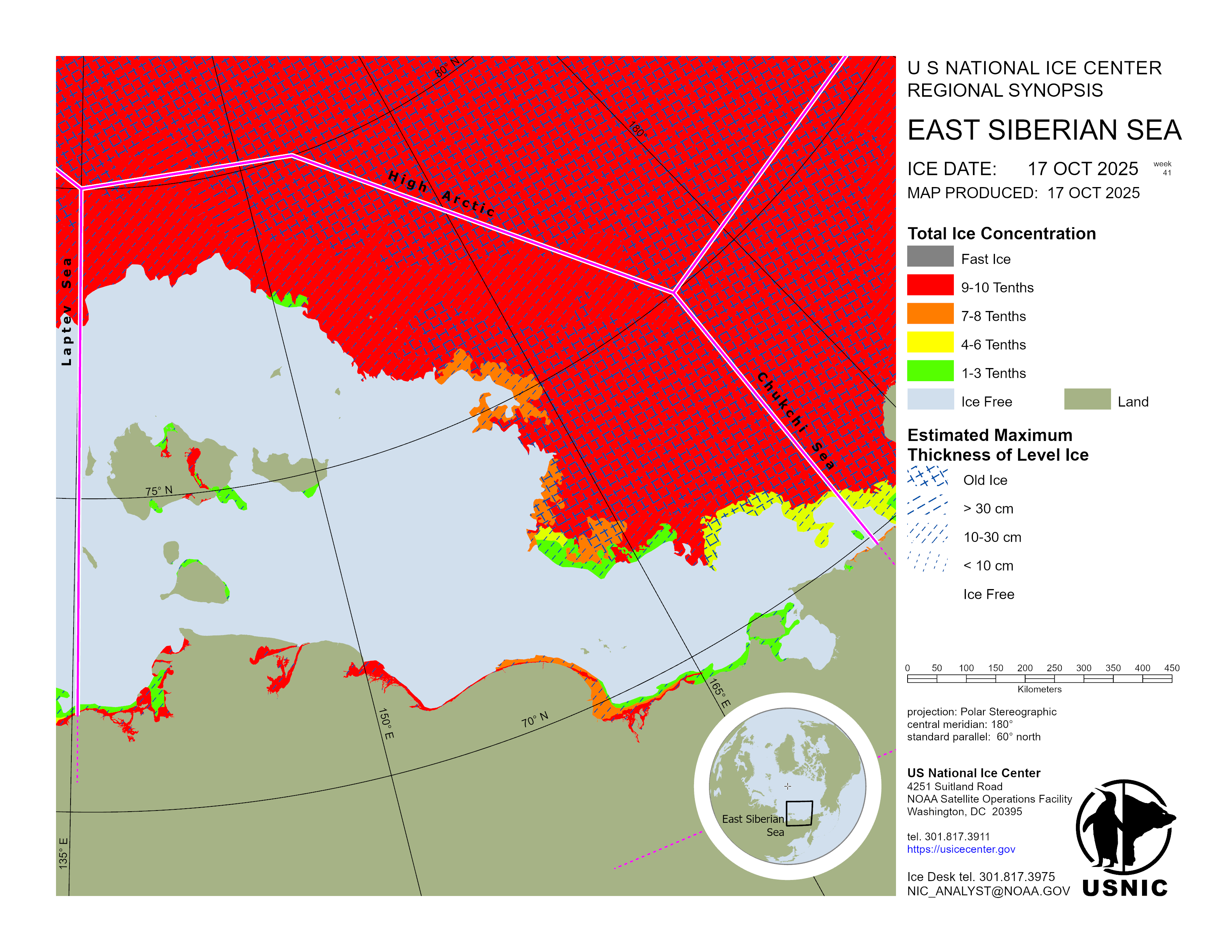 In the East Siberian Sea, areas along the Russian coast are beginning to experience growth of new and young ice. Pack ice continues to advance southward toward the Russian coastline. The New Siberian Islands are also experiencing the formation of new and young ice within their protected and shallow bays and inlets.