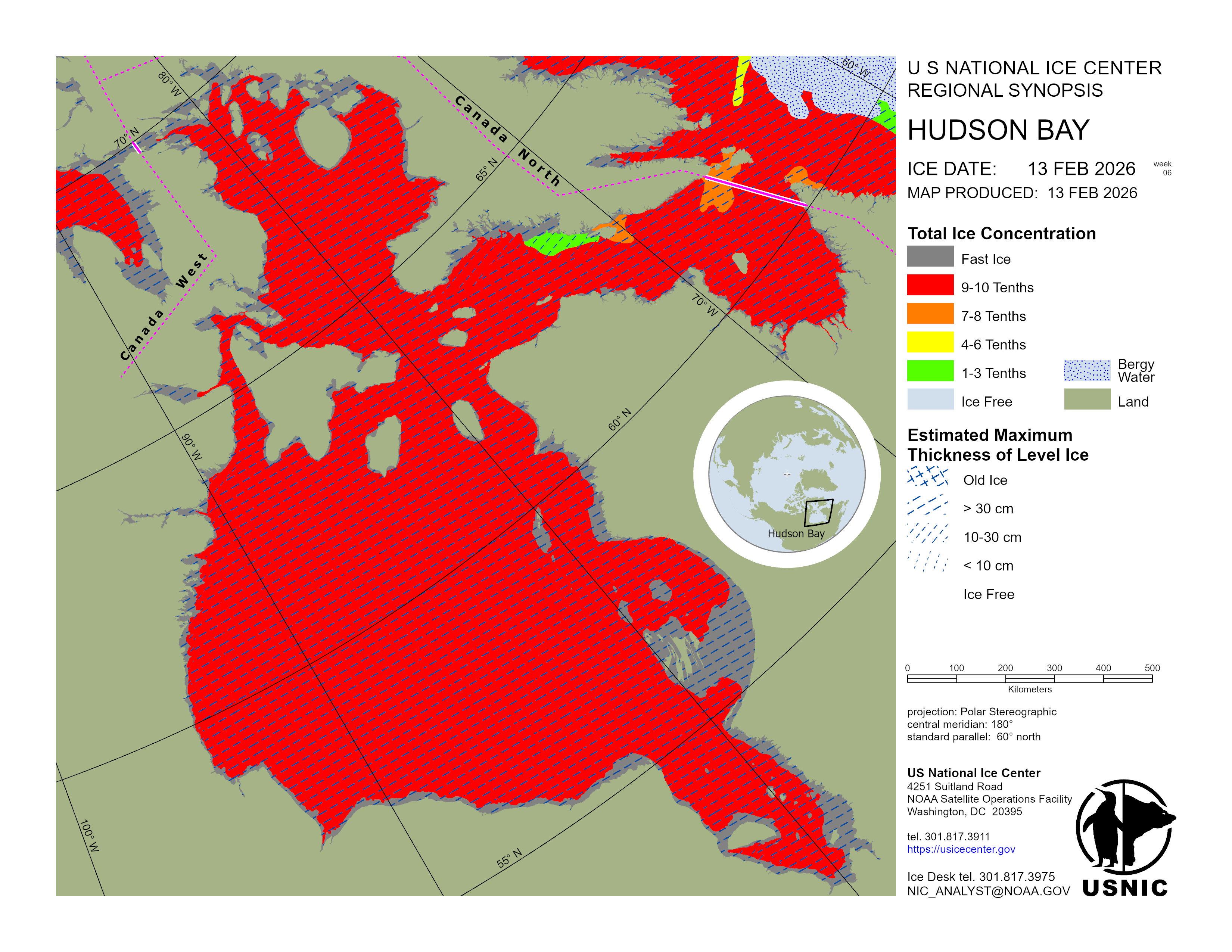 Hudson Bay is predominantly first-year ice with small amounts of young ice where the pack moves away from the coast. Hudson Strait contains a mixture of first-year ice and young ice. Ungava Bay contains mostly first-year ice with small amounts of young ice along the southwestern coast and south of Akpatok Island. James Bay is predominantly first-year ice with small amounts of young ice along the eastern and western coasts. The Labrador Sea is bergy water with young and first-year ice along the Labrador coast. Frobisher Bay contains a mixture of new and young ice.
