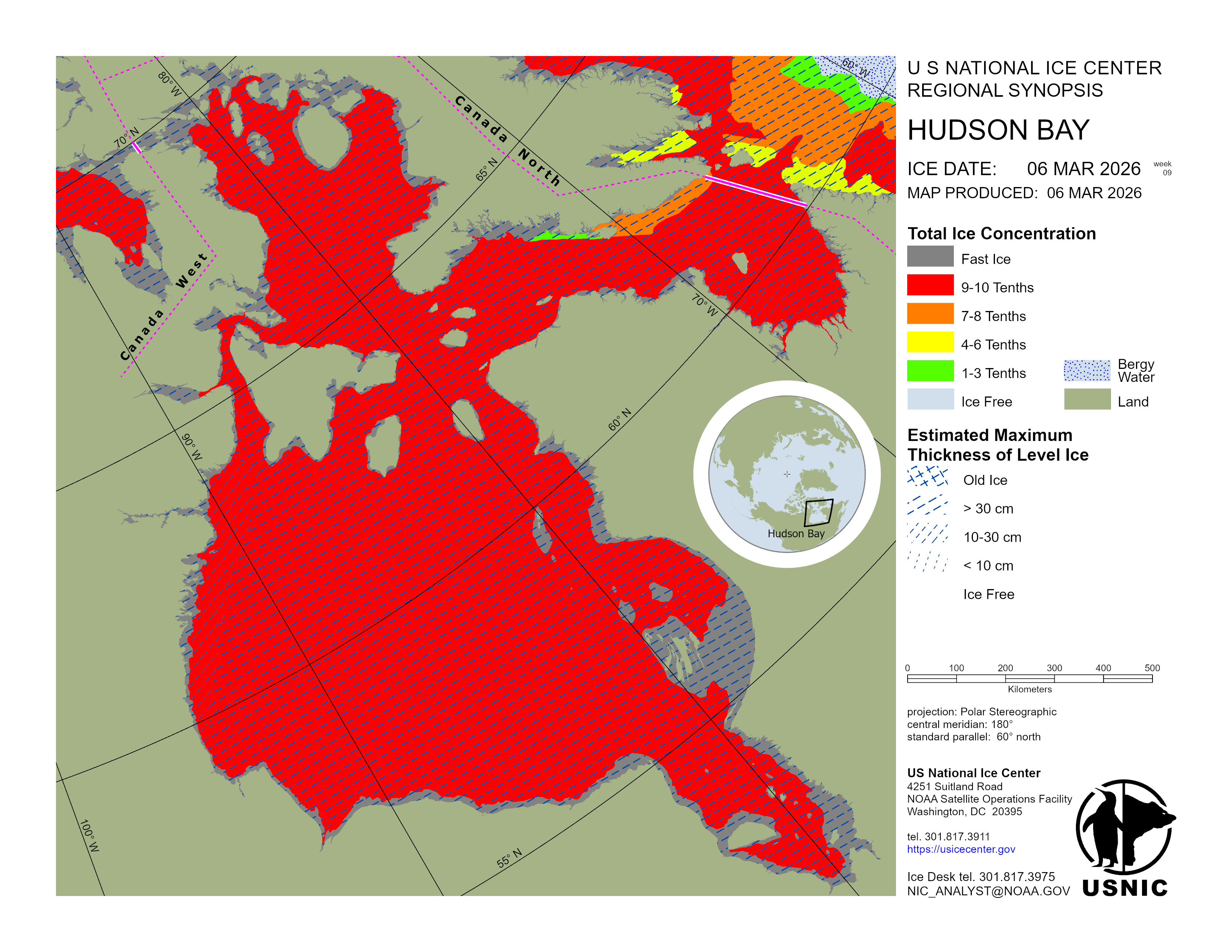 Hudson Bay is predominantly first-year ice with young and new ice where the pack moves away from the coast. Hudson Strait contains mostly first-year ice with young and new ice in the northern section. Ungava Bay contains mostly first-year ice with young and new ice along the southwestern coast and south of Akpatok Island. James Bay is predominantly first-year ice with some young and new ice.