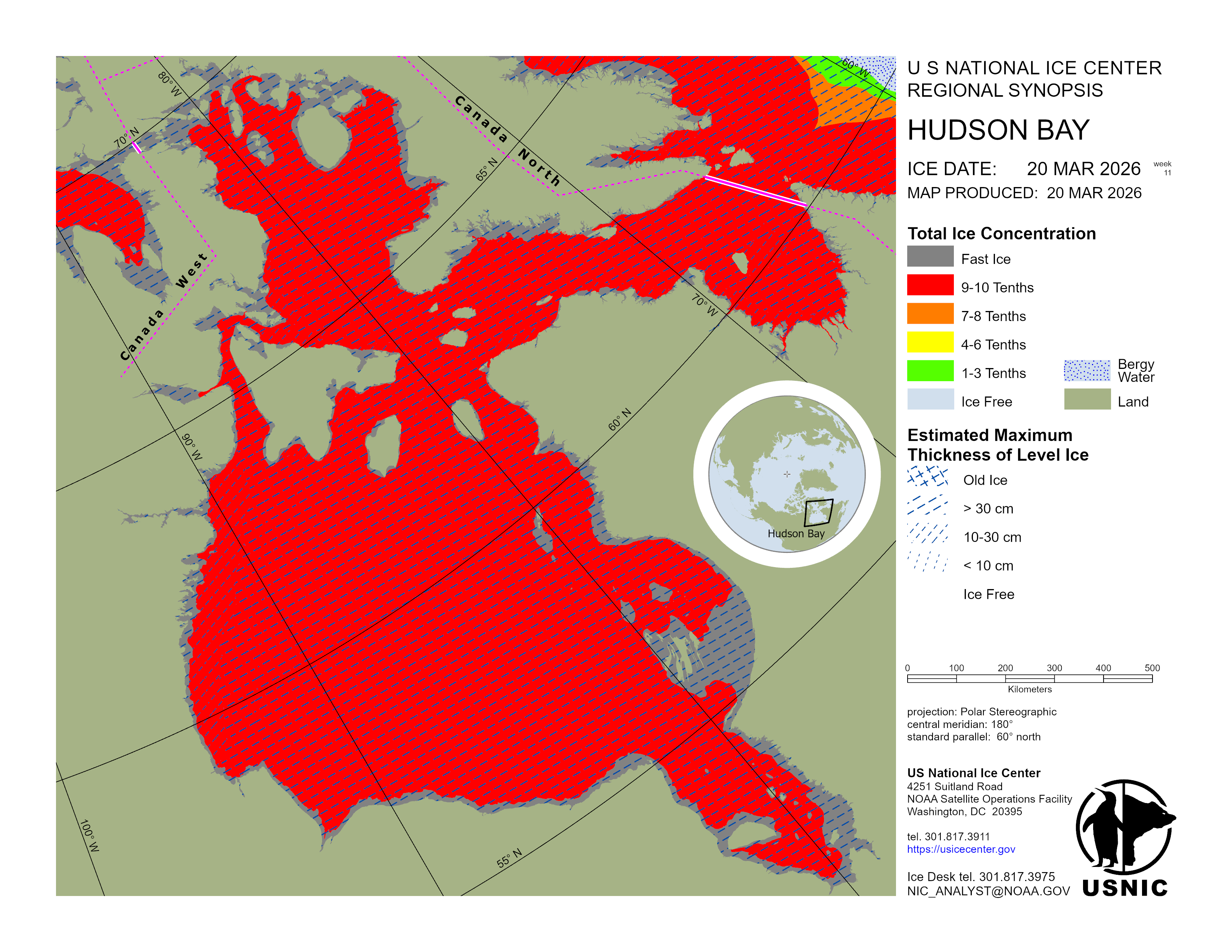 James Bay contains first-year ice. Hudson Bay comprises first-year ice with young and new ice forming where the pack pulls away from the coast. Hudson Strait contains mostly first-year ice with young and new ice along parts of the coasts. Ungava Bay contains mostly first-year ice in the northern and eastern sections with young and new ice in the southwestern section. Foxe Basin contains mostly first-year ice with some young and new ice present in the western section along the coast.