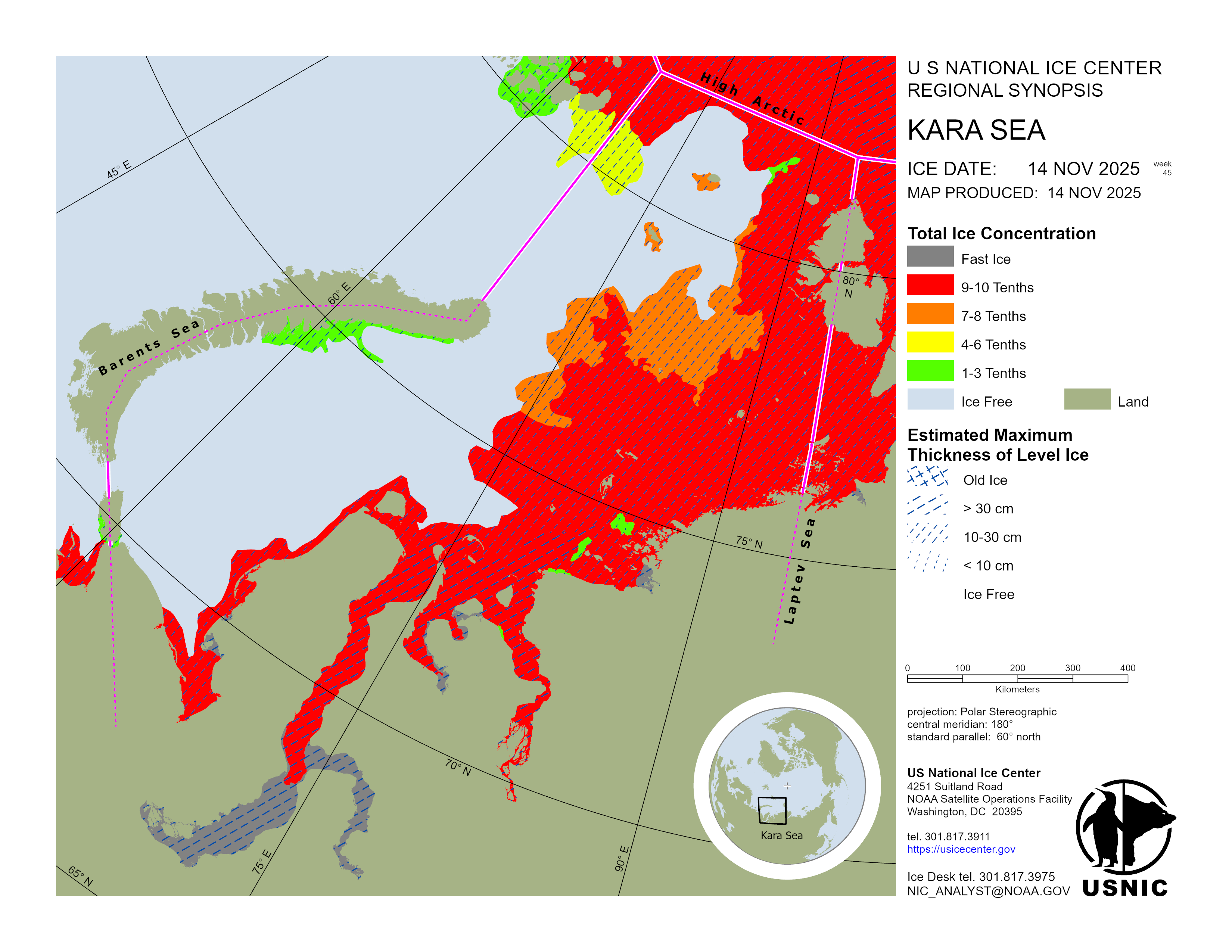Recent air temperatures in the Kara Sea, ranging from -18°C to -4°C, have led to significant ice growth, extending over 100 NM since last week. The combination of frigid temperatures and atmospheric conditions has resulted in fasted ice in the Gulf of Ob. New and young ice development continues along the eastern coast of Novaya Zemlya.