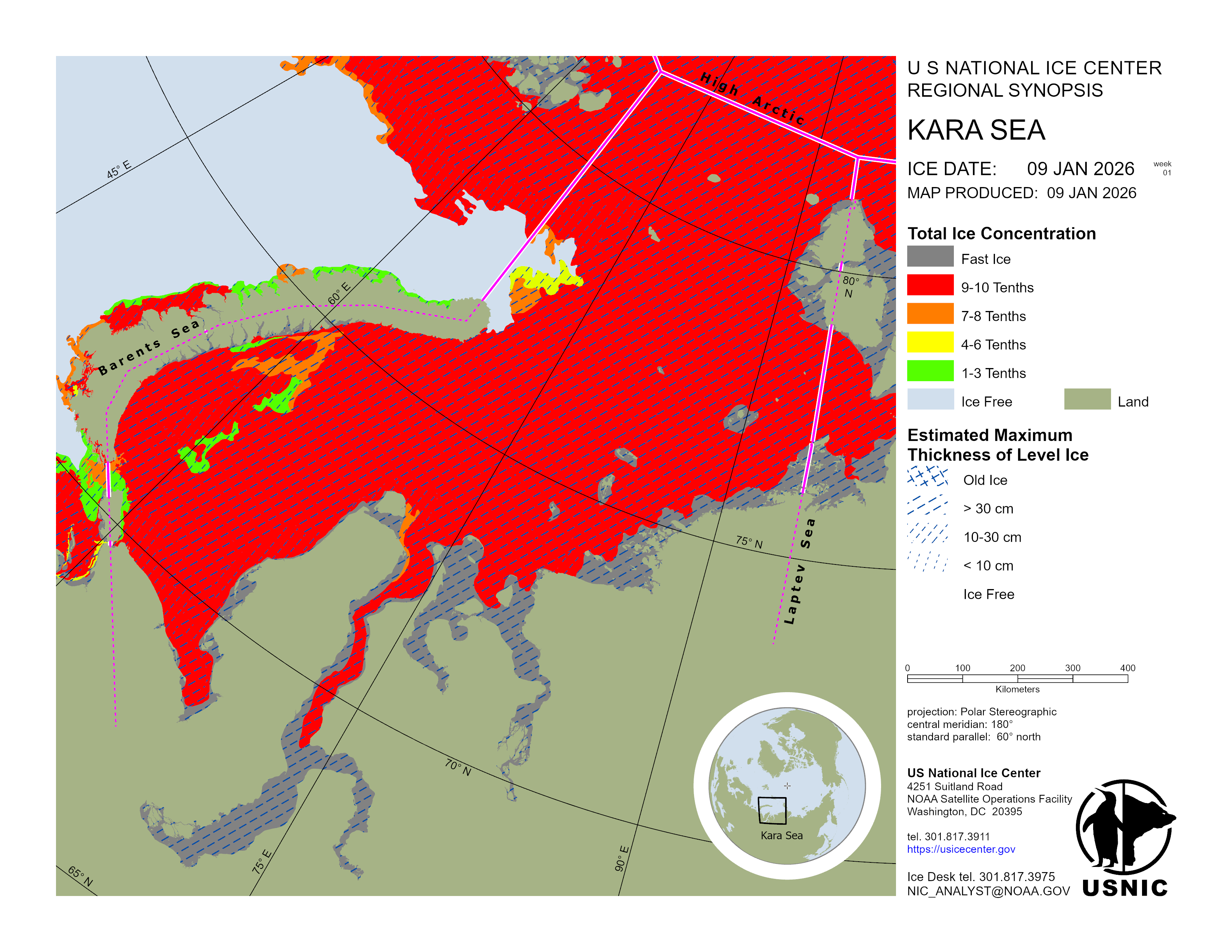 In the southern Kara Sea, frigid air temperatures to the east of Novaya Zemlya resulted in significant growth of new and young ice over the last week. In the northern Kara Sea, pack ice shifted up to 50 NM to the northwest as a result of a strong area of low pressure centered near Yamal Peninsula.