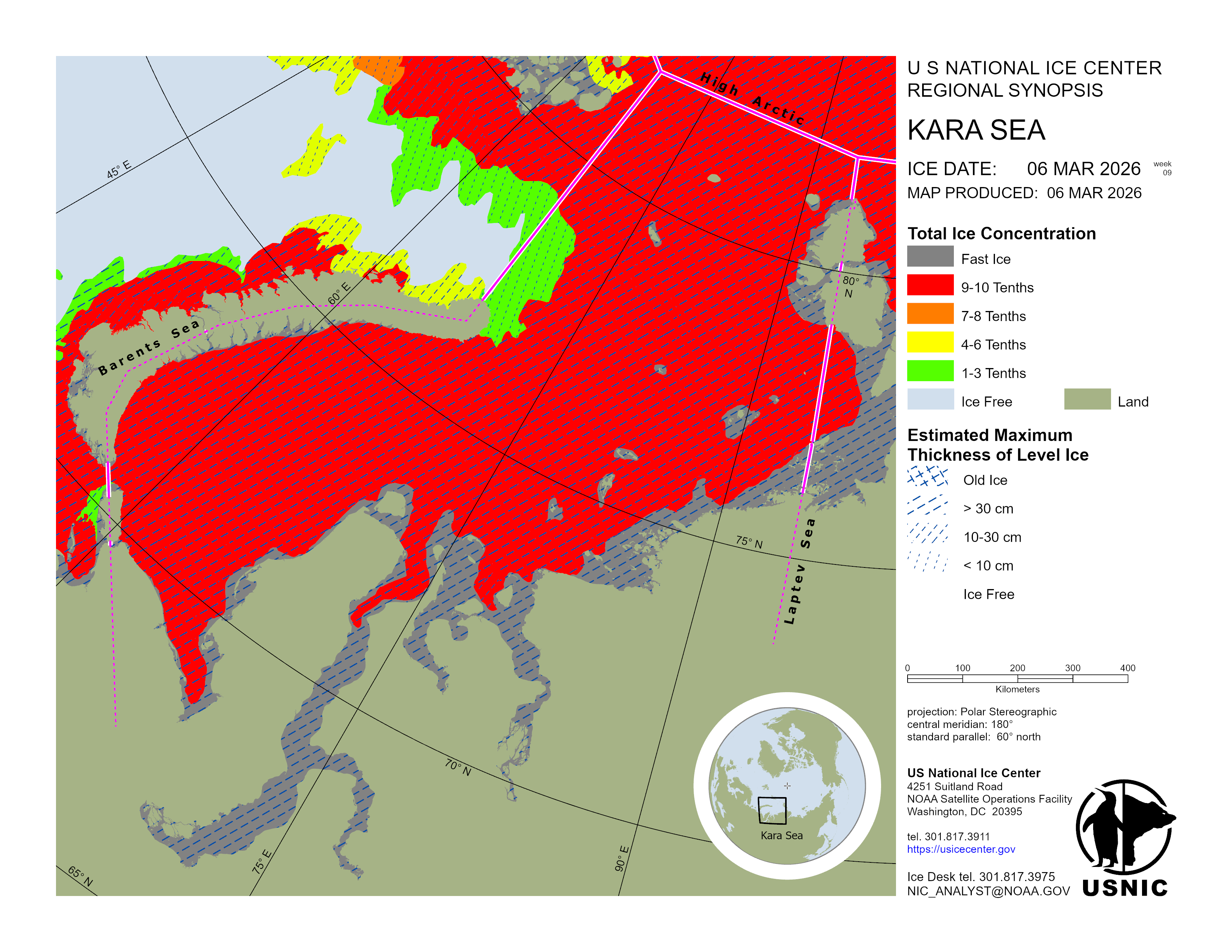 Frigid air temperatures are in place over the Kara Sea, ranging from -14°C over northern Novaya Zemlya to -30°C over the pack ice in the southern Kara Sea. Sea ice has generally drifted northward, with polynyas rapidly freezing over with new and young ice on the lee side of islands and adjacent fast ice.