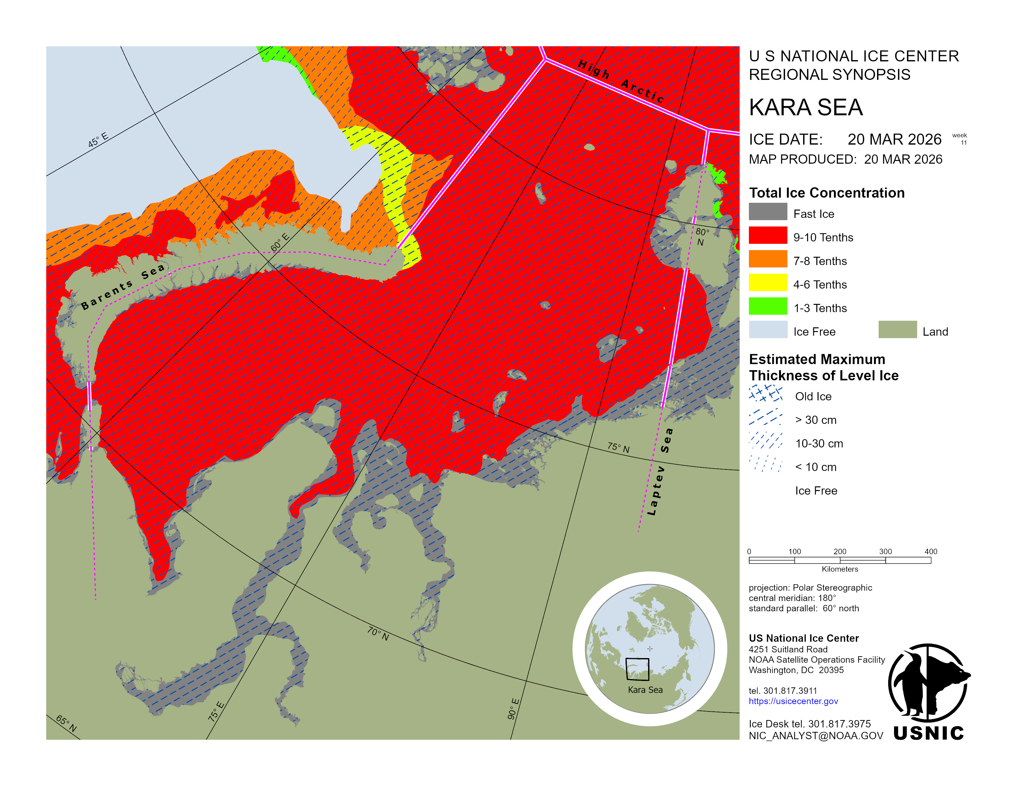 Air temperatures over the Kara Sea range from -08°C to -30°C. Sea ice in the southern Kara Sea is drifting westward, increasing ice pressure along Novaya Zemlya, and thinner ice types are rapidly freezing along the Yamal Peninsula. In the northern Kara Sea the sea ice is drifting northward, and a polynya has opened along the fast ice along the main land Russian coastline.
