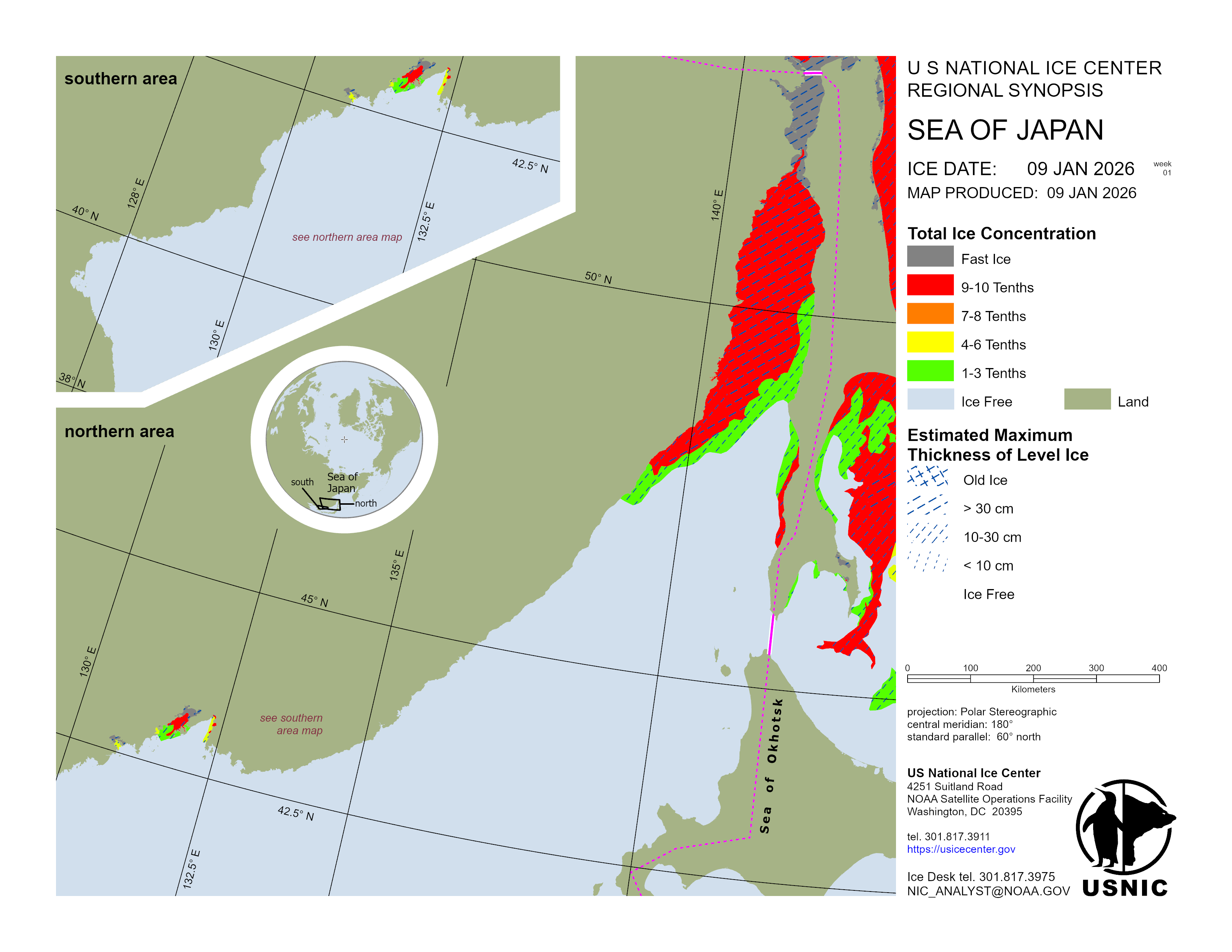 In the Sea of Japan in the vicinity of Peter the Great Bay air temperatures range from -10°C to -18°C. These frigid air temperatures are allowing for rapid new and young sea ice growth. As the sea ice drifts southward it encounters warmer waters and melts. In the vicinity of the Fast ice spans the northern Tartar Strait and the Sakhalin Gulf.