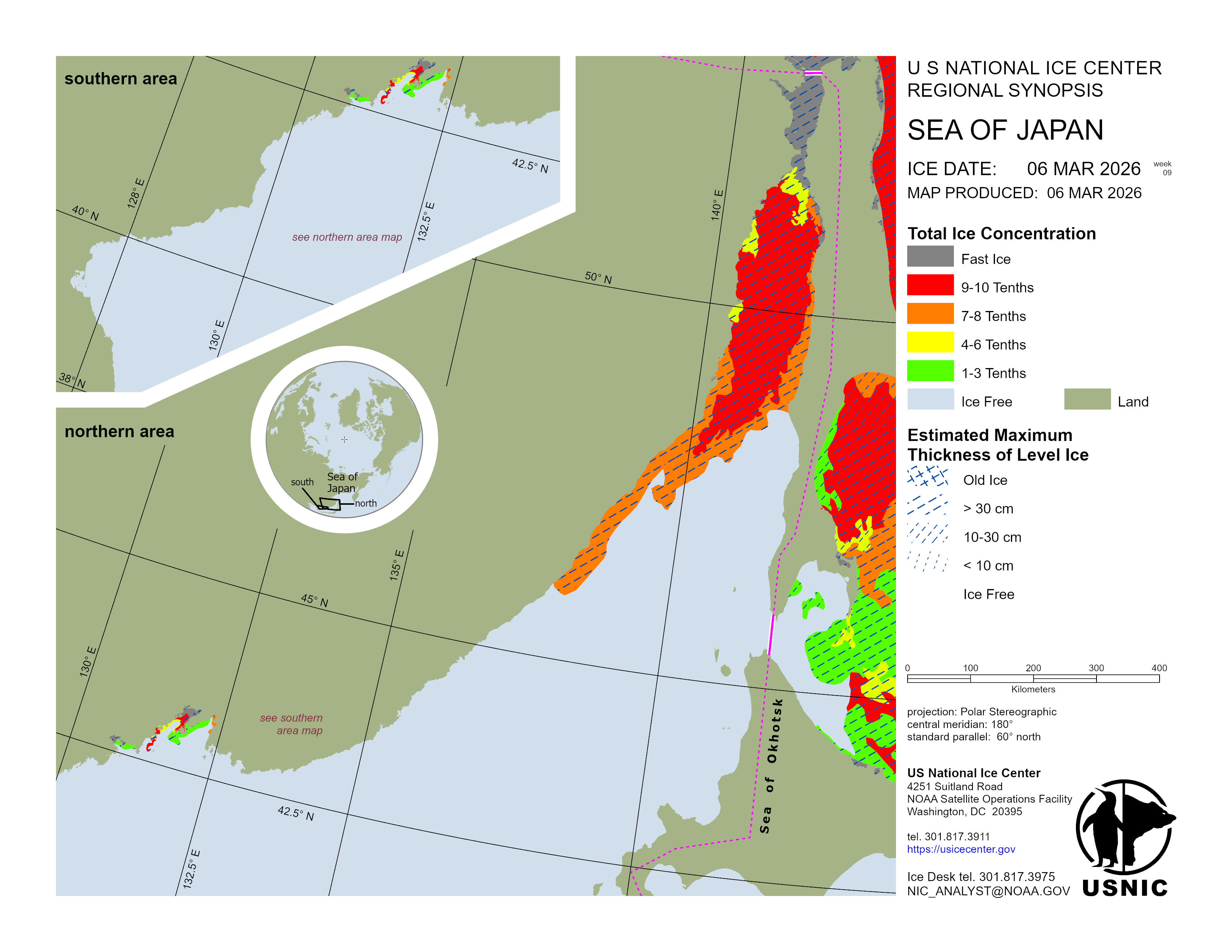 In the northern Sea of Japan south of the fast ice in the Tartar Strait, the sea ice is drifting southward. Air temperatures over the strait are -10°C, allowing for new and young sea ice to form and drift southward as well. This is known as the ice conveyor belt process. As the first year ice continues to drift southward it melts as it encounters warmer waters near the 47° north latitude. Along the Sakhalin Islands an area of newly observed land-fast ice has developed just south of the Tartar Strait. In the northern portion of Peter the Great Bay sea ice is in high concentrations. The port of Vladivostok has low concentrations of sea ice.