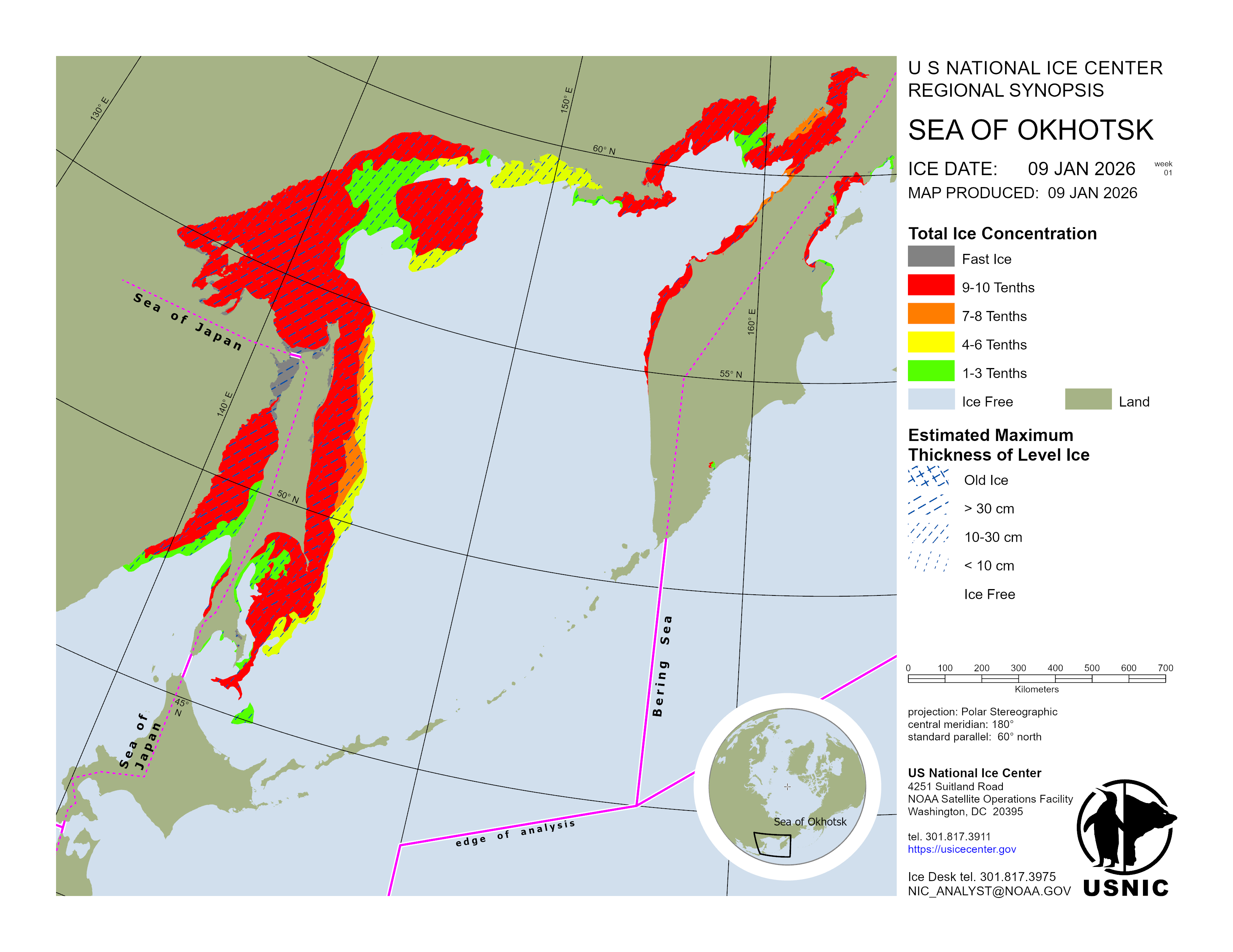 In the Sea of Okhotsk, air temperatures range from -30°C along the northern Russian shore, to -04°C along the Kuril Island chain. Sea ice has generally drifted southward with new and young sea ice forming along the northern shore and thickens rapidly under these frigid conditions. This action is called the ice conveyor belt process.