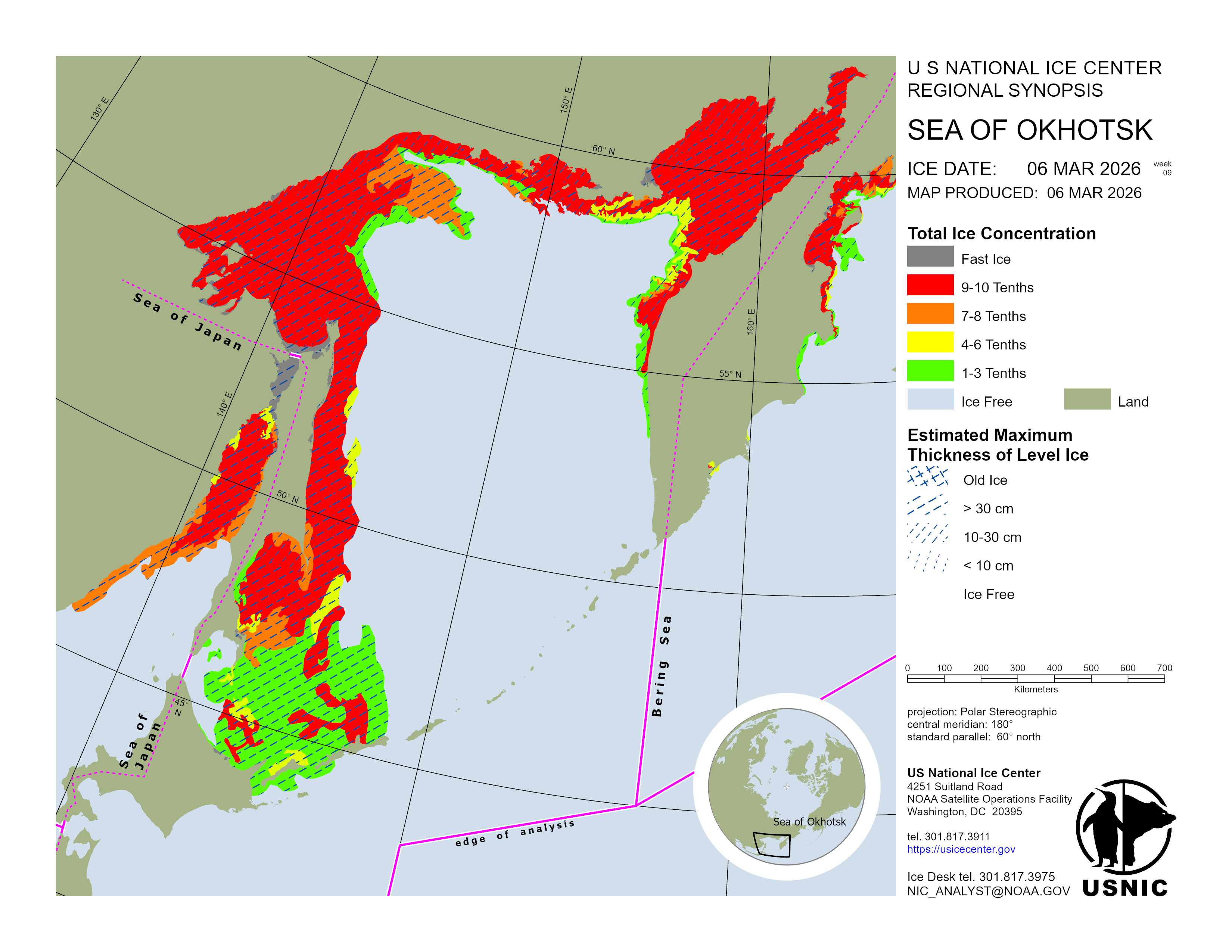 In the Kamchatka region ice is fairly similar to the previous week with some minor melting along the ice edge with some new and young ice developing along the islands. Land fasted ice in the protected and shallow bays are remaining consistent. Some areas of blow out are being seen near the coastline. In the Bering Sea the ice edge has advanced 120 to 180 nautical miles under the influence of strong northeasterly winds. A Polynya has formed along the Alaskan coastline and have quickly frozen over in air temperatures as cold as -20°C.