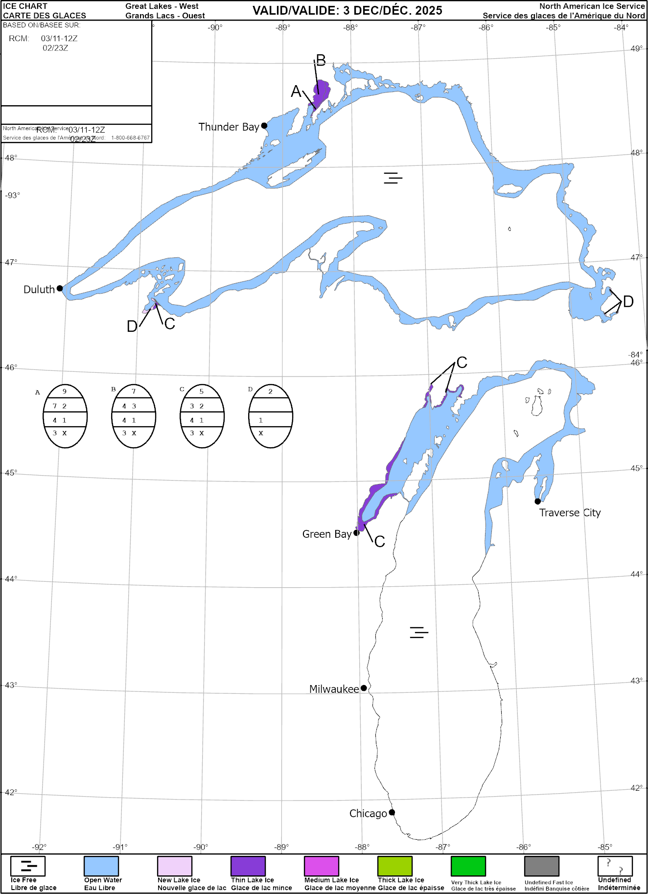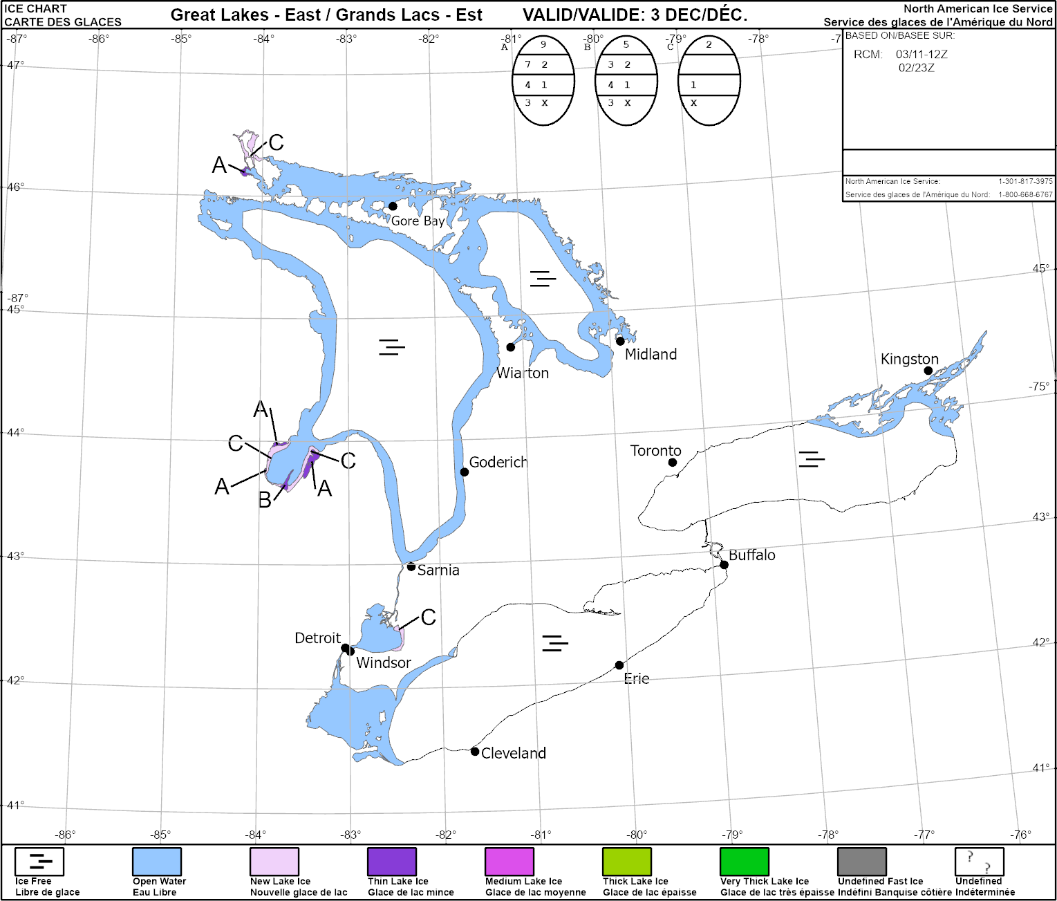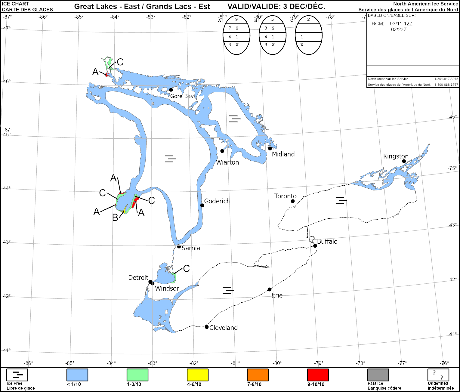 Twice weekly (Tuesday and Thursday) ice charts that represents the current ice conditons for Great Lakes waters during their ice season. Ice coverage is detailed in 3 separate charts: