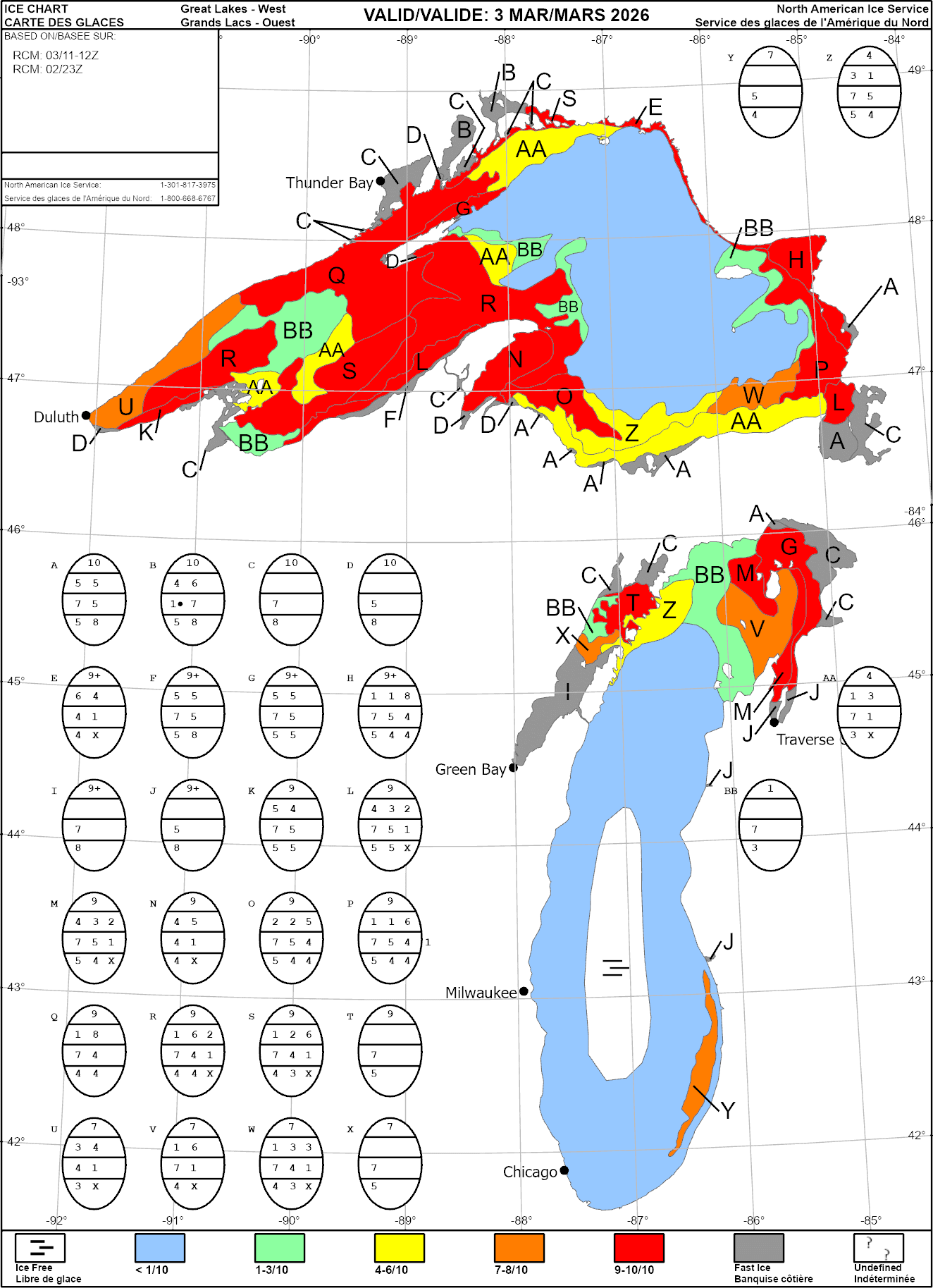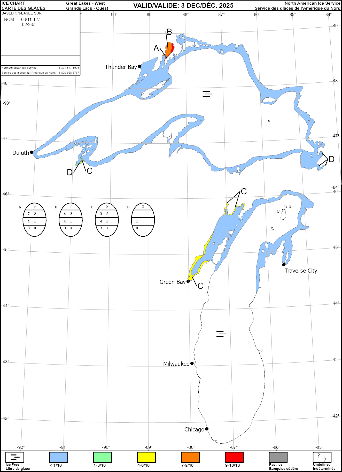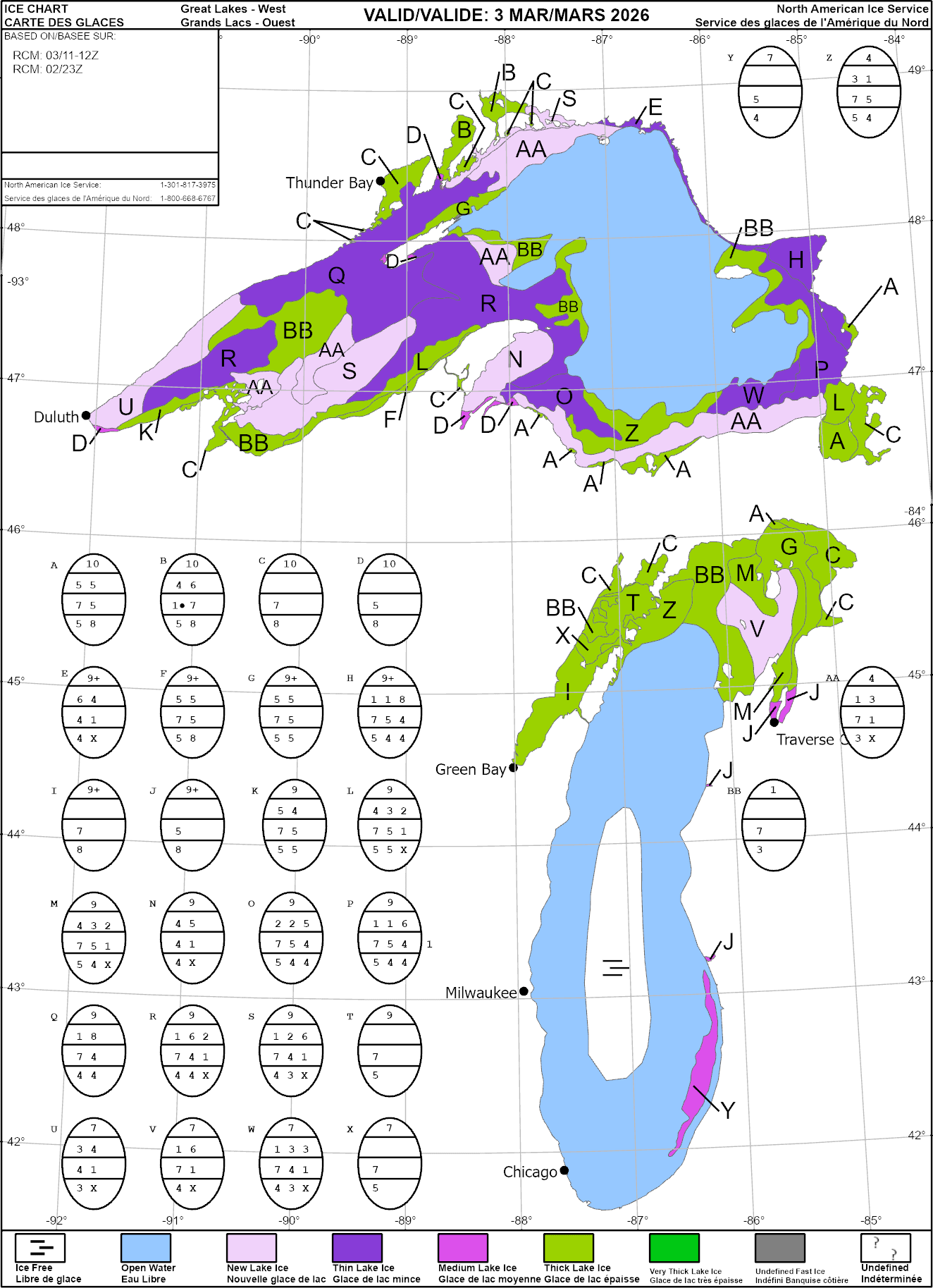 Twice weekly (Tuesday and Thursday) ice charts that represents the current ice conditons for Great Lakes waters during their ice season. Ice coverage is detailed in 3 separate charts: