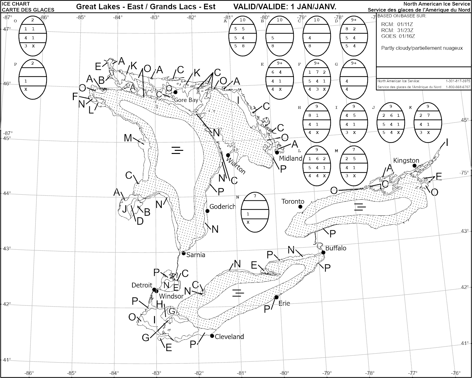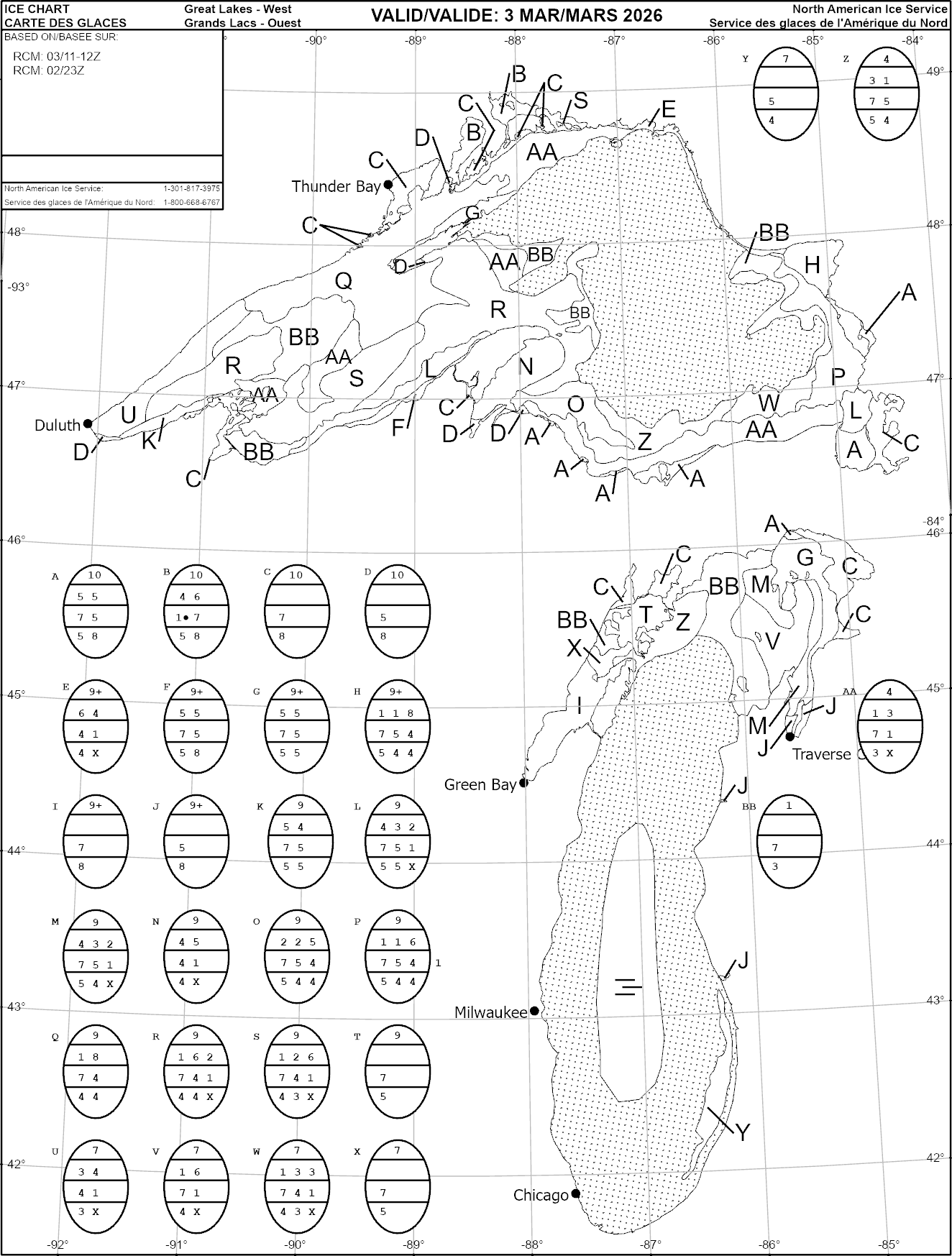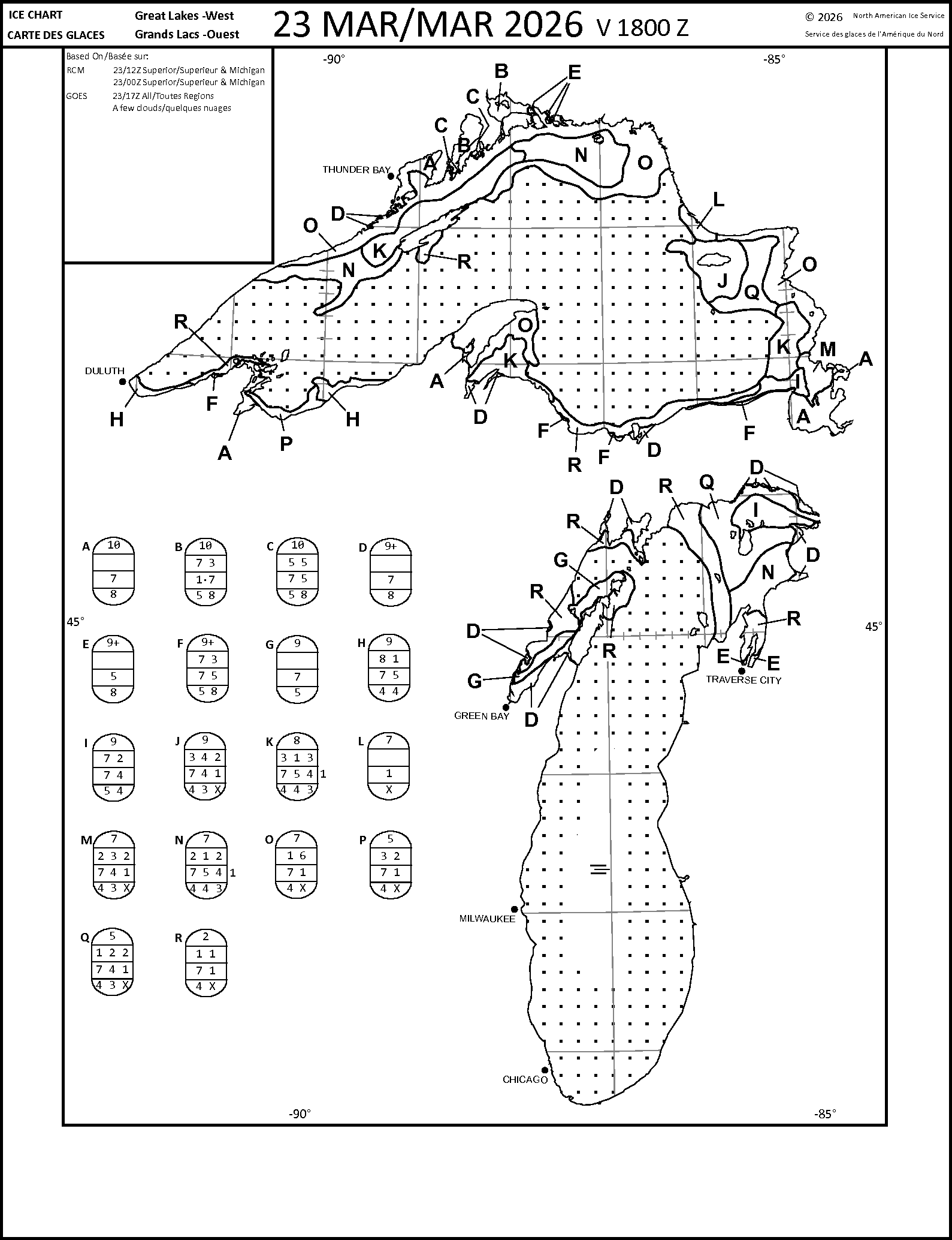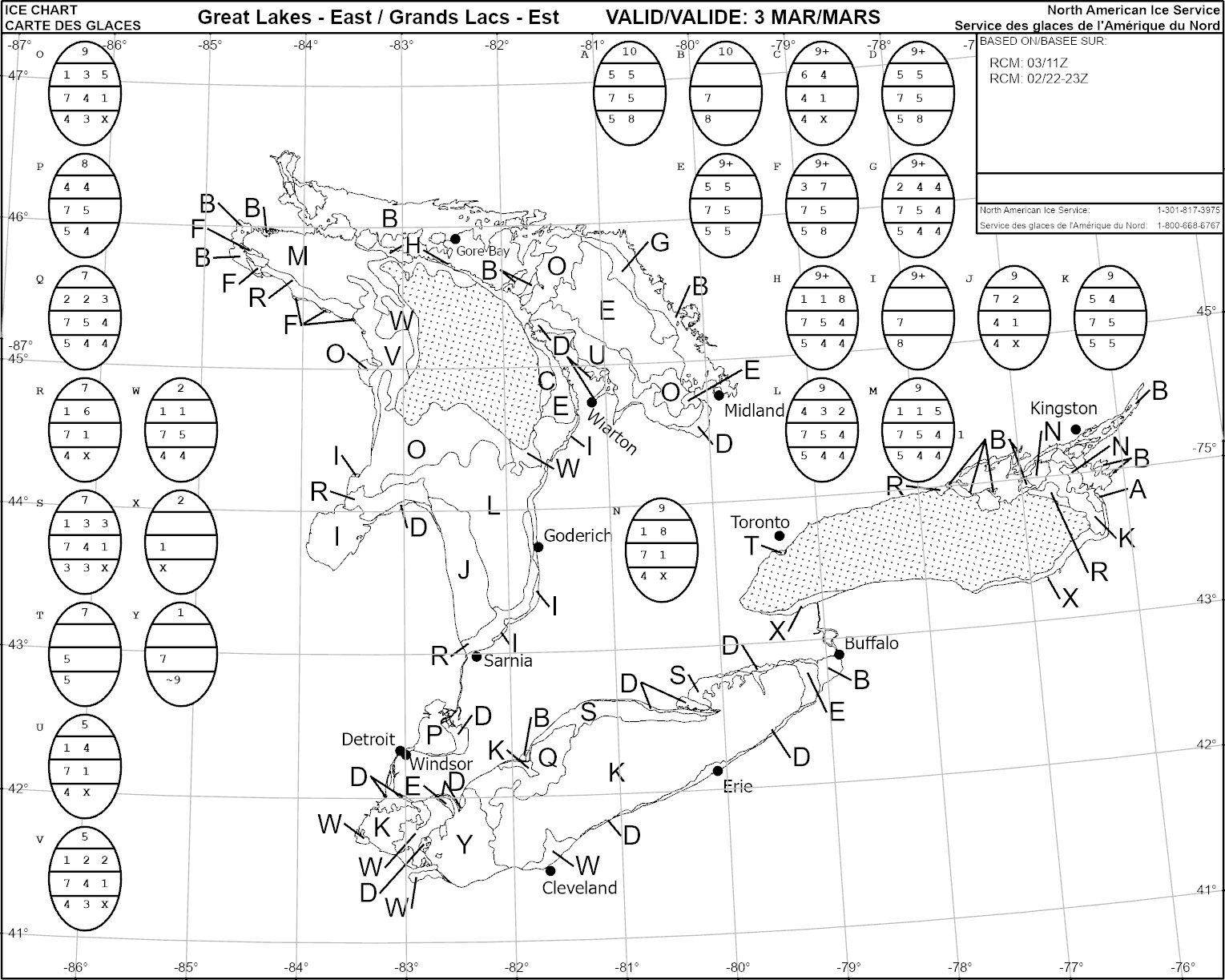 Daily ice chart that represents current ice coverage for eastern/western Great Lakes waters during their ice season. WMO egg code represents ice concentration, ice stage of development with its concentration, and ice floe size. Ice charts are presented in black and white GIFs.