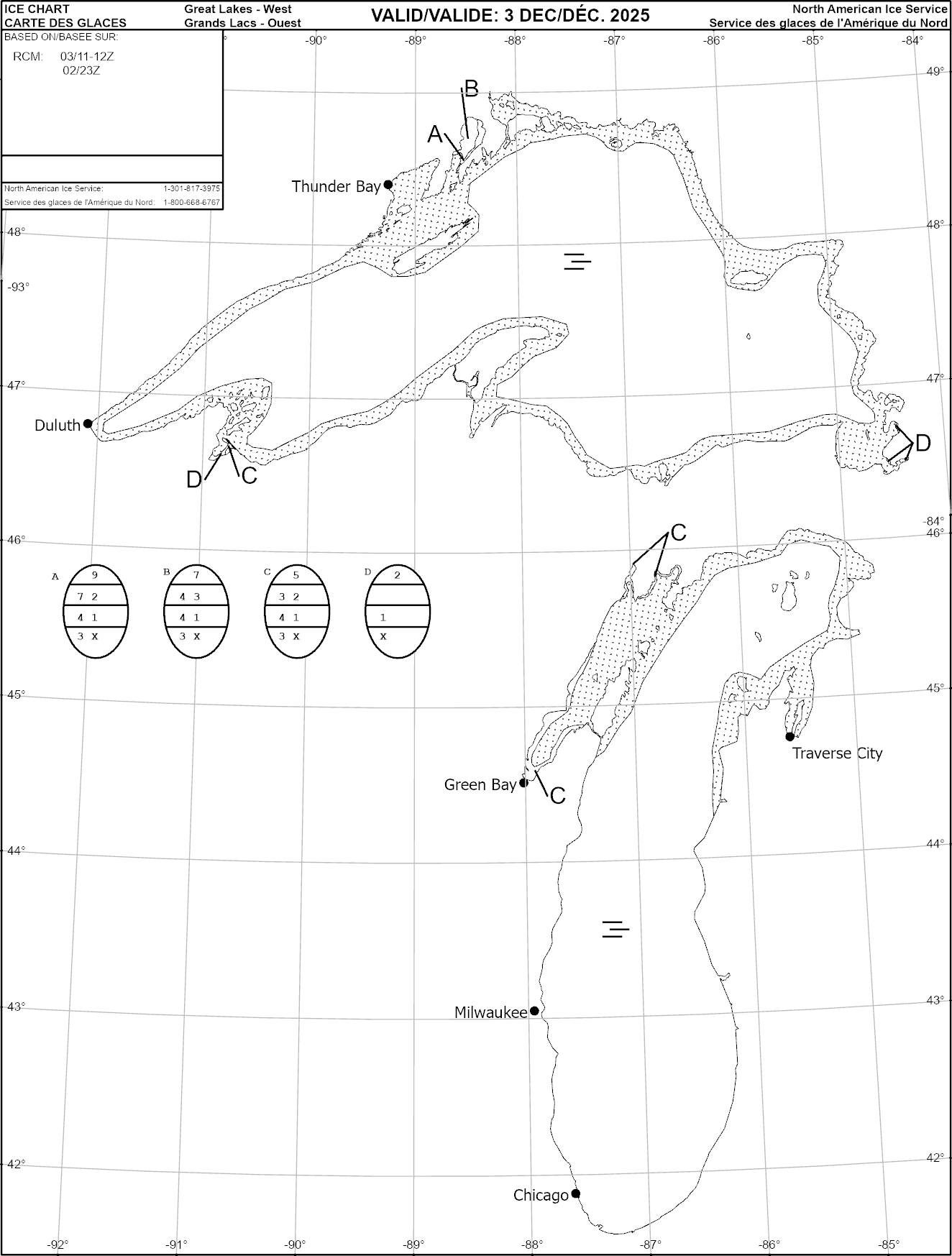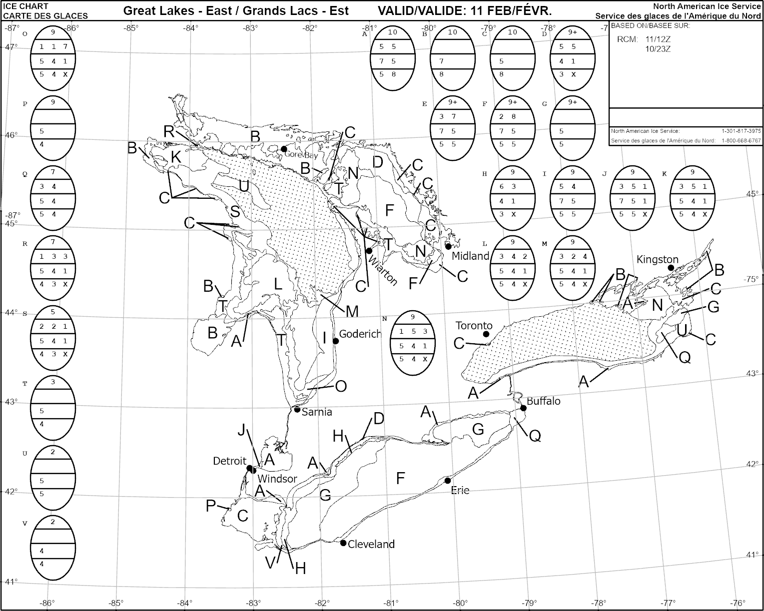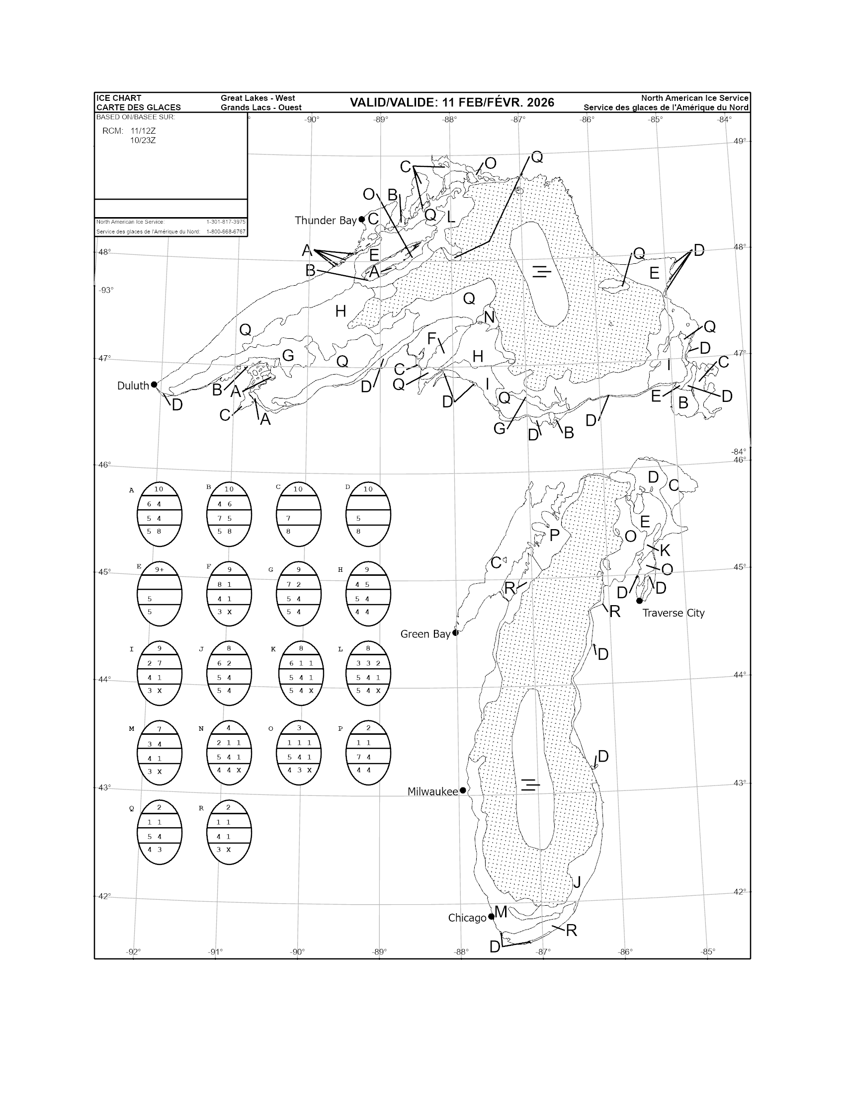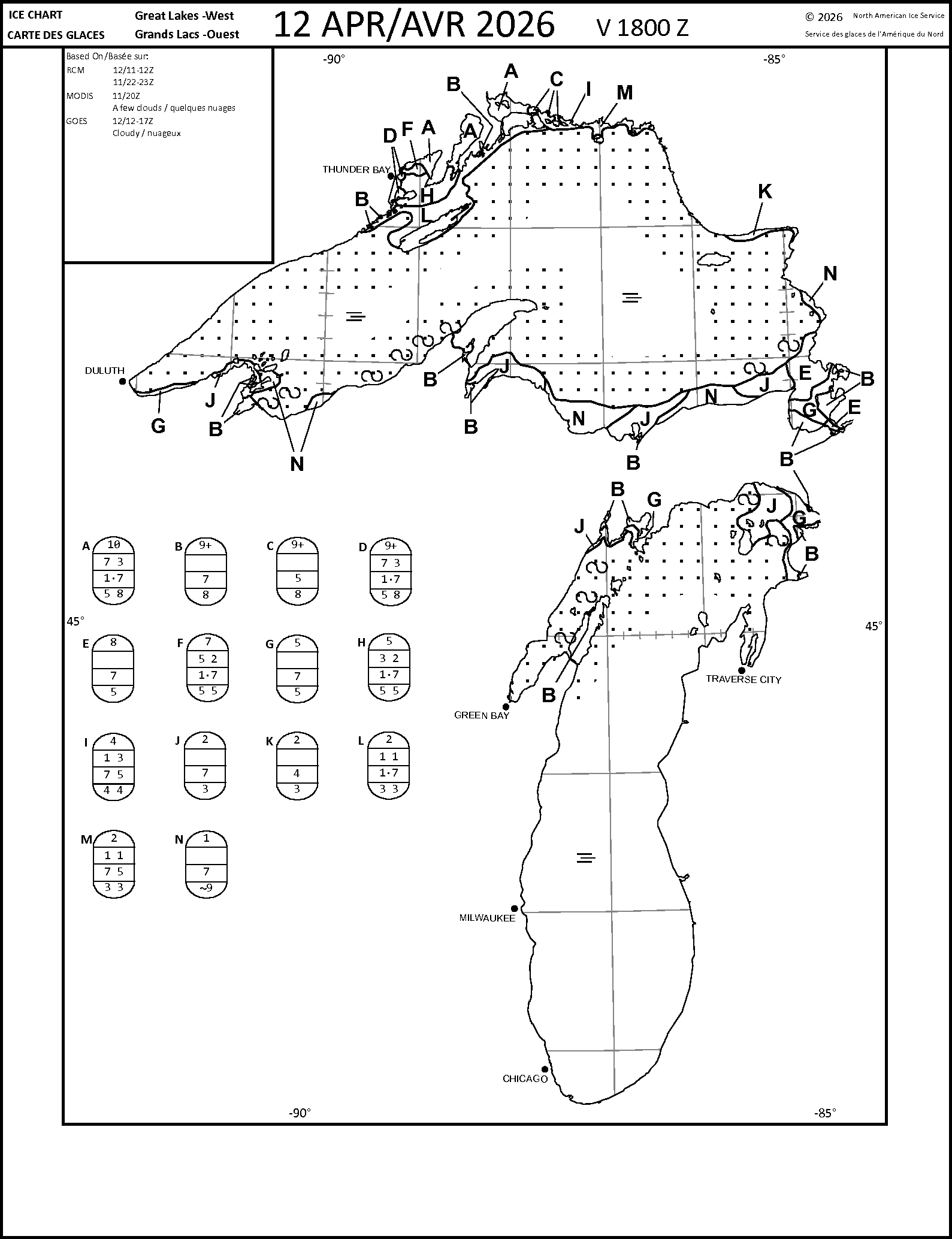 Daily ice chart that represents current ice coverage for eastern/western Great Lakes waters during their ice season. WMO egg code represents ice concentration, ice stage of development with its concentration, and ice floe size. Ice charts are presented in black and white GIFs.