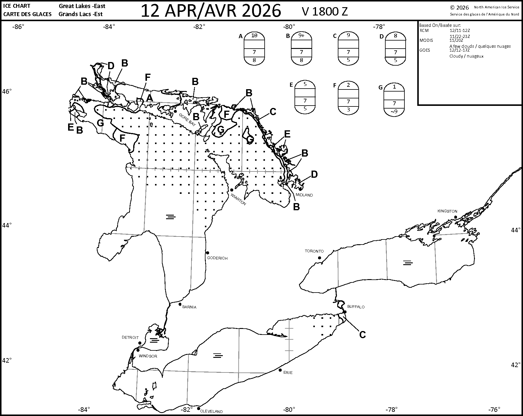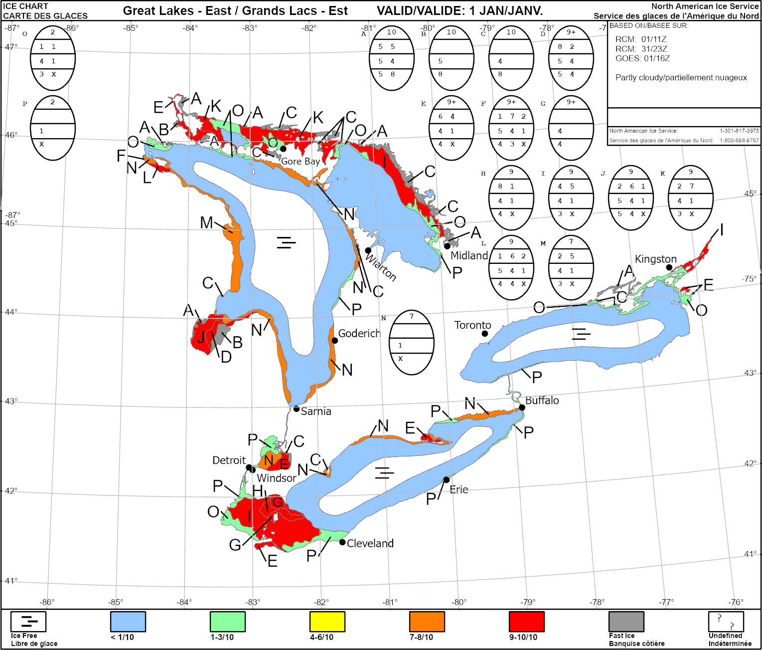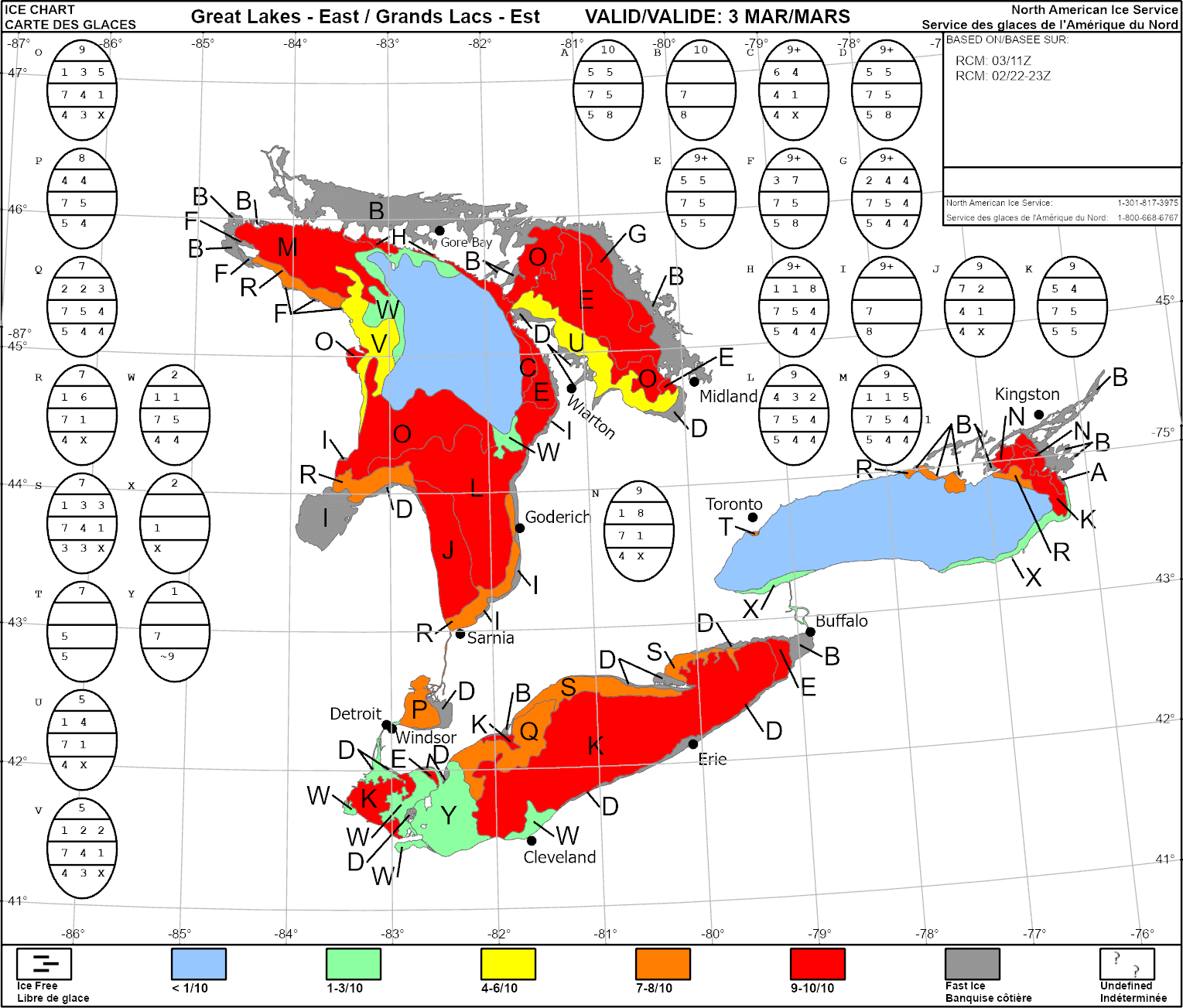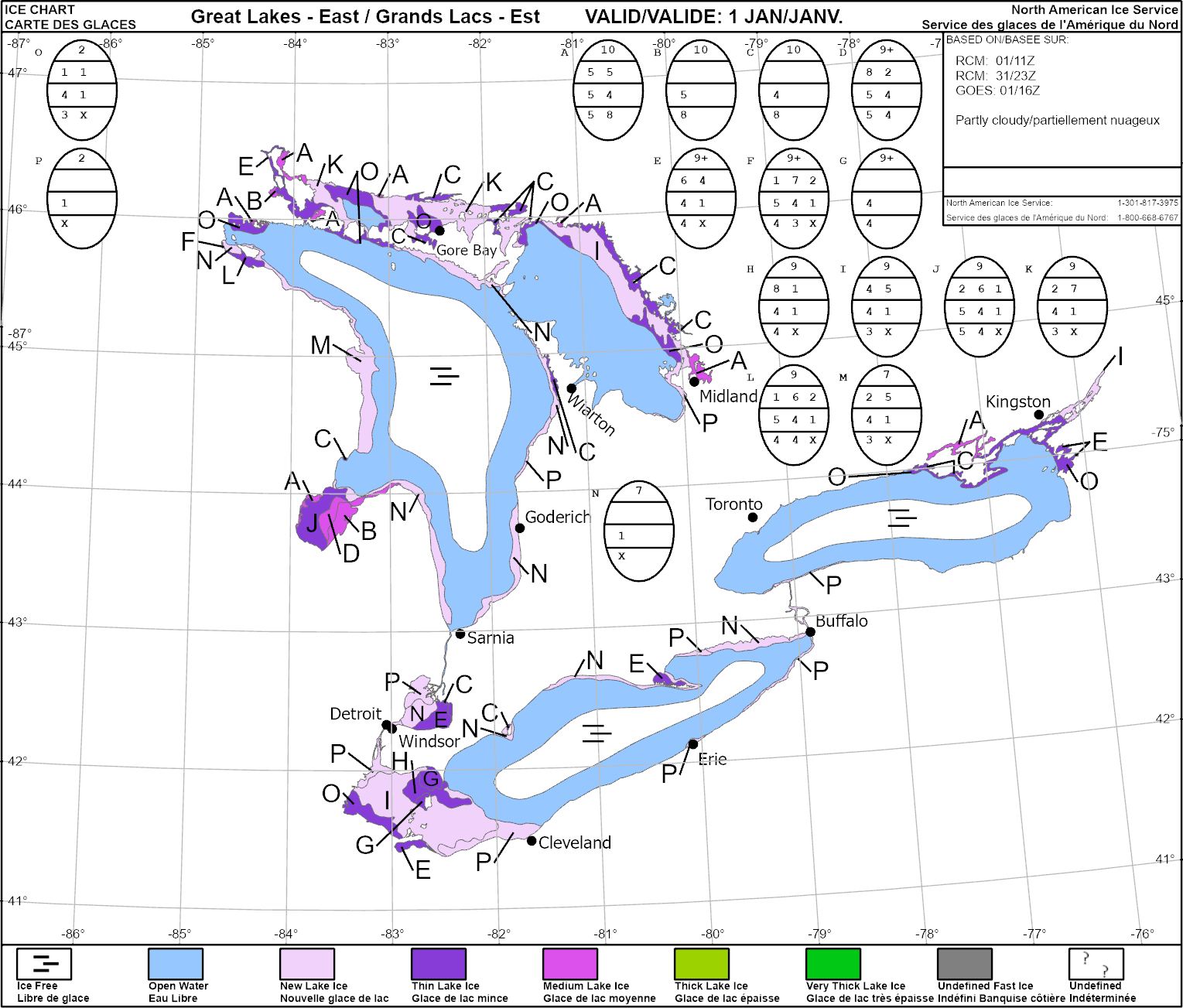 Daily ice chart that represents current ice coverage for eastern/western Great Lakes waters during their ice season. WMO egg code represents ice concentration, ice stage of development with its concentration, and ice floe size. Ice charts are presented in black and white GIFs.
