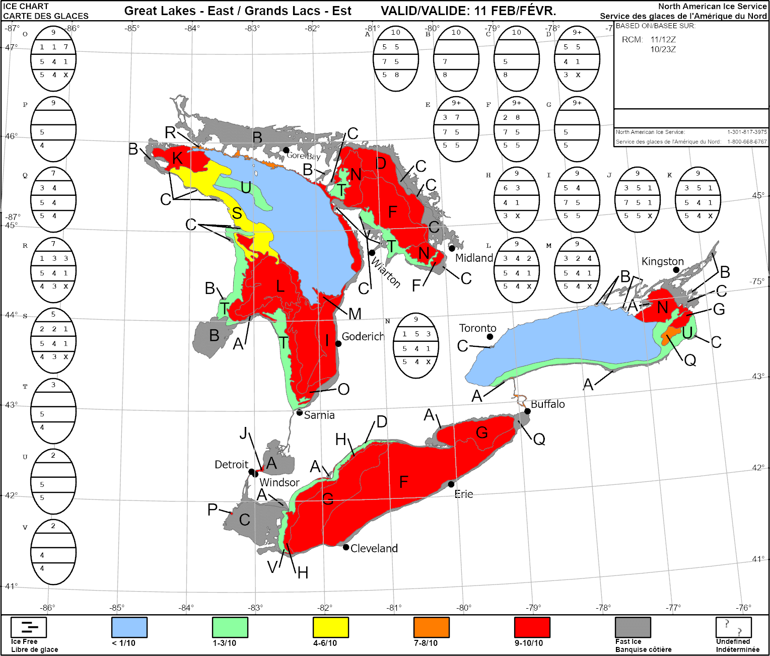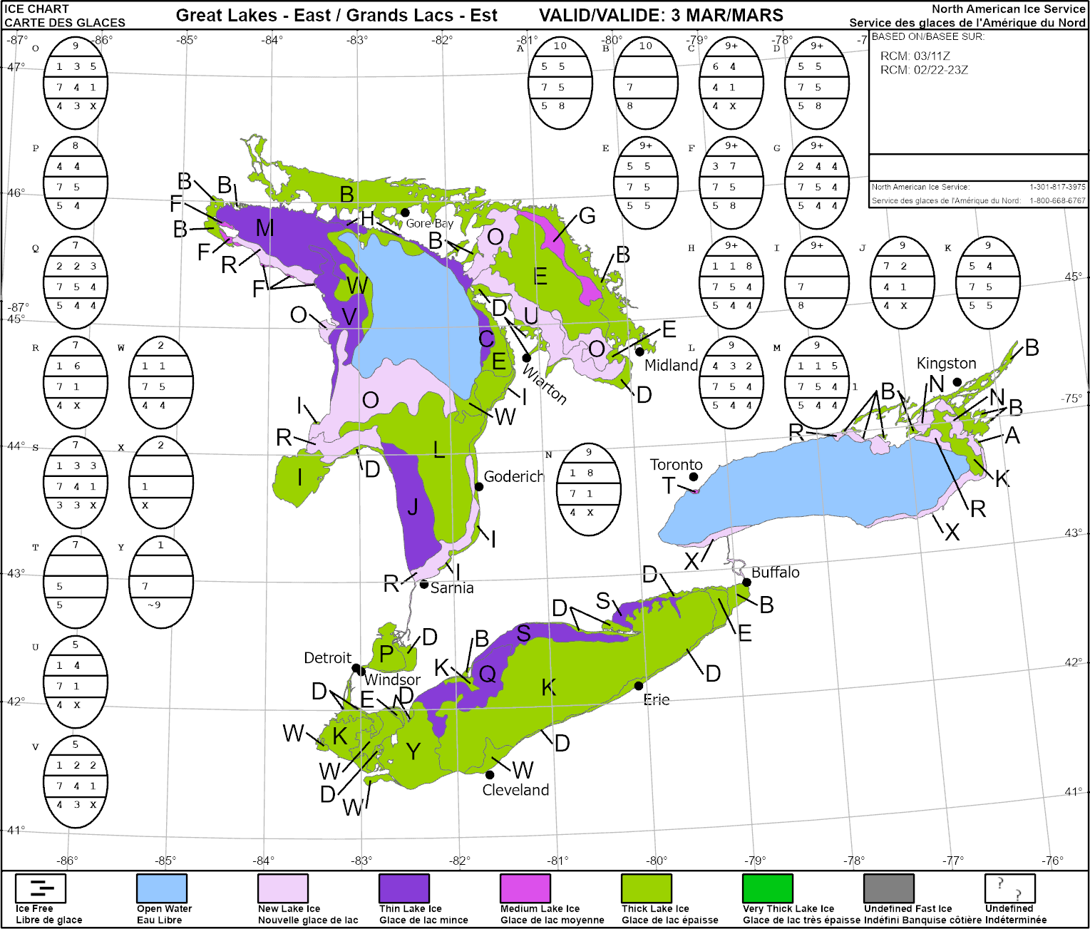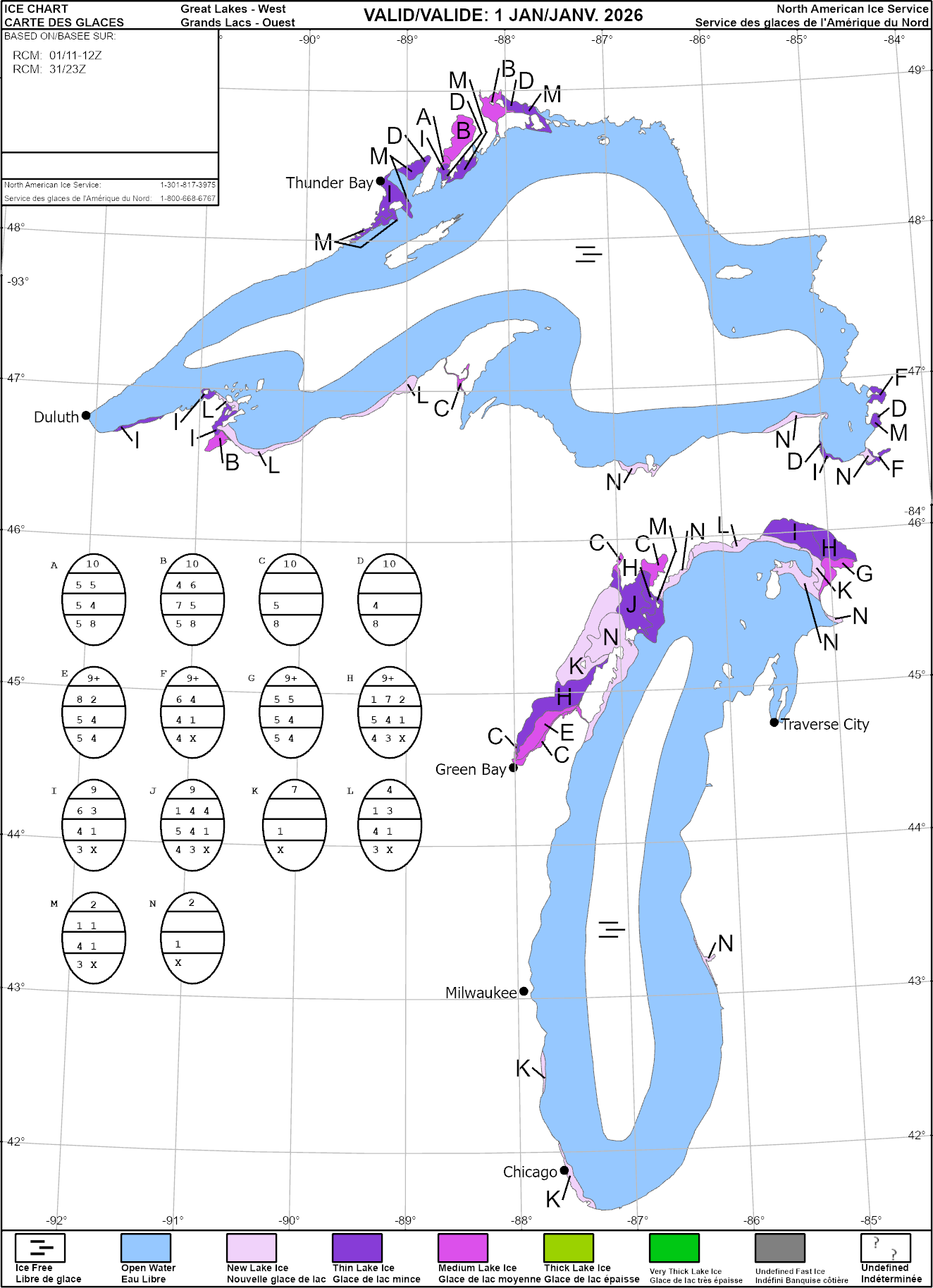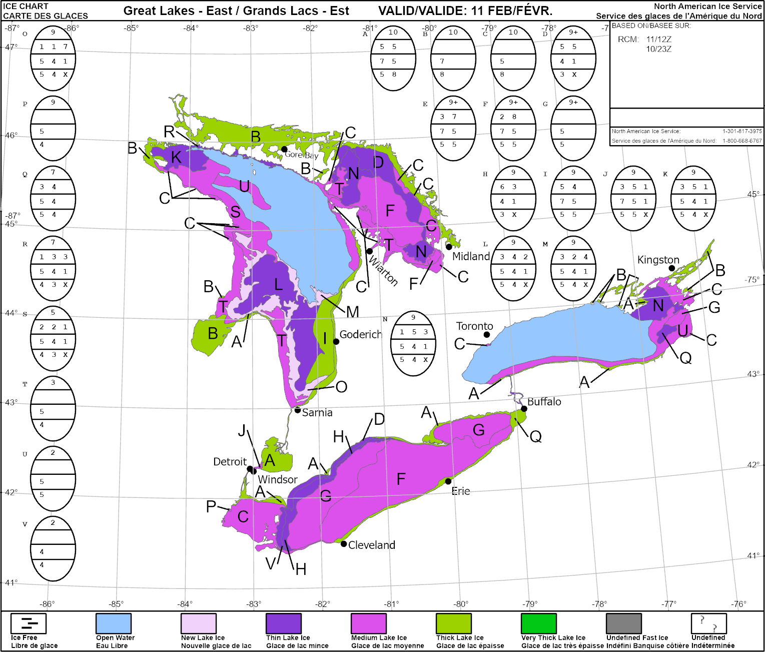 Daily ice chart that represents current ice coverage for eastern/western Great Lakes waters during their ice season. WMO egg code represents ice concentration, ice stage of development with its concentration, and ice floe size. Ice charts are presented in black and white GIFs.