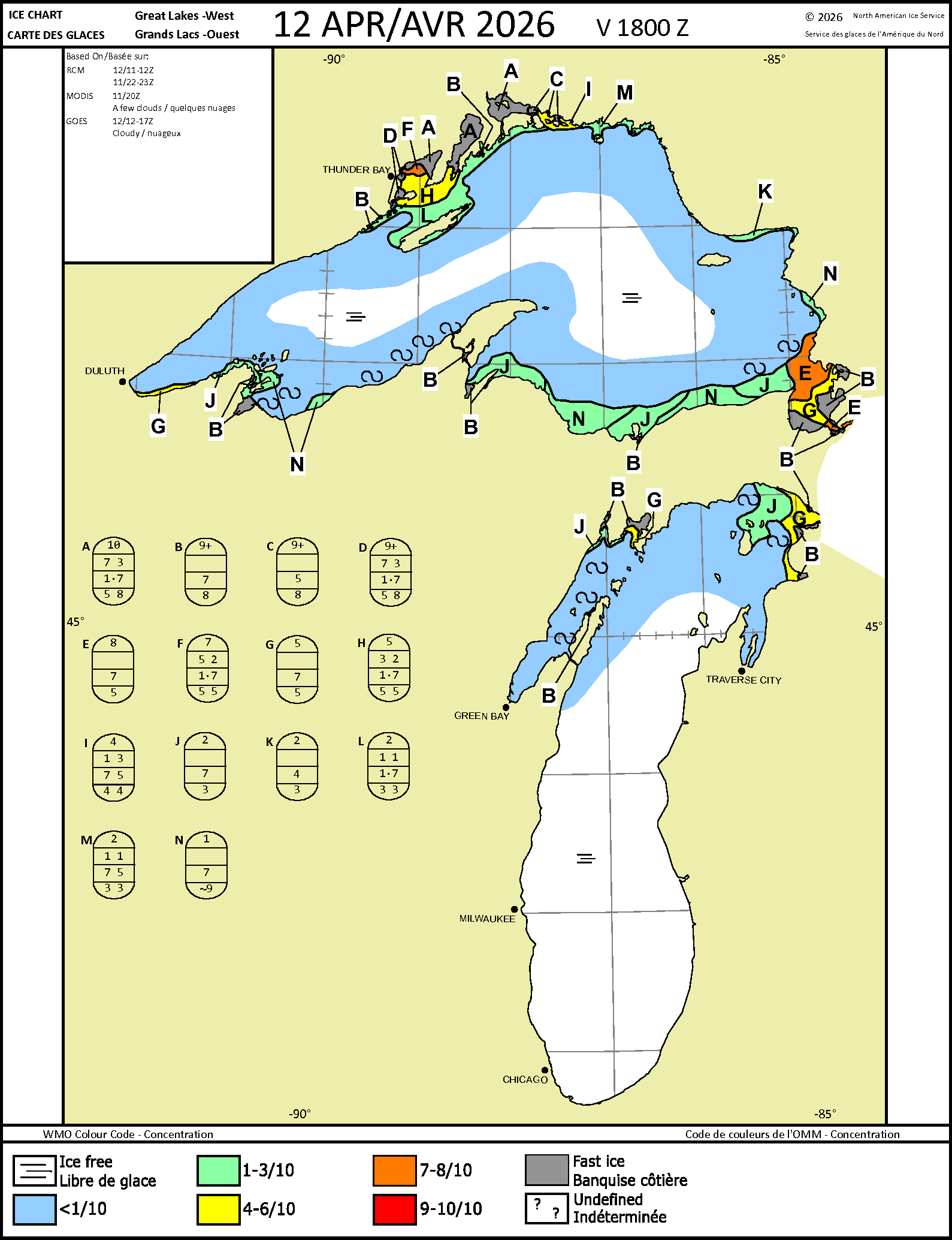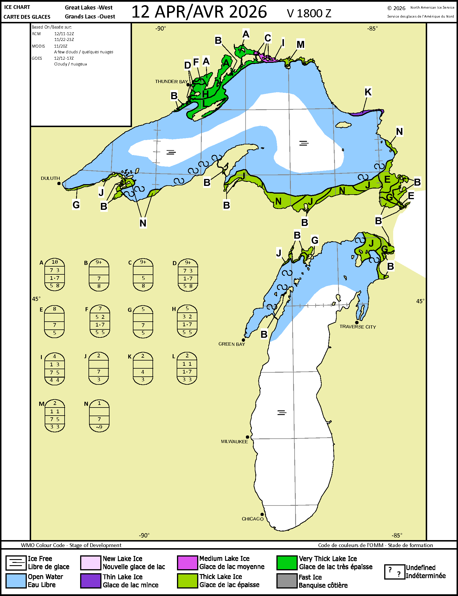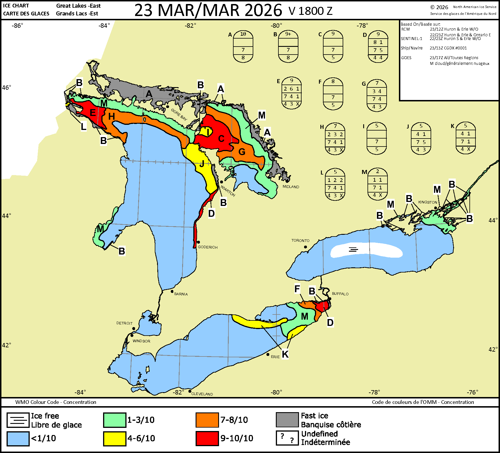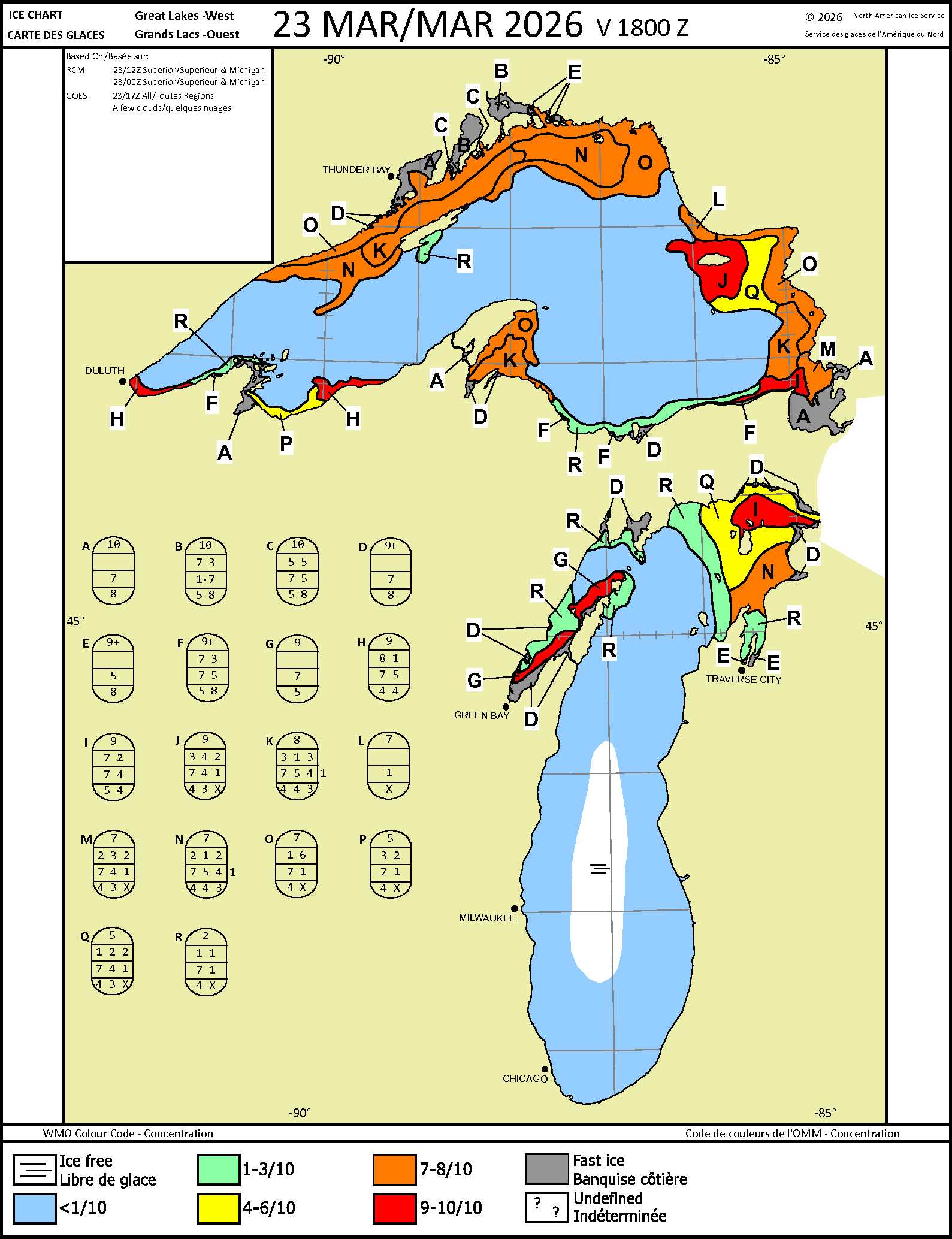 Daily ice chart that represents current ice concentration for eastern/western Great Lakes waters during their ice season. Ice concentration is shown in color. Additionally, WMO egg code represents ice concentration, ice stage of development with its concentration, and ice floe size. Ice charts are presented in color GIFs.