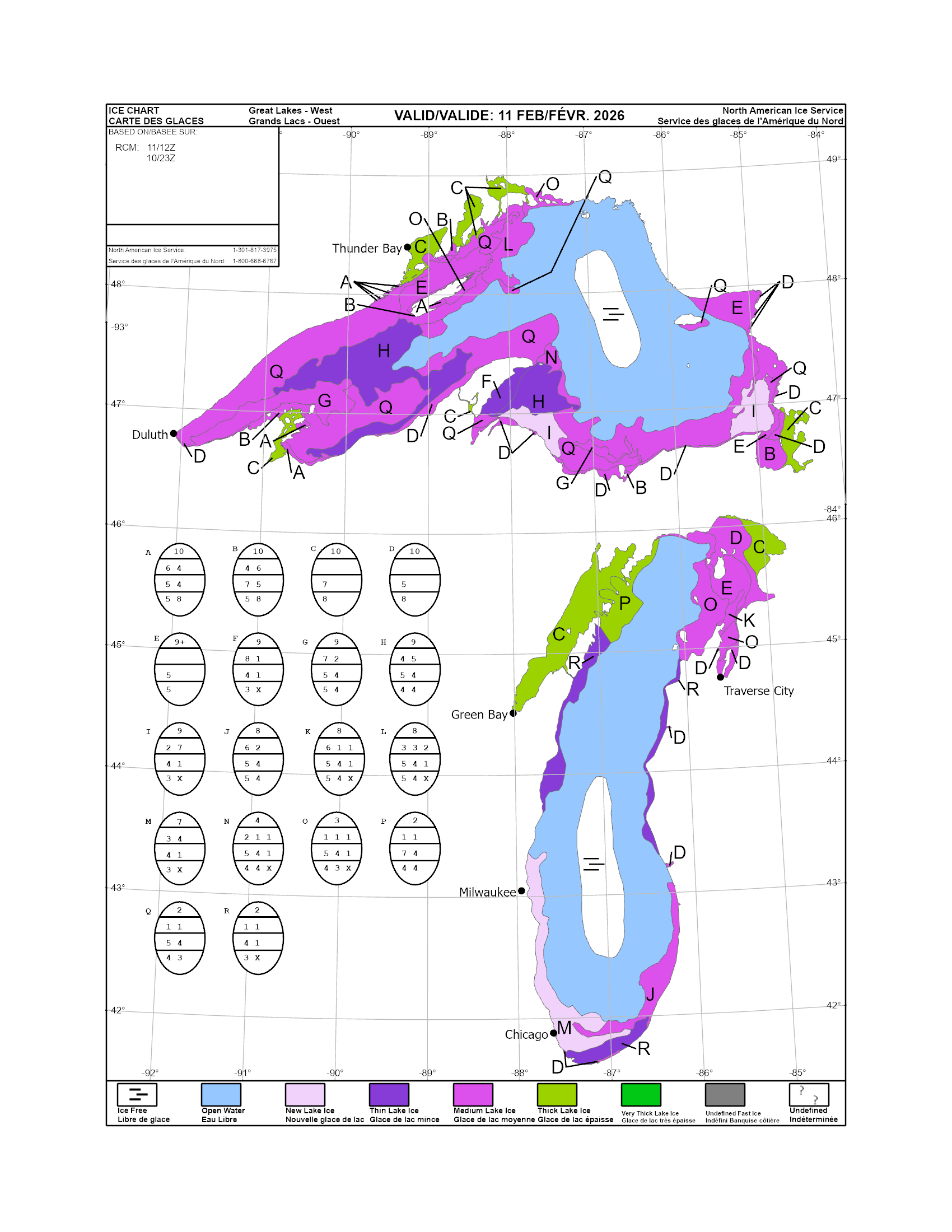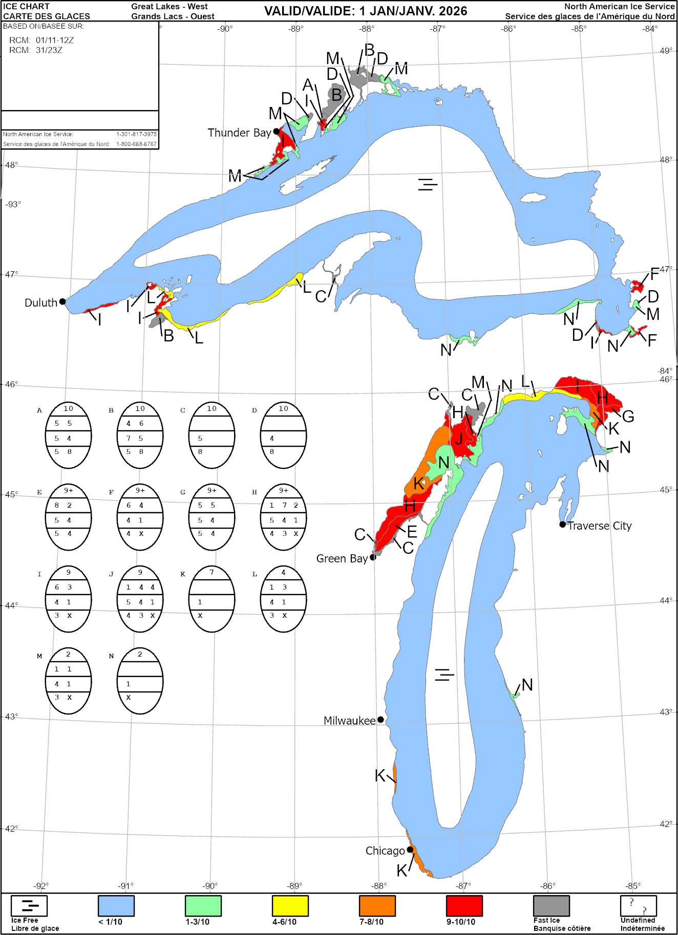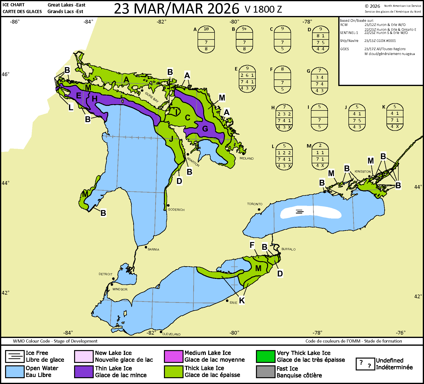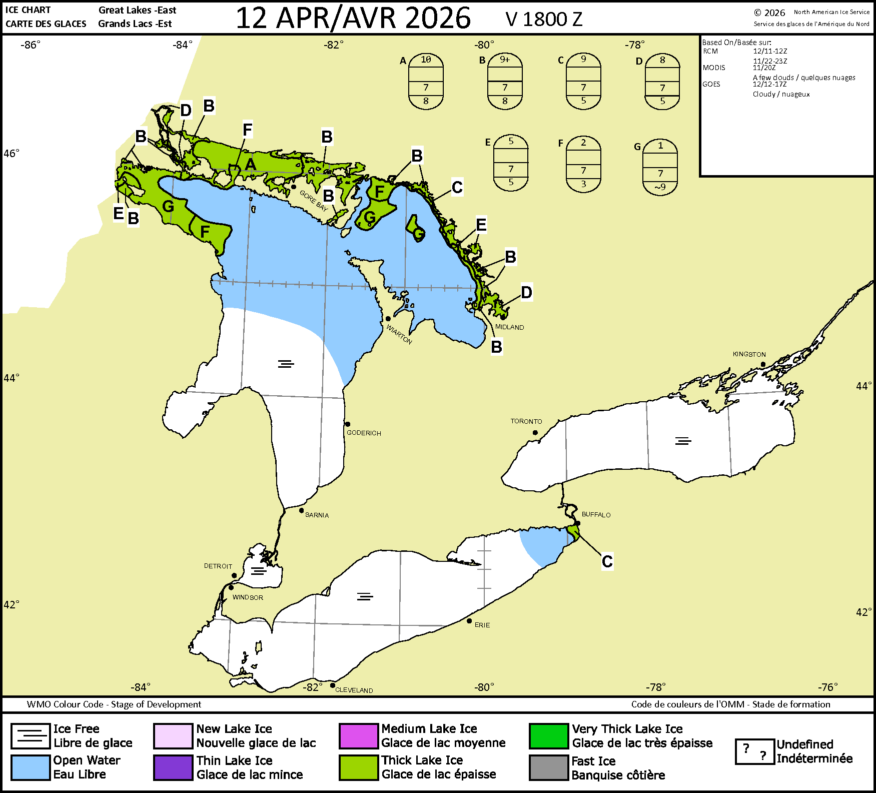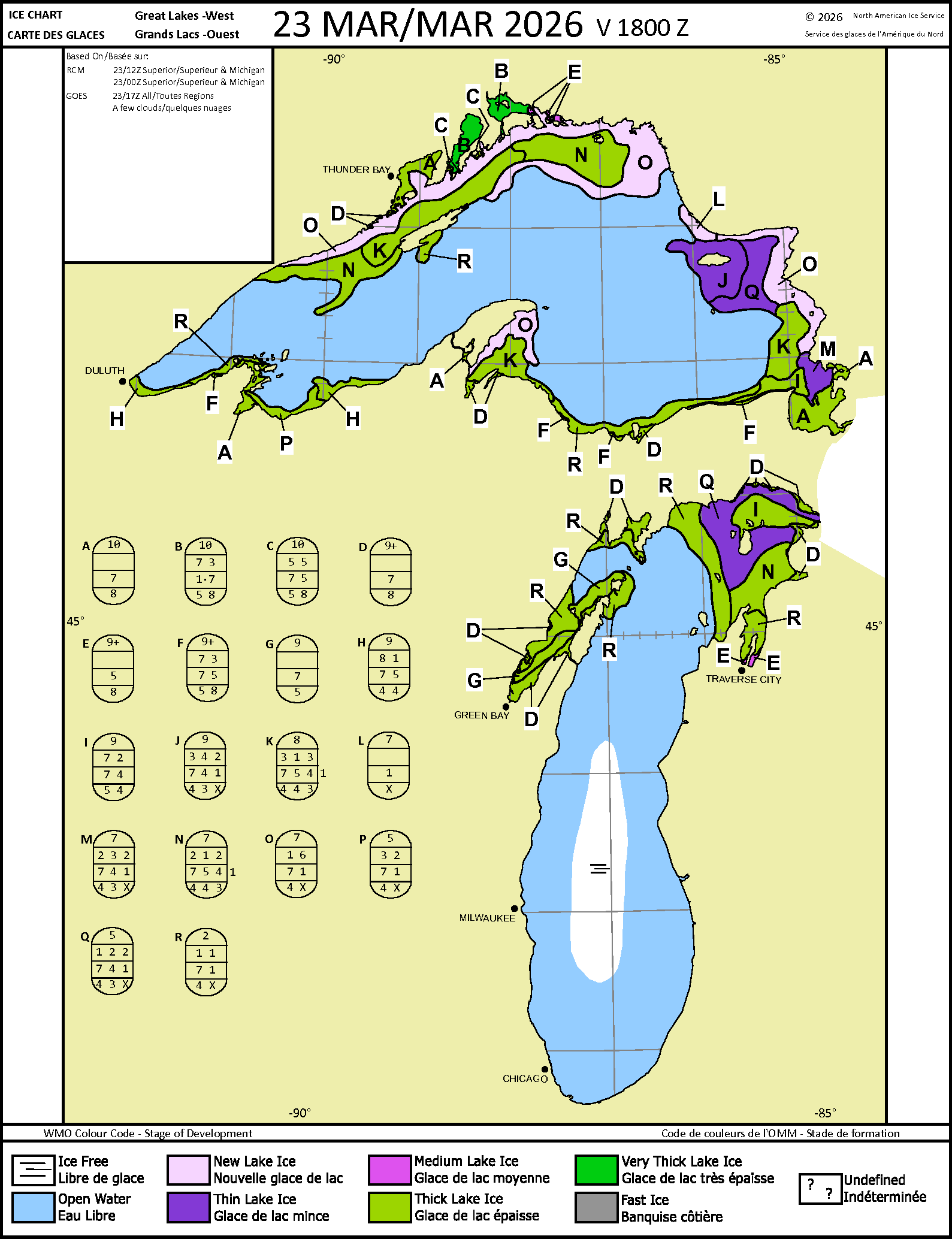 Daily ice chart that represents current ice concentration for eastern/western Great Lakes waters during their ice season. Ice concentration is shown in color. Additionally, WMO egg code represents ice concentration, ice stage of development with its concentration, and ice floe size. Ice charts are presented in color GIFs.
