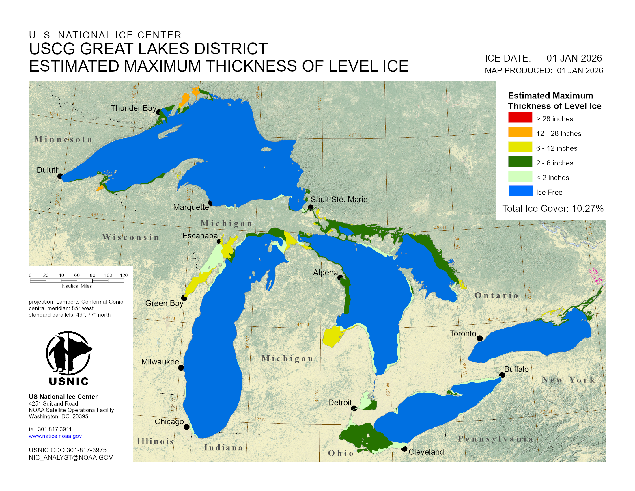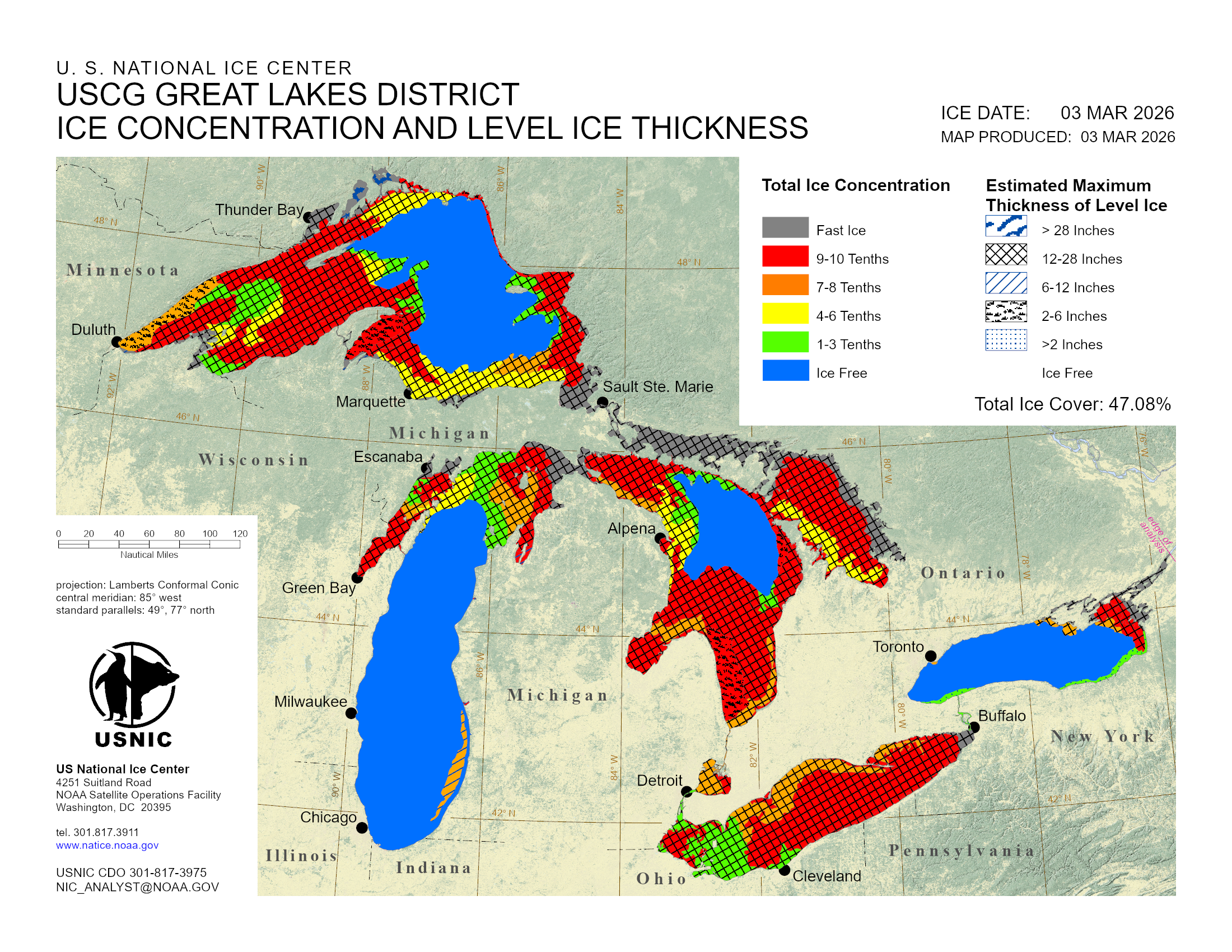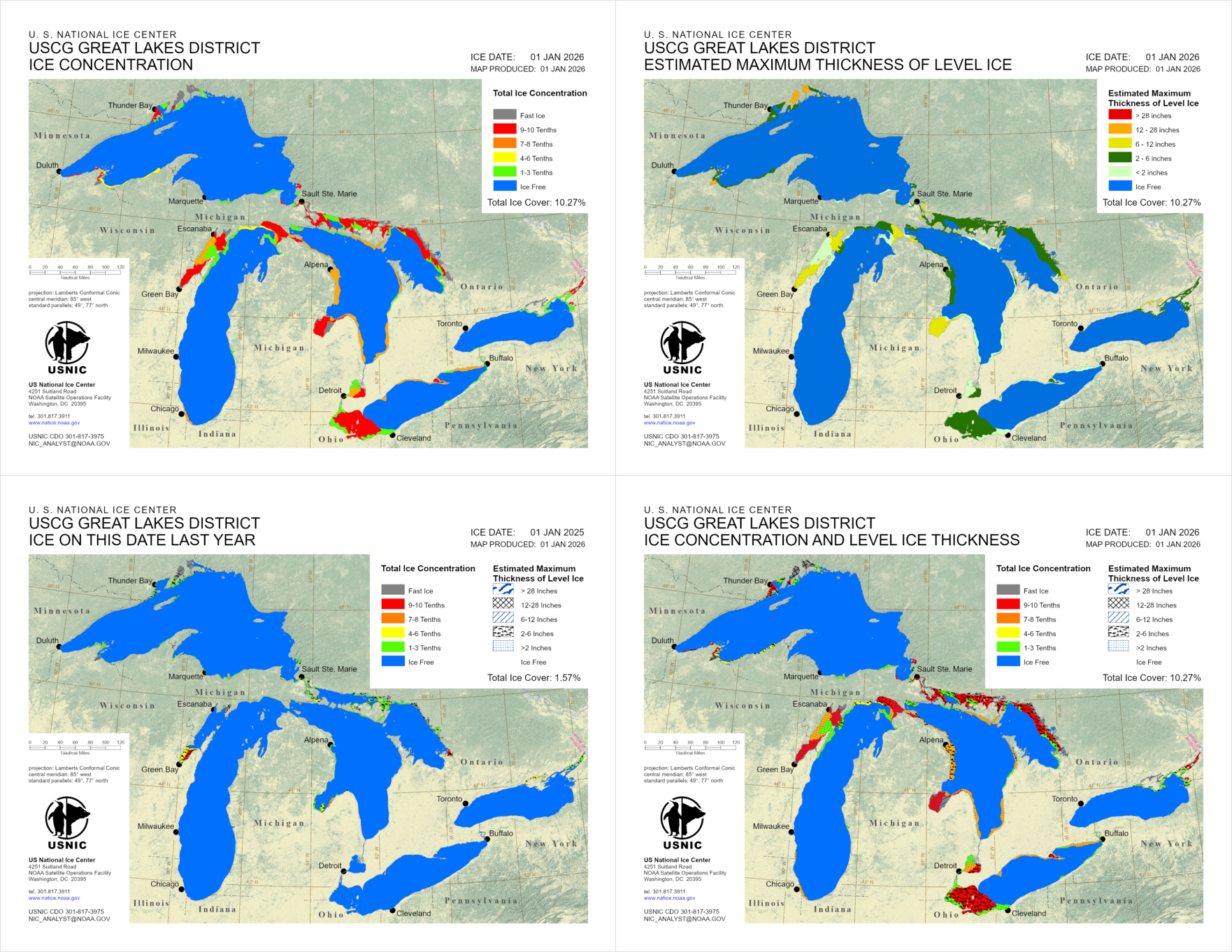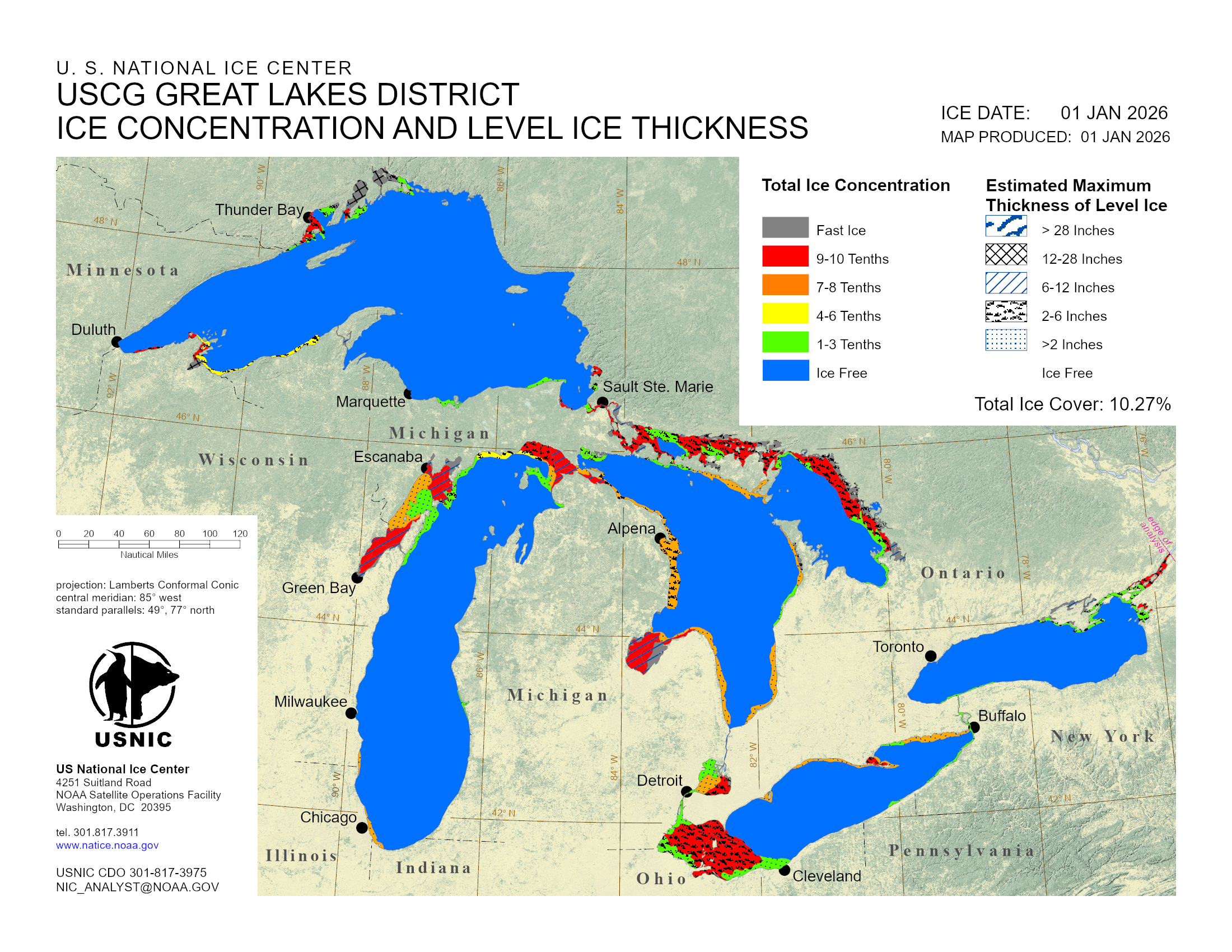 Great Lakes ice charts are produced off the daily Great Lakes ice analysis in cooperation with the U.S. National Ice Center (USNIC) and Canadian Ice Center. The charts are separated into eastern and western portion of the Great Lakes and available in color and black/white. USNIC also produces periodic ice charts for U.S. Coast Guard District 9 support broken into ice concentration, ice thickness/type, and a combination of both.